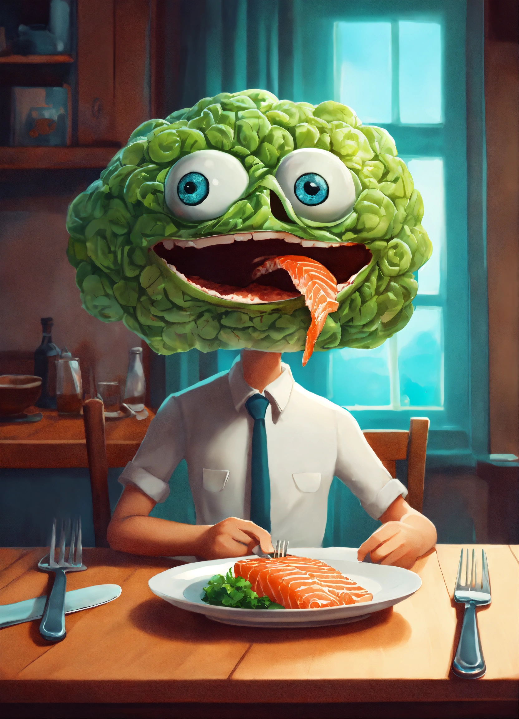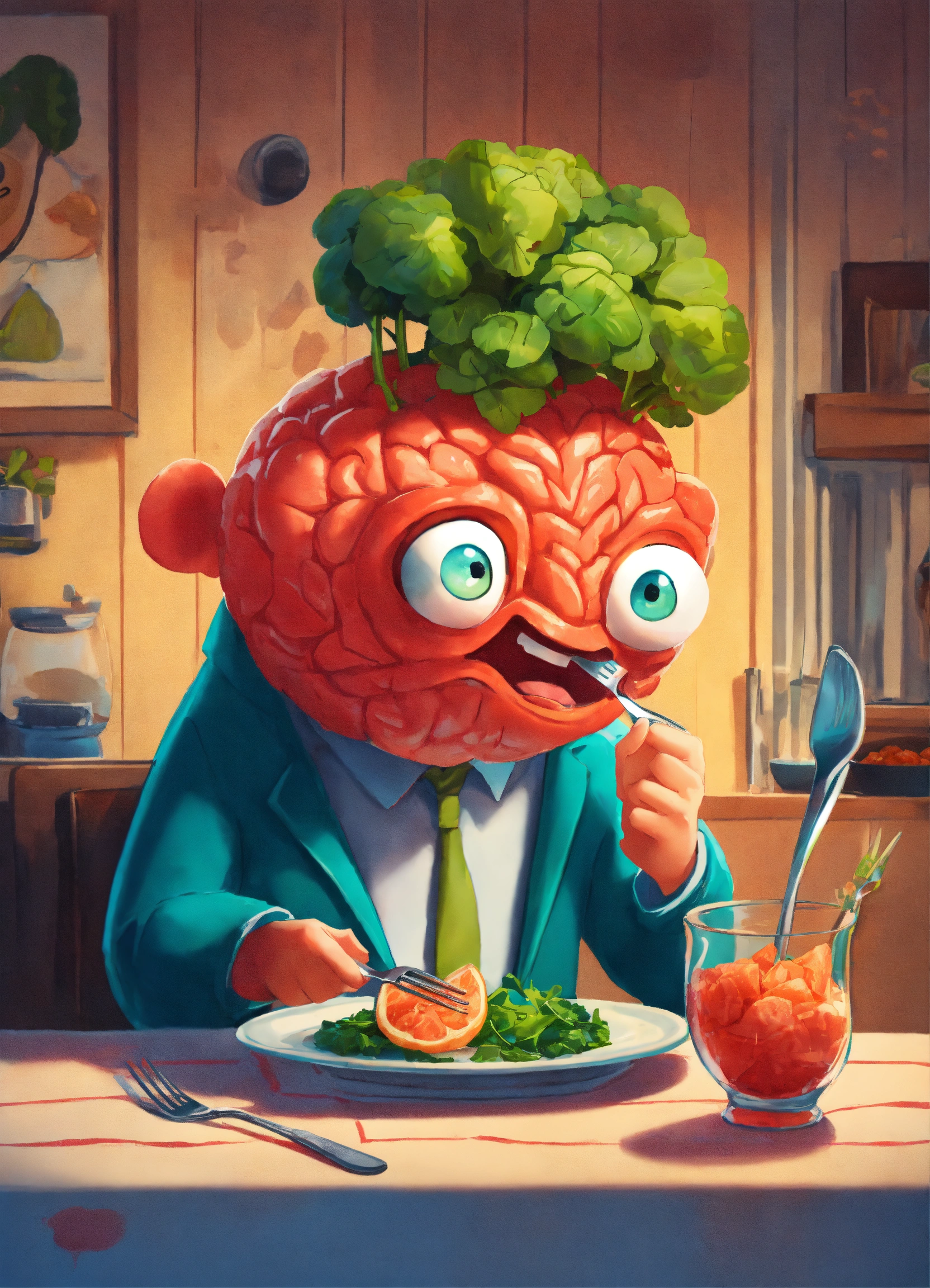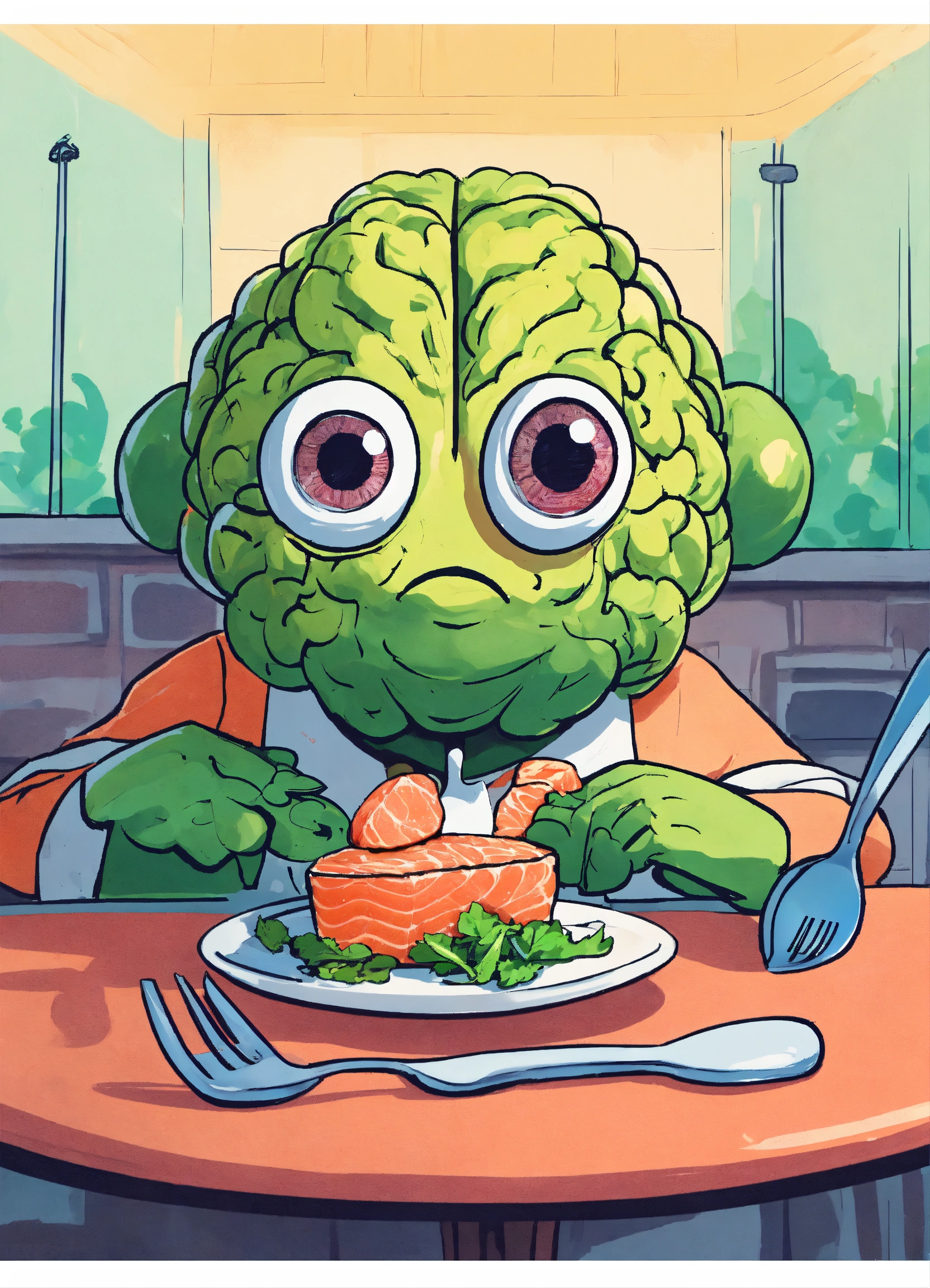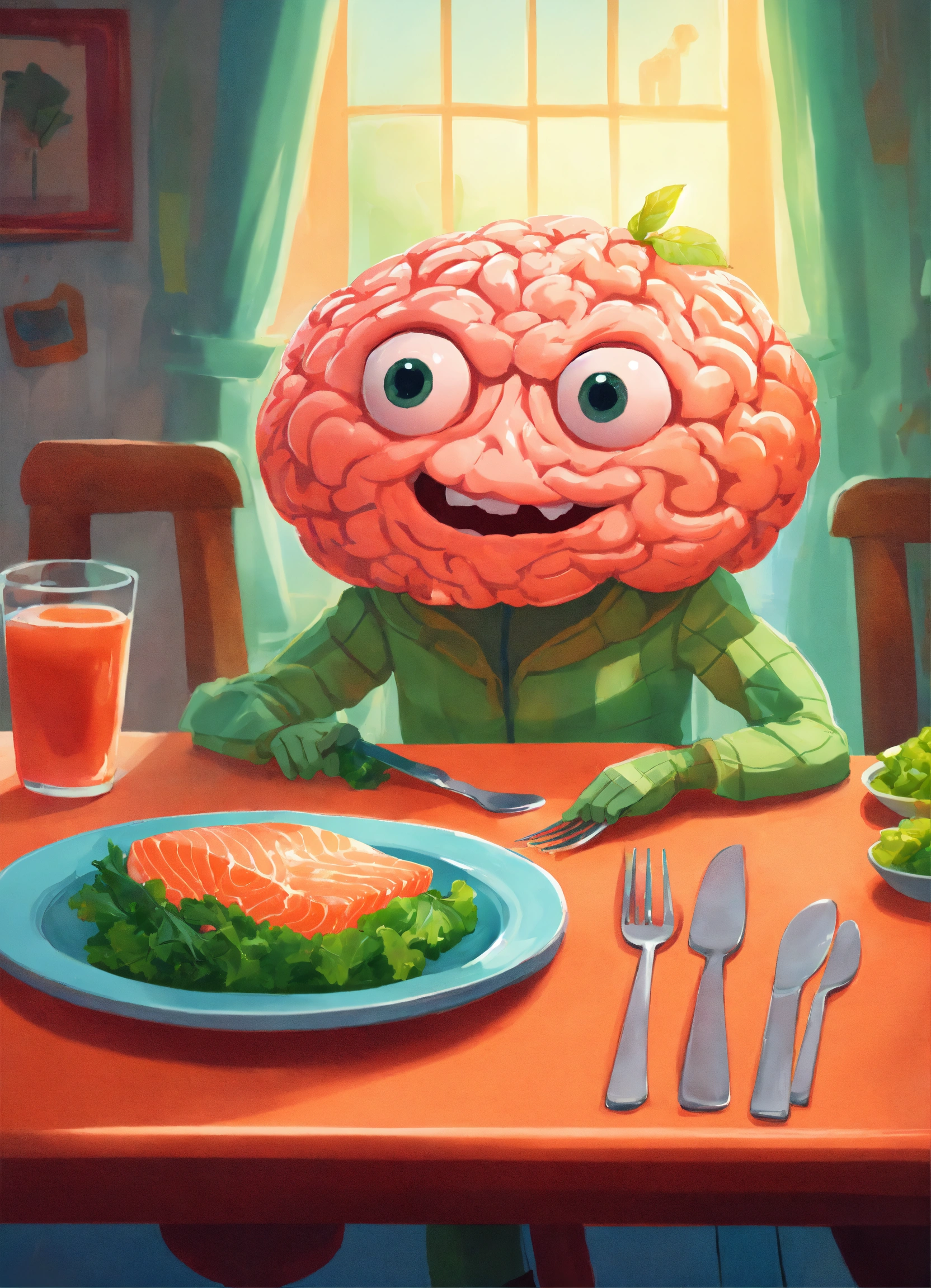 A brain-shaped character with eyes and a mouth sits at a table eating salmon and greens on a plate, he is holding a fork and a knife, pixar style drawing, bright and positive