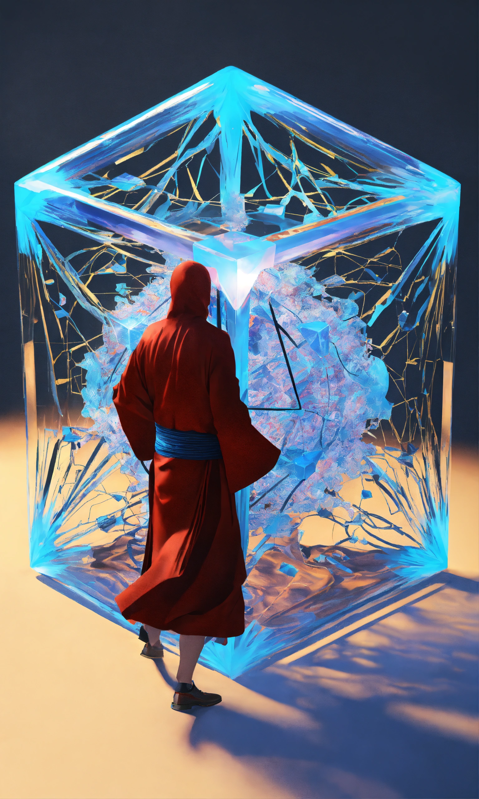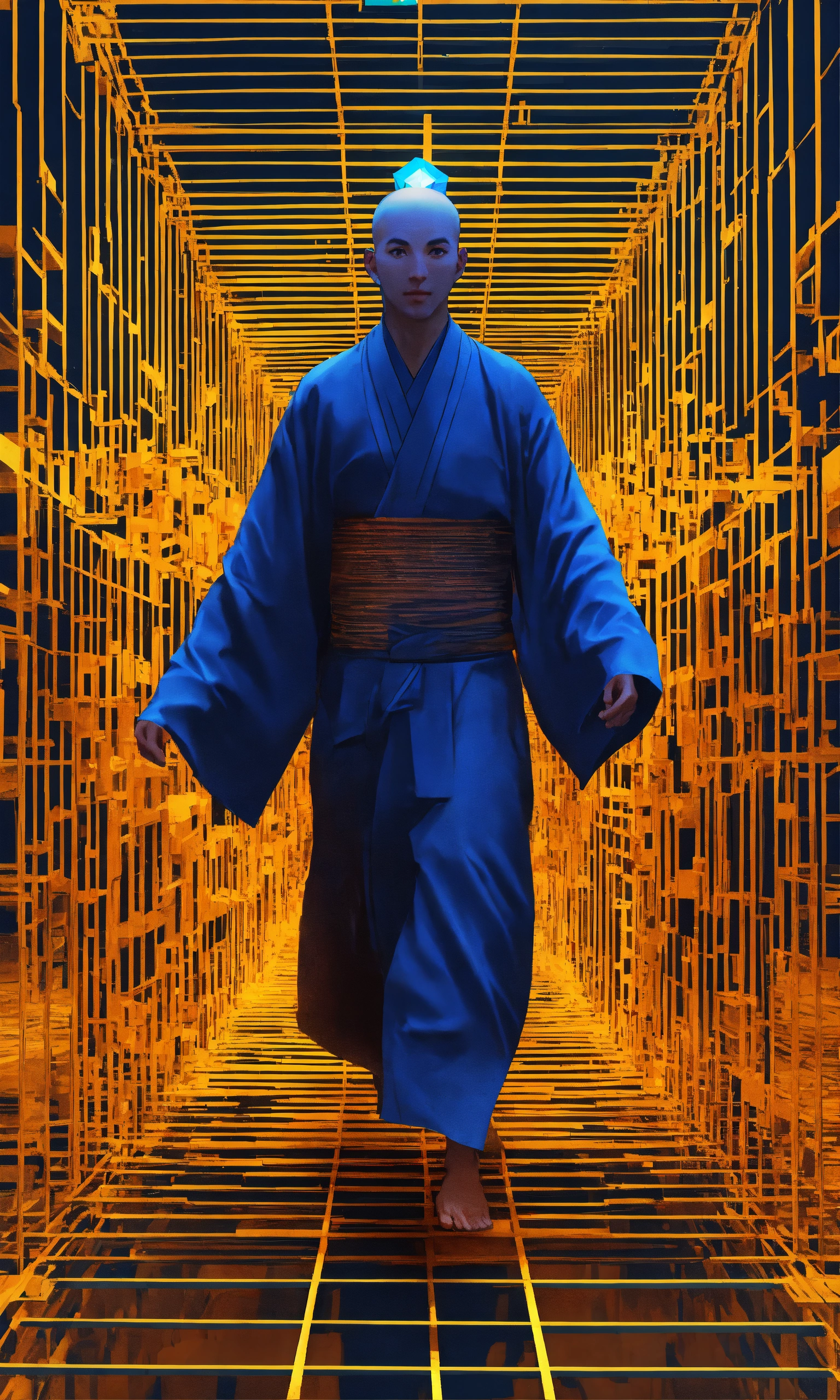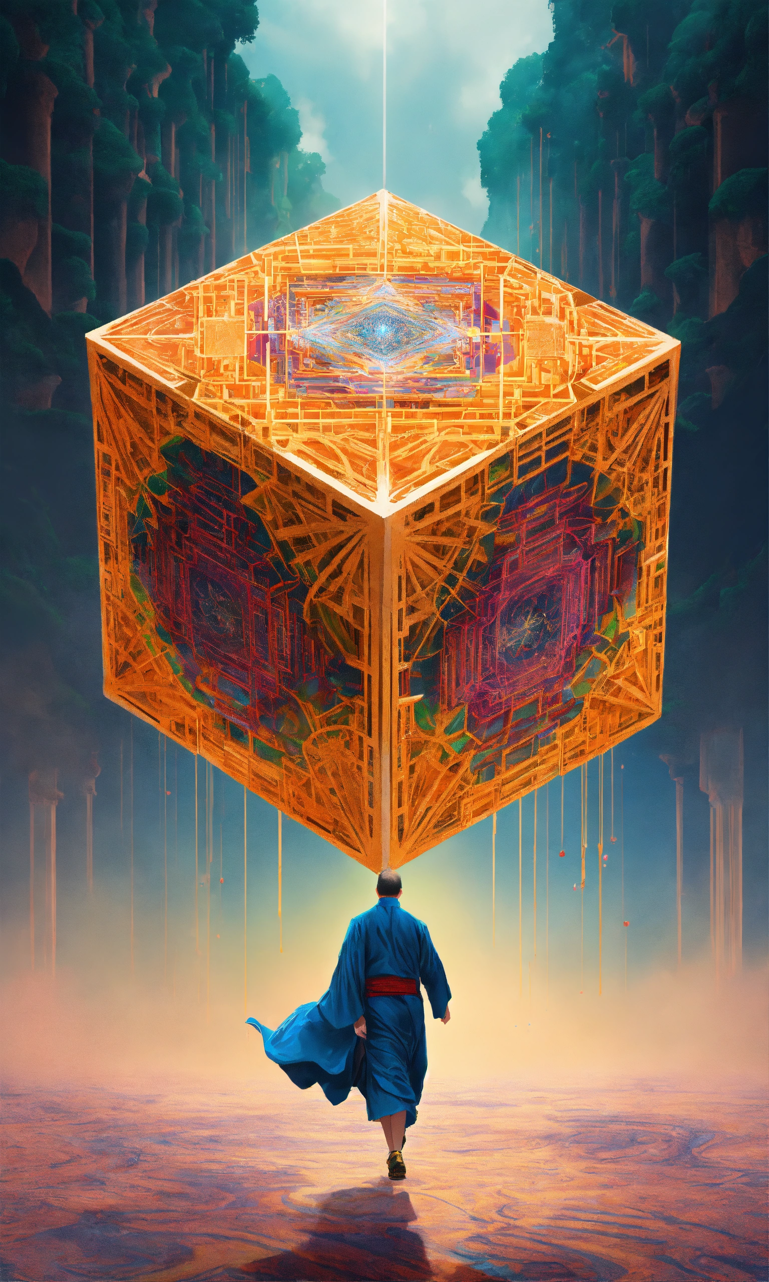 Running taoist monk tesseract body fractal three point perspective hypercube melting in each other