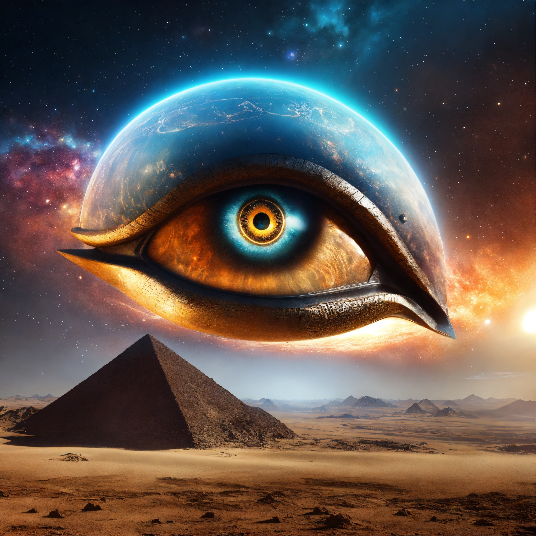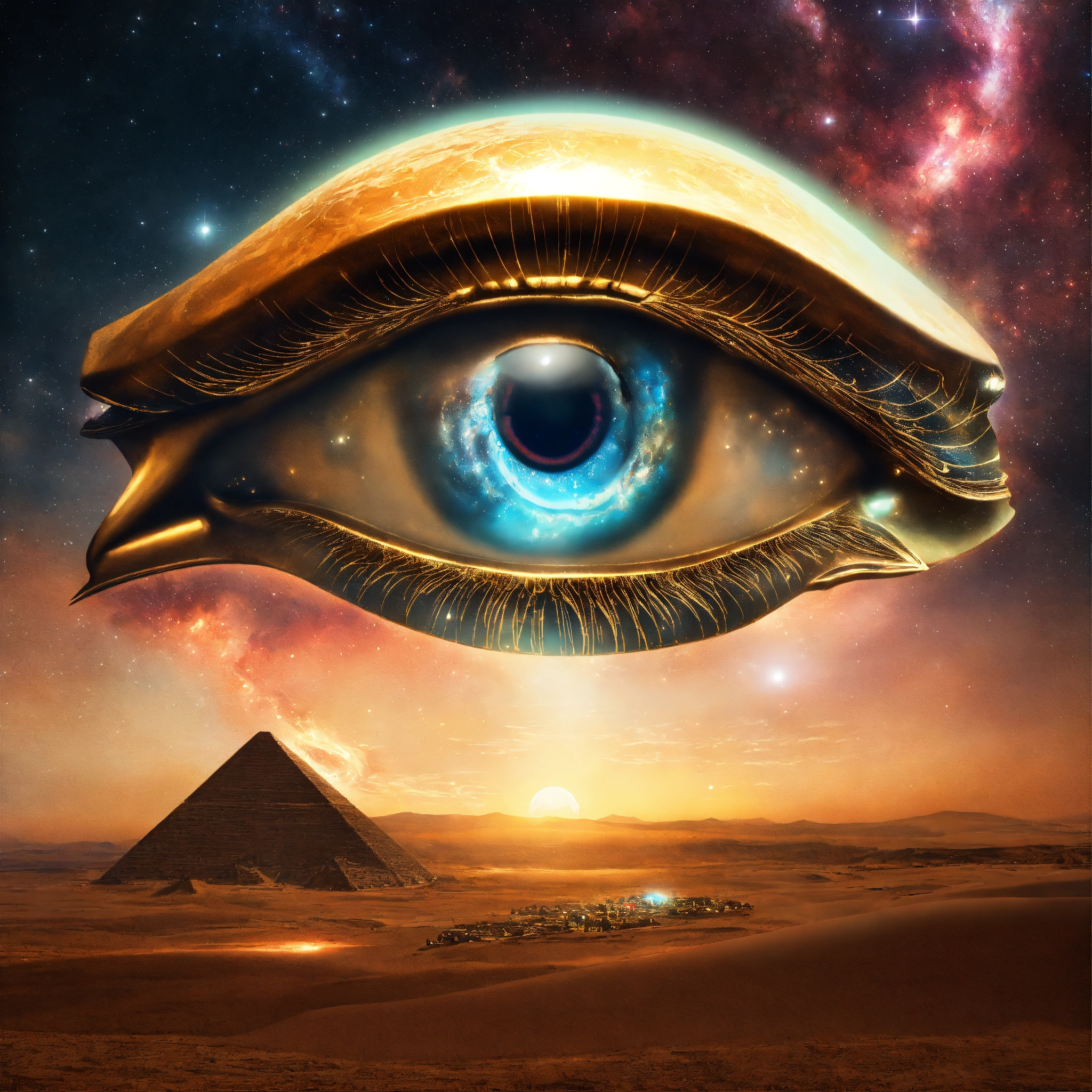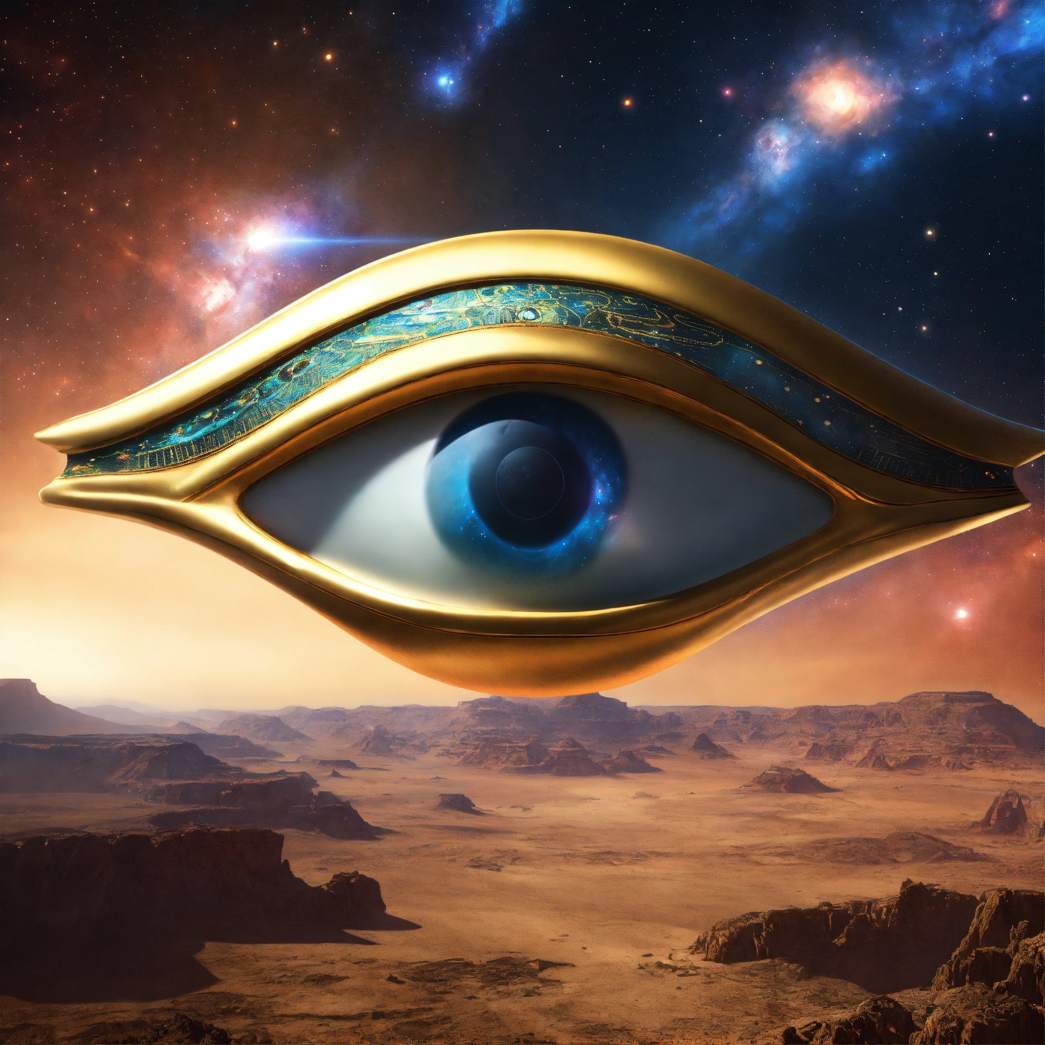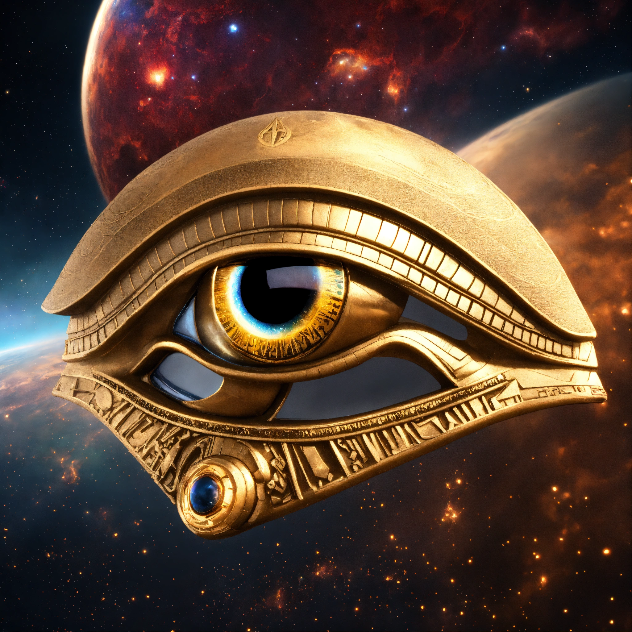 The eye of horus, egyptian symbol, hyper realism, poetic, romantic, starship suit, realistic shading, realistic render, detailed textures, photorealistic, wide shot, space nebula landscape