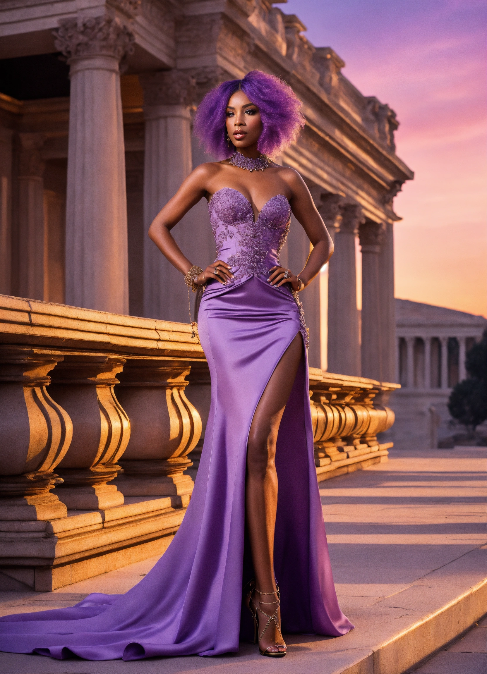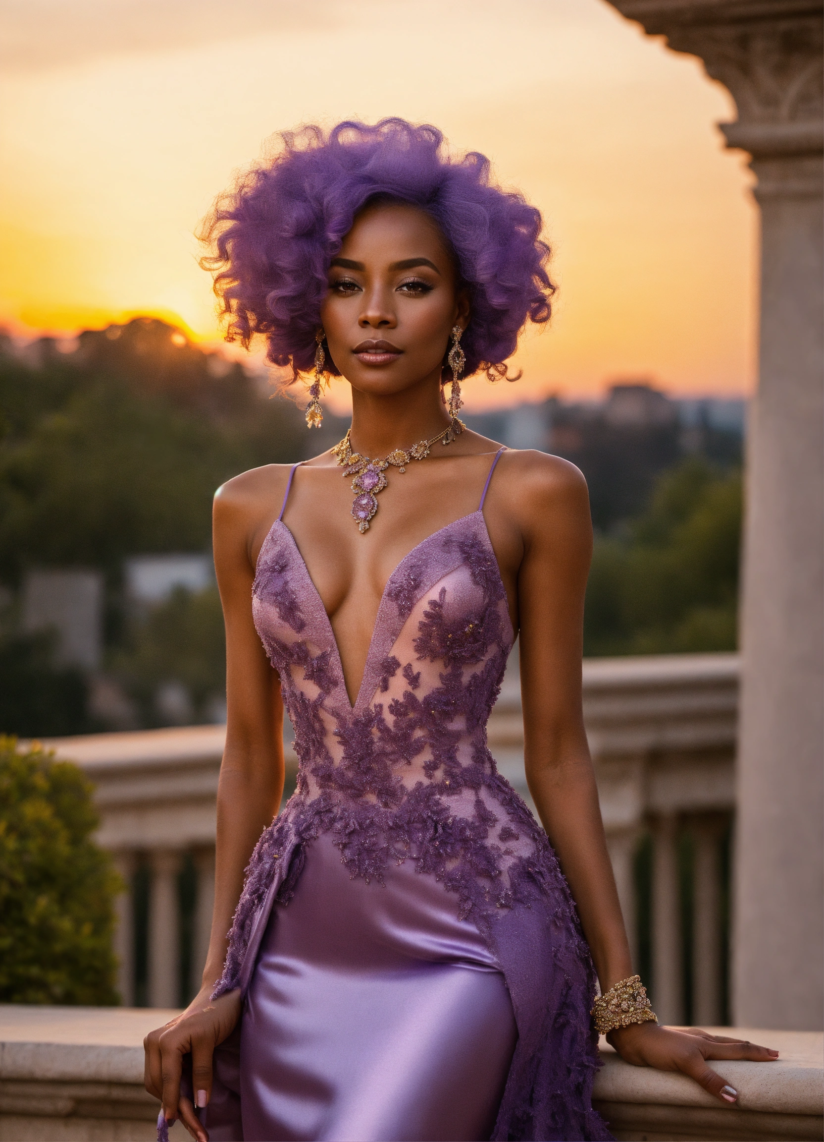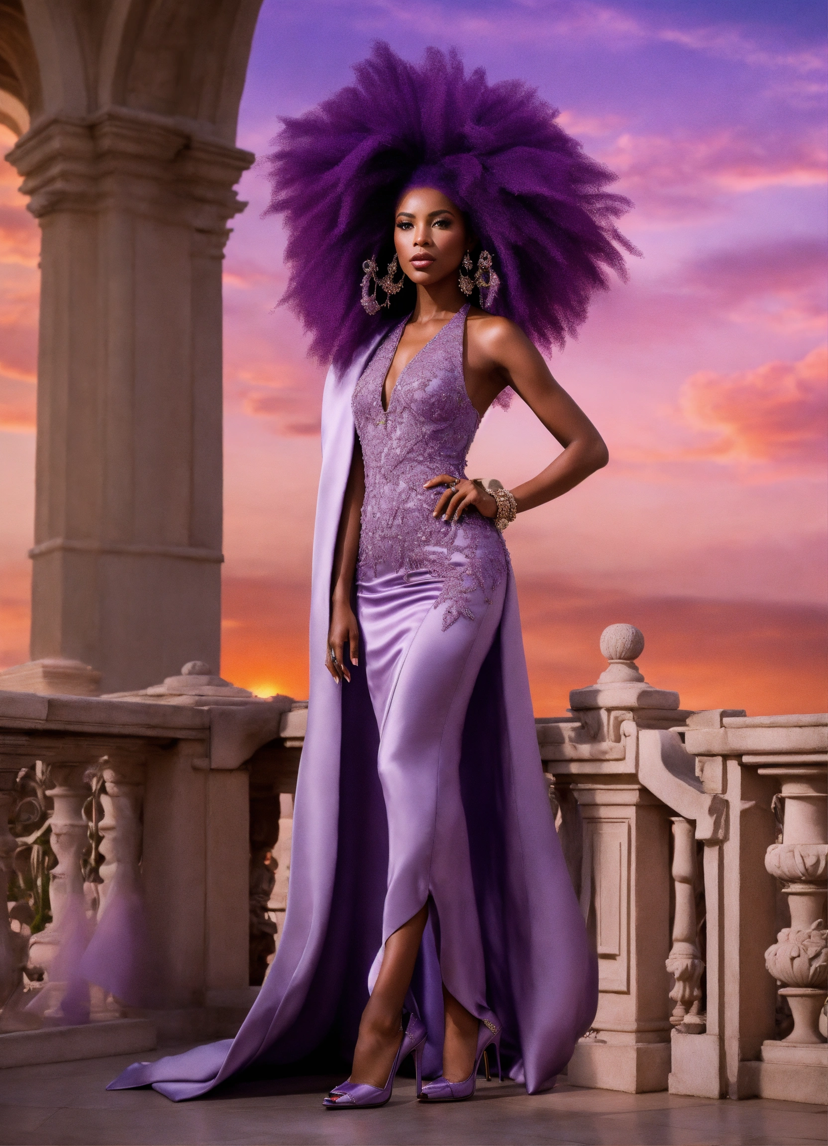 Lavender-skinned alien female, amethyst hair, 40-year-old, african-american features, haute couture dress and heels standing on a sumptuous palace terrace at sunset. charismatic demeanor.