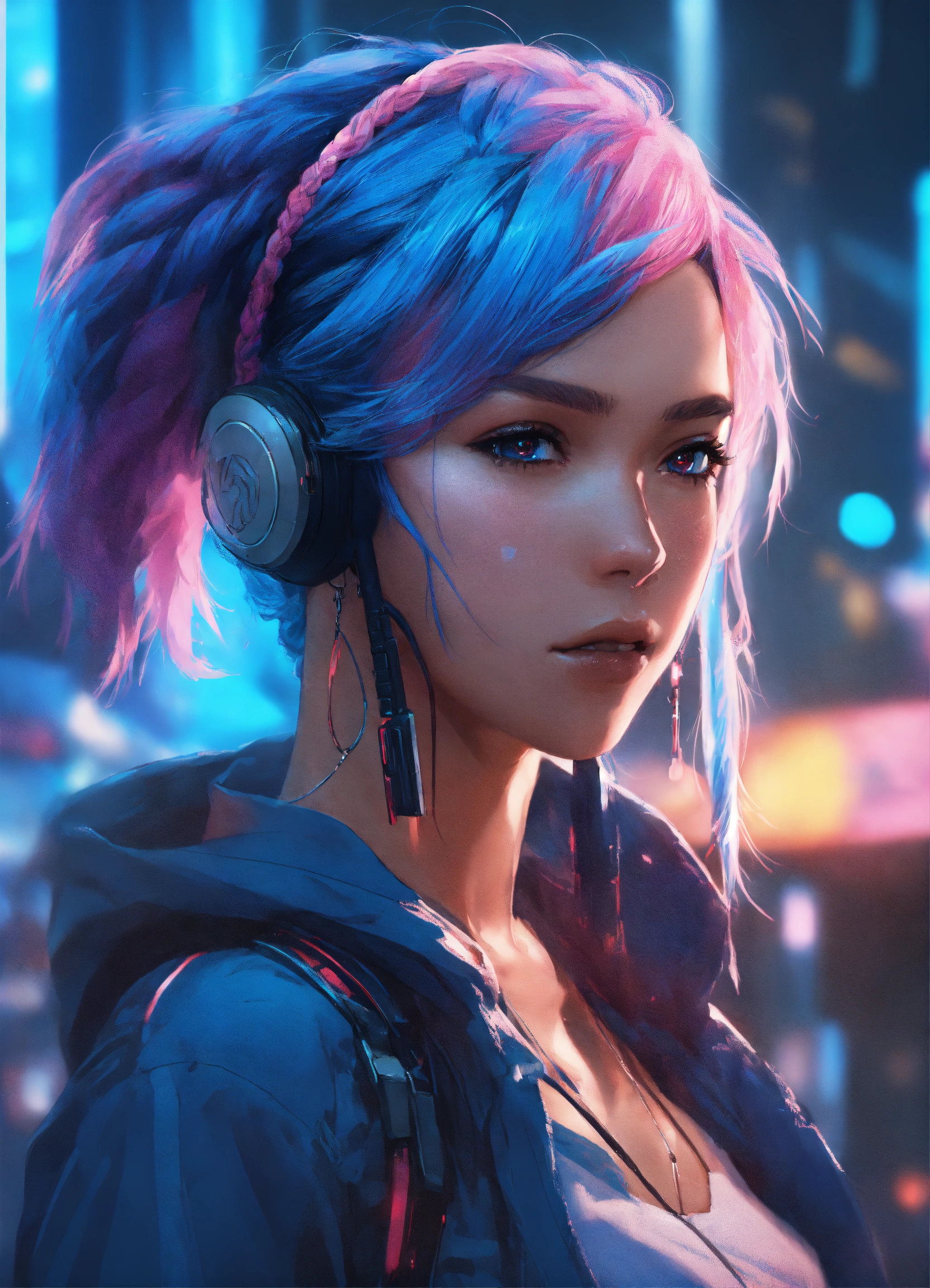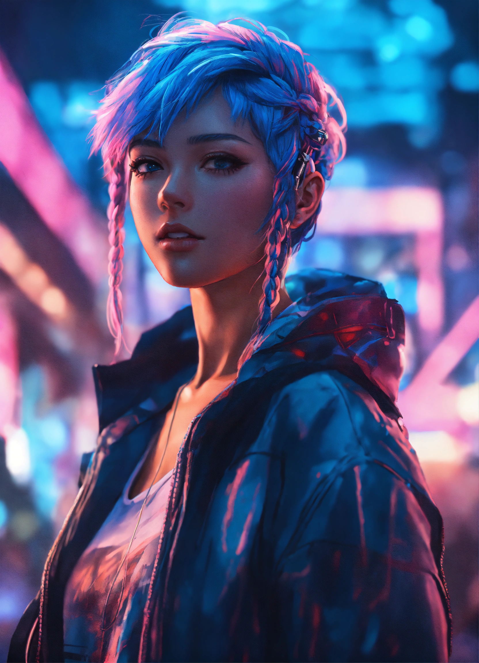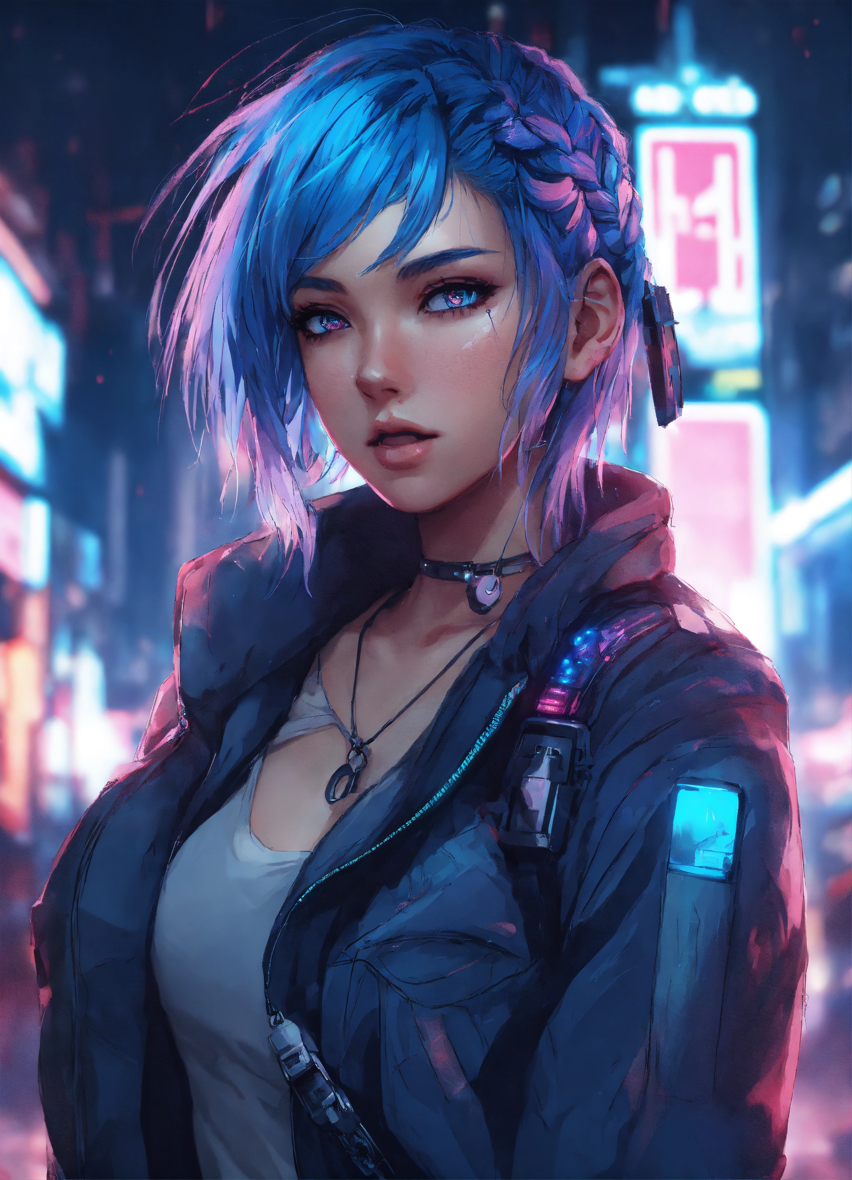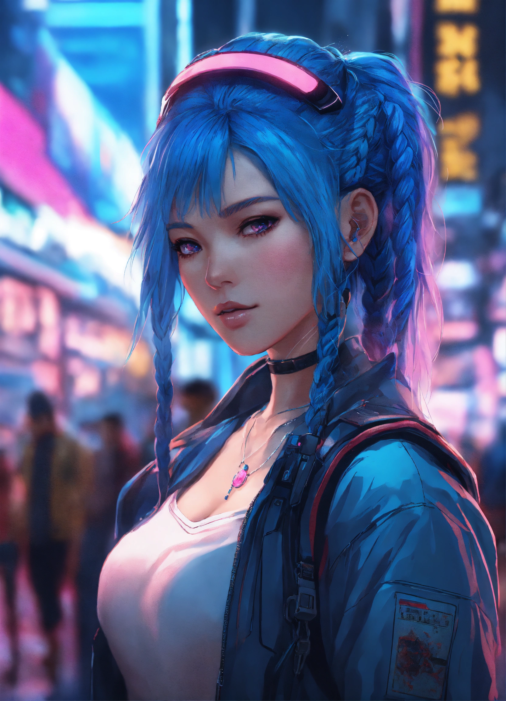 1 woman blue hair, braided hair, detailed face 8k, detailed anime style, detailed environment, 8k, strong color, cyberpunk background with pink and blue lights