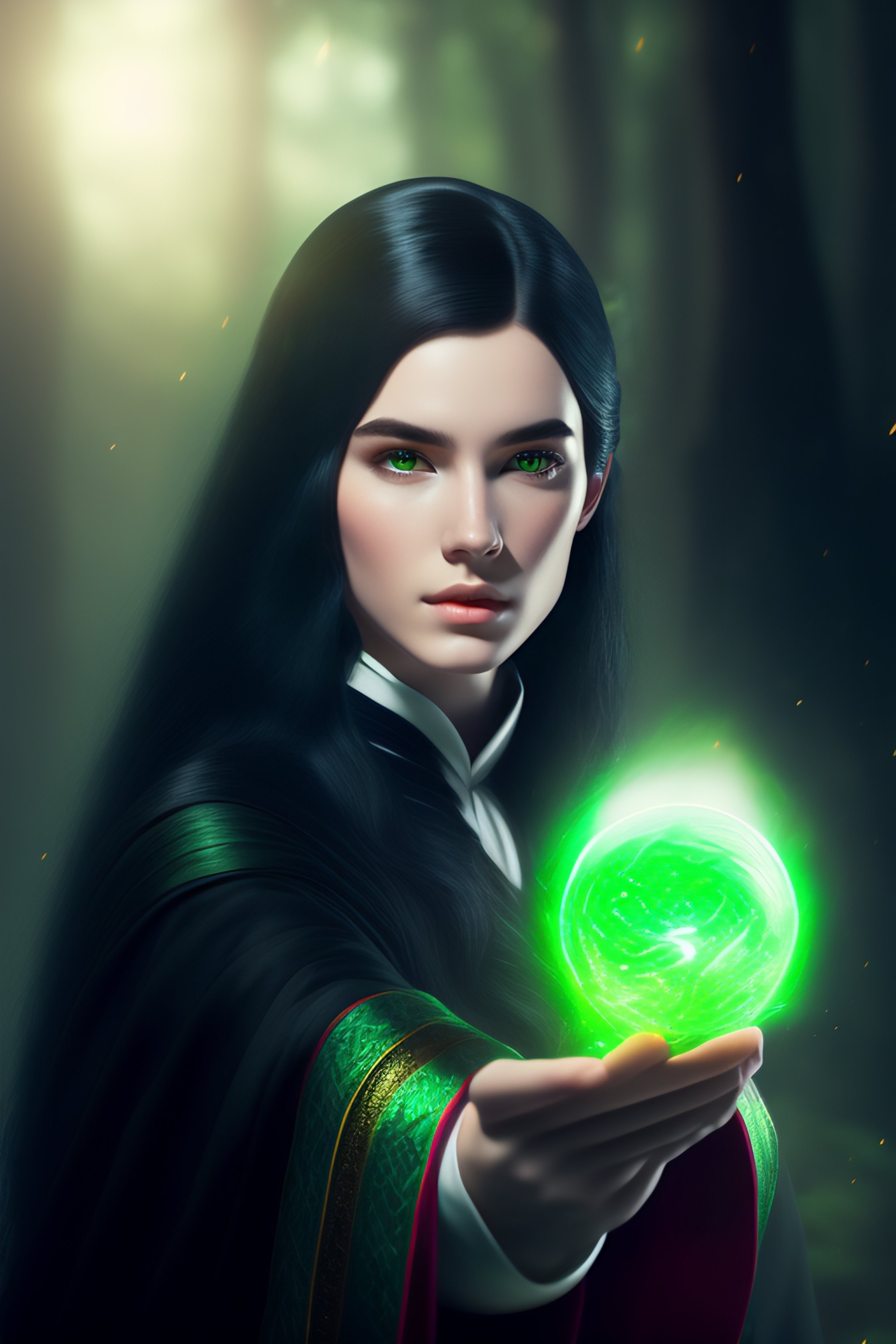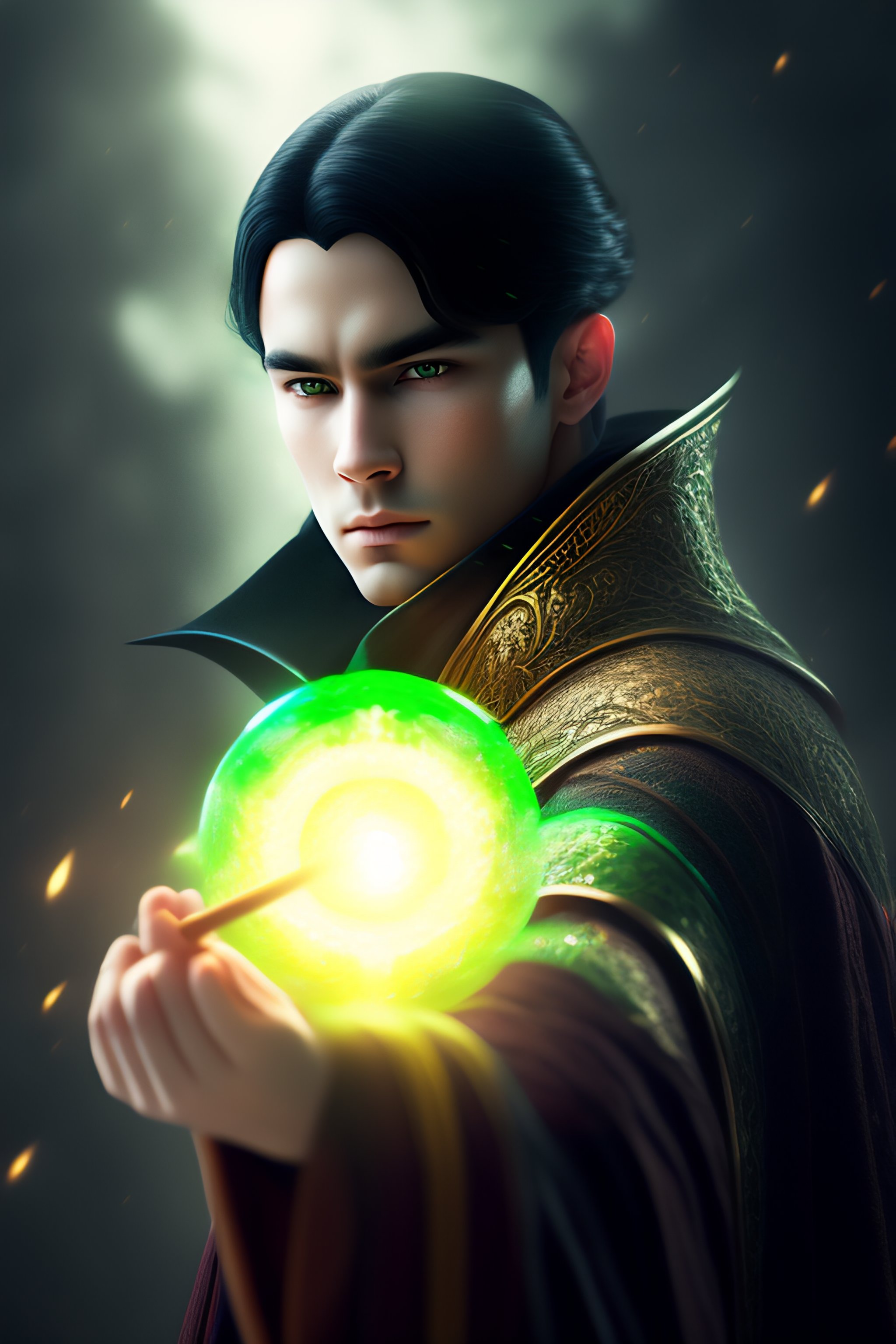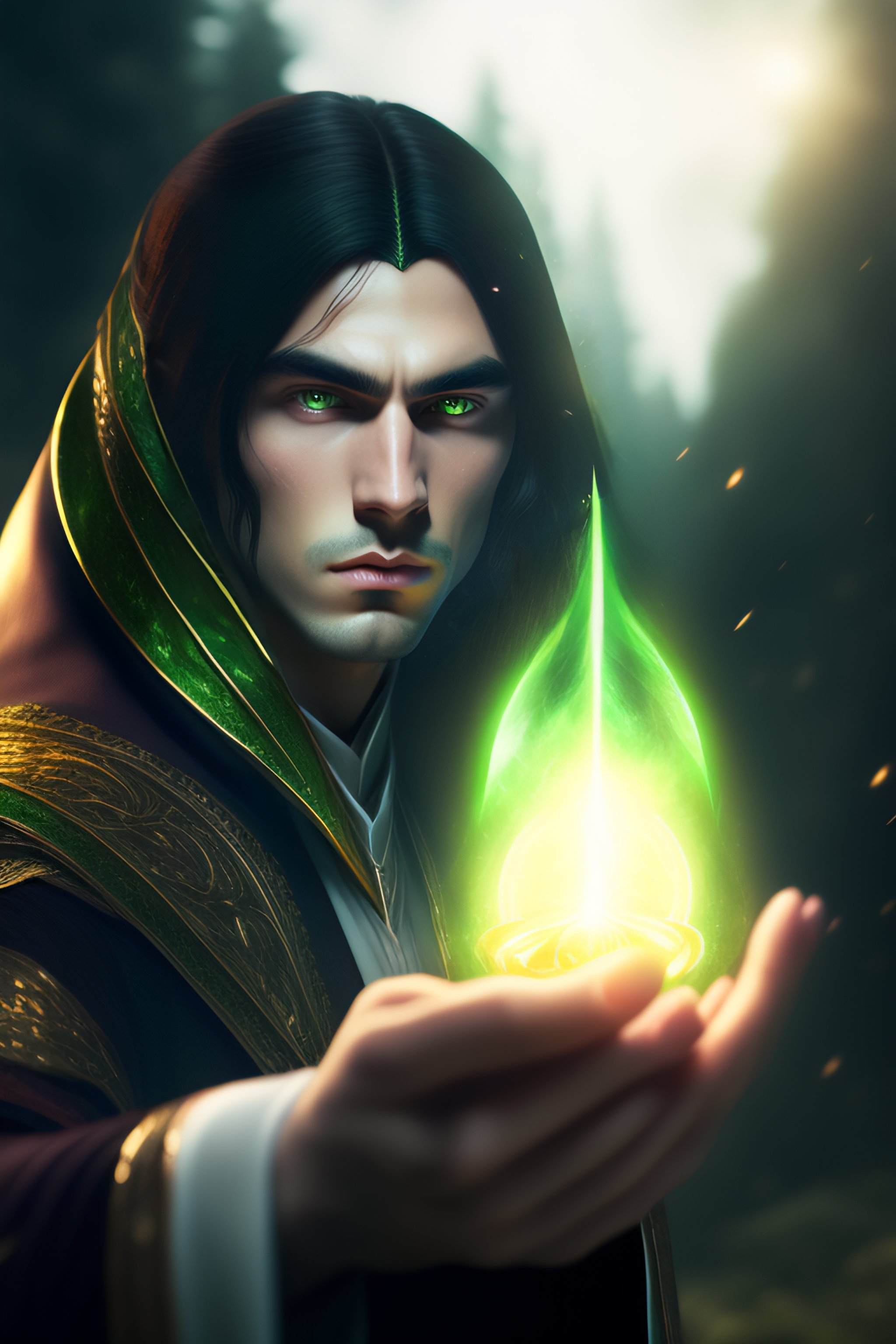 Young wizard with black hair and pale skin casting a green spell, elden ring style, deep focus, sharp, soft, tone mapped, volumetric lighting, 9k resolution, trending on art station, beautiful, elegant, highly detailed, model shoot