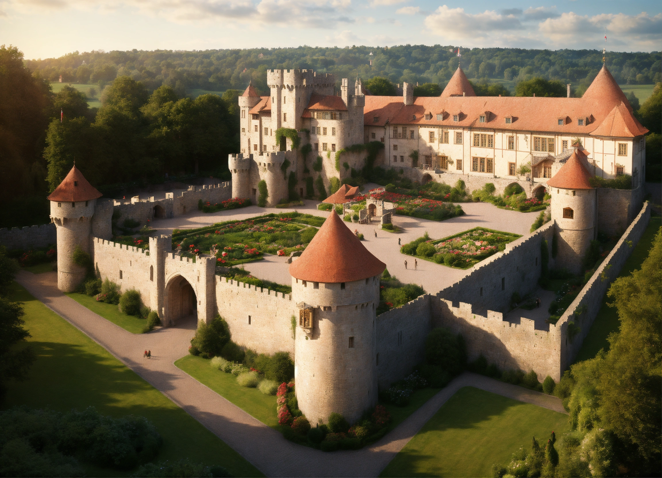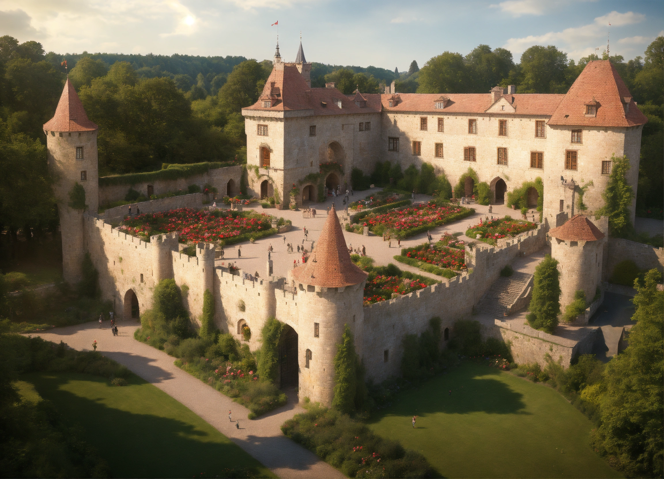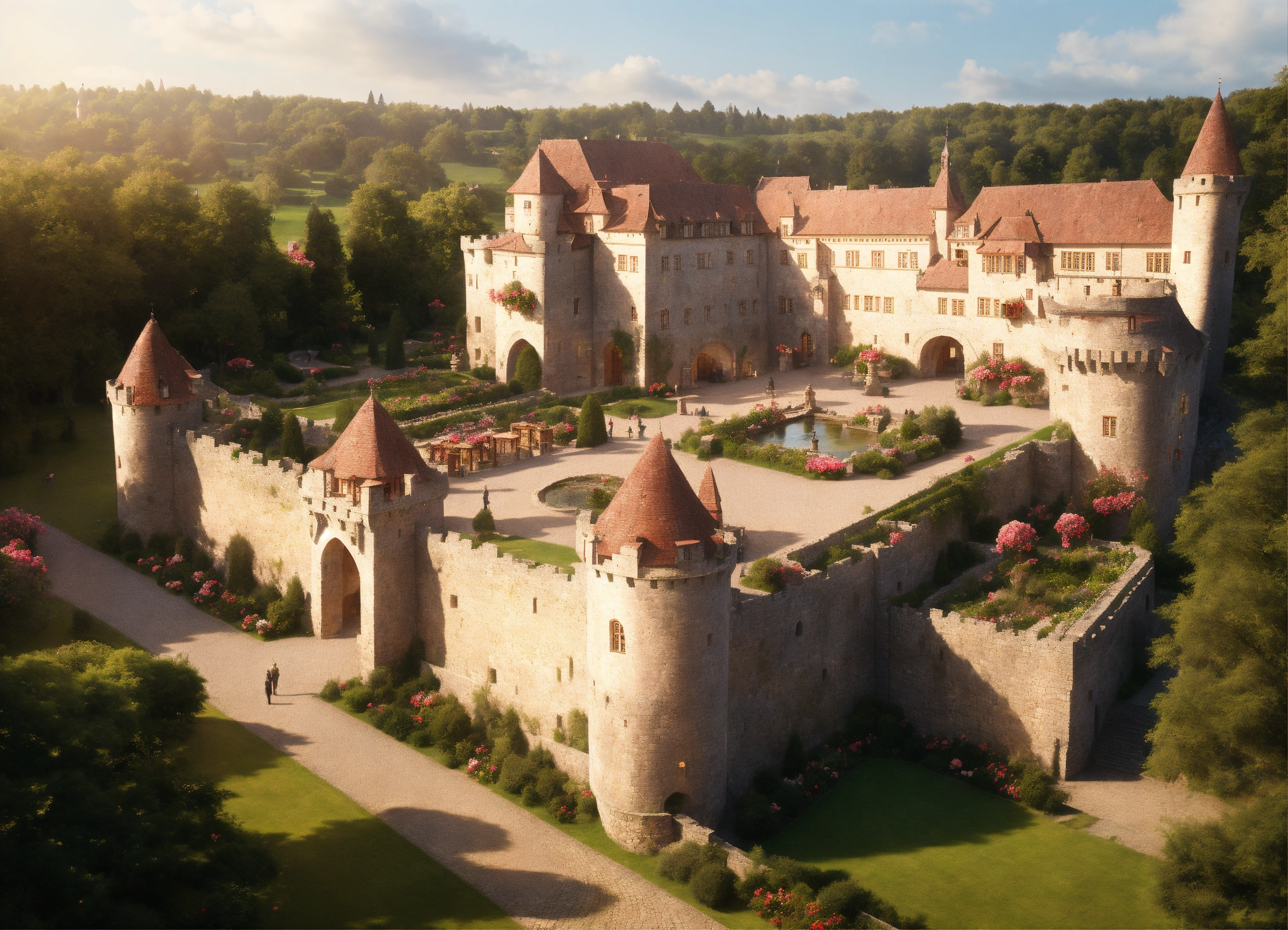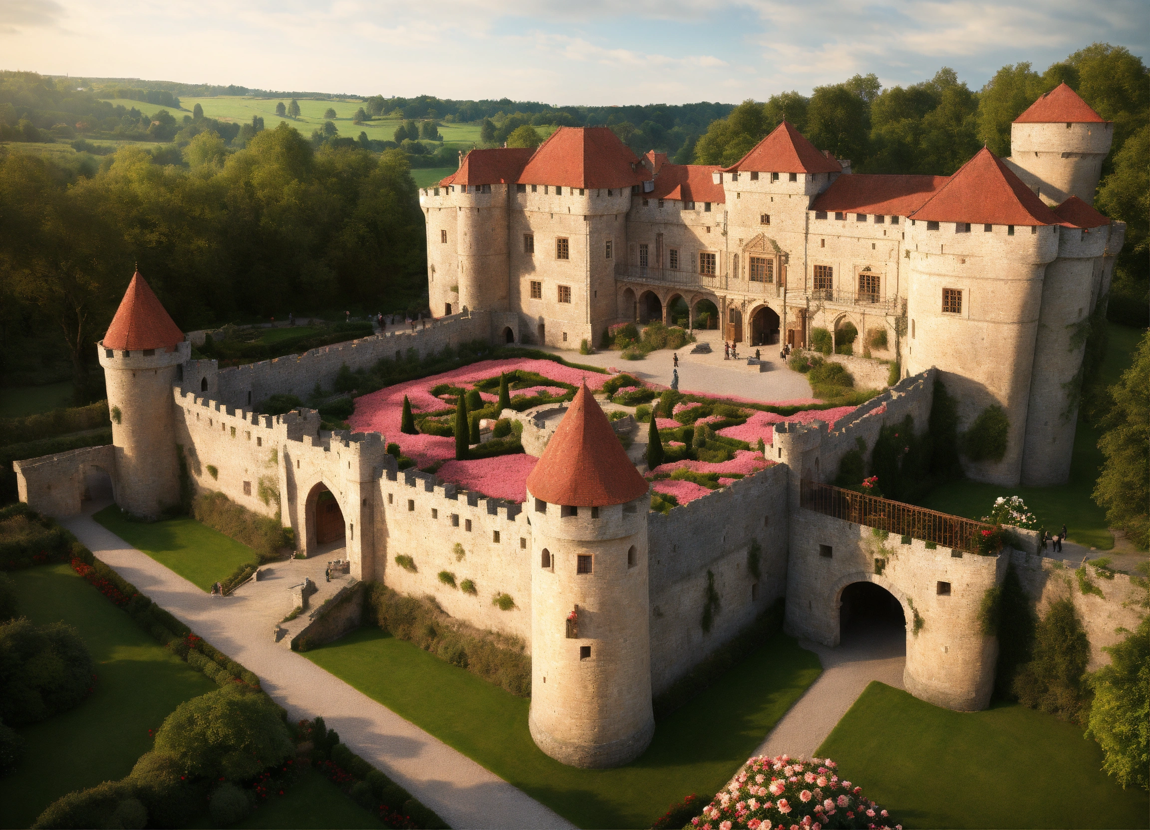 Ultra realistic, photorealistic, bird's eye view of a small medieval castle on a rock, garden terraces with pond, rose bowers, magnificent rose garden and arcades, magnificent fountain, massive crenellated stone wall with a central wall gate and watchtowers surrounds the castle area, with a large inner courtyard and several servants quarters and stables, rose pavillon, pleasure grotto, large forecourt, a wide boulevard leads to the entrance of the castle, extensive rose fields on hilly landscapes in the area around the castle, ultra detailled, focus on castle, sharp focus, sharp, ambient lighting, ksiąz castle in poland