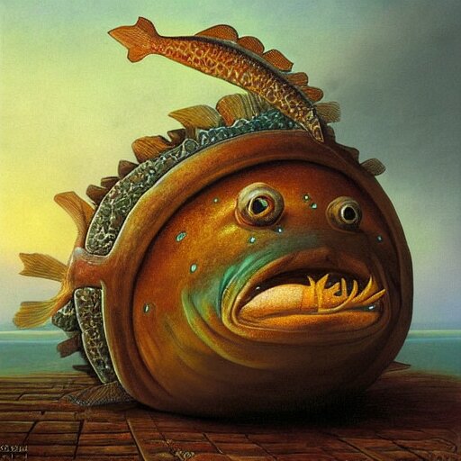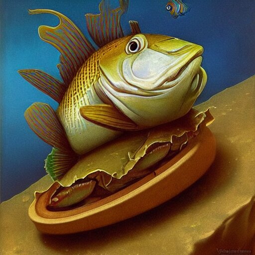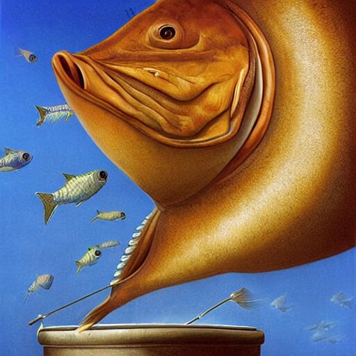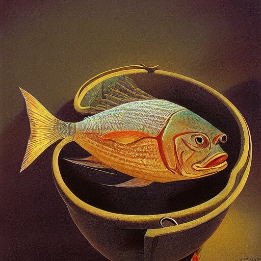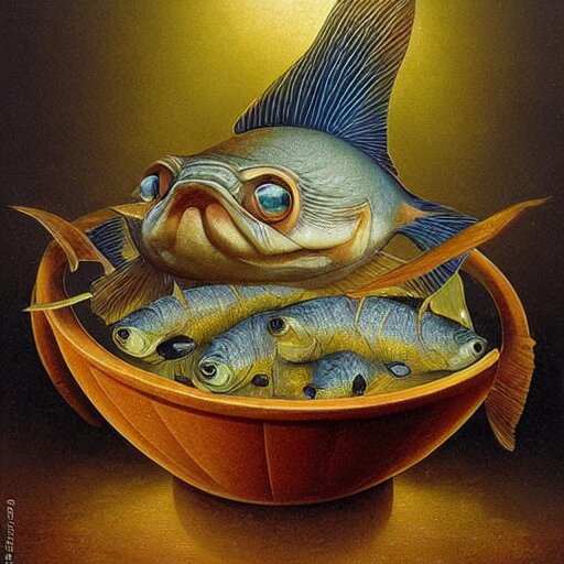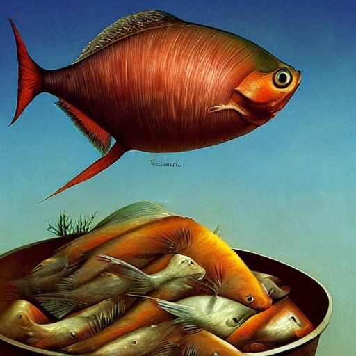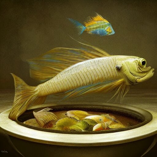 A worried fish on the top of a pile of fish, all the fish are inside a cooking pot, side view, by vladimir kush, dystopian art, rococo