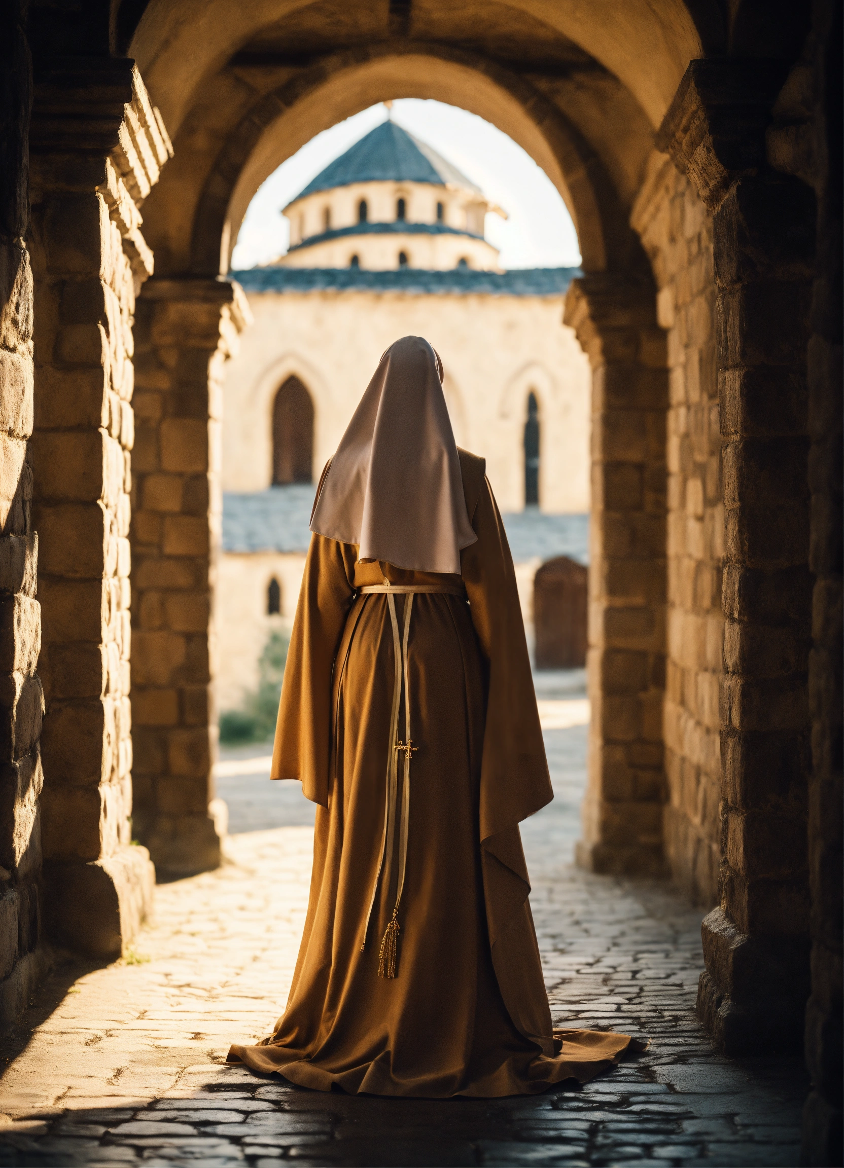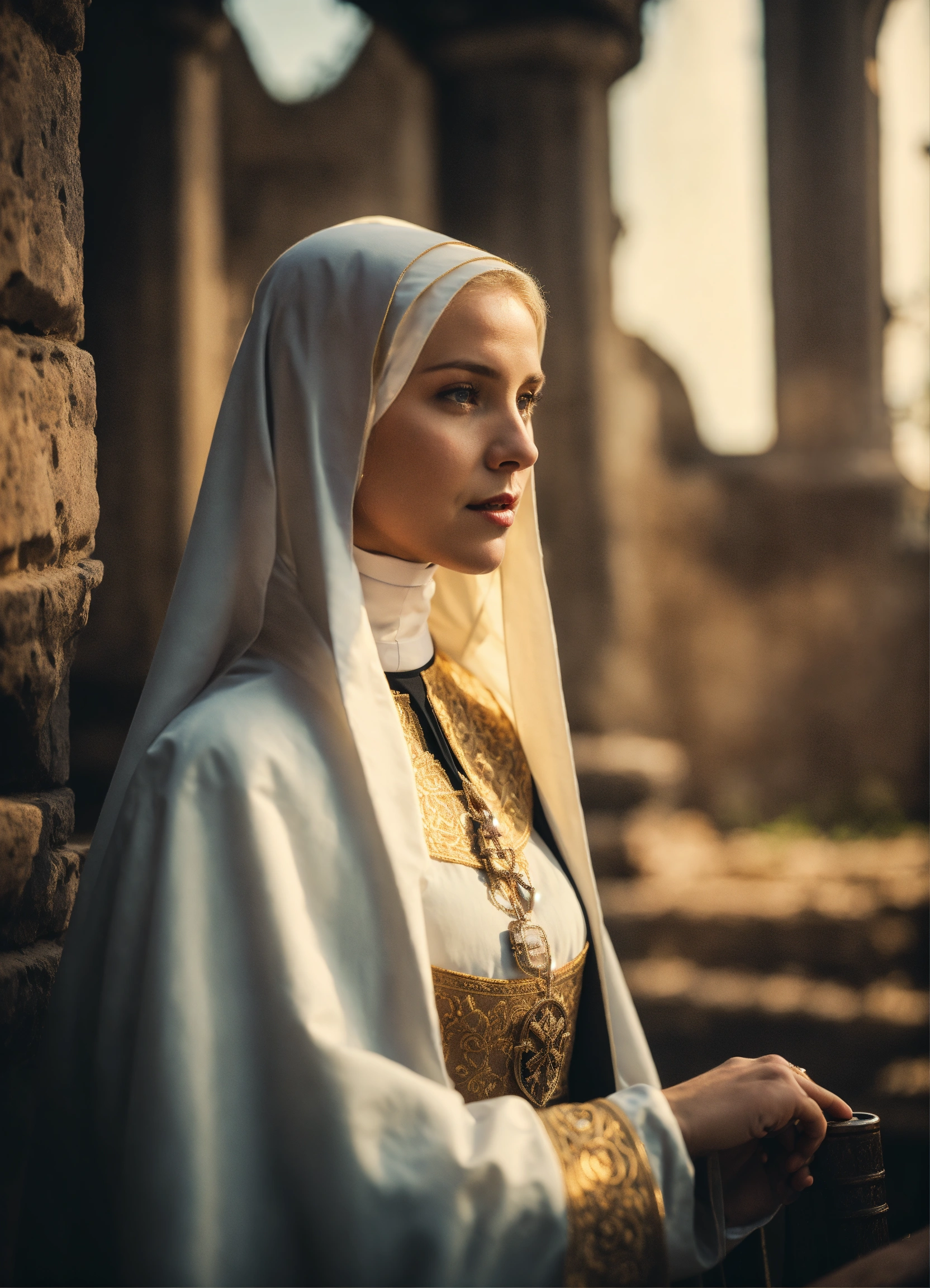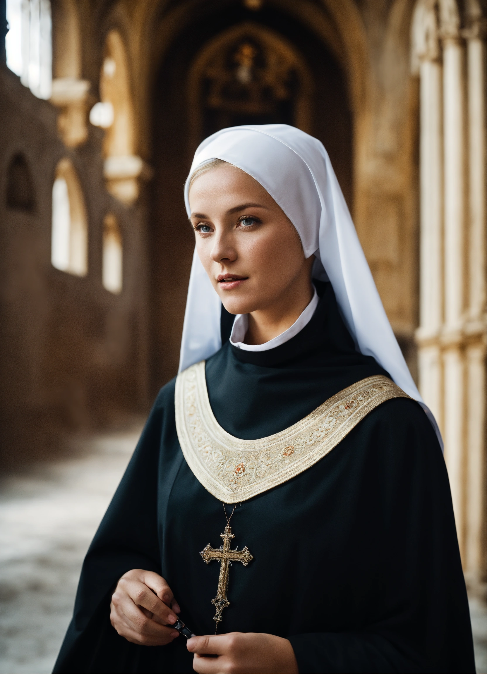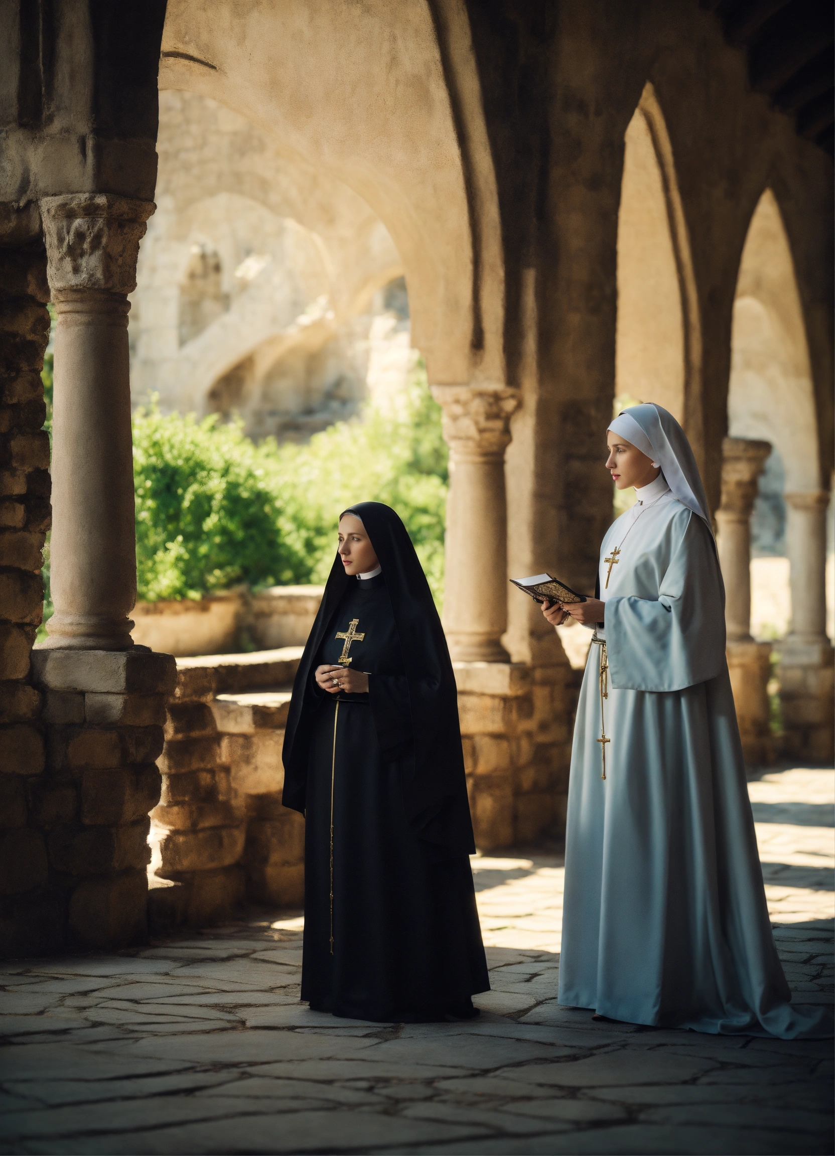 An epic fantasy scene featuring a gorgeous beautiful blonde nun in conversation with the abbess outdoor in medieval orthodox monastery. a blonde hair is seen. cinematic view, sharp detail.