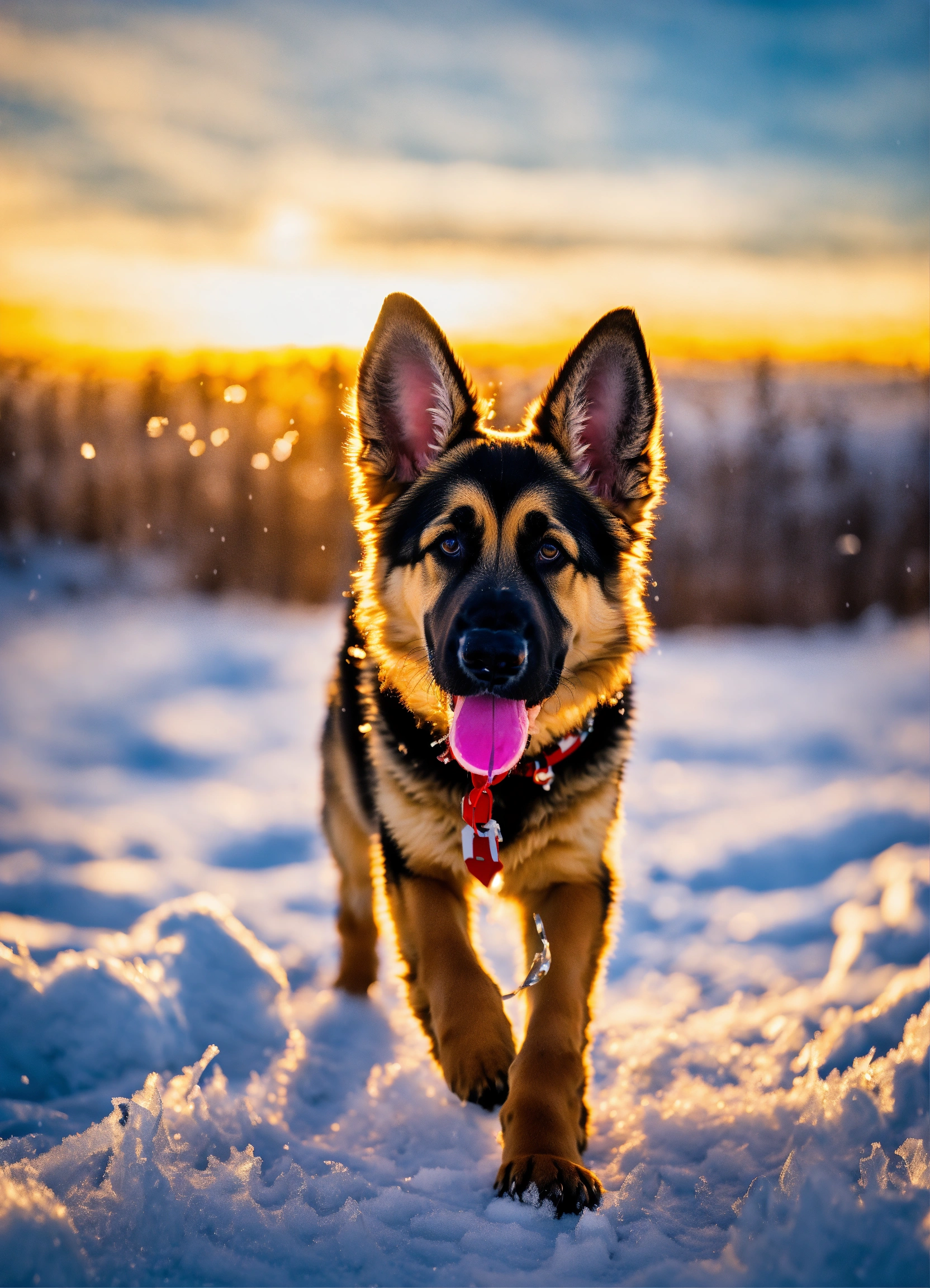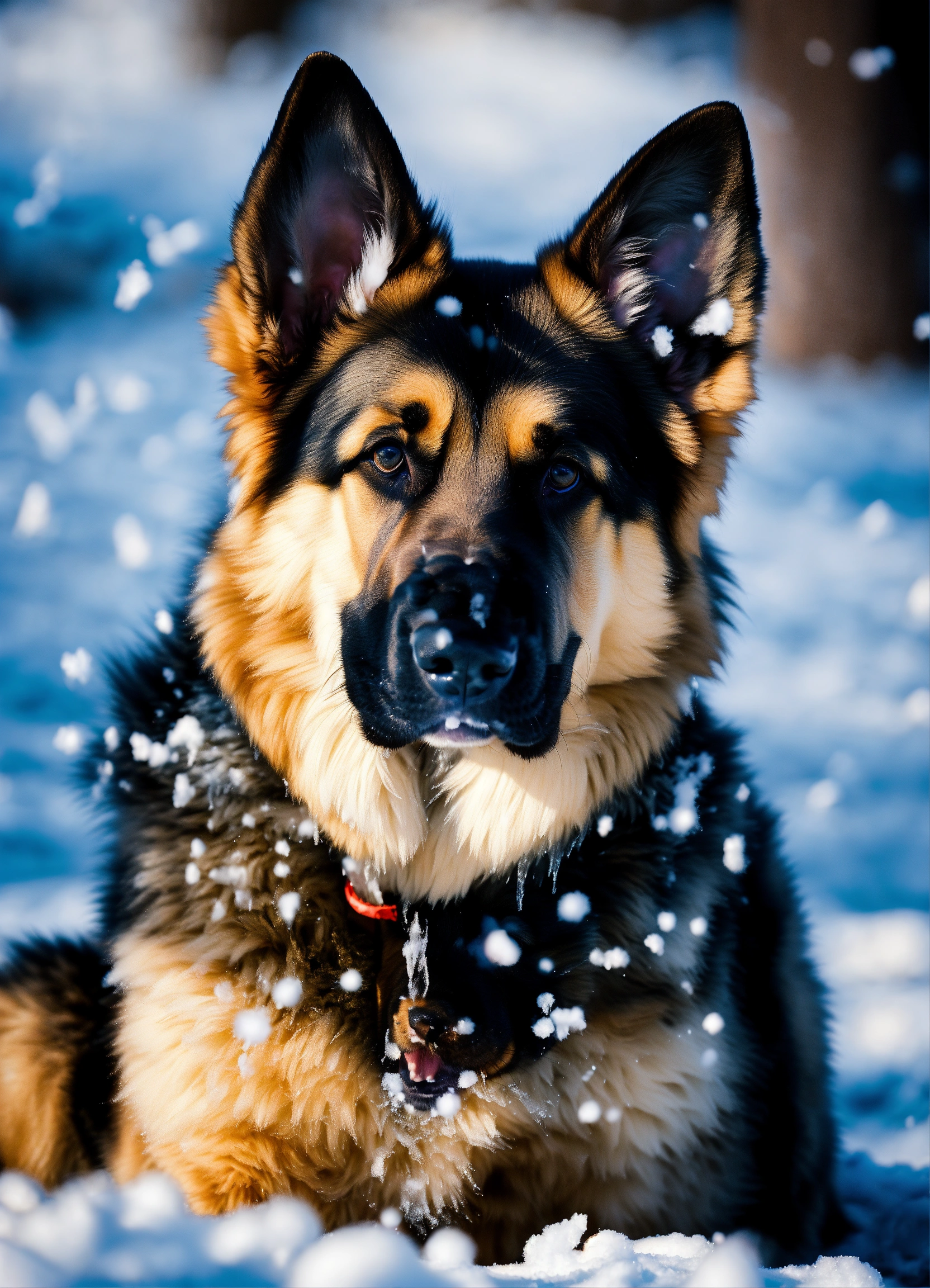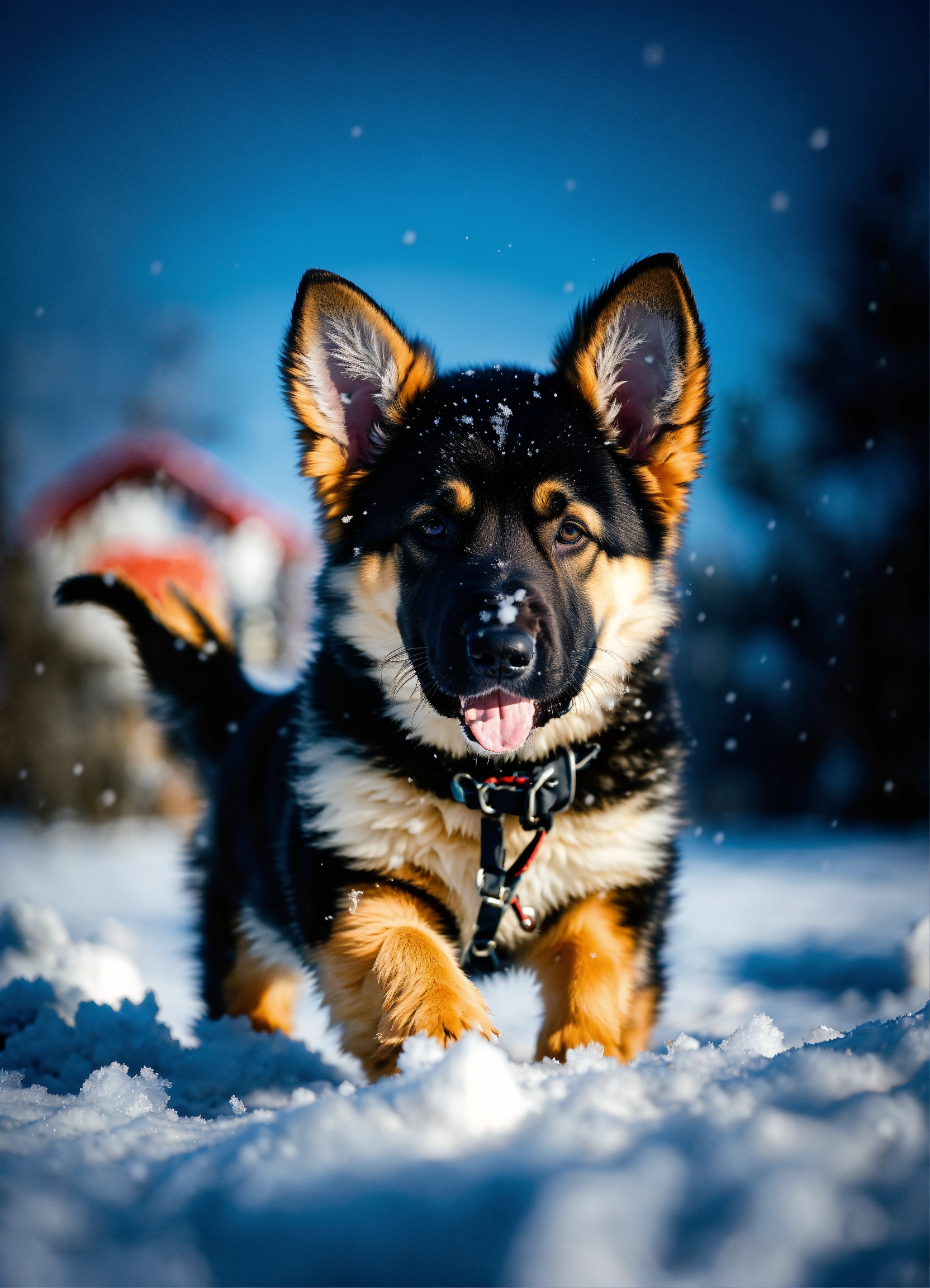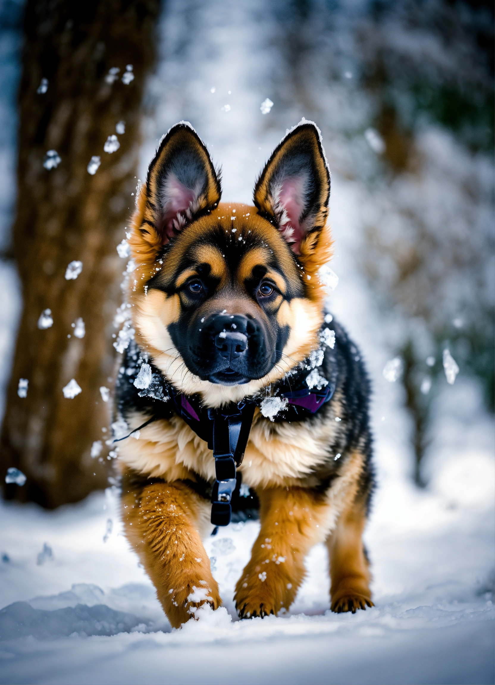 "icy pup expeditions" venture into the frosty wonderland with german shepherd puppies taking their first steps on snow. witness their fluffy tails wagging amidst snowflakes, playful snowball fights, and their curious sniffs at icicles. these photos encapsulate the blend of their innate playfulness with the enchanting serenity of a frozen frontier.