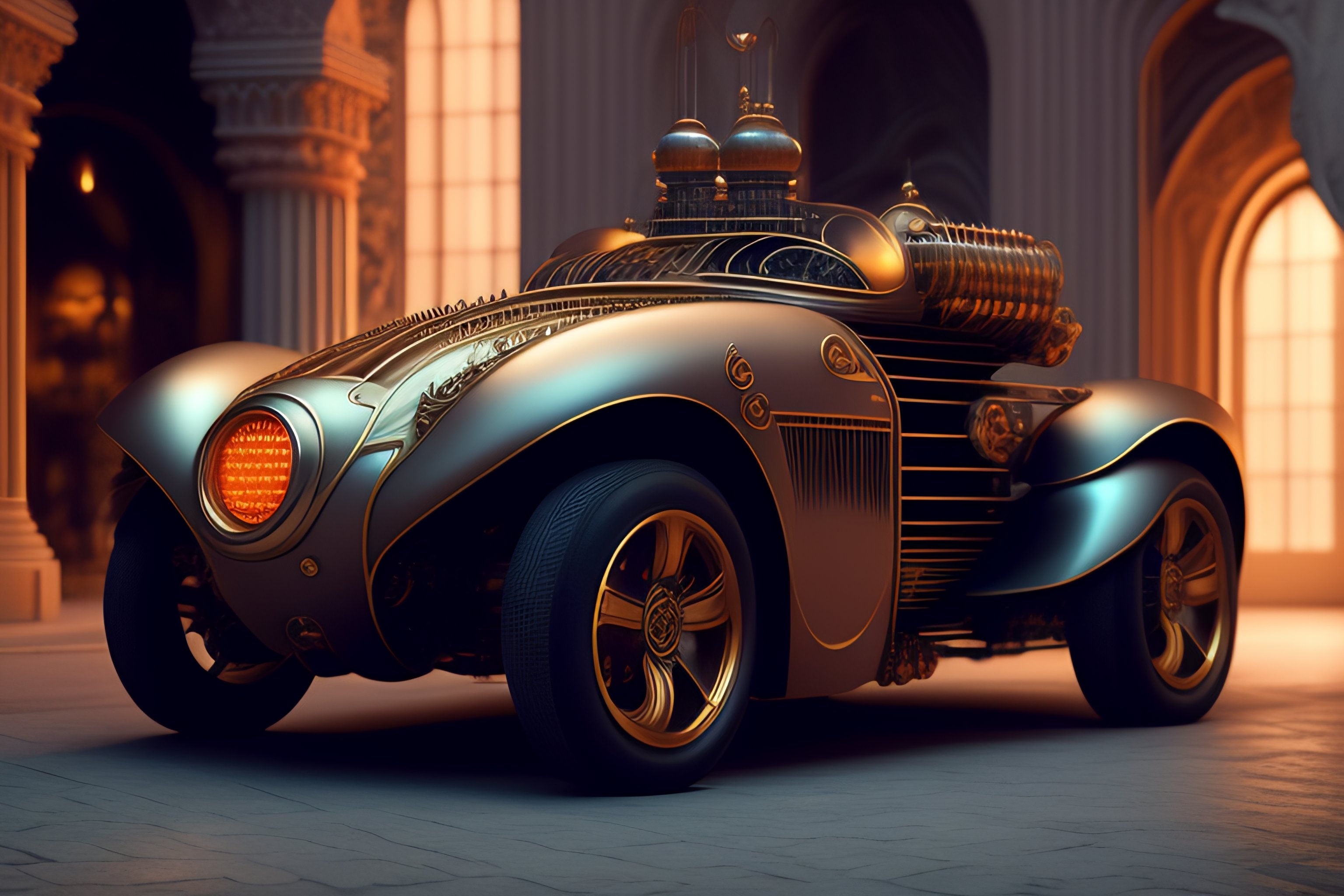 Wide shot of a minimal biomechanical steampunk vehicle reminiscent of 90s car 1990, glowing headlights in ancient palace, gothic and baroque, brutalist architecture, ultradetailed, creepy ambiance, fog, artgerm, giger, by ellen jewett and josan gonzalez and giuseppe arcimboldo