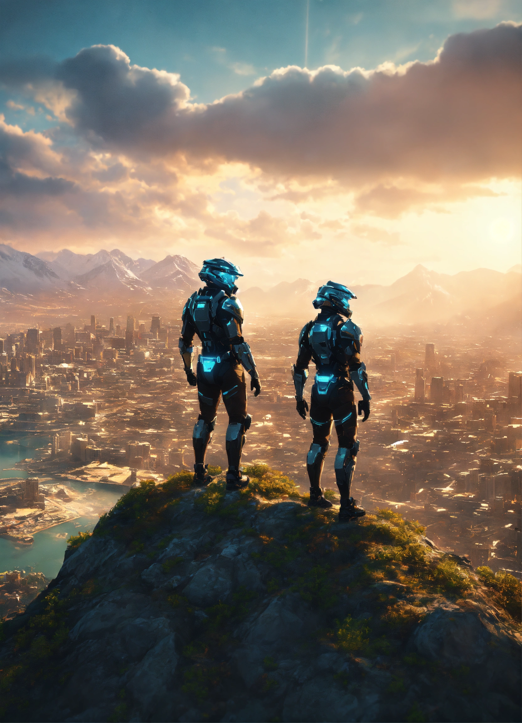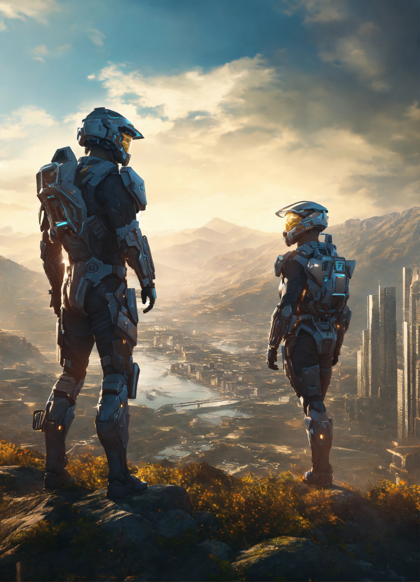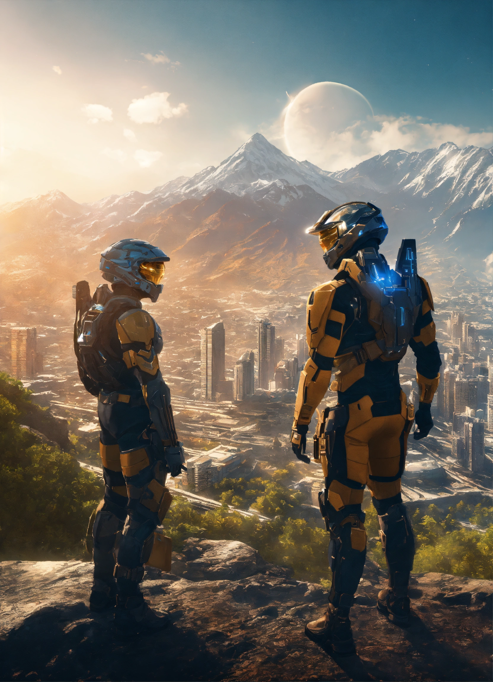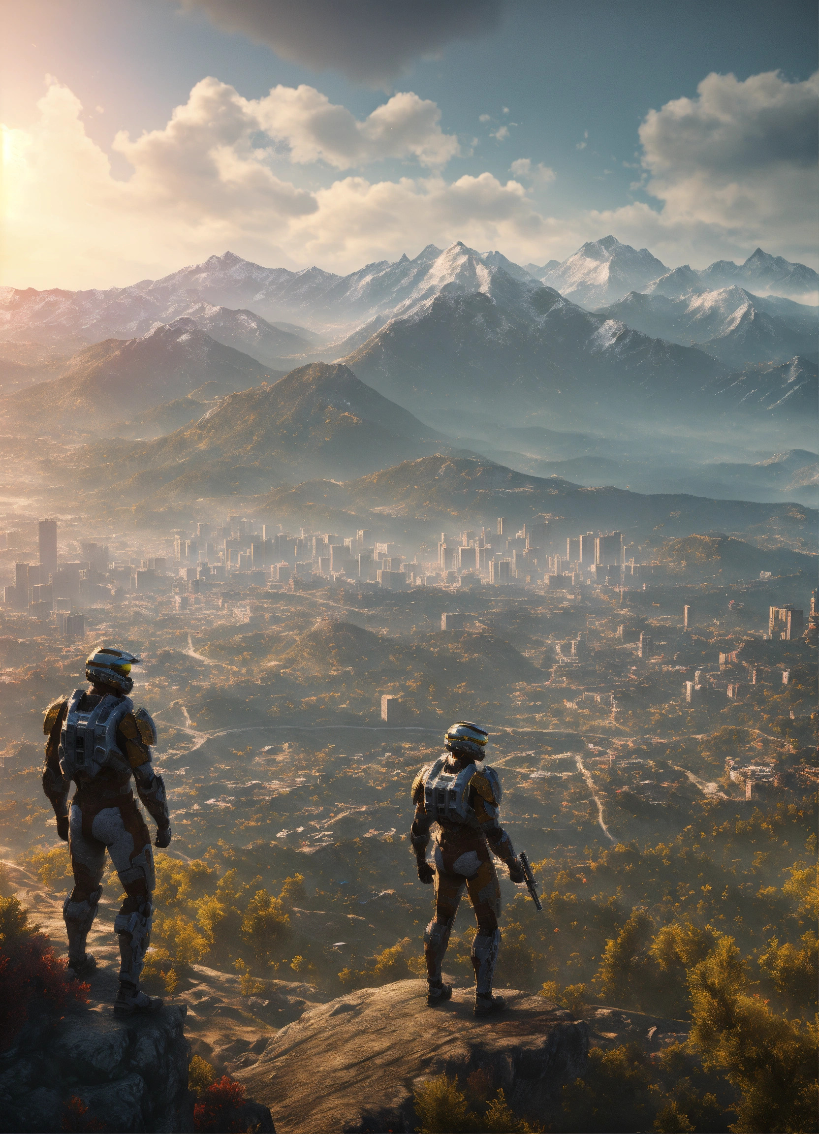 A cgi, highly detailed portrait of two figures. 1000 x 1600 pixels, 300 resolution. aerial view over a year 2100 city in the mountains in the background. it's daylight. halo video game feel