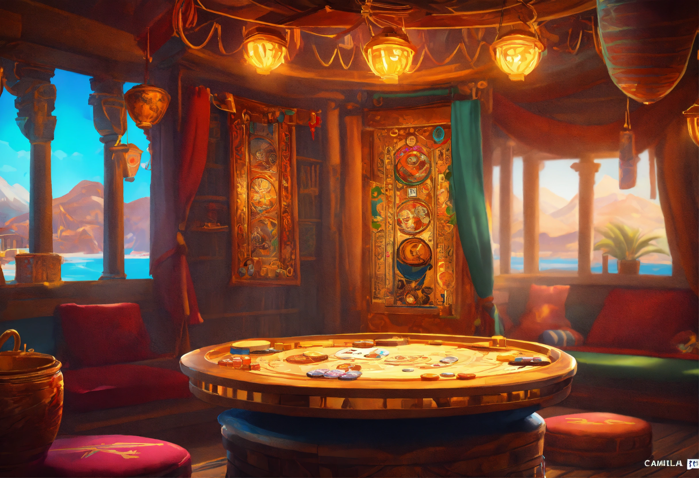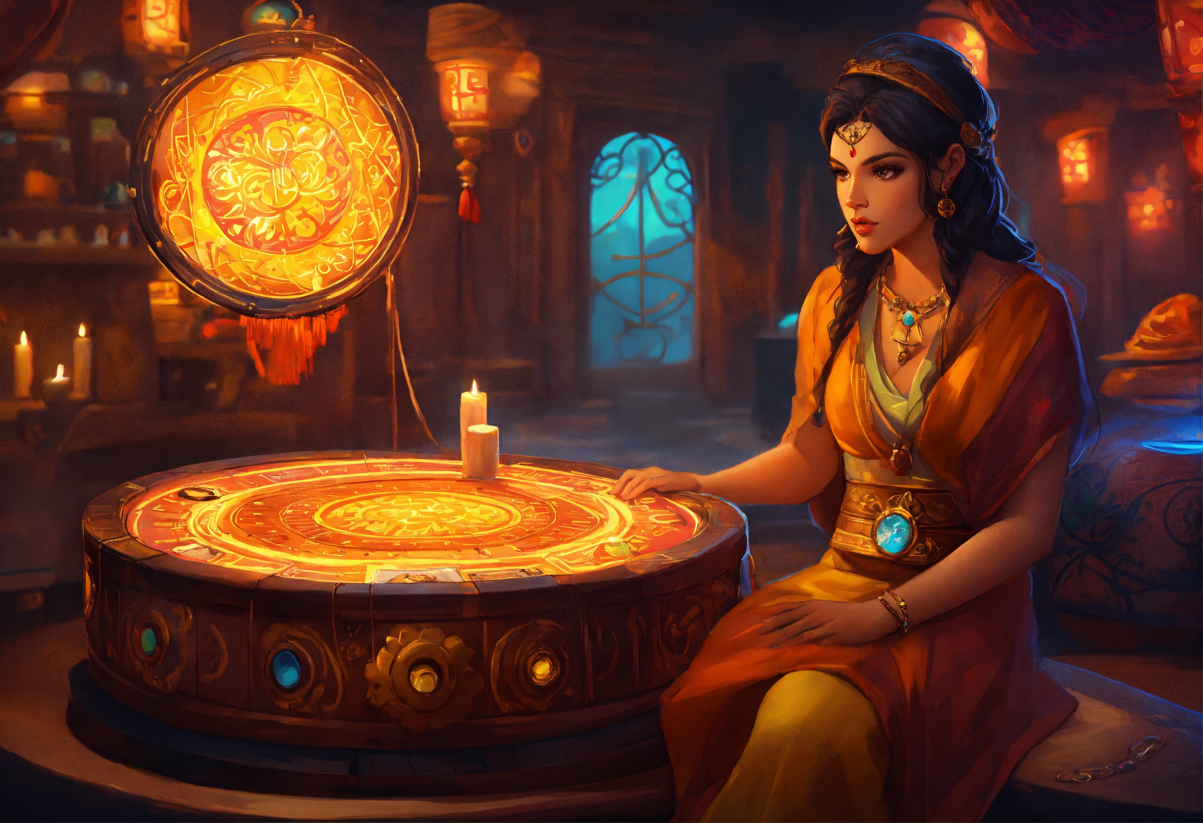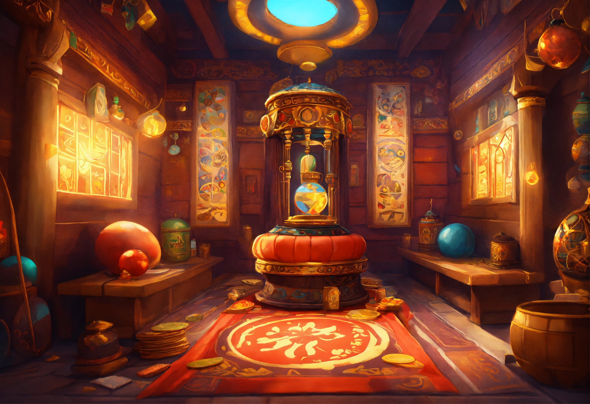 Fortune teller interior ambient, reels background for the slot game, realistic cartoon oil paint, 2d illustration style, sharp focus, bright color, digital paint design, trending on artstation, high details, simple lines, art by josé luis ágreda and camilla d'errico.