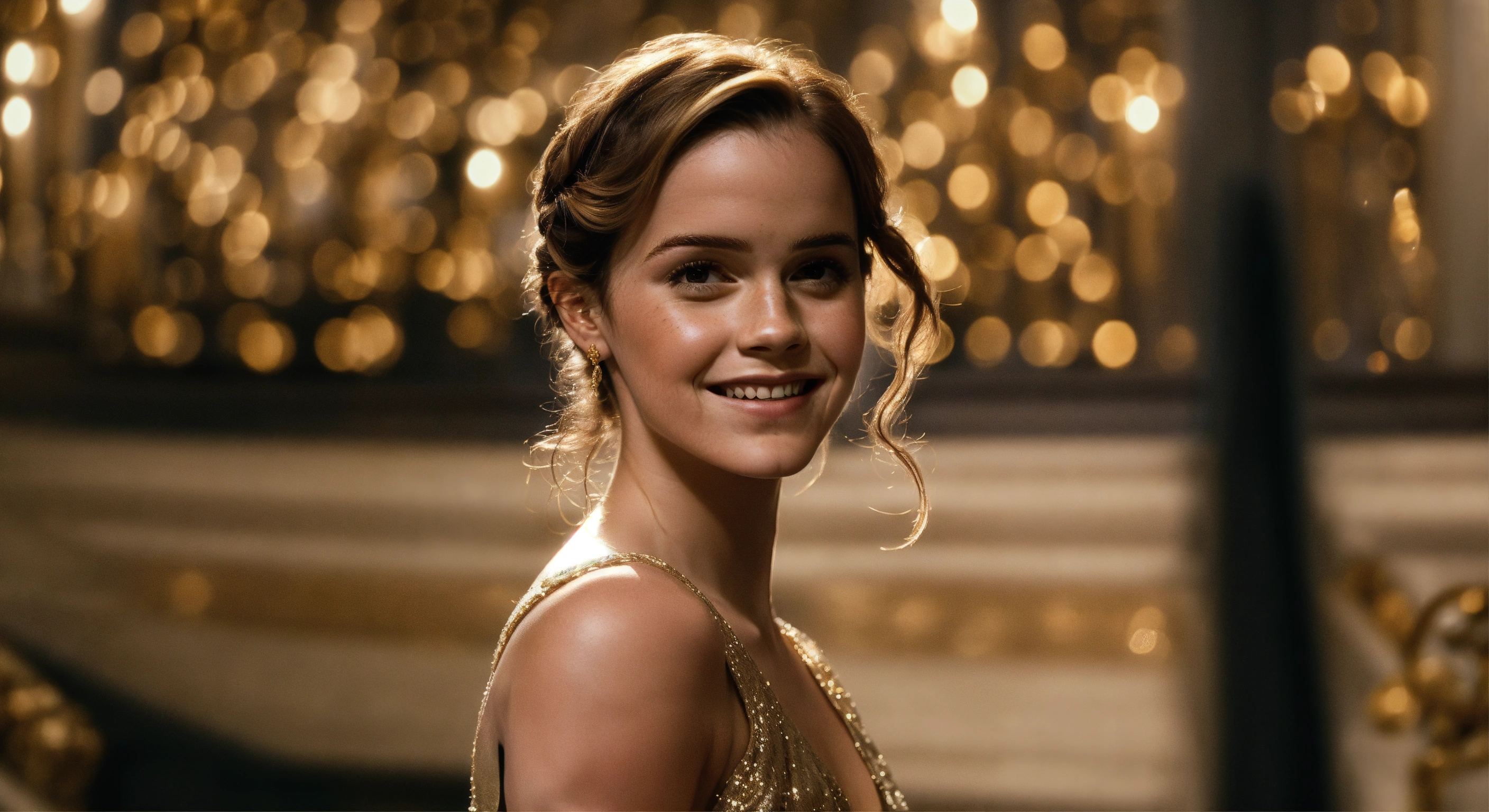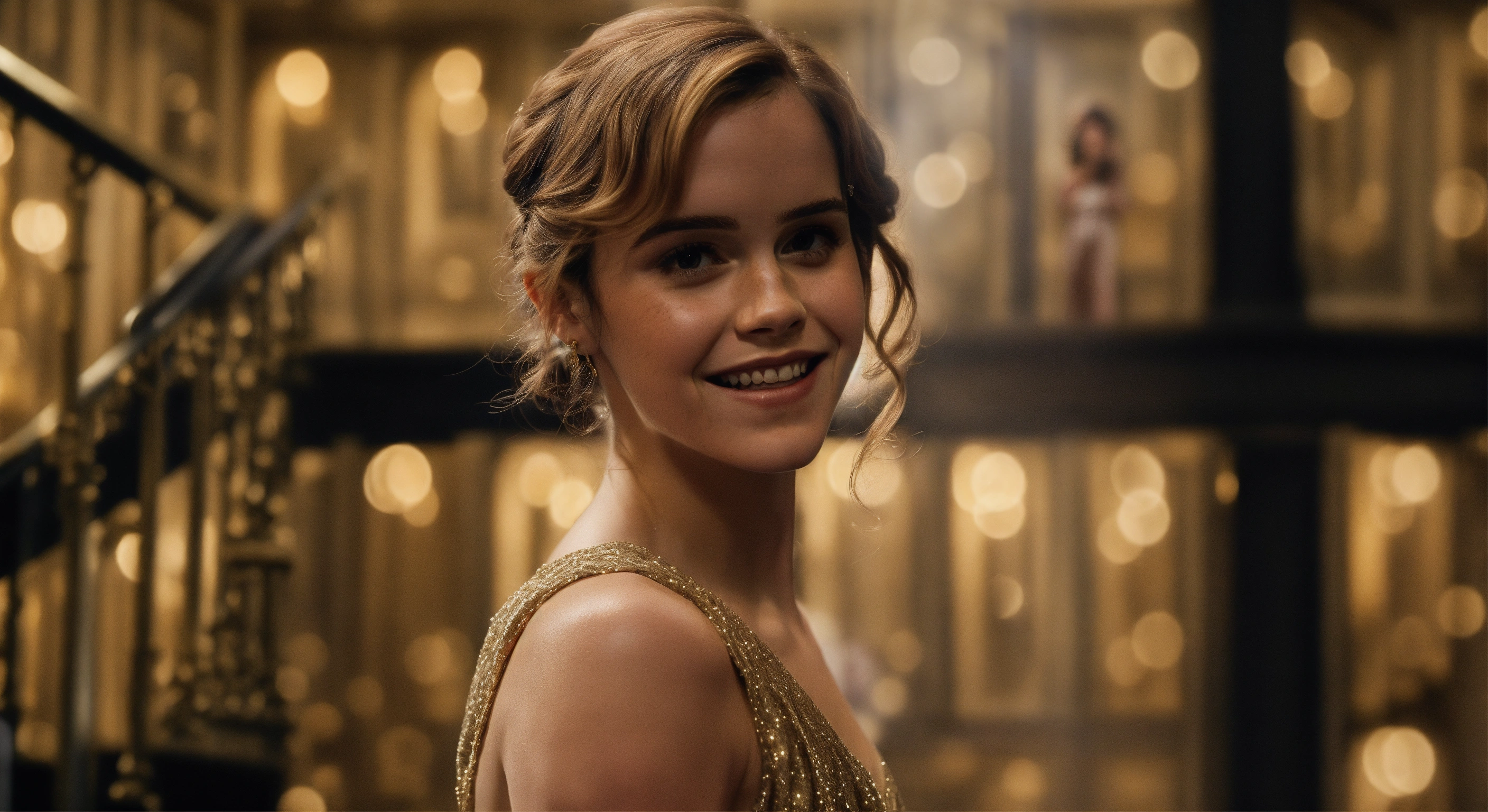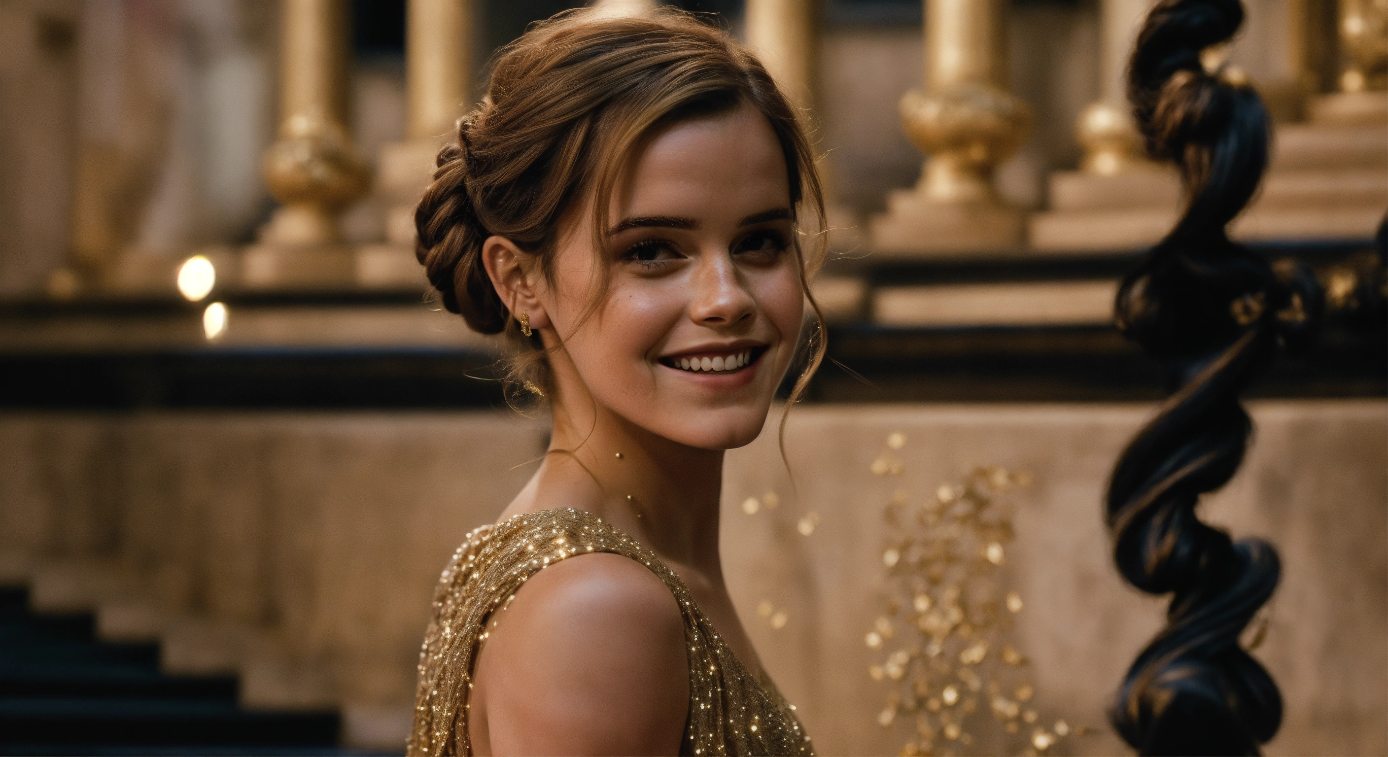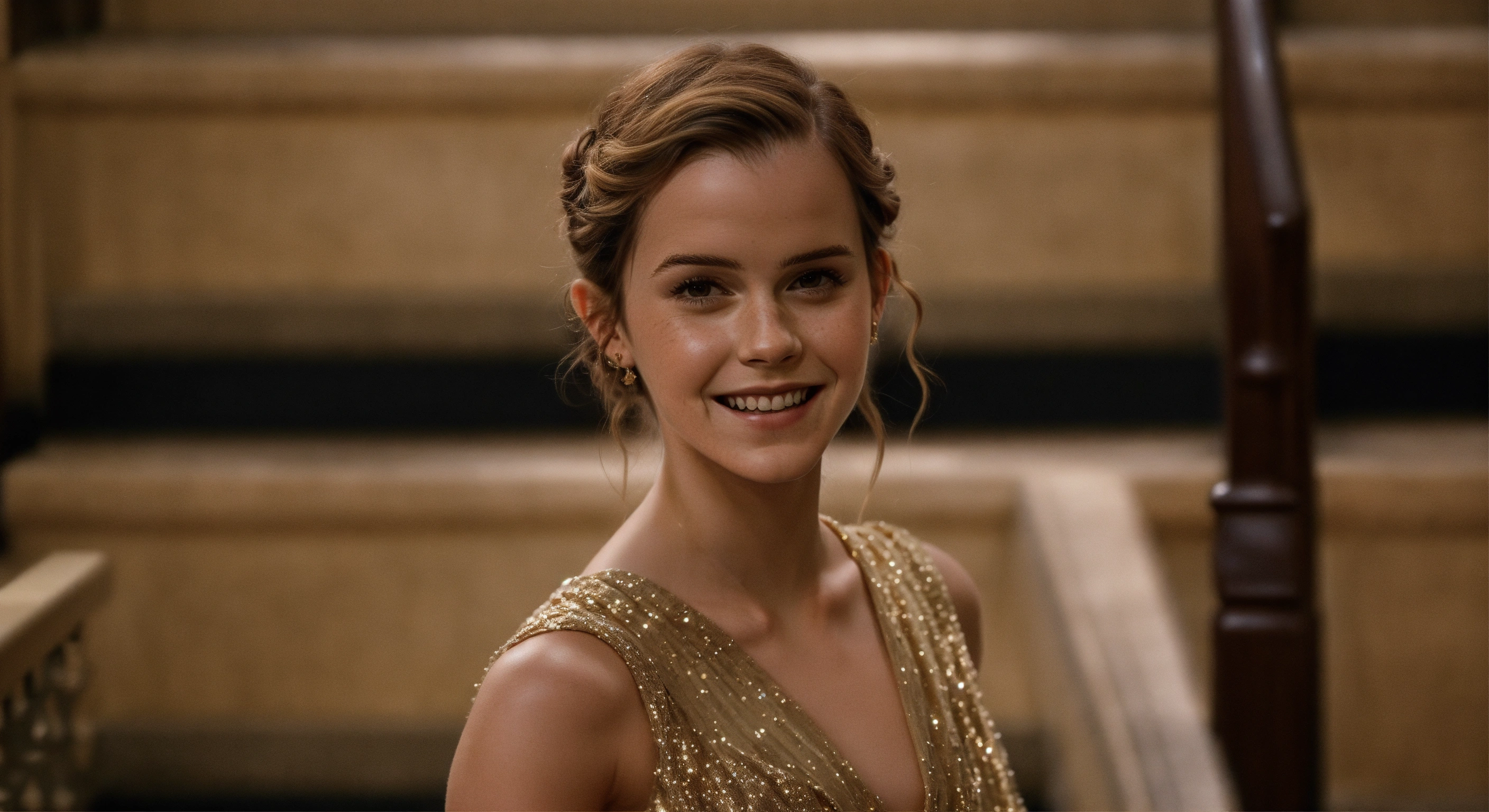 High quality, movie scene of emma watson as hermione granger smiling with a curly updo in a gold sparkly dress walking down grand stairs at a white a gold gala on new years day. brown tones. 8k resolution. digital art, high quality, realistic, tv show lighting, perfect lighting, canon 35mm f2.0, natural lighting, film grain