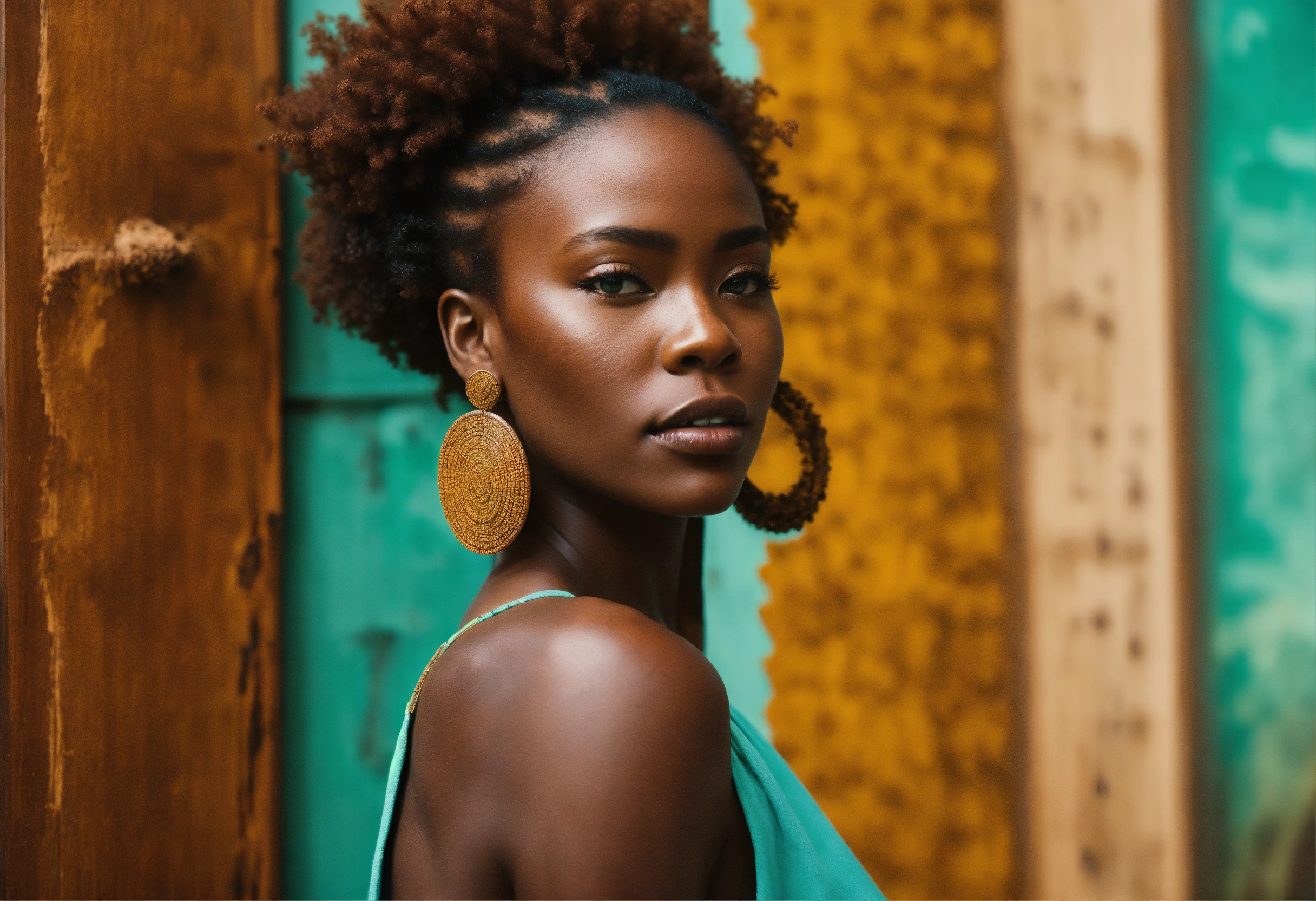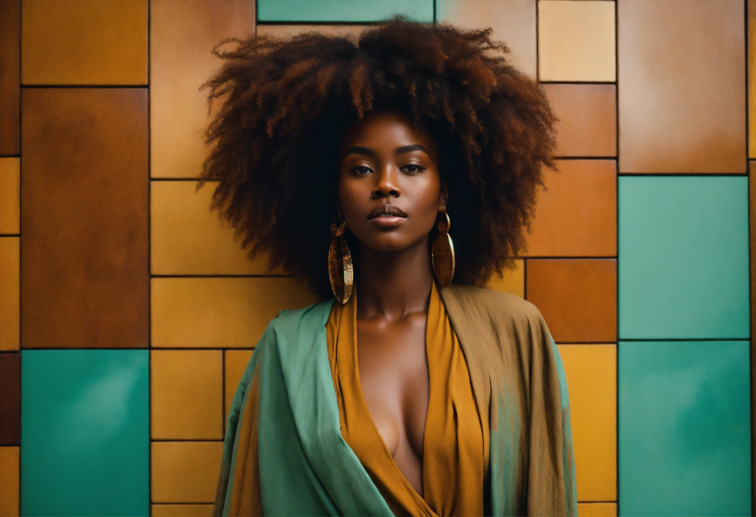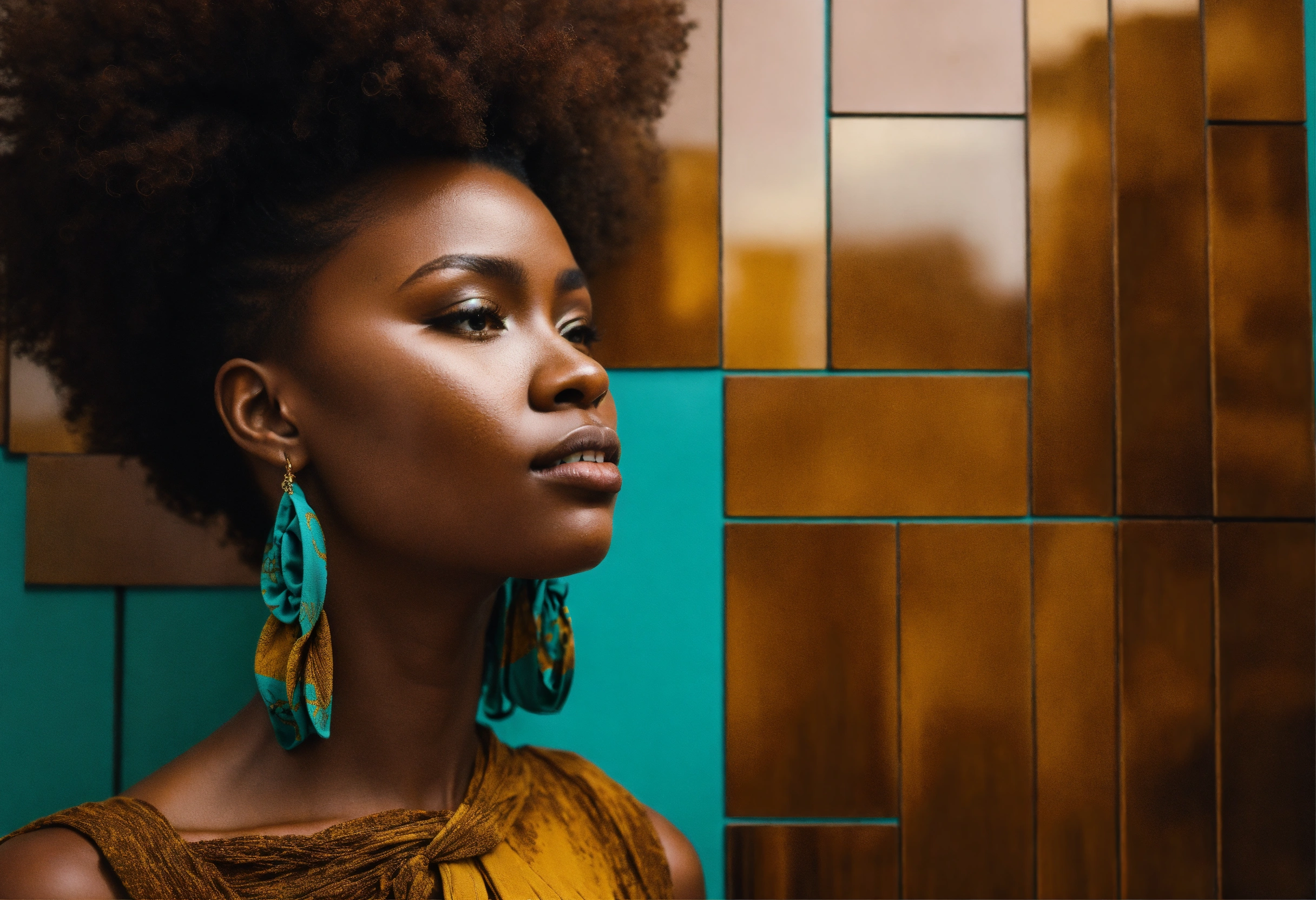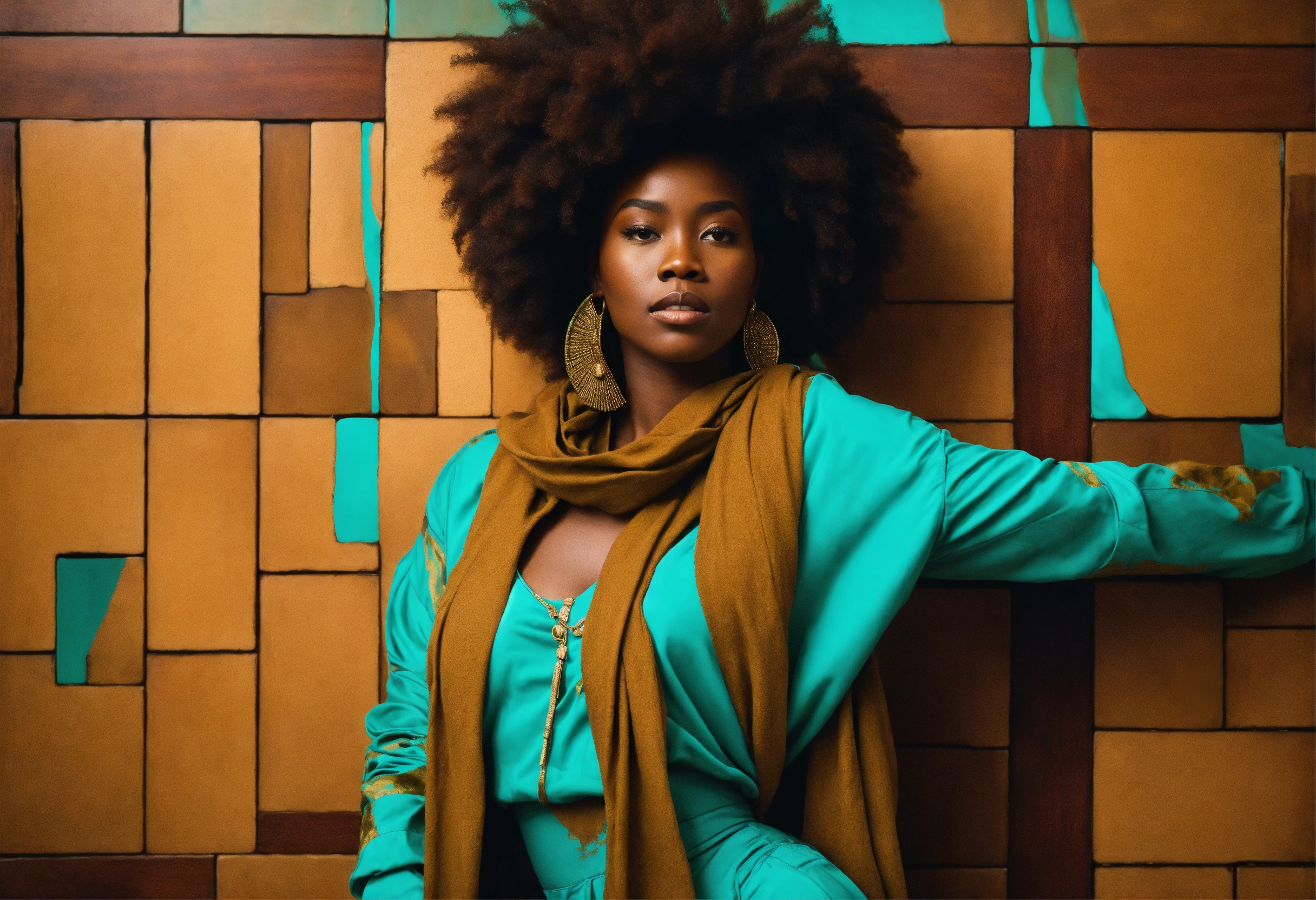 Breaking through a gallery wall a beautifully majestic afrocentric woman holding on with dear life to the reflection of herself standing next to the wall to drag back towards herself, color palette; turquoise rich mahogany burnt umber mustard shades of verde, rule of thirds