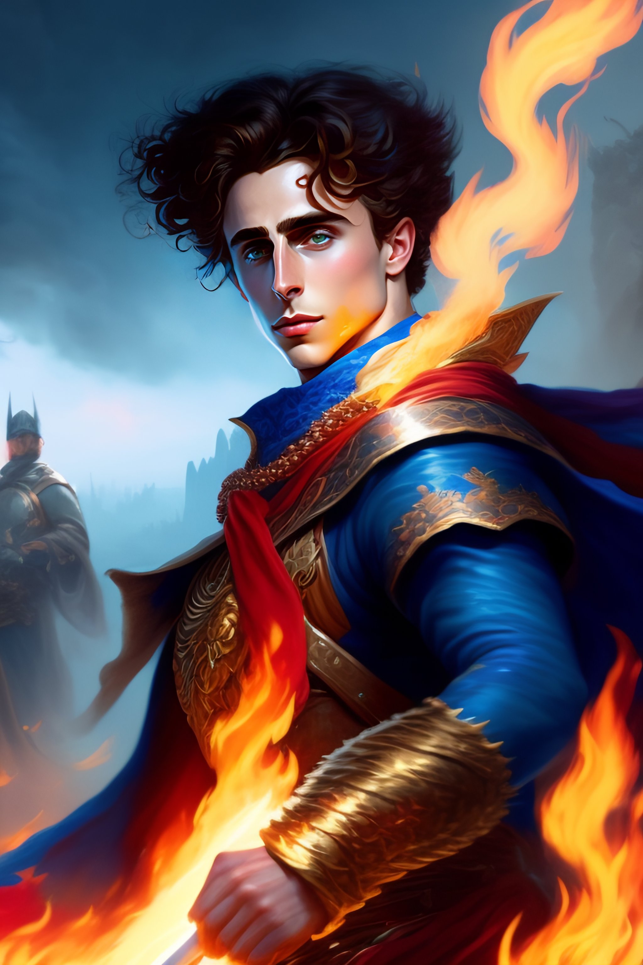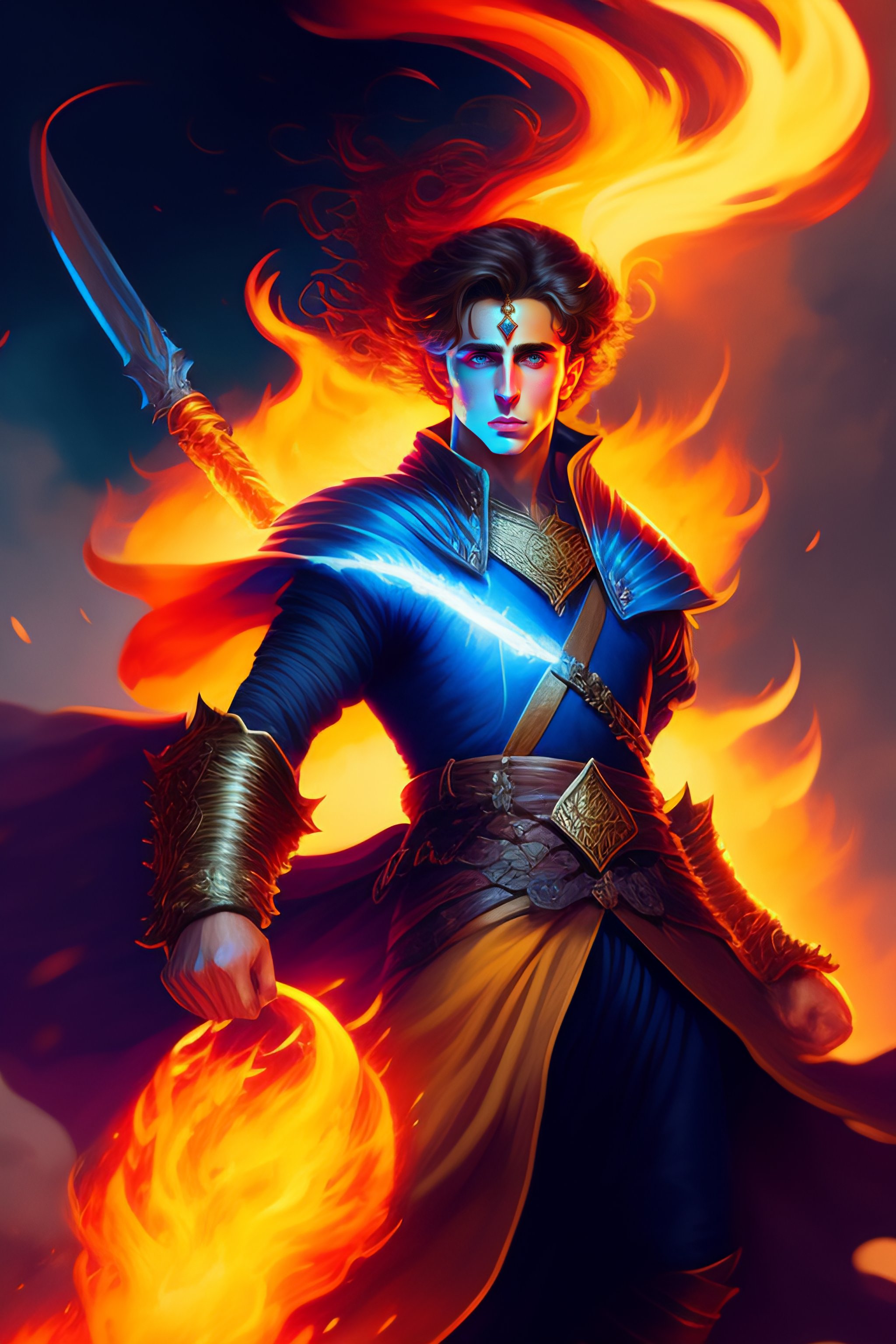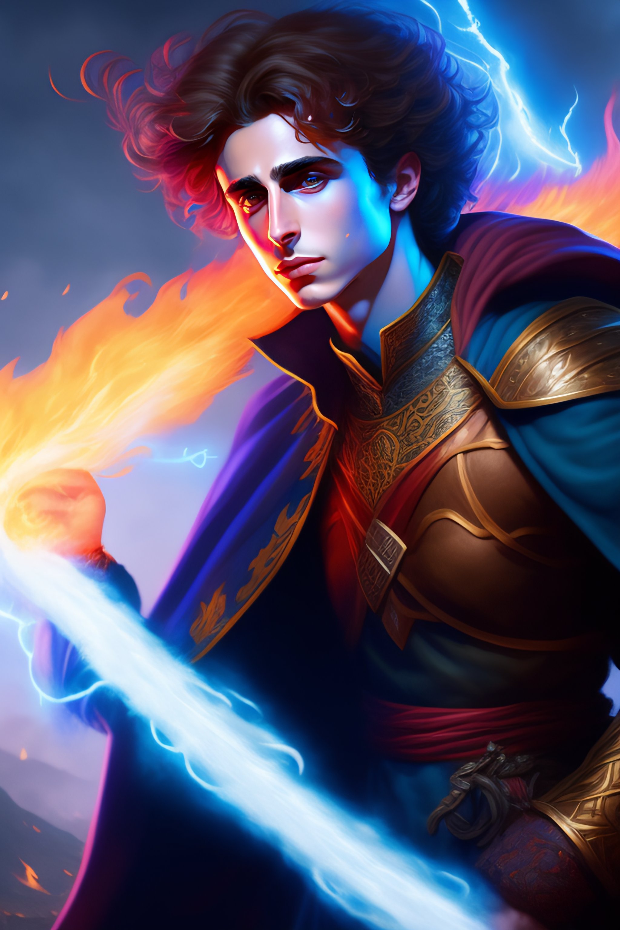 A pyromancer looking like timothy chalamet wearing peasant clothes is fighting hulk with blue thunderbolt, blue flames, medium level shot, epic scene, mucha style, general fantasy, illustration, concept art
