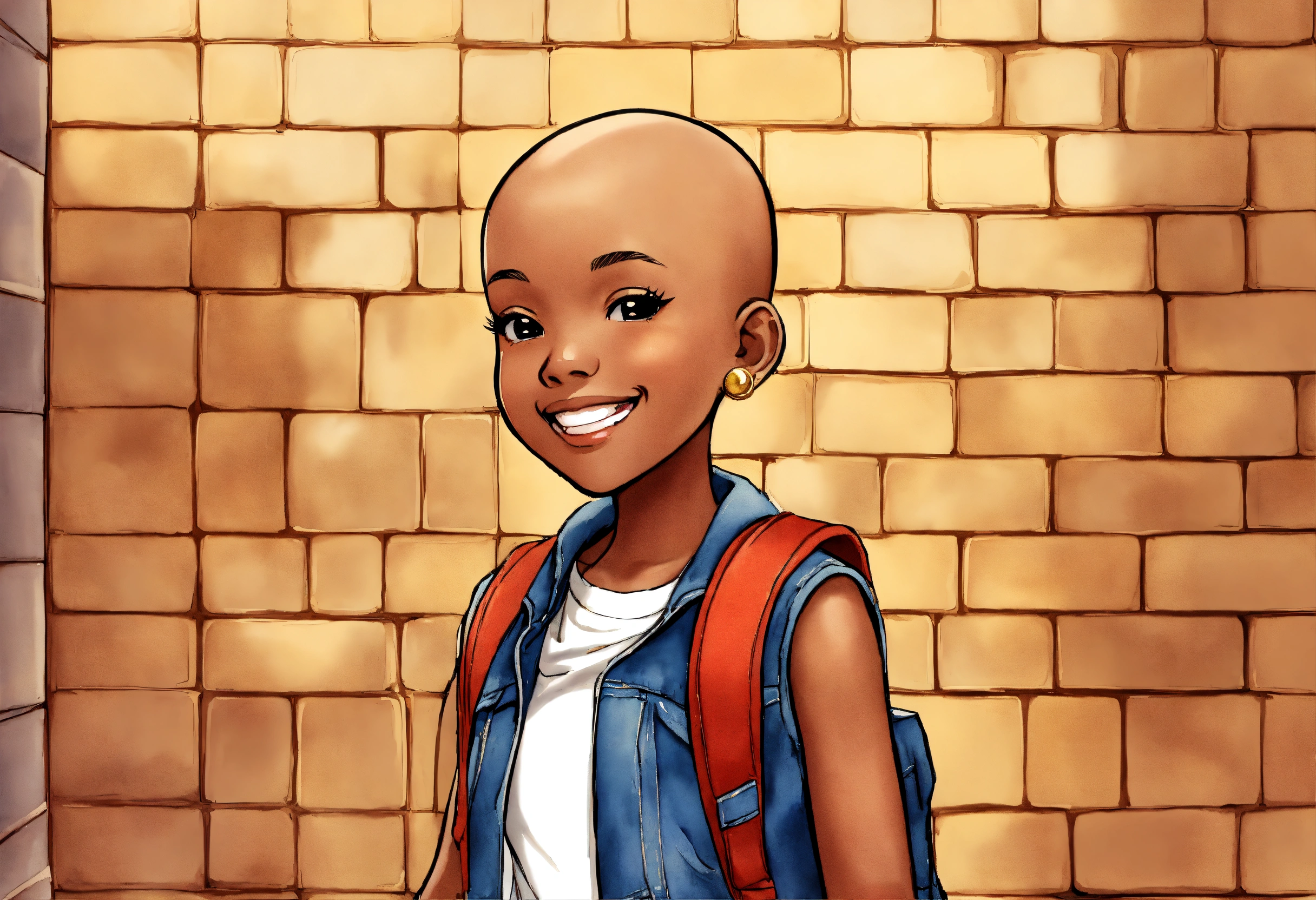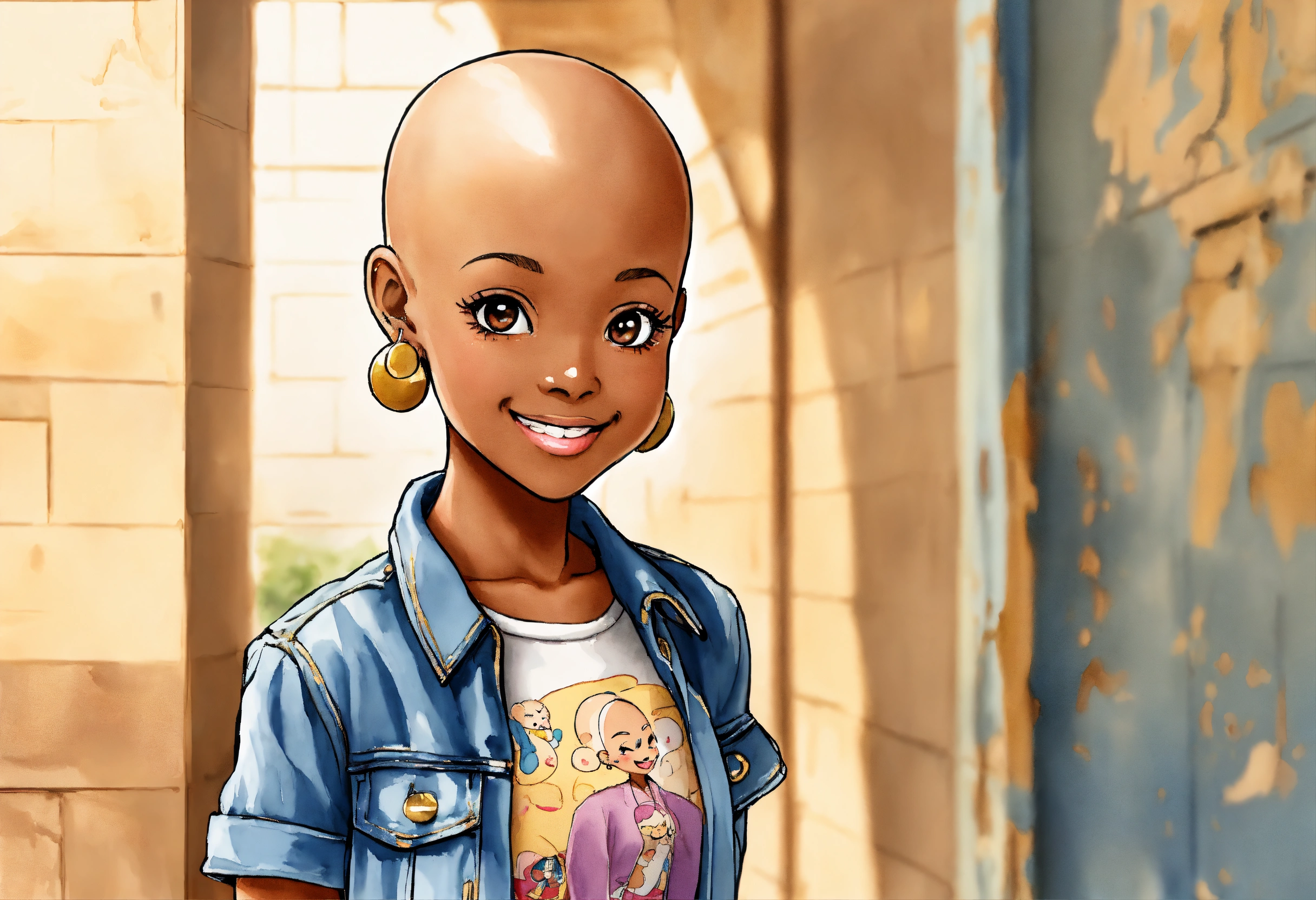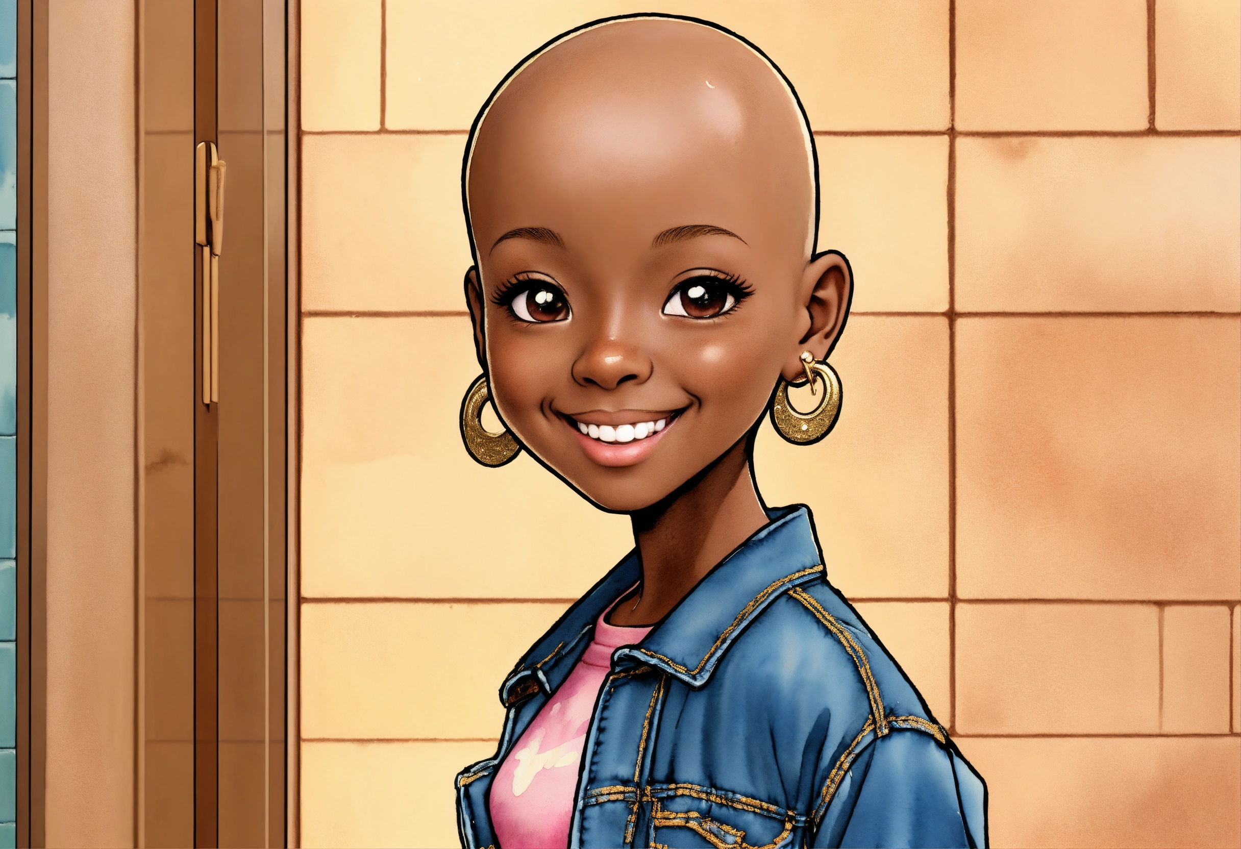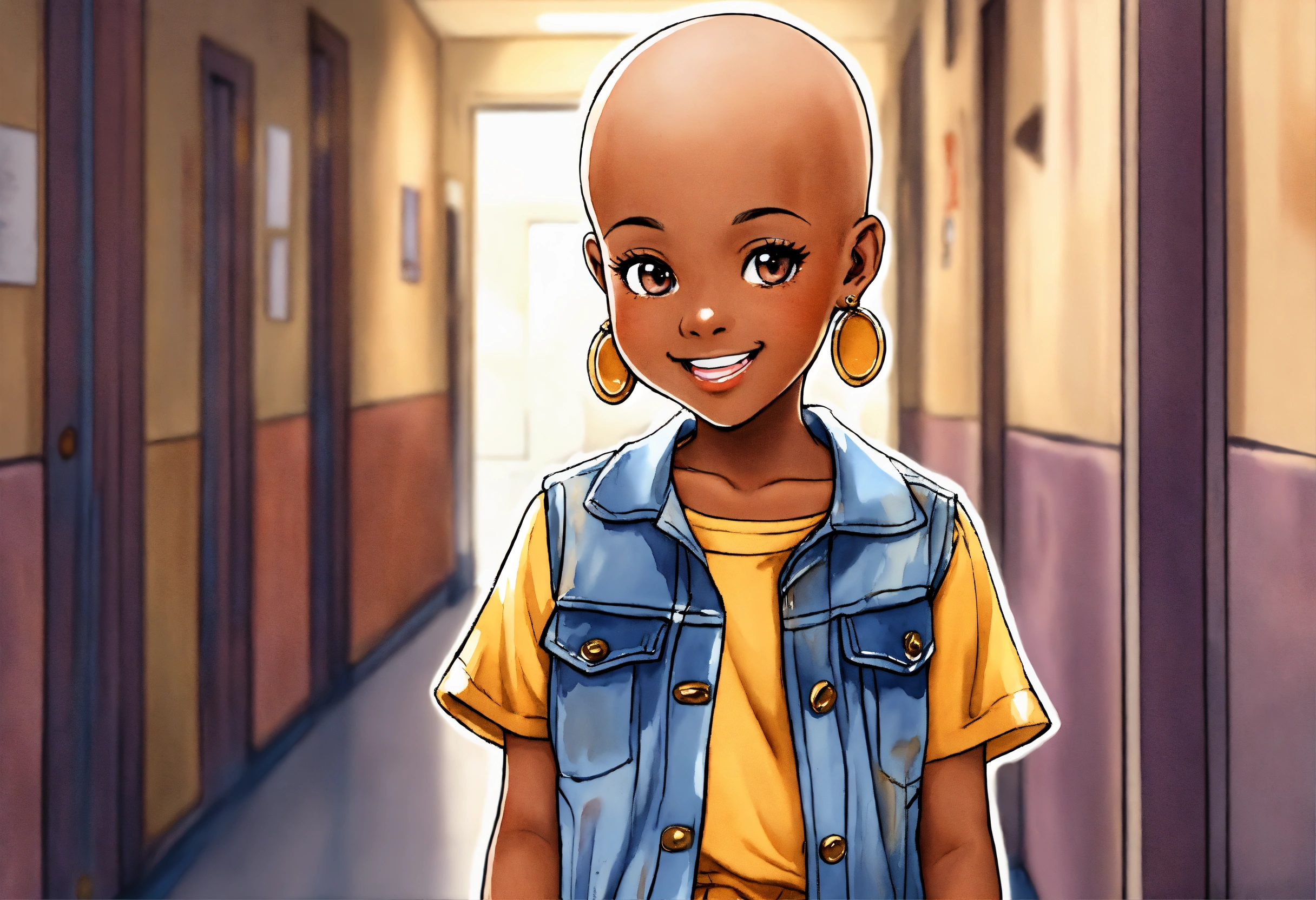Hd manga kewpie anime mahogany dark complexion african american 12 year old smiling bald girl with full alopecia, small gold stud earrings, wearing denim street wear style standing and leaning her leg against a plaster wall in a school hallway, alopecia awareness, bald head and no eyebrows, airbrushed watercolor art style