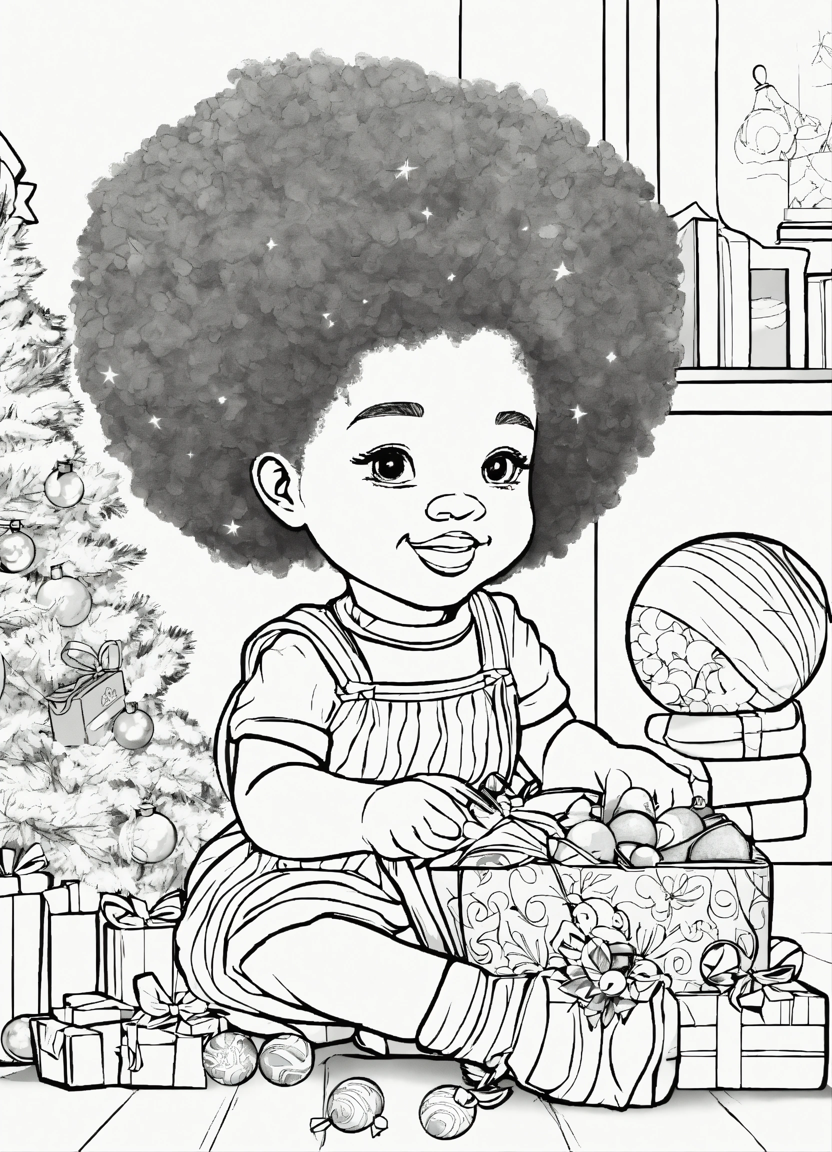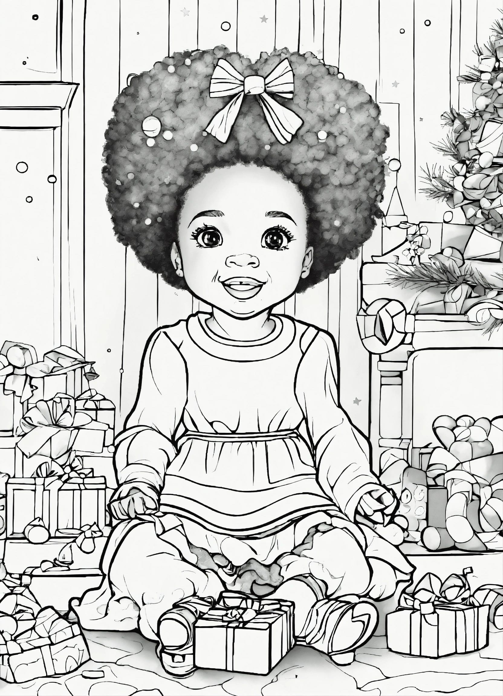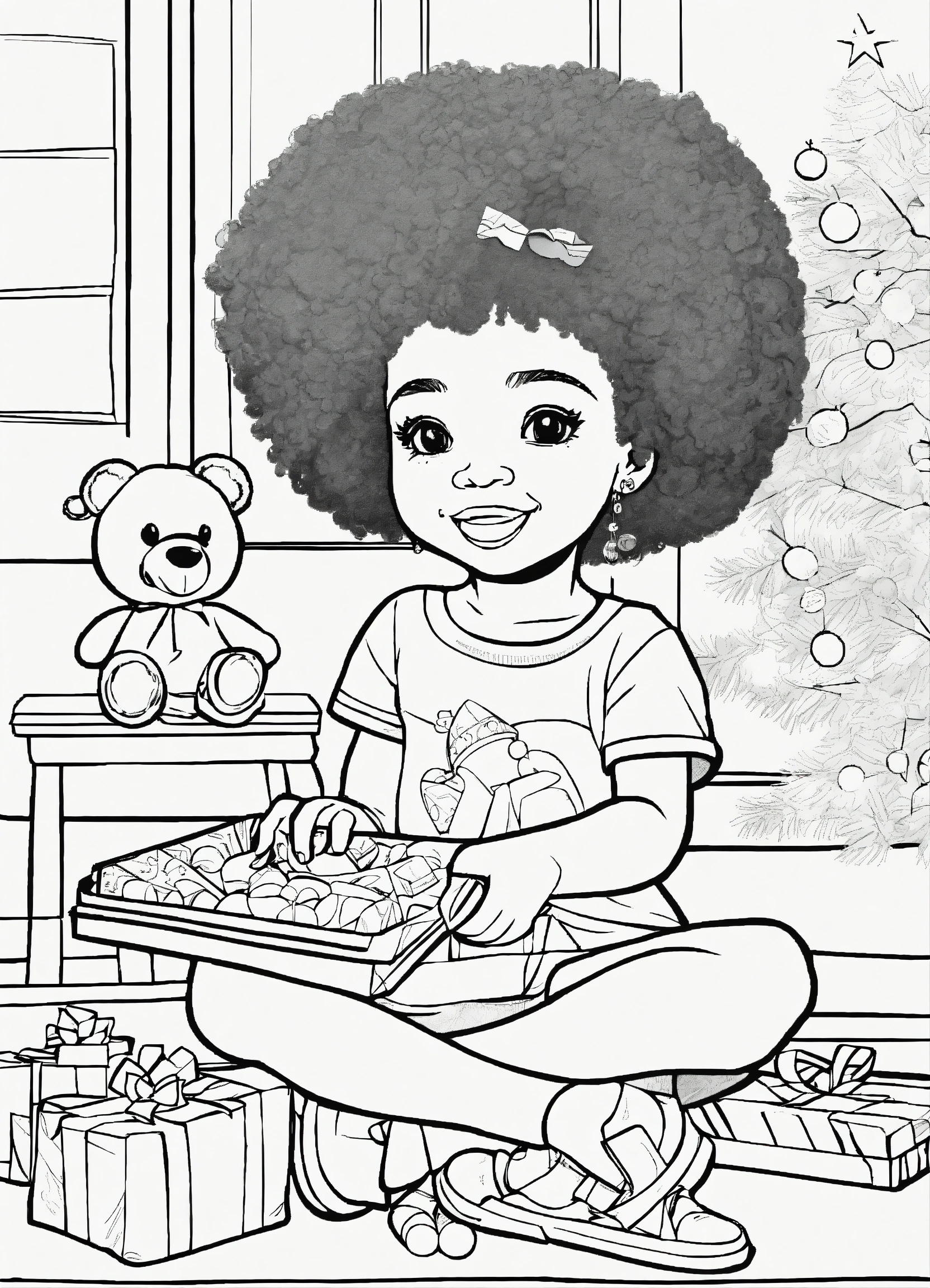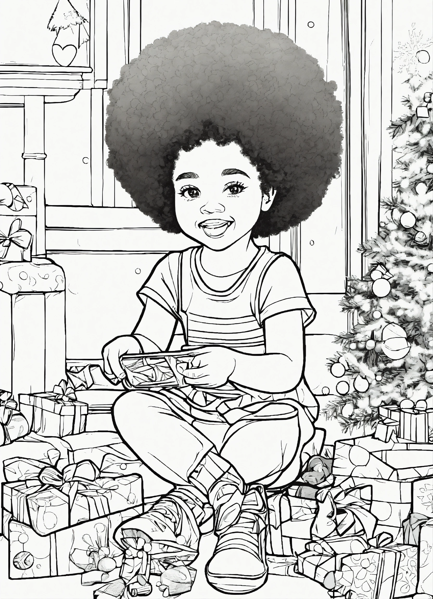 Vector, line art, coloring page, with afro american features, little girl playing toys from christmas, no shading, --no grey