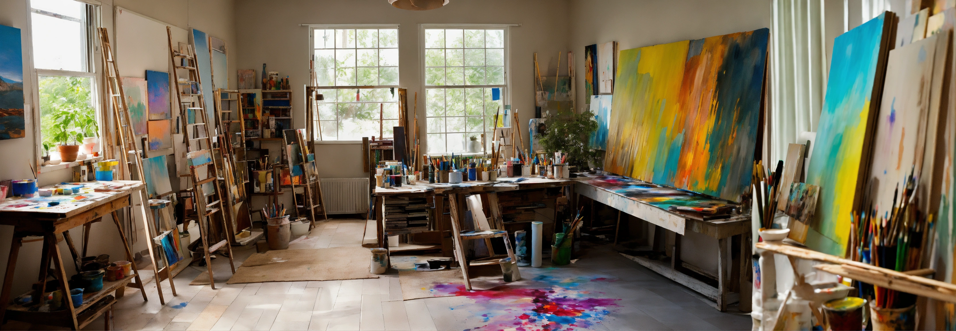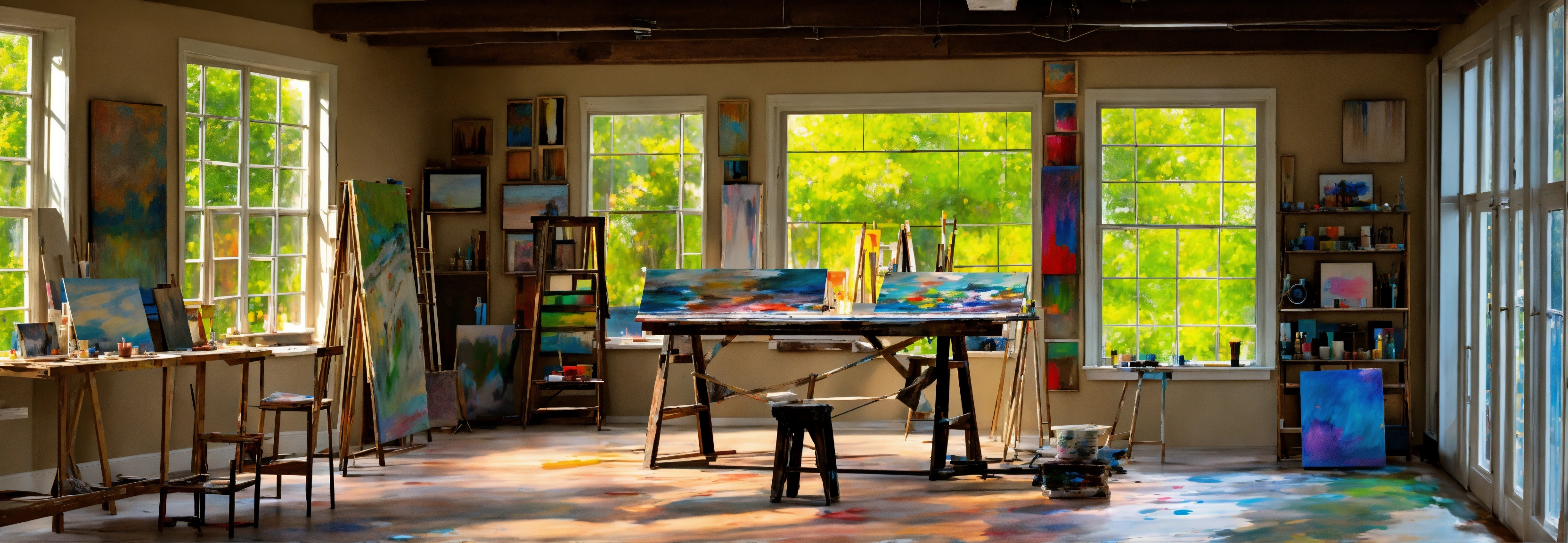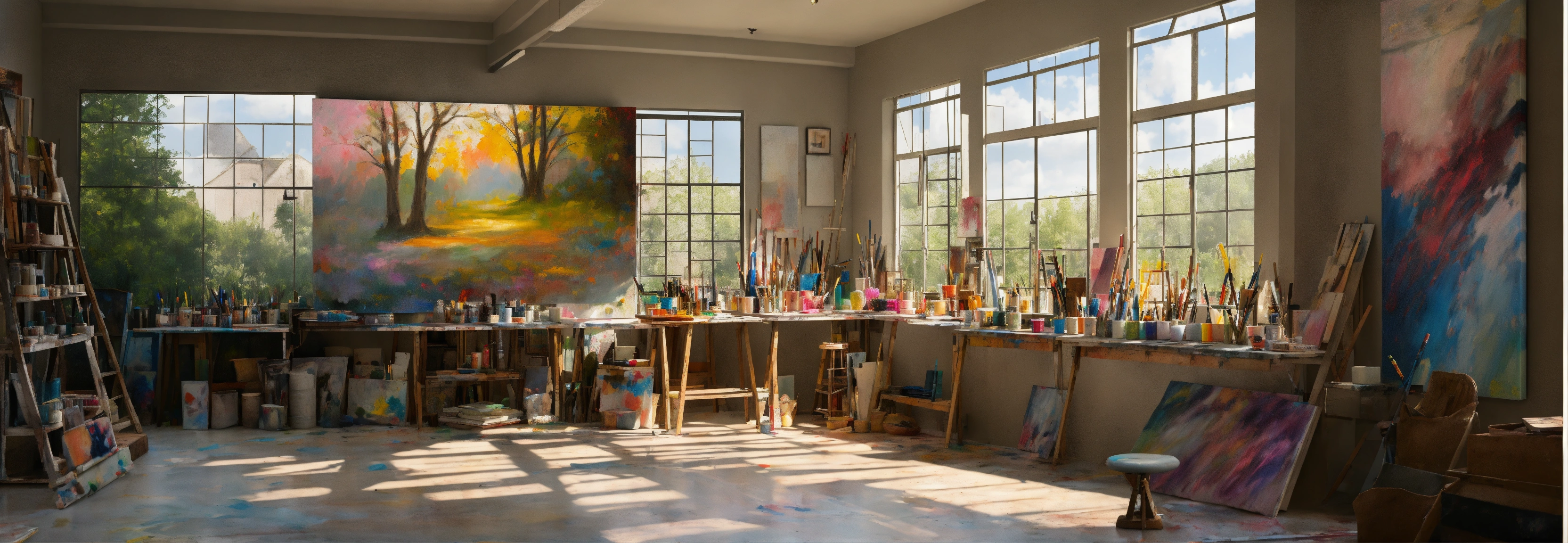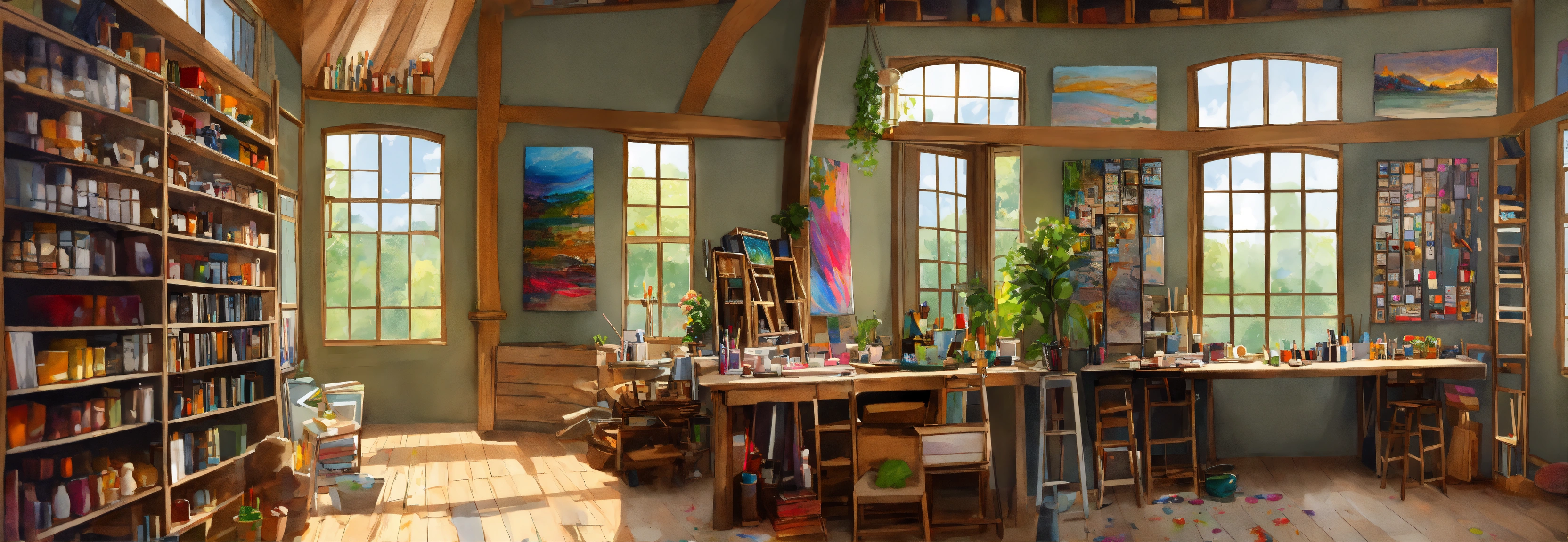 Concept art of an art studio, paintings on a canvas, stacked canvas paintings in a stack rack, bookshelves build into the walls with paint bottles and paintbrushes and colored pencils and art supplies, sink in the corner, bohemian, boho, artsy, hippie, private art studio, art supplies, unfinished grey clay sculptures on a table, one entire wall is a window looking out on a forest, huge room, hyper realistic, realistic, feminine, girly, paint splatters littered around floor, cluttered, workshop, desktop computer on a desk, home art studio, granite floors, big room, windows only on one wall, floor to ceiling windows on one entire wall, sink, painting on a canvas stand with a stool chair, sketchbooks, hippie, girly, white walls, high ceiling, vintage, long floor to ceiling windows only on one wall, granite floor, high ceilings, half finished grey clay sculpture of a person on a table