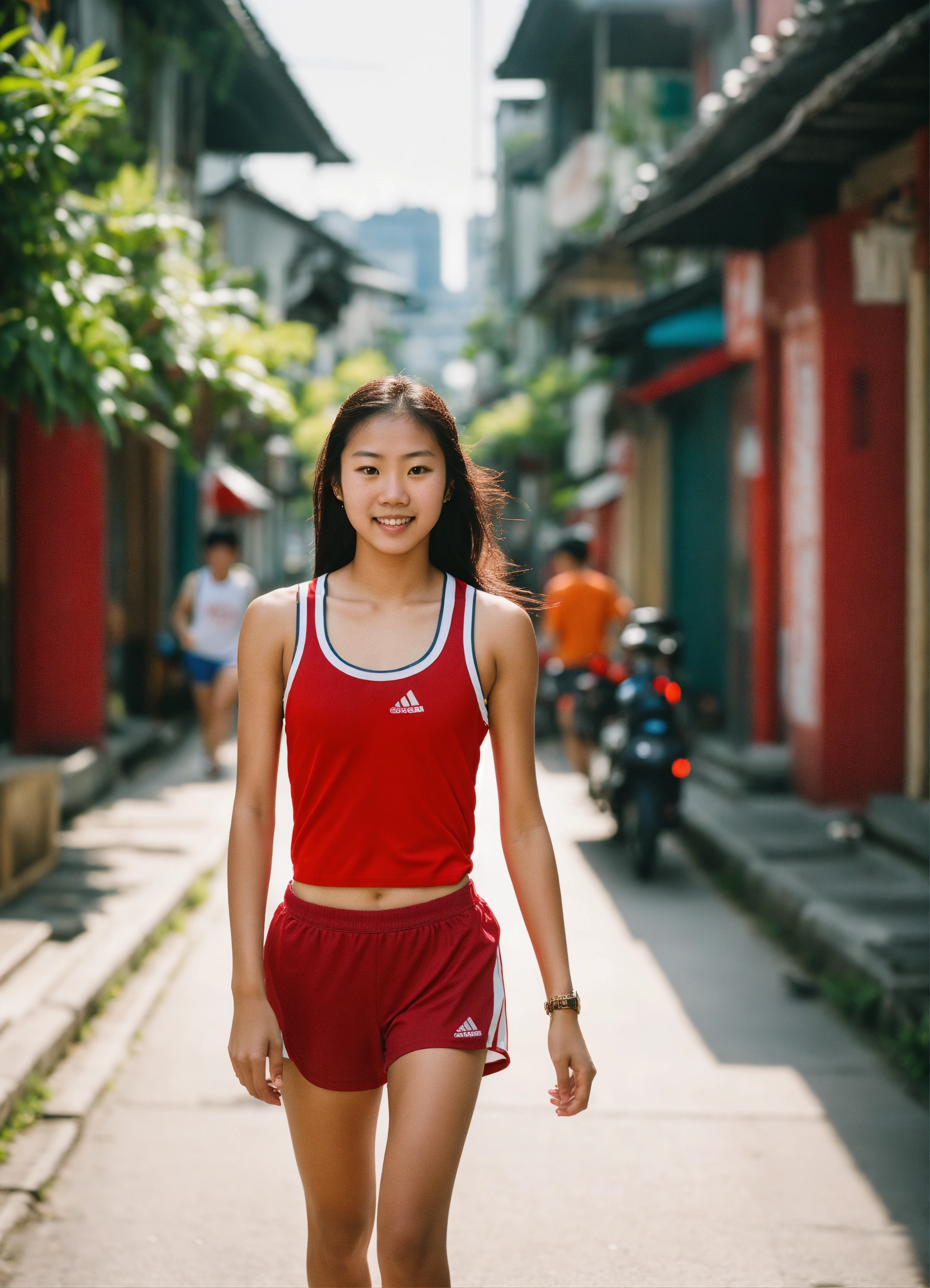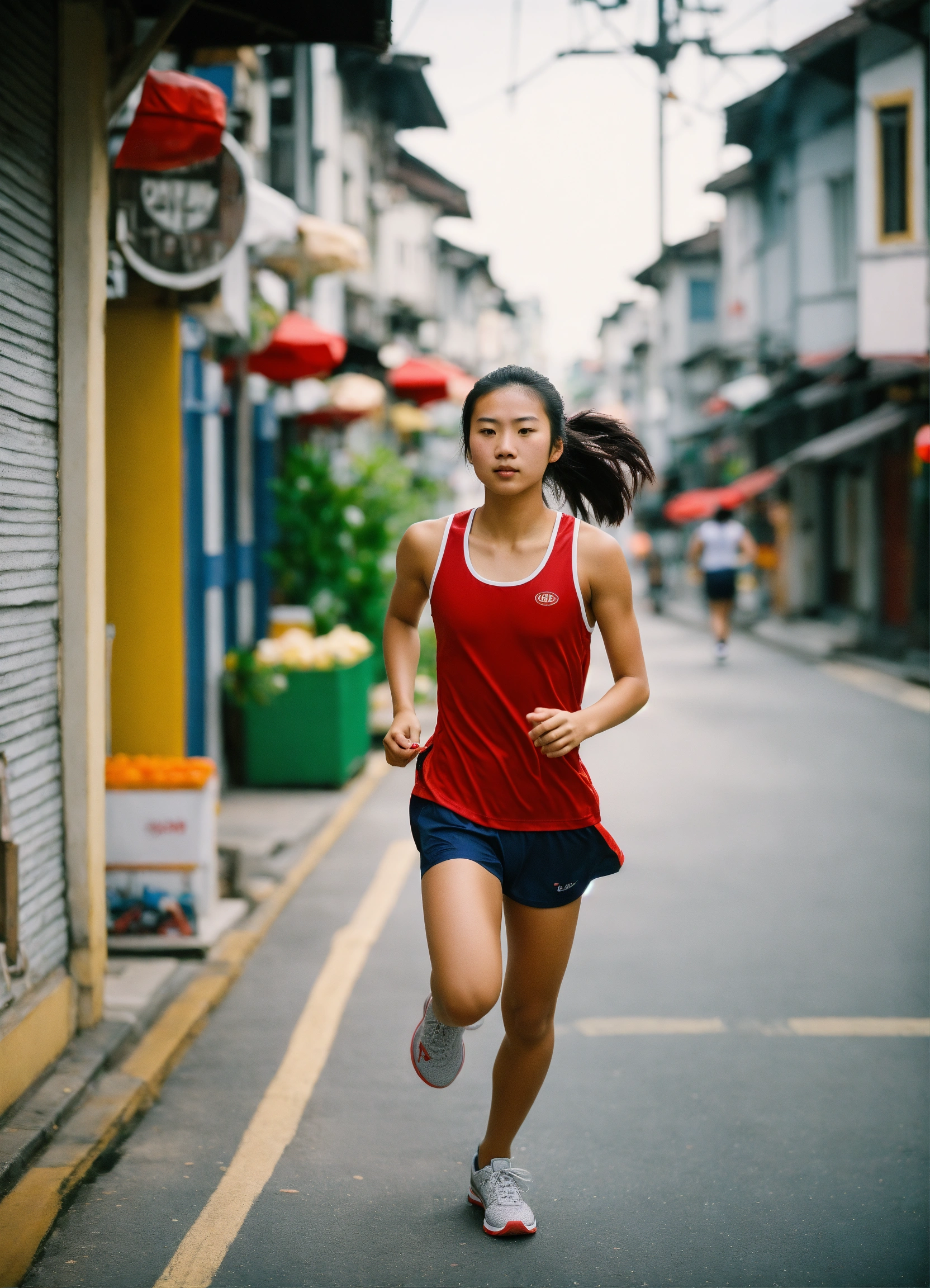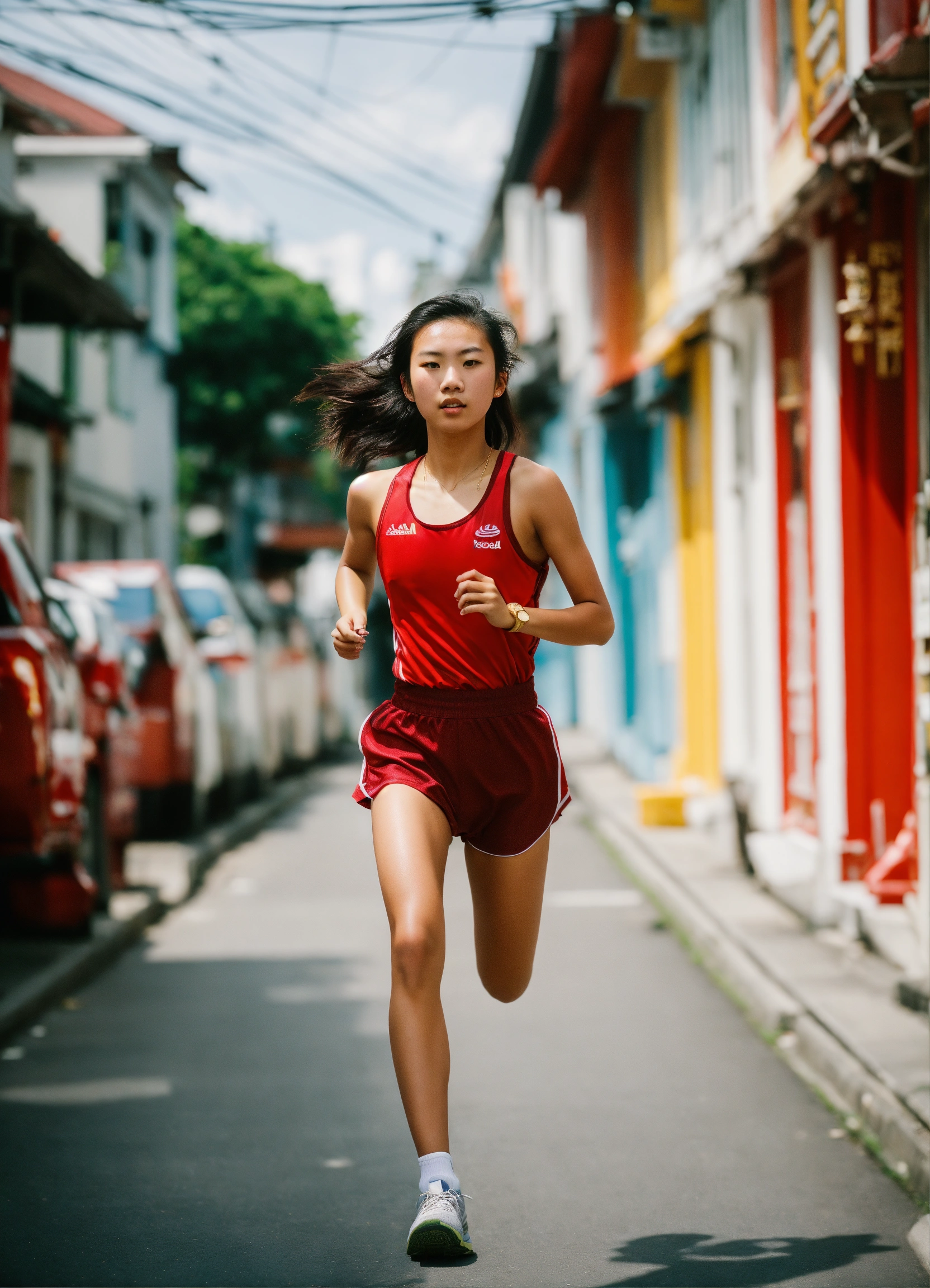On a sunny day, a medium shot captures a tanned, athletic 18-year-old asian girl, embodying the spirit of a national athlete. dressed in a plain red singlet, running along a urban street framed by traditional singaporean shophouses, cityscape background, their intricate architectural designs and historic stature stand out vividly, leica summicron 35mm f2.0 lens, further accentuated by the rich tones of kodak portra 400 film.