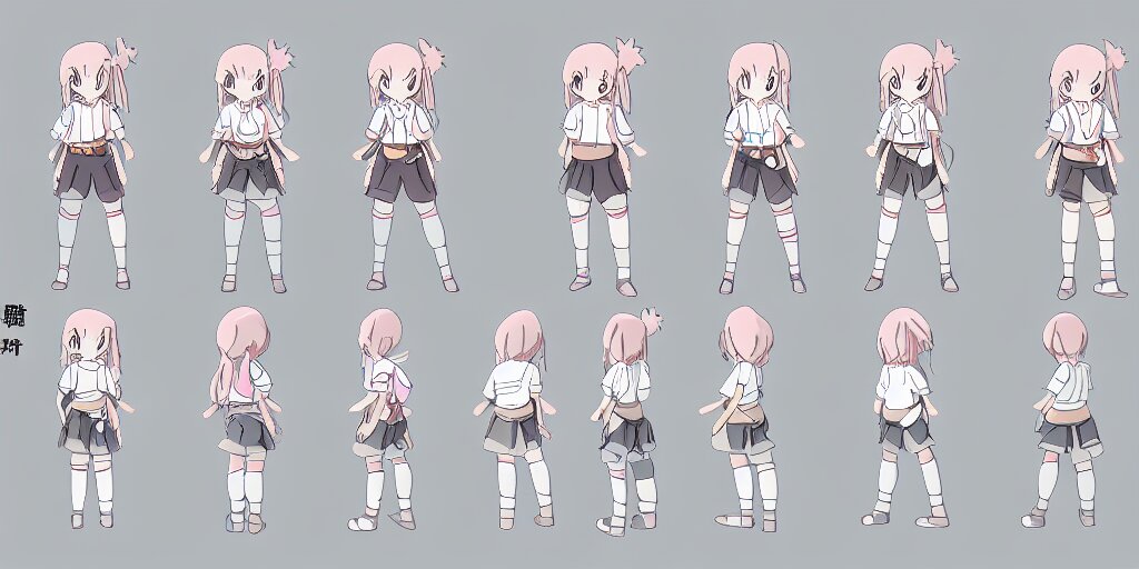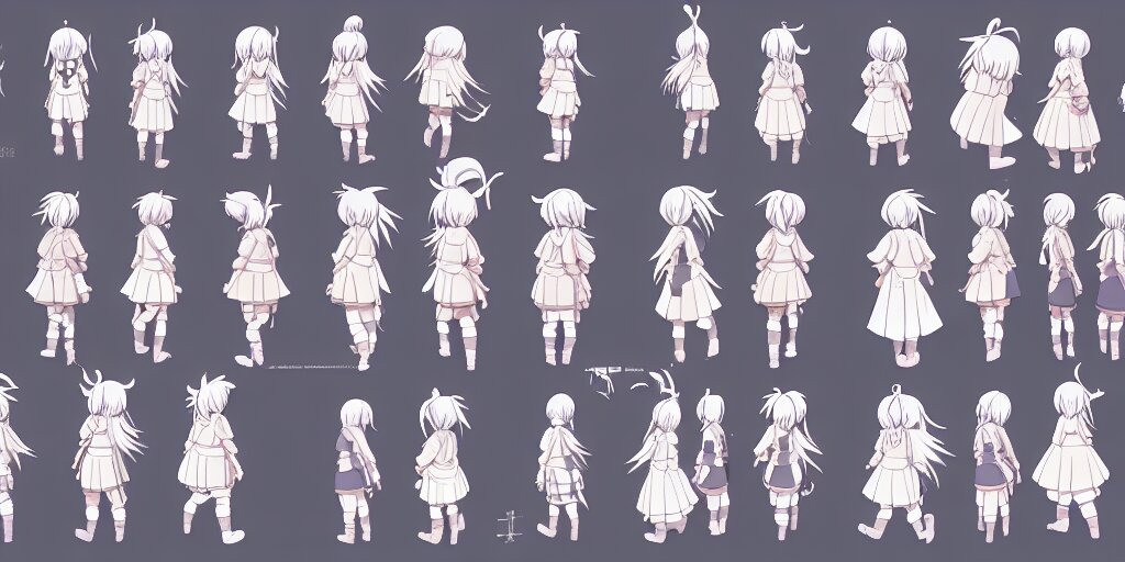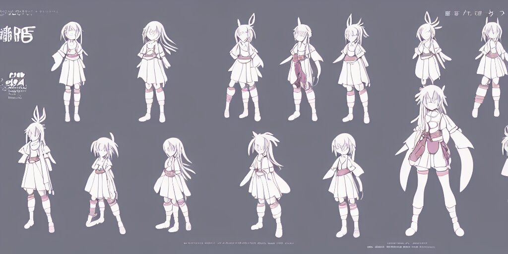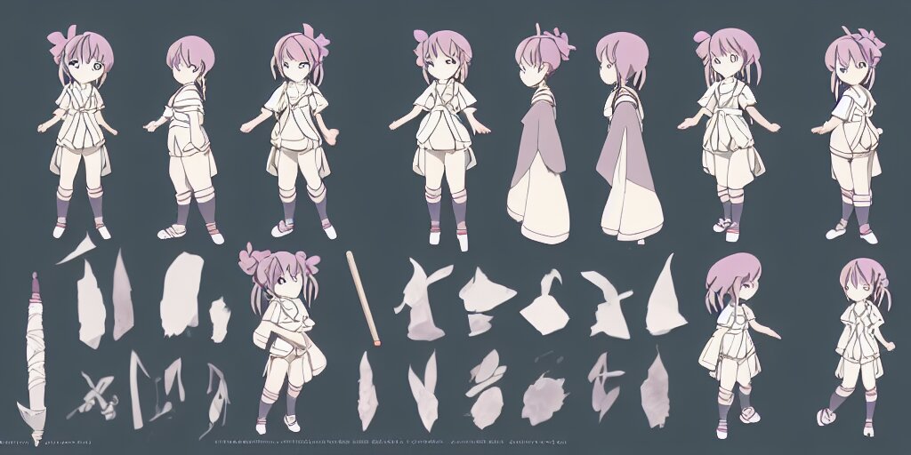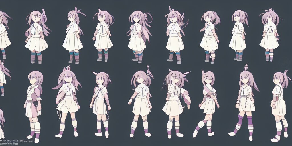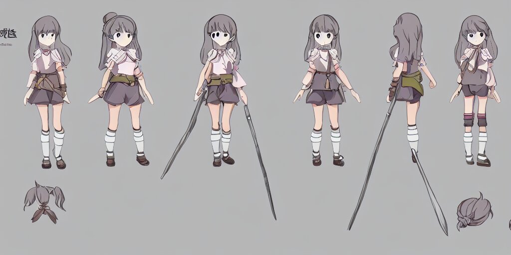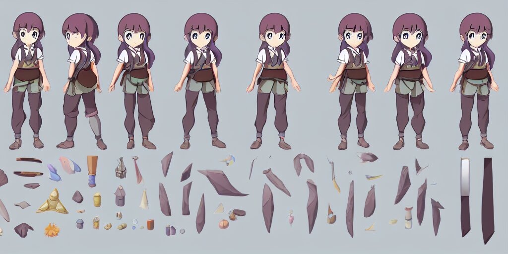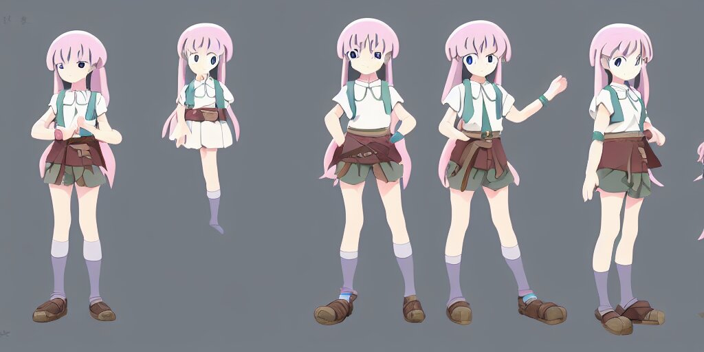 A magical adventurer little girl character anime model sheet; in the magical studio ghibli anime; character outfit concepts; trending on artstation, highly detailed, clean lineart