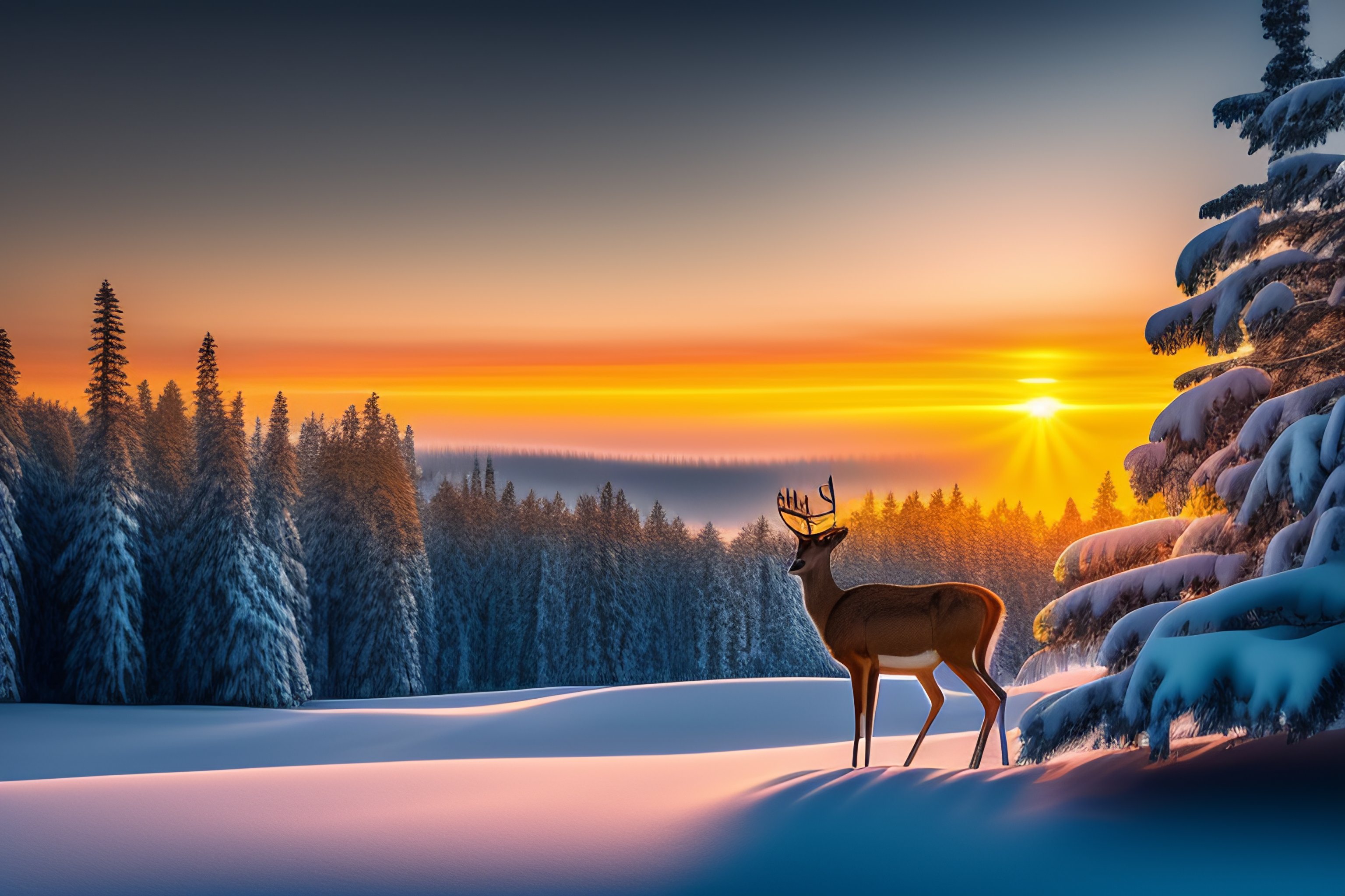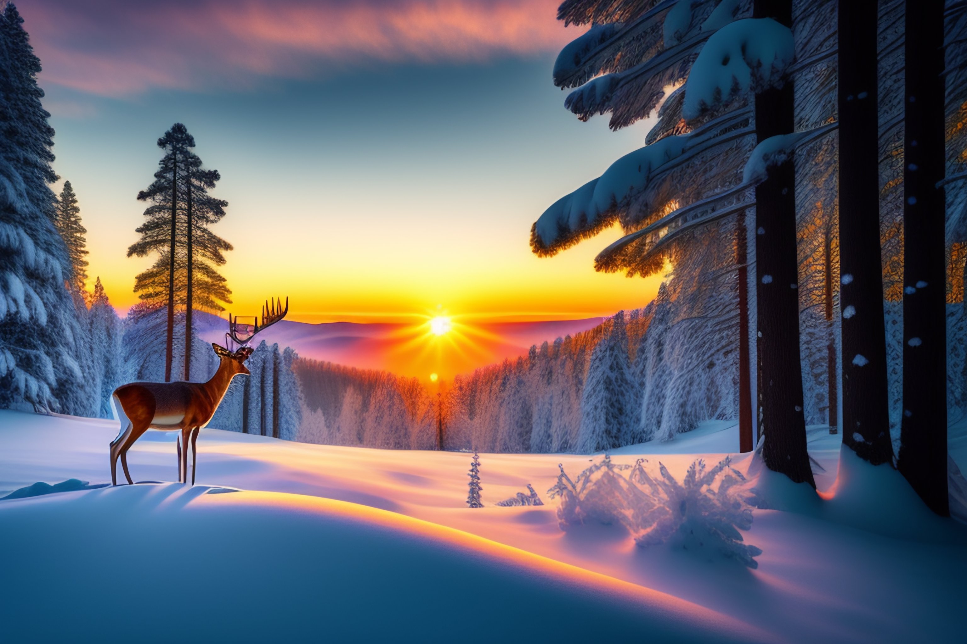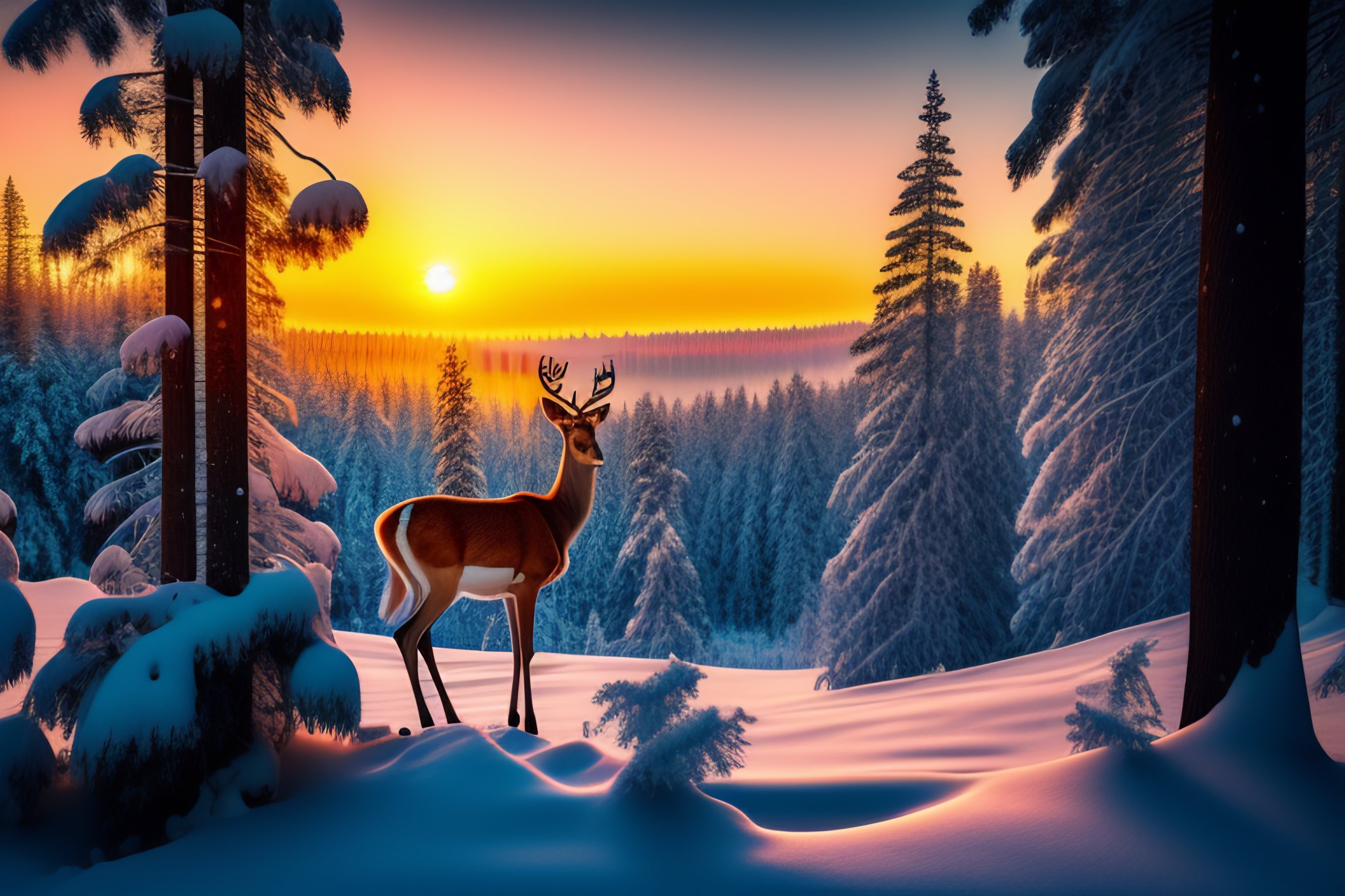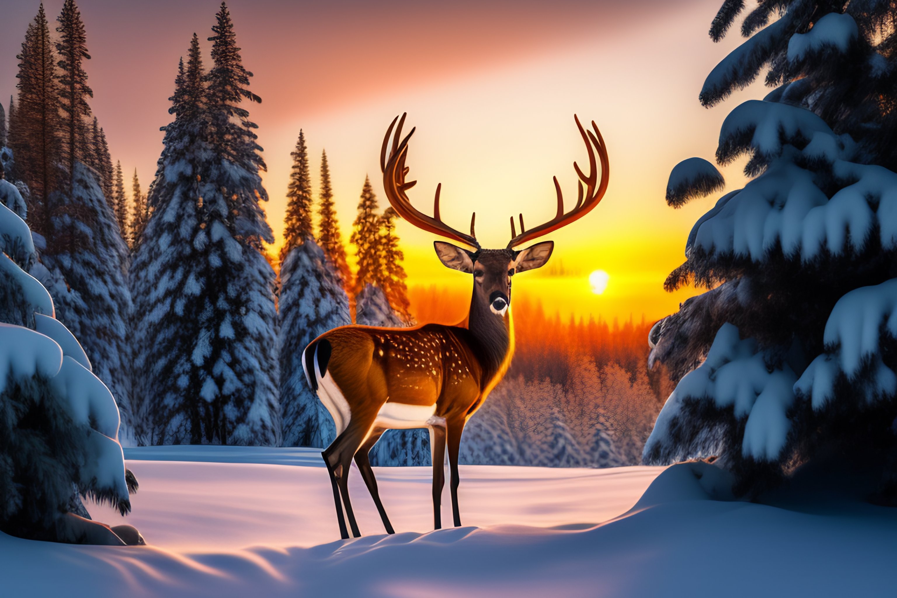 January sunrise over a beautiful deer in winter landscape pine tree forest with snow