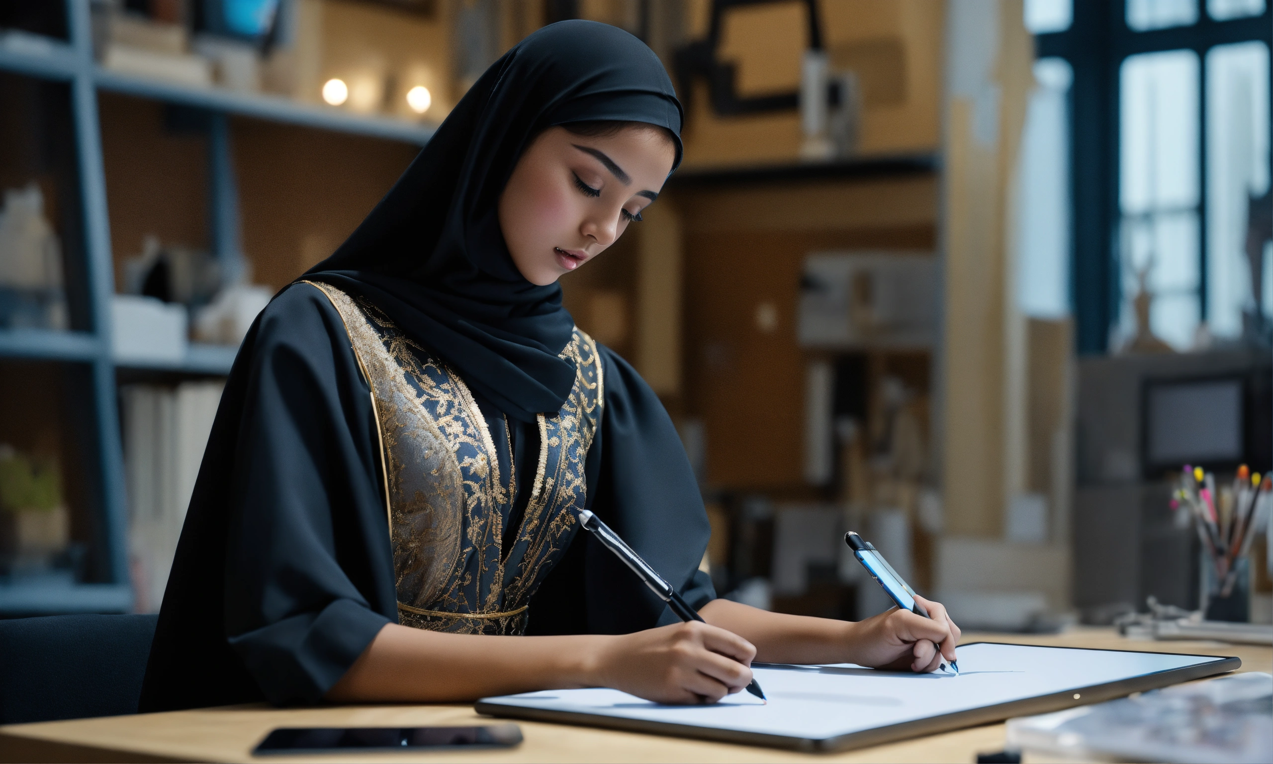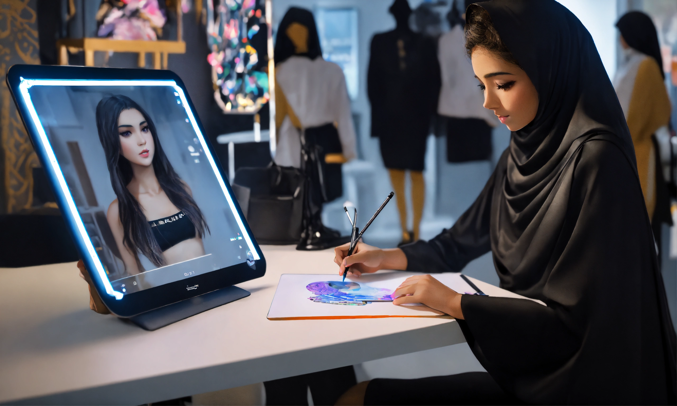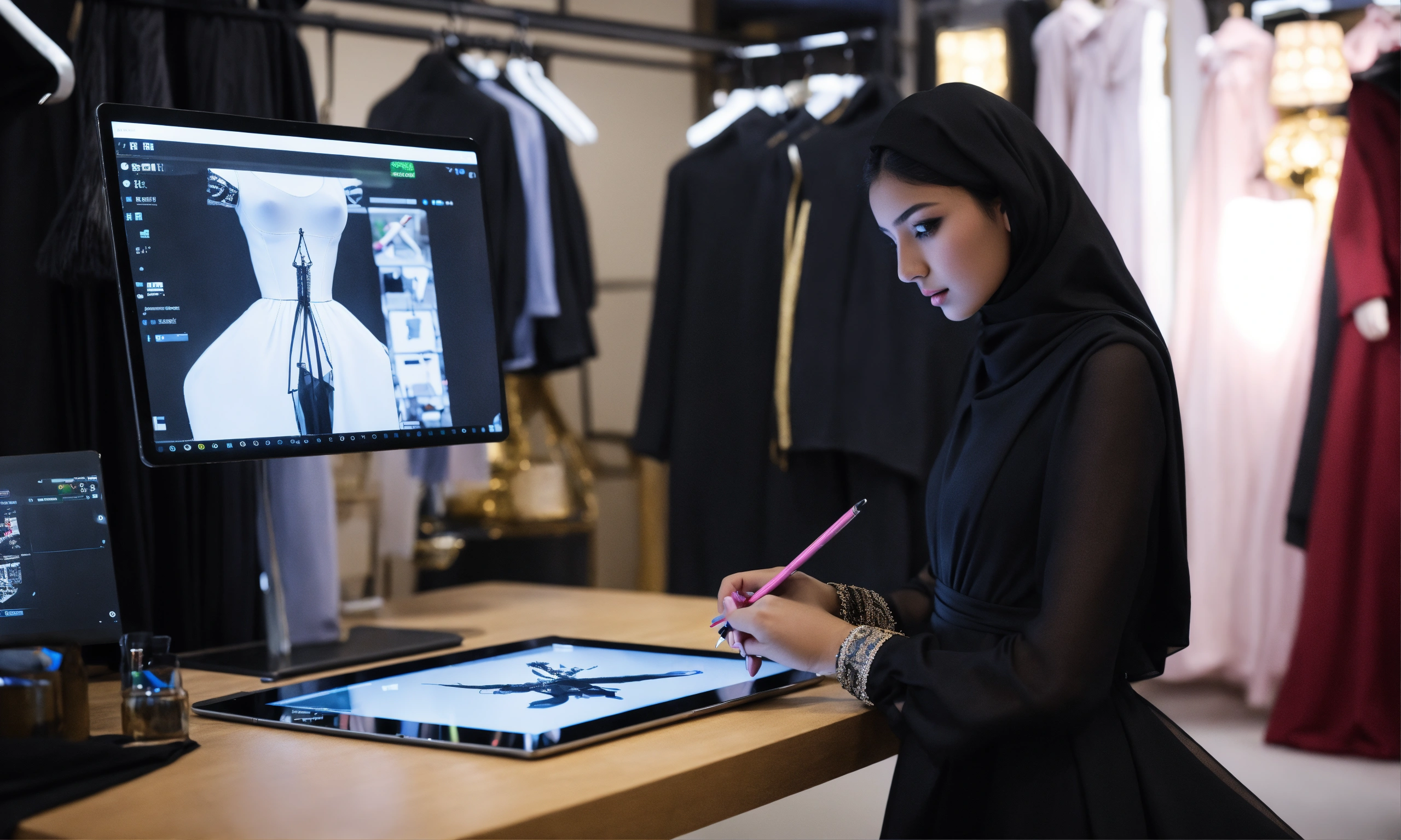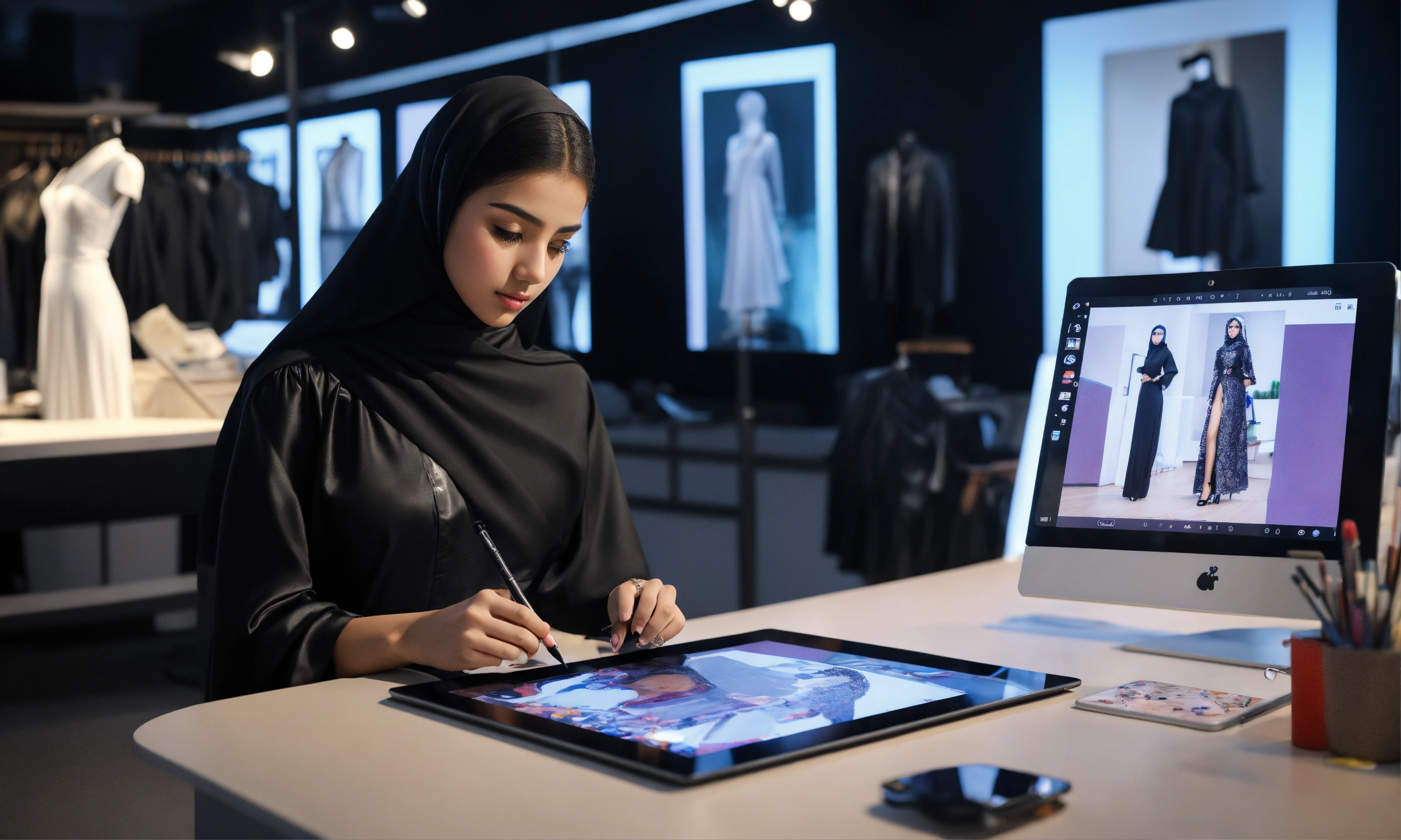 Saudi youth girl, fashion designer, drawing on tablet, design shop, augmented reality, technology, desk, computer, mannequin, dress, black costume, photo-realistic, 8k, high-definition
