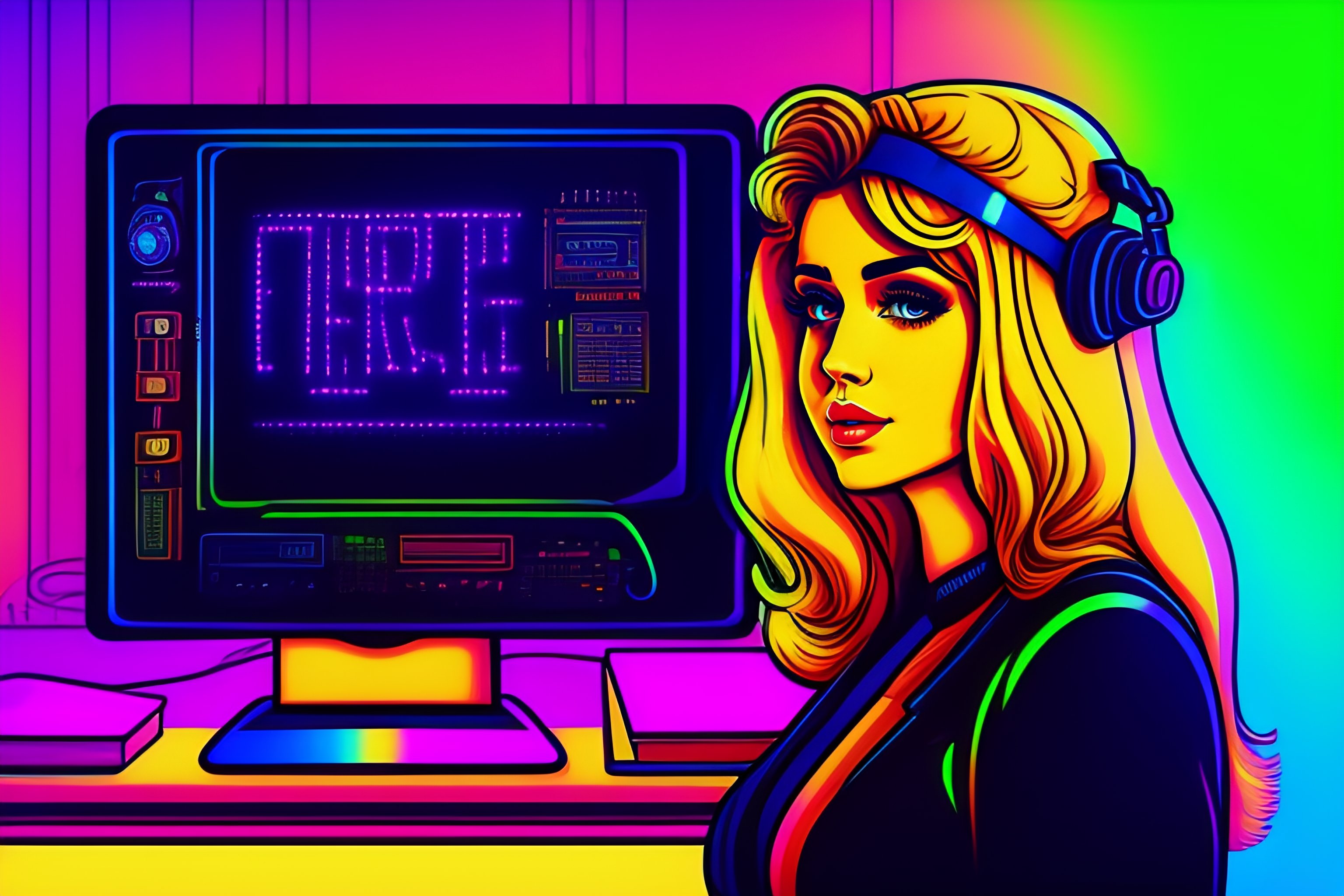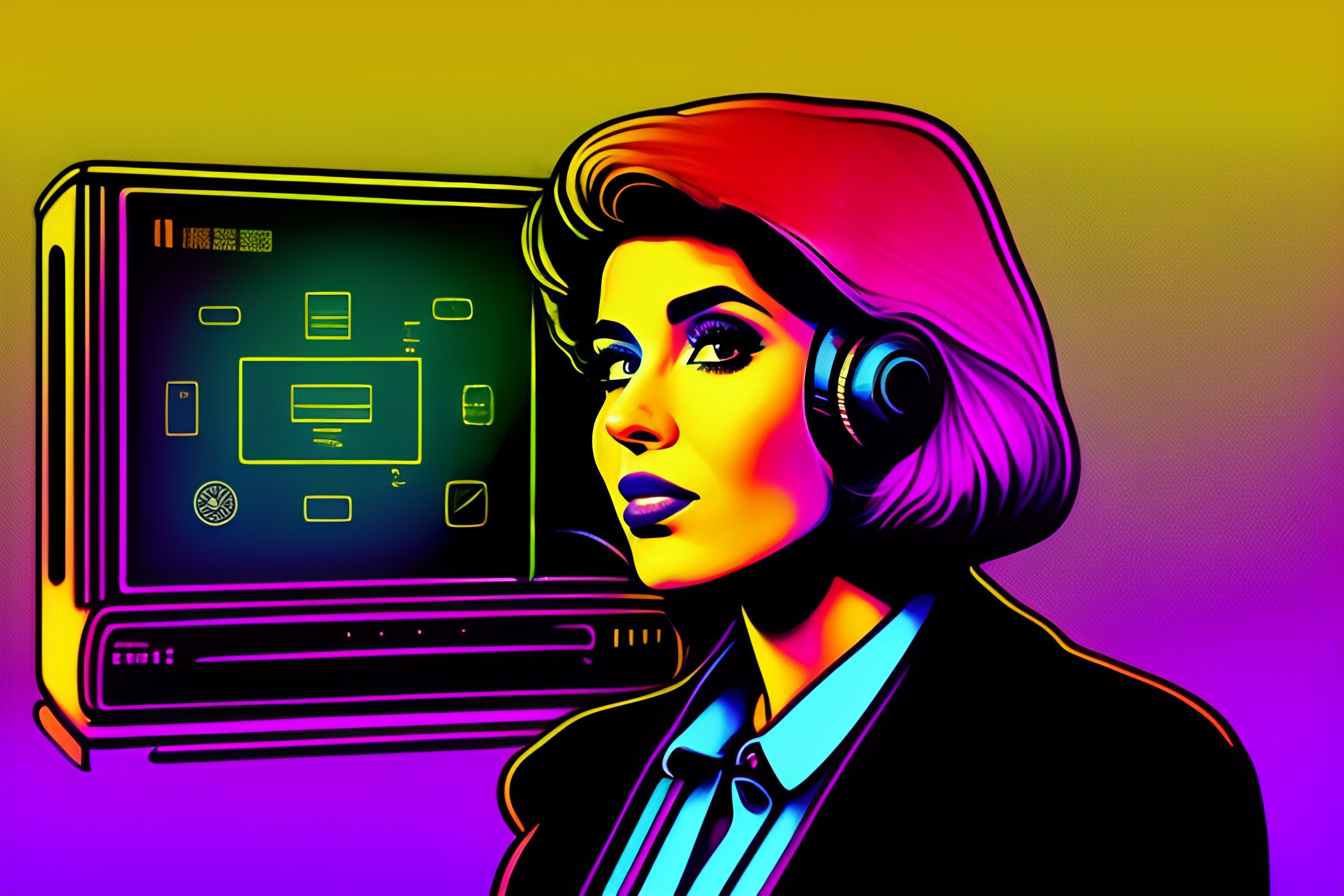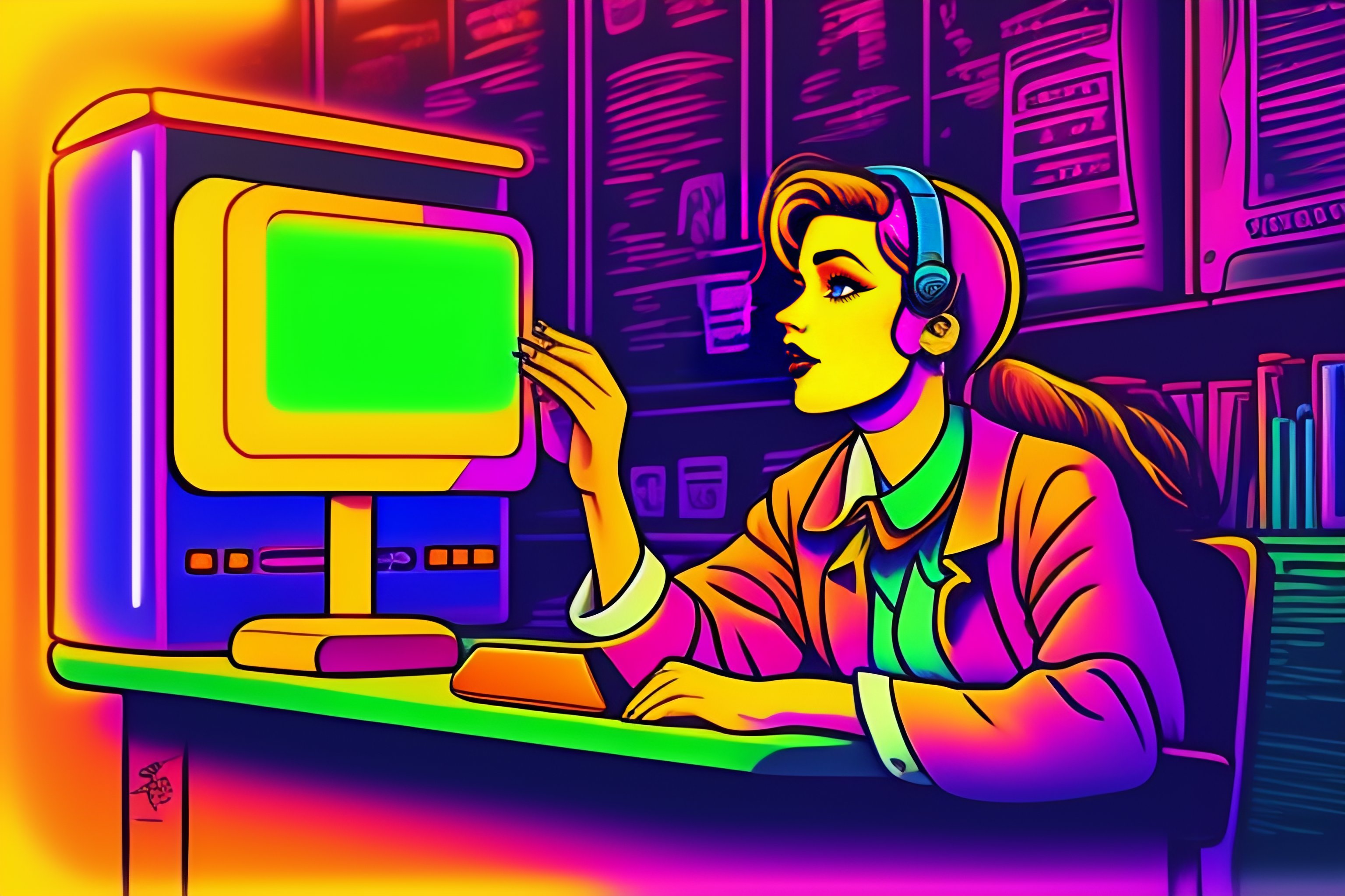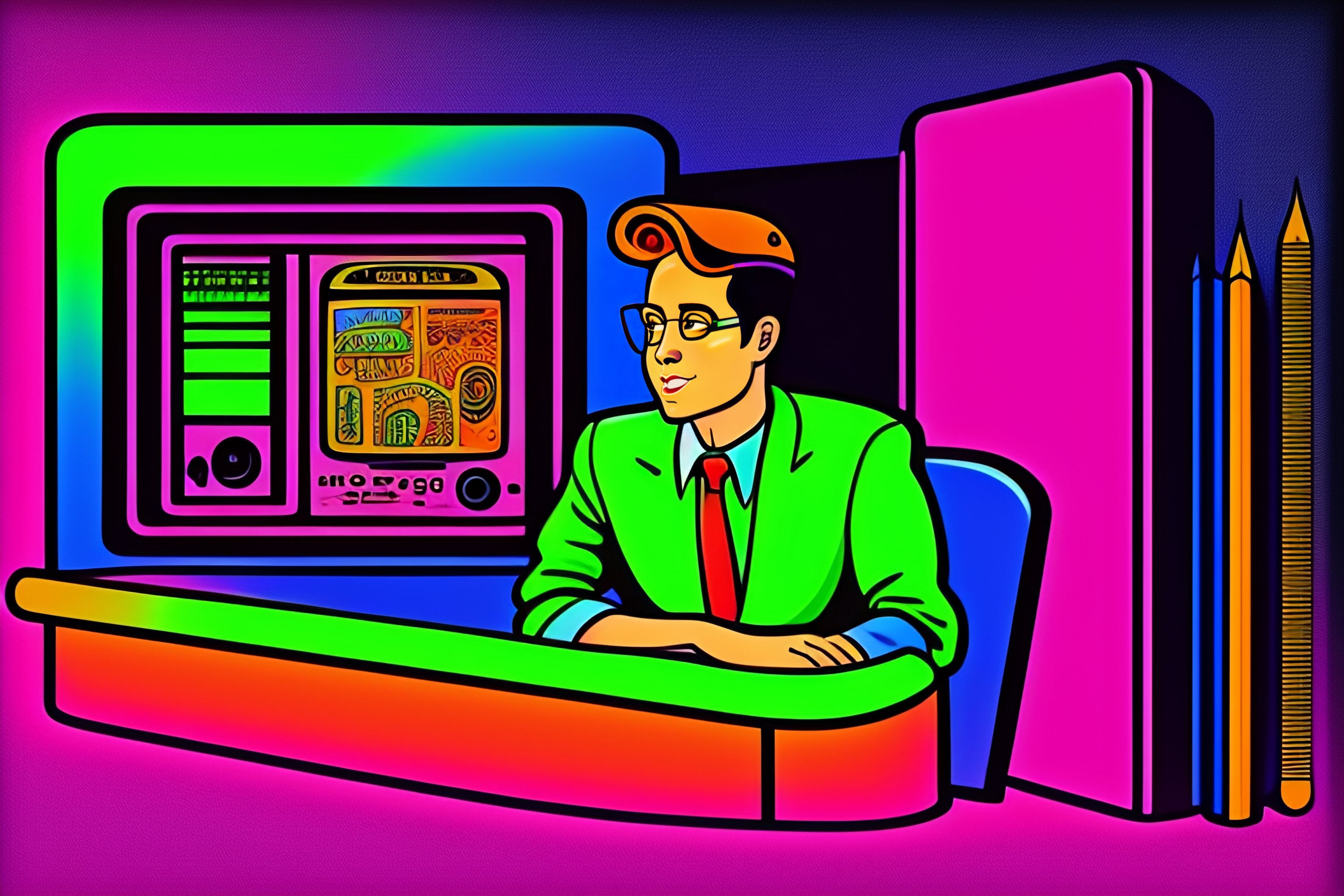A detailed portrait of a teacher talking with artificial intelligence vintage 90's cartoon style grunge, colors, neon lights. line art.