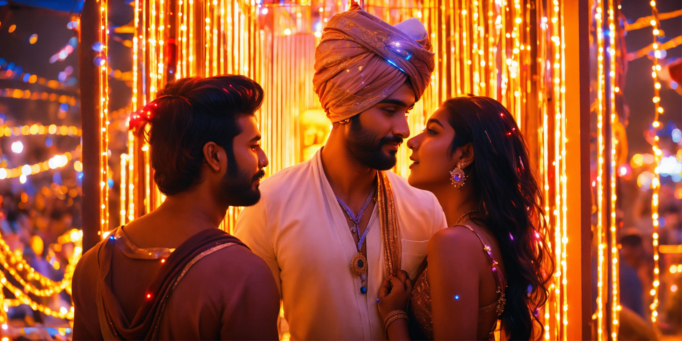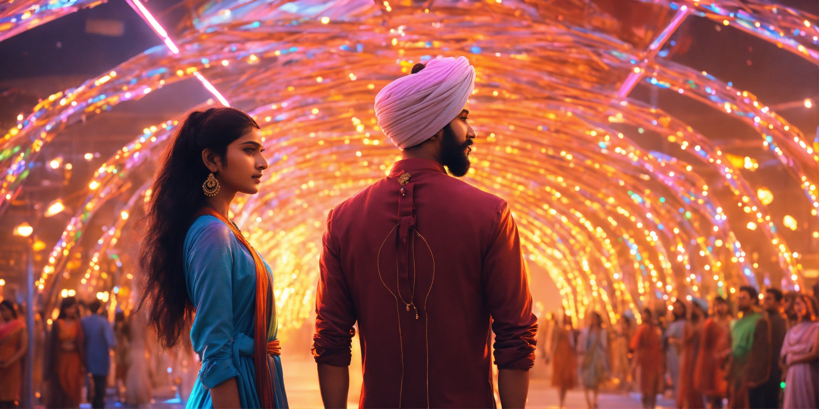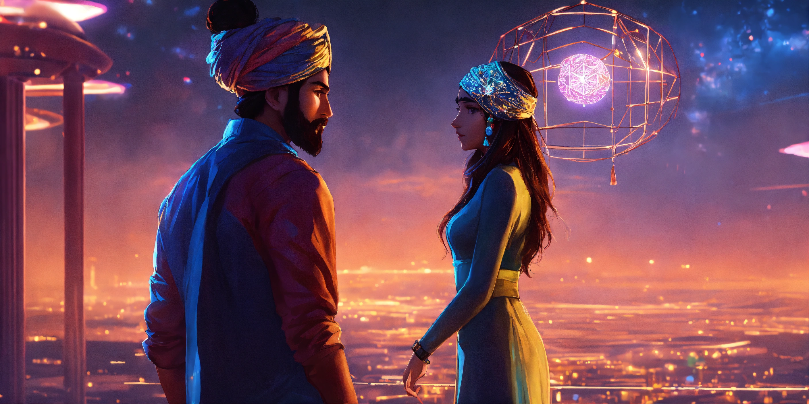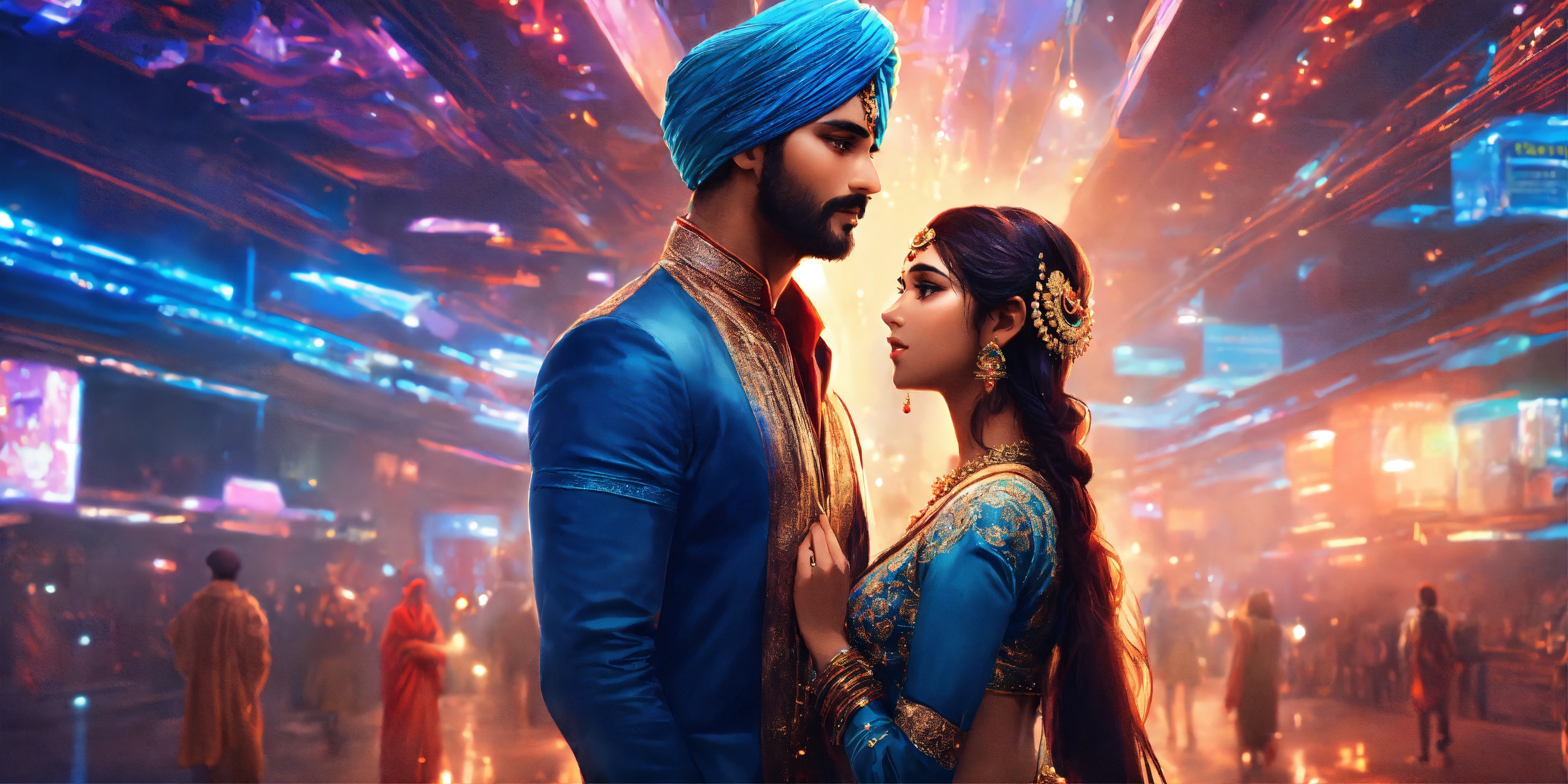 Indian turban guy and indian girl in futuristic modern world filled with lights and she looks like goddess anime rylistic world