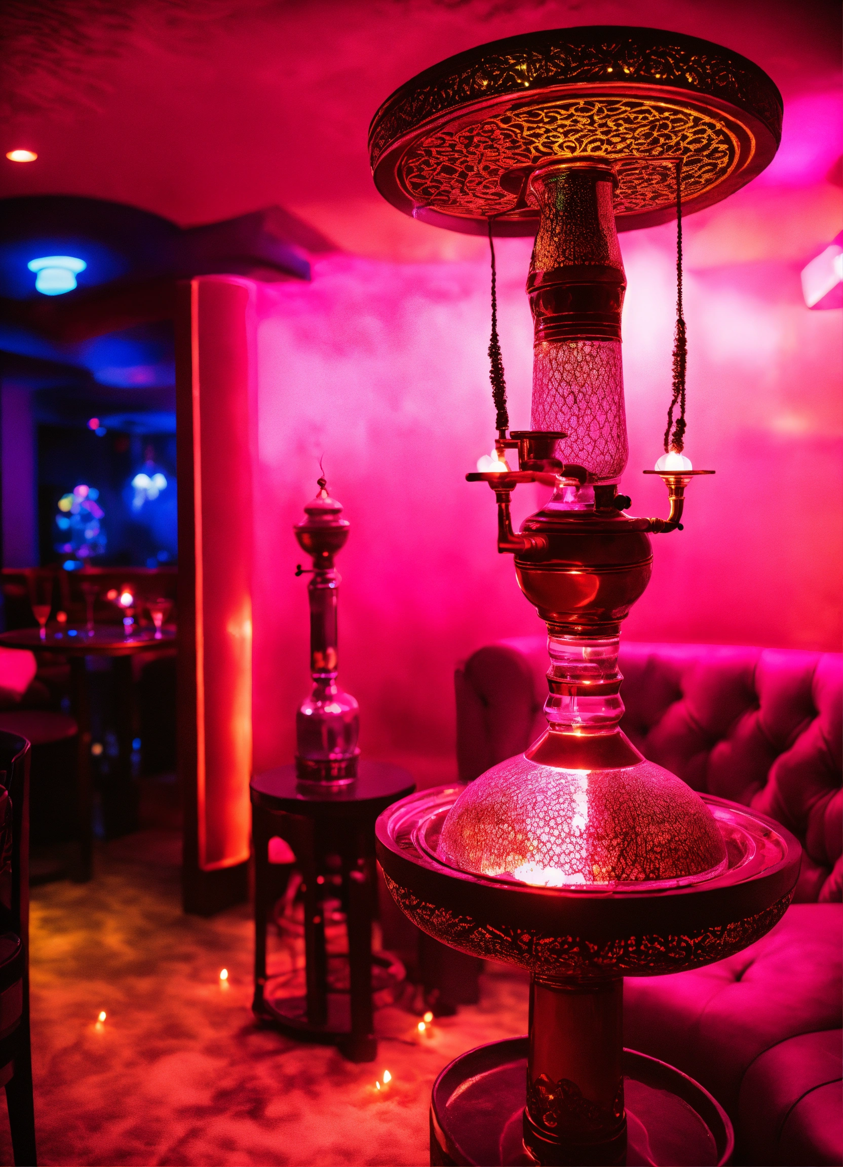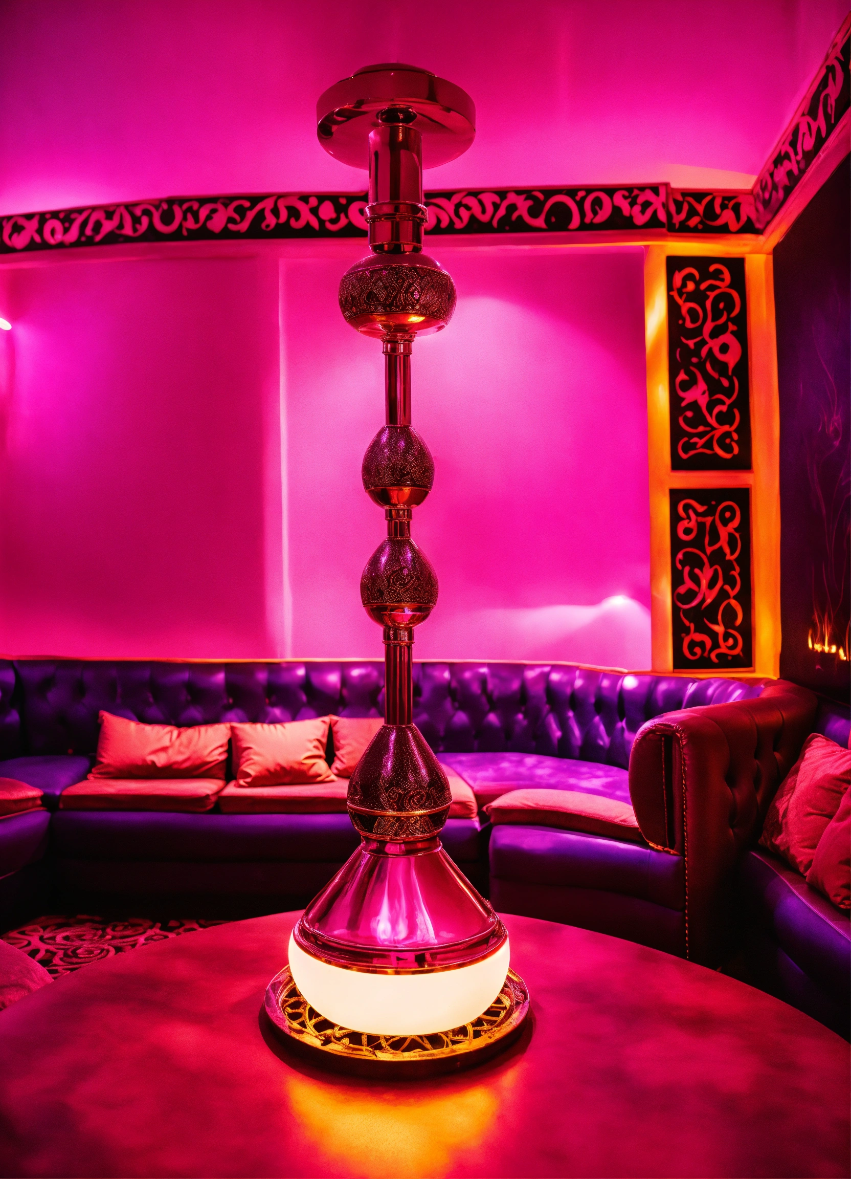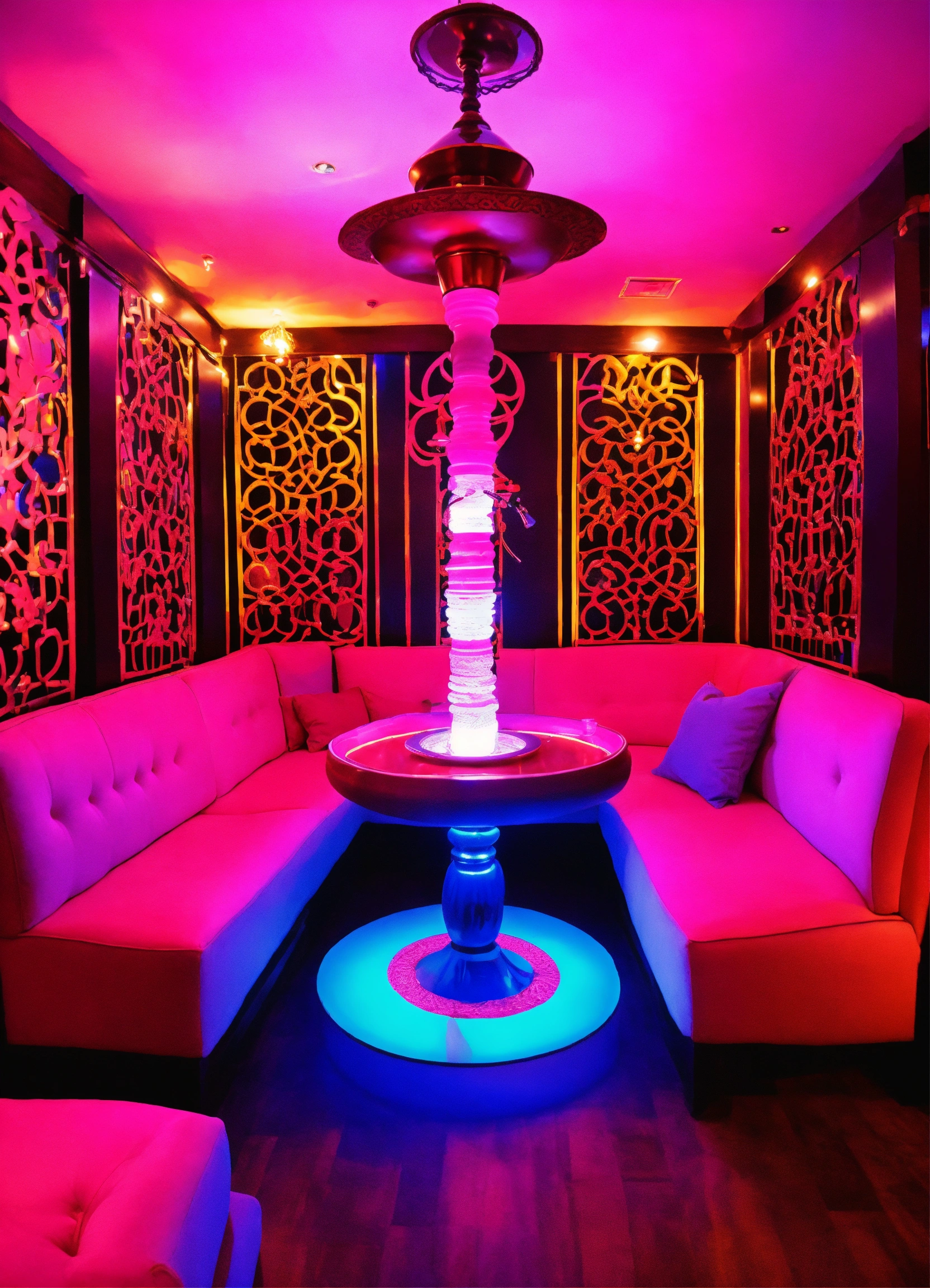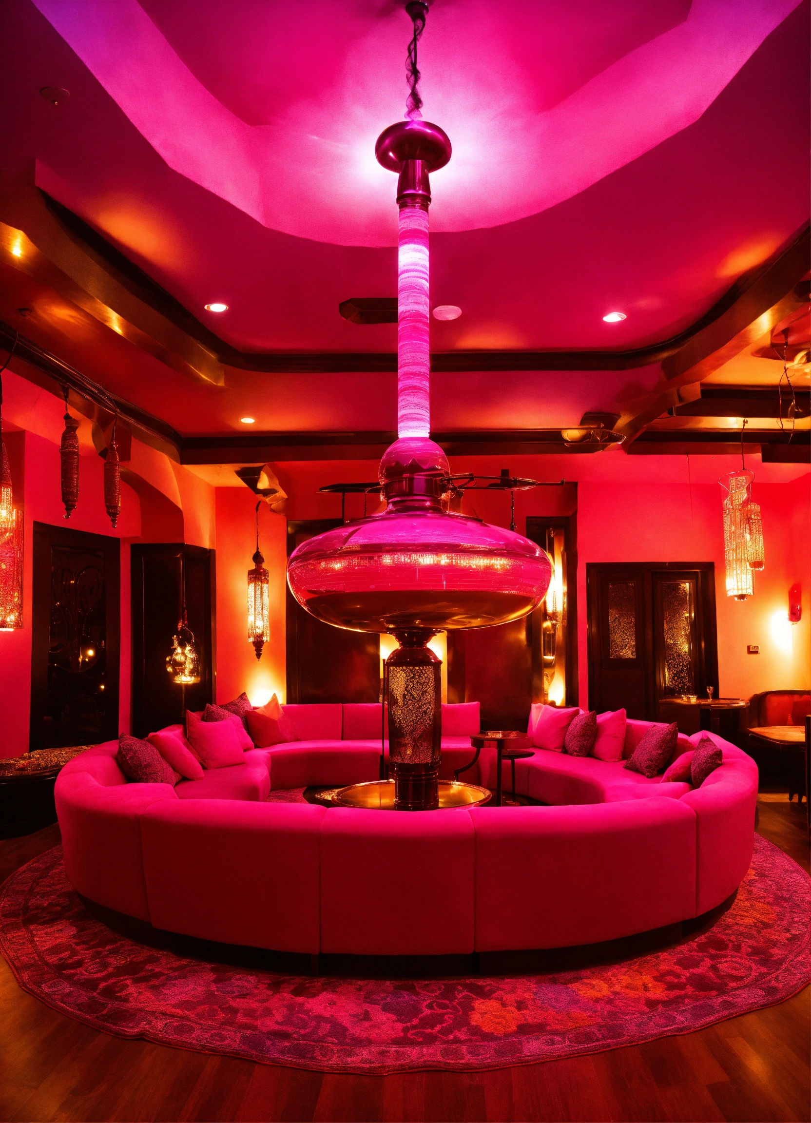 Hookah lounge, luxurious hookahs, affluent, rich, decadent, debauchery, shisha restaurant, mood lighting, pink hookah
