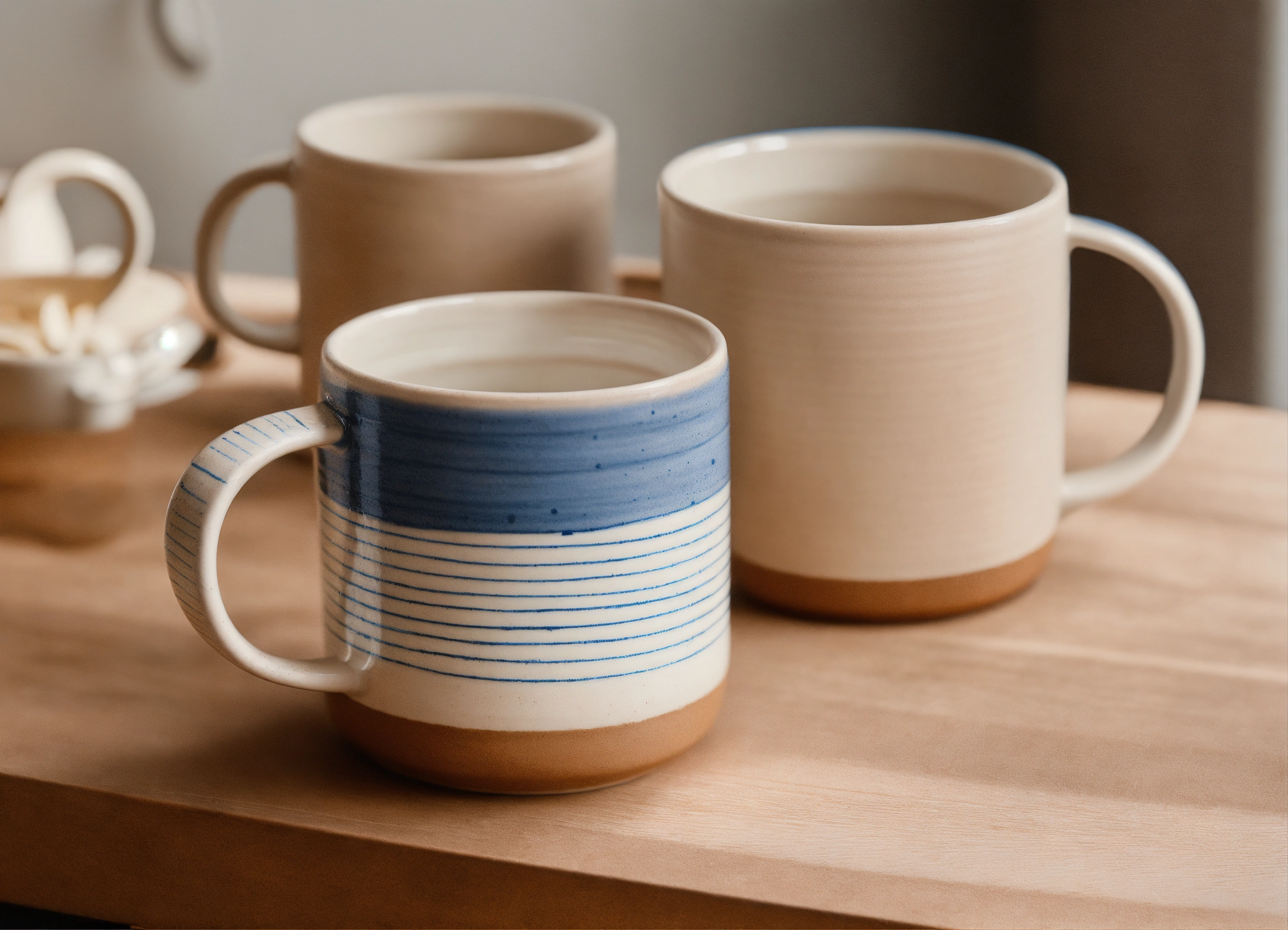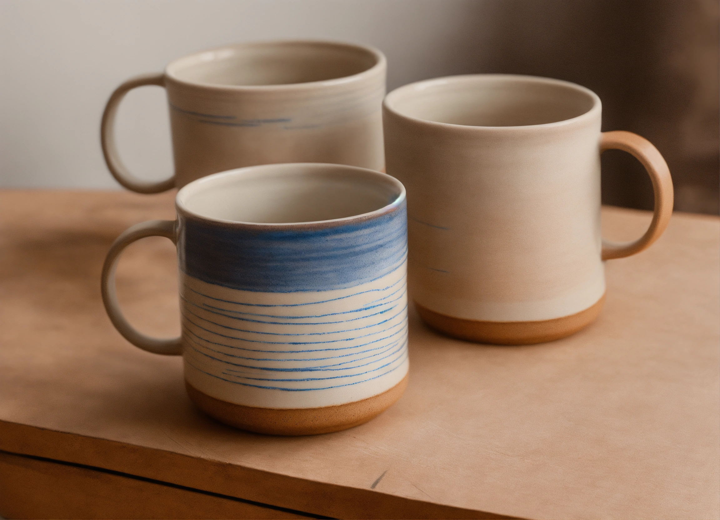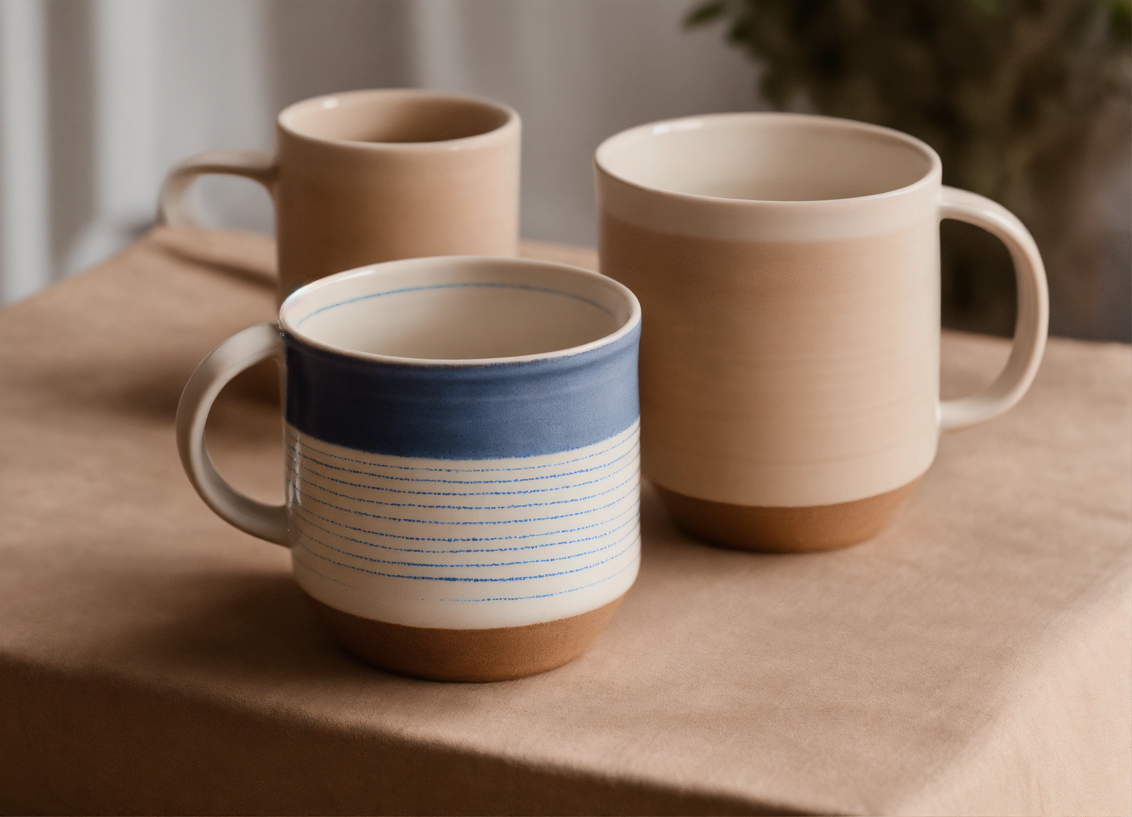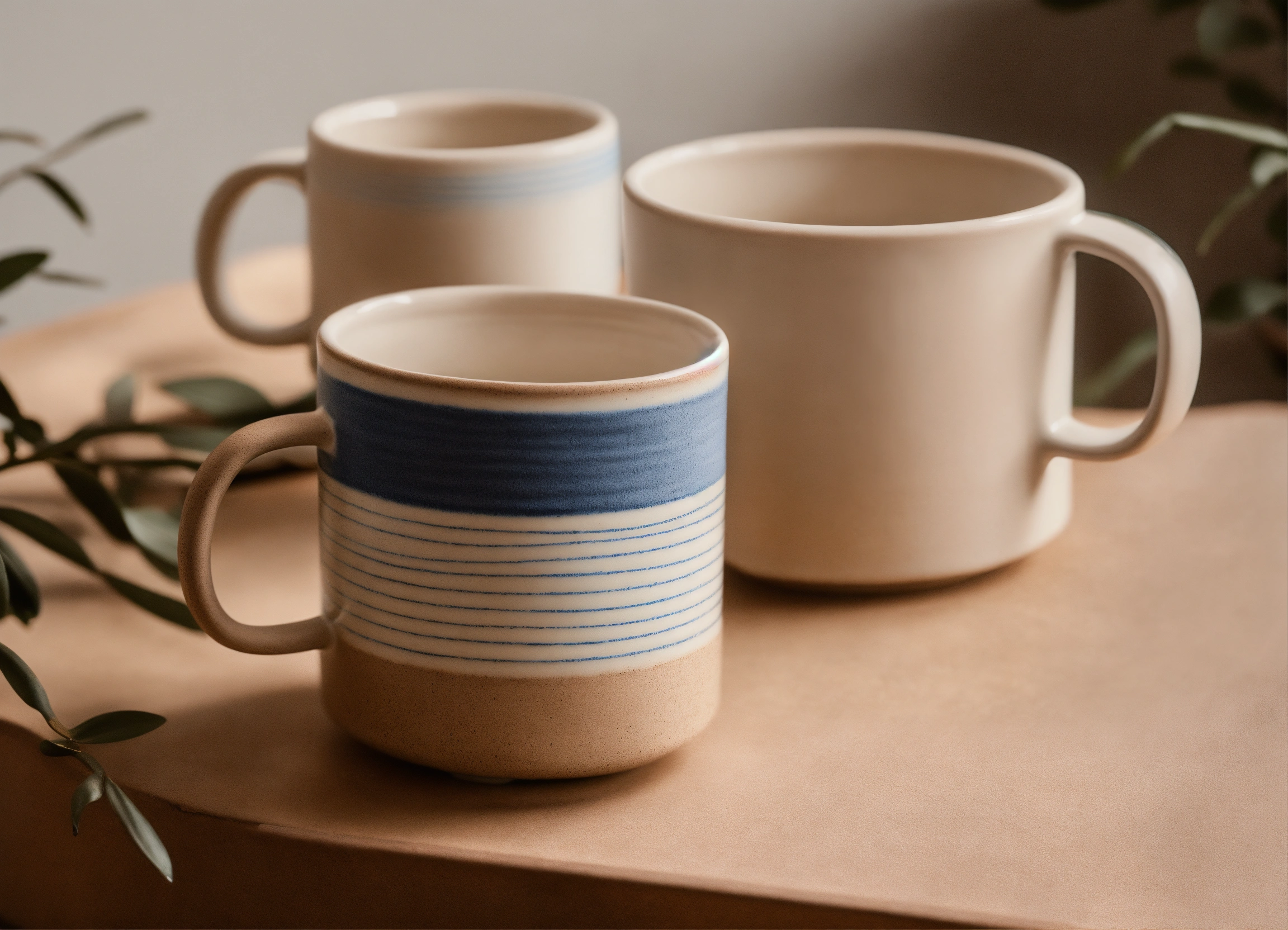 Stoneware straight edge cylindrical short ceramic mug with half circle handle, white matte surface with hand drawn blue lines. ad style modern minimalistic photoshoot with soft warm brown tone linen fabrics.