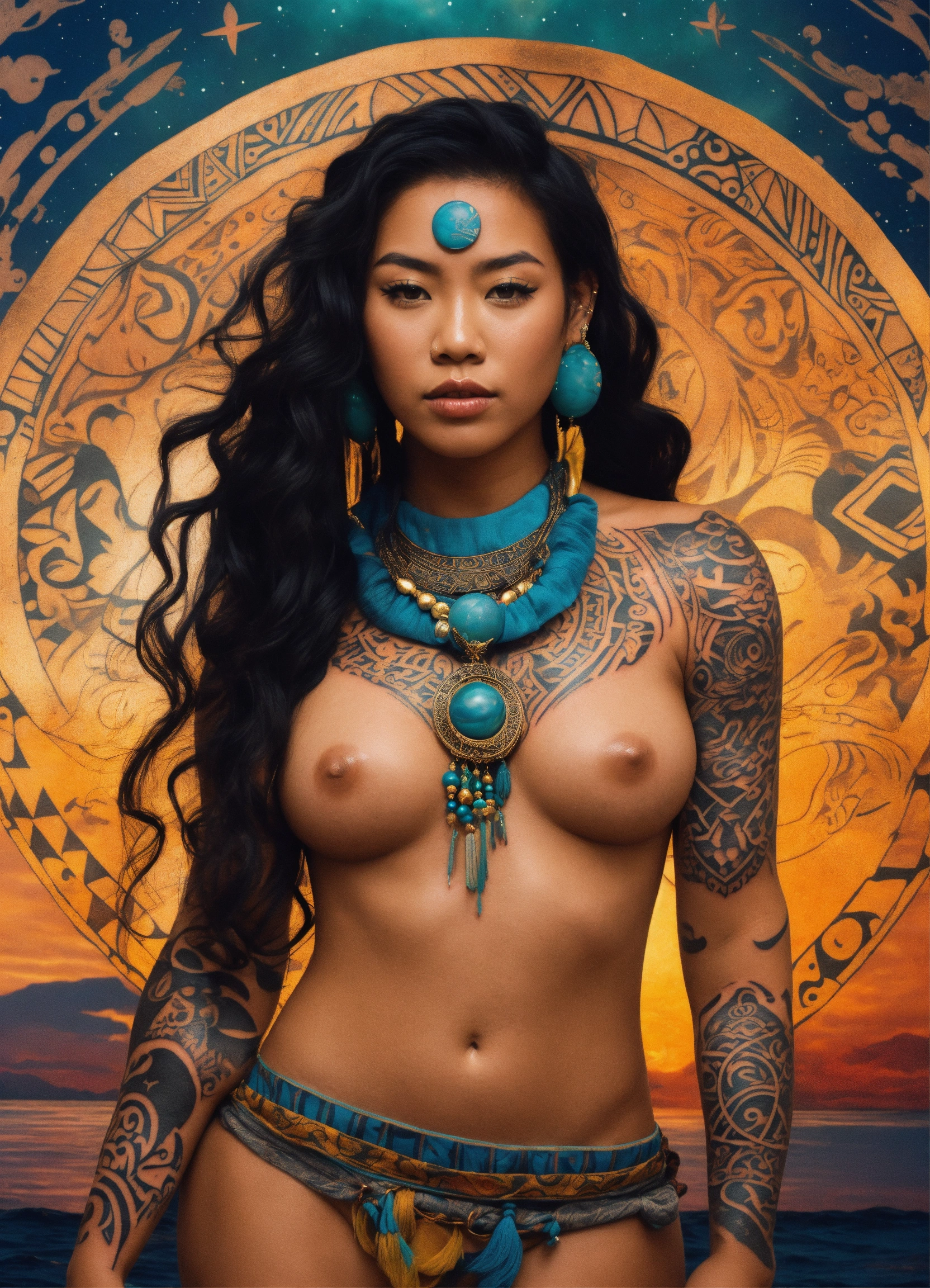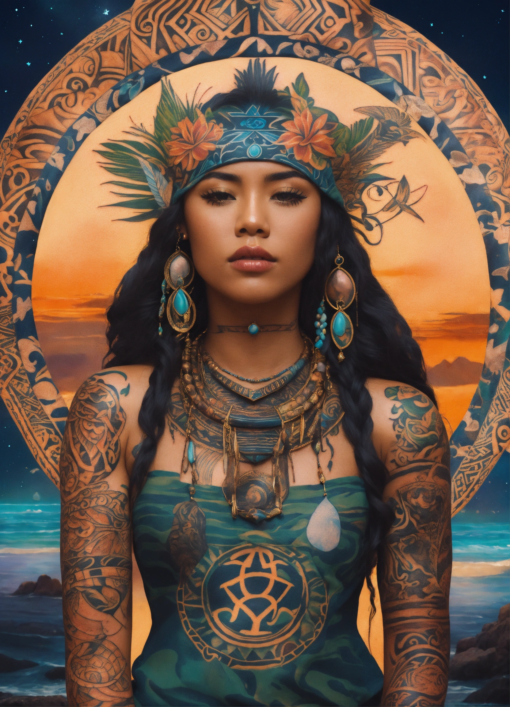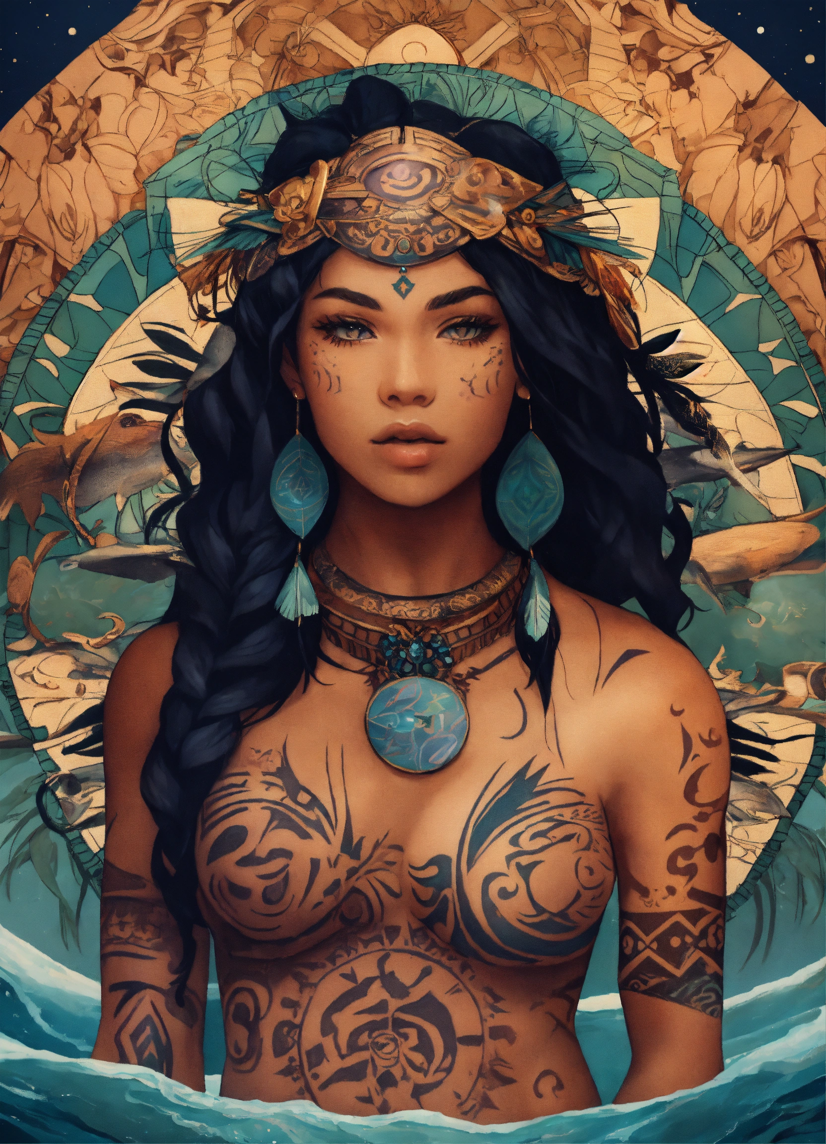 Pisces jupiter neptune zodiac theme with pacific islander woman who has tribal tattoos