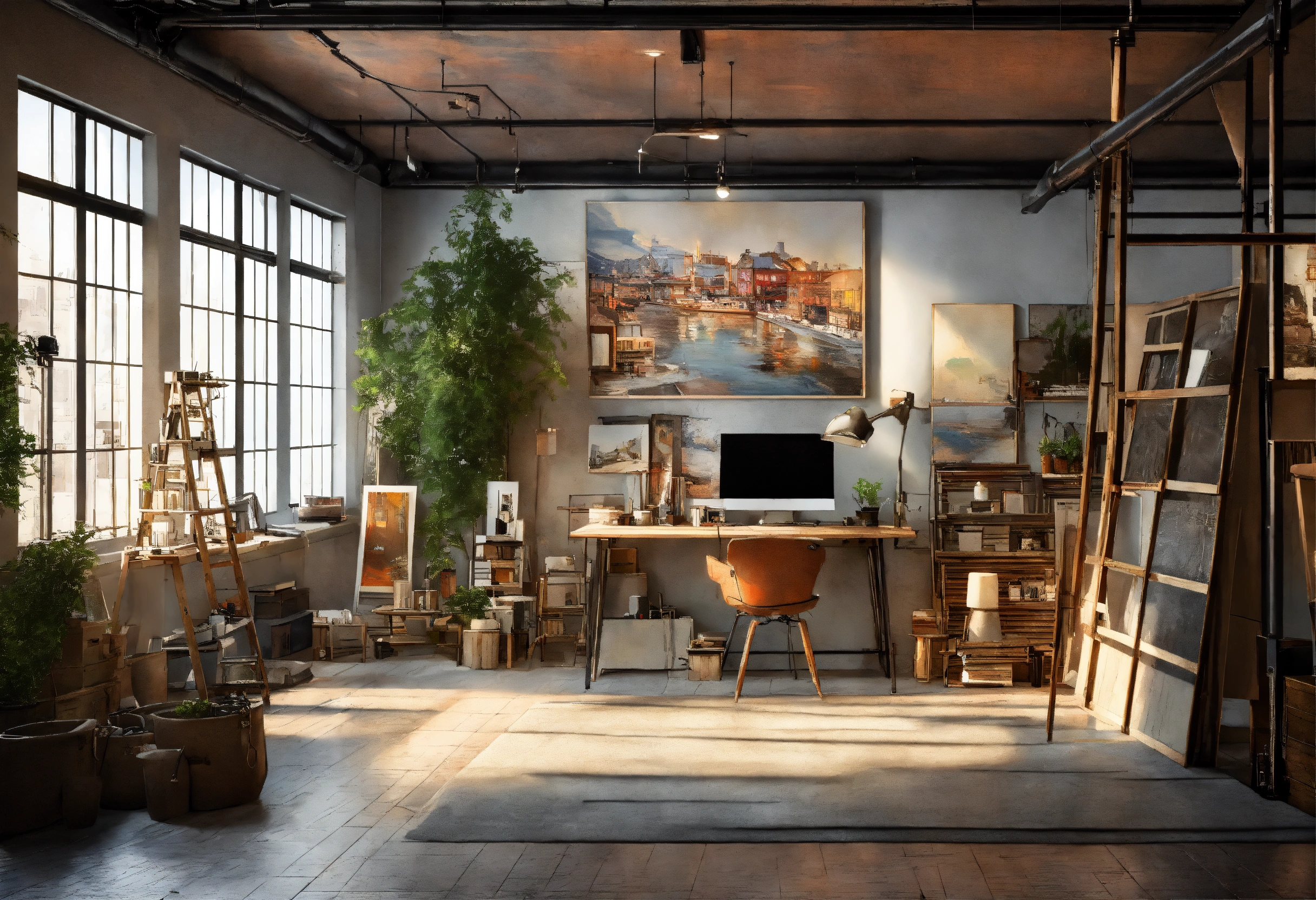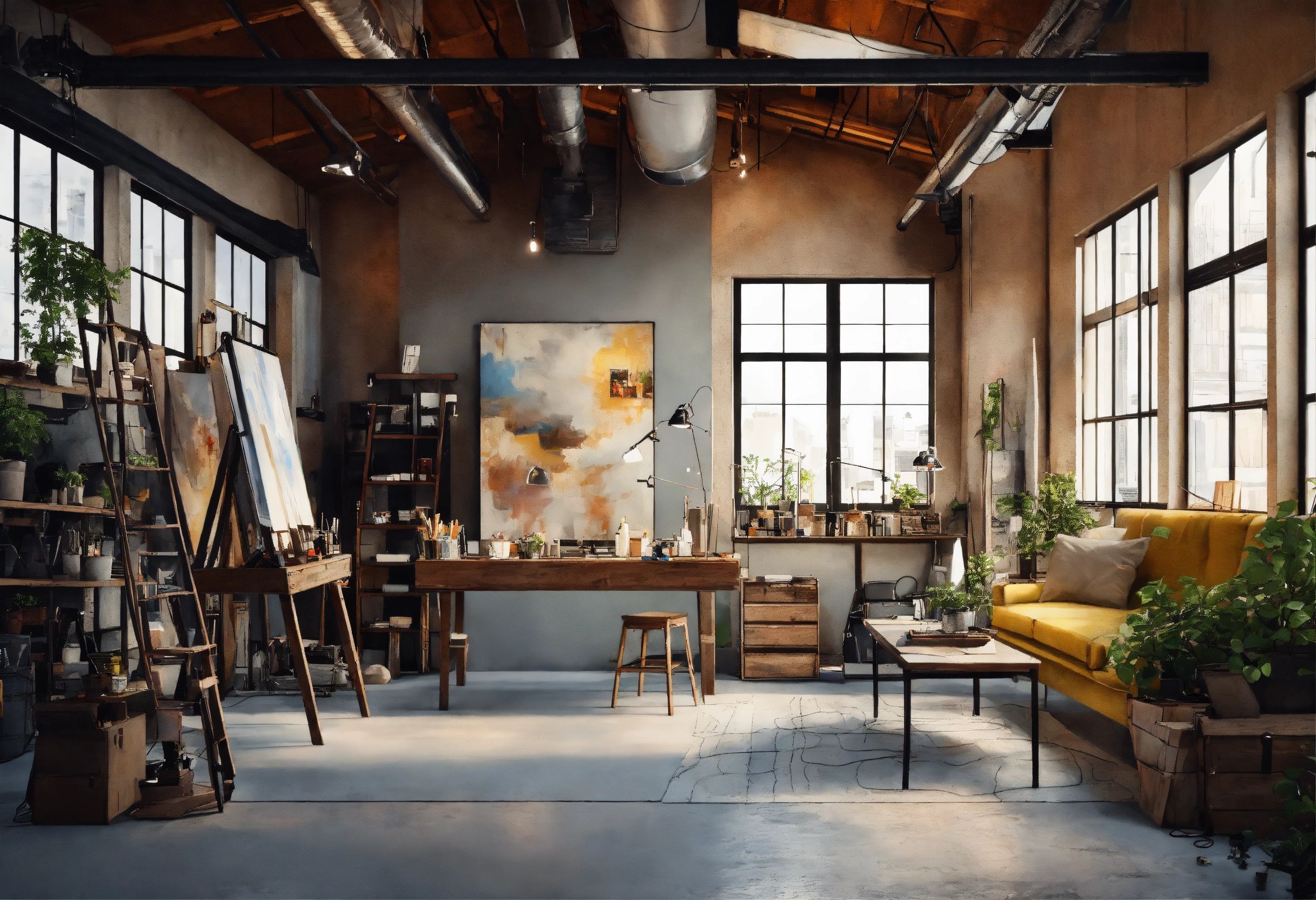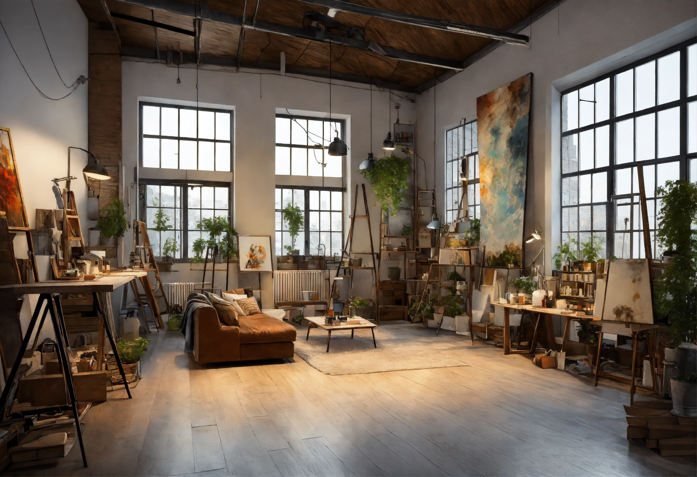 Art studio scandinavin, industrial loft, retro industrial style interior decor, mezzanine, white walls, canvas painting artist studio, highly detailed layout, depth, many parts, lumen rendering, 8k