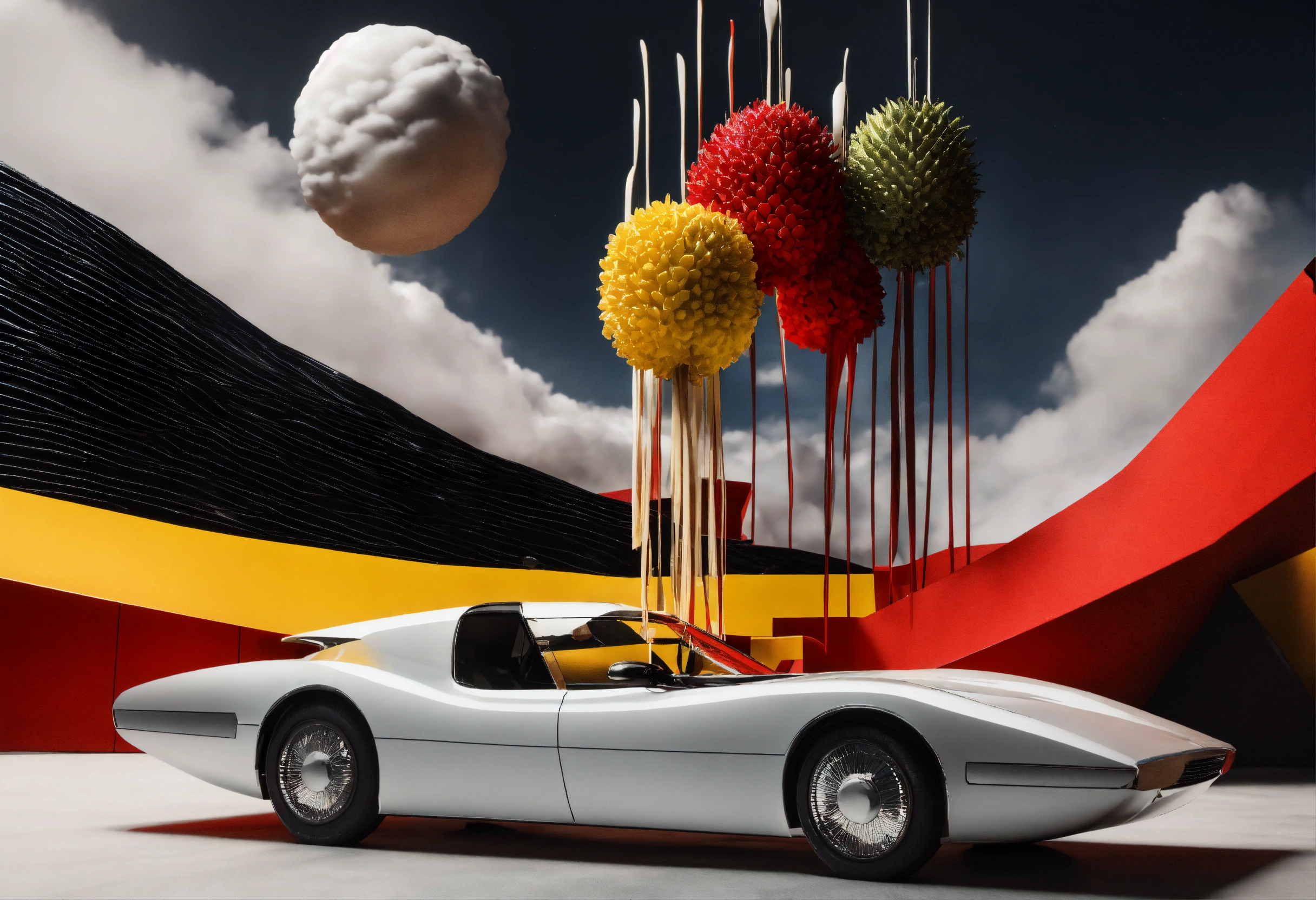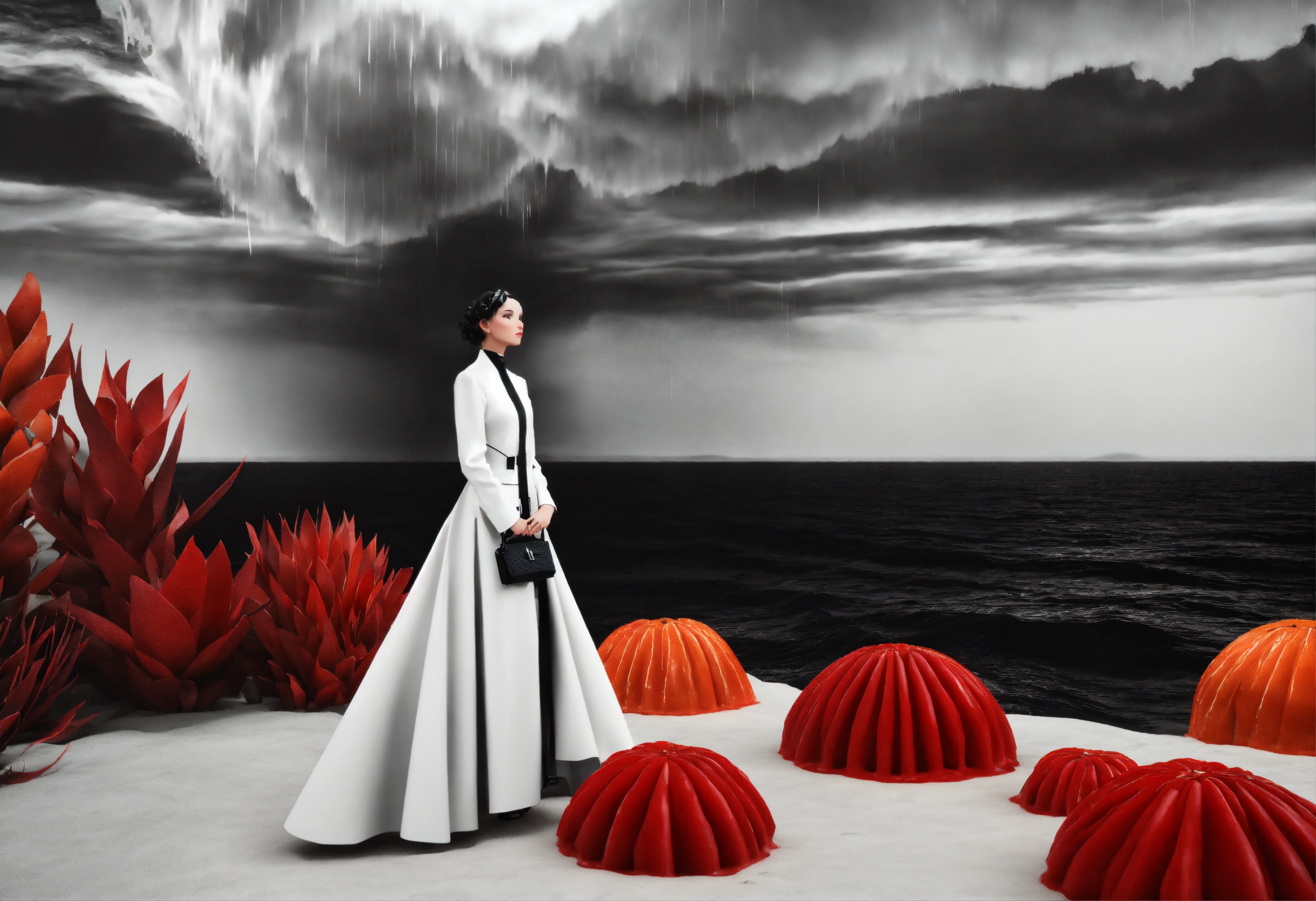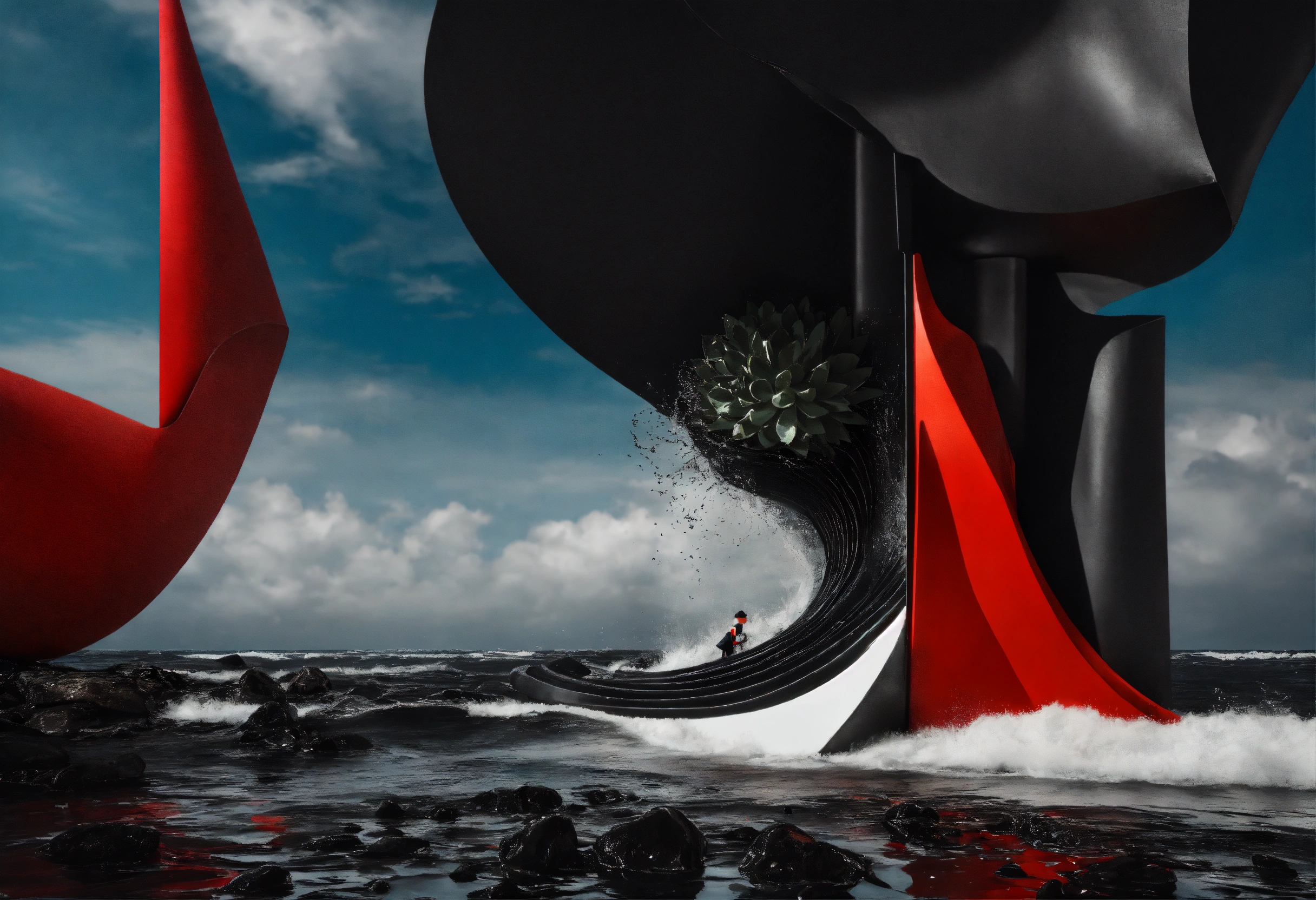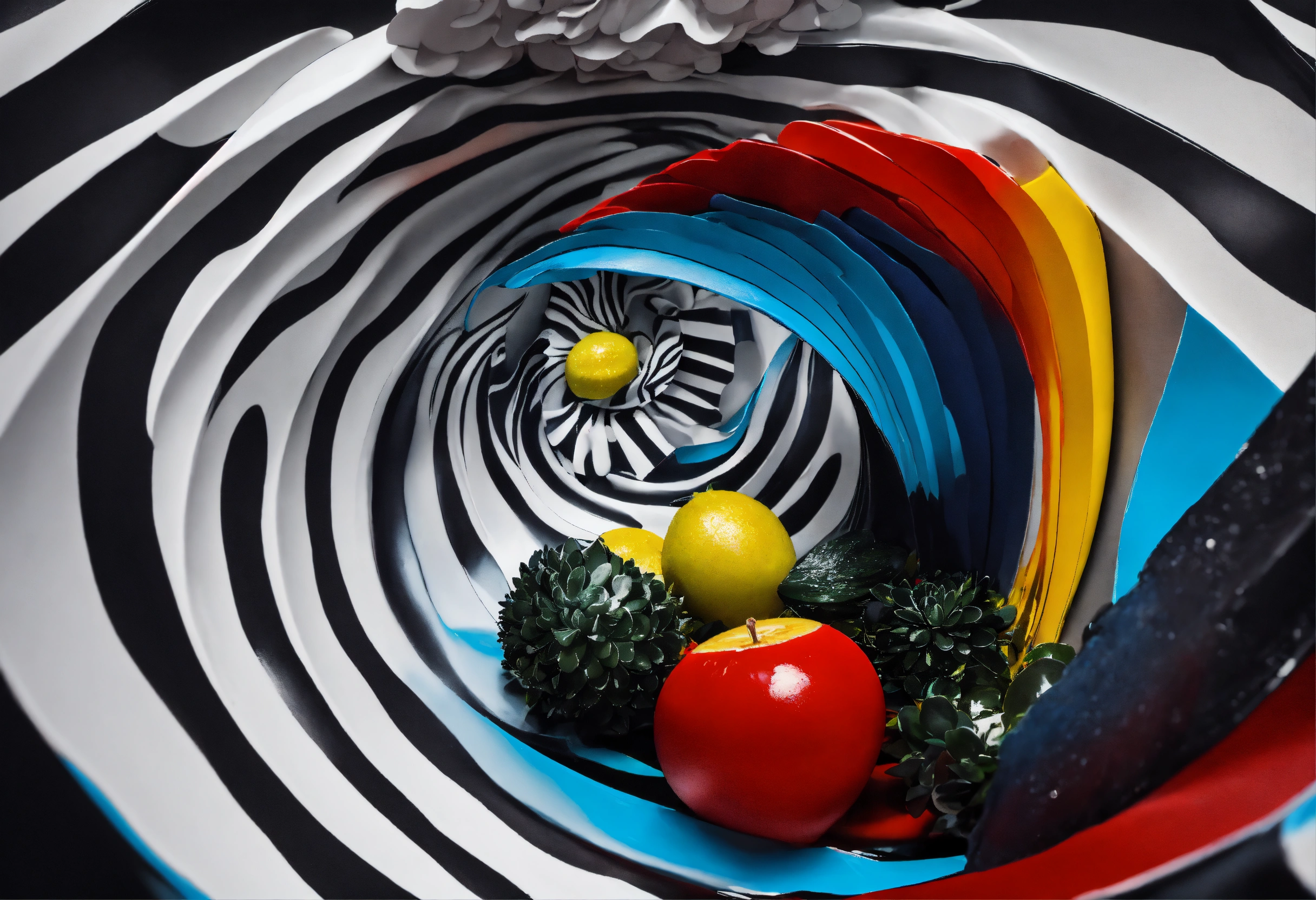 Black and white and primary colors, 3d abstract seascape, lady black leather bonding clothes, immersive inspired art deco, succulent fruits juiciness splashing, rené magritte inspiration.