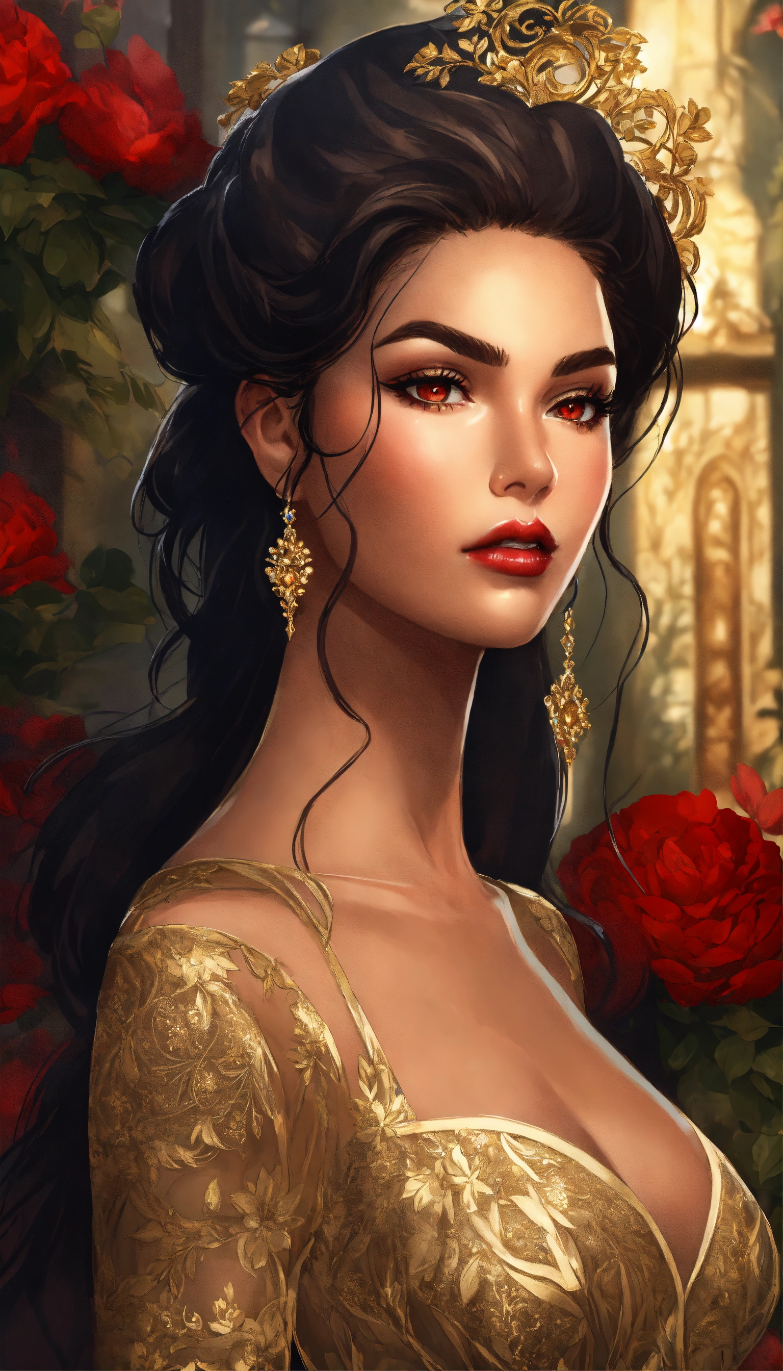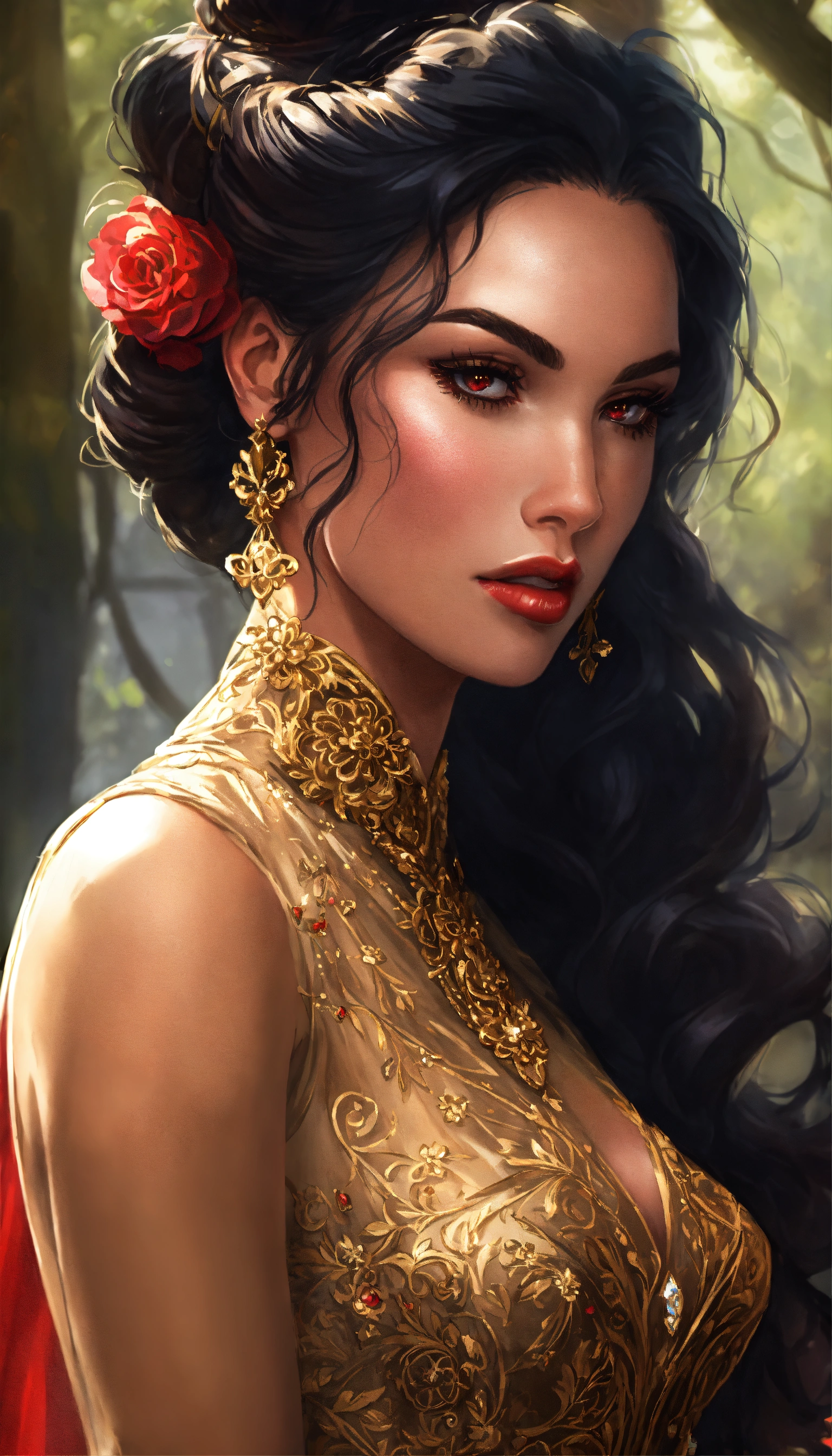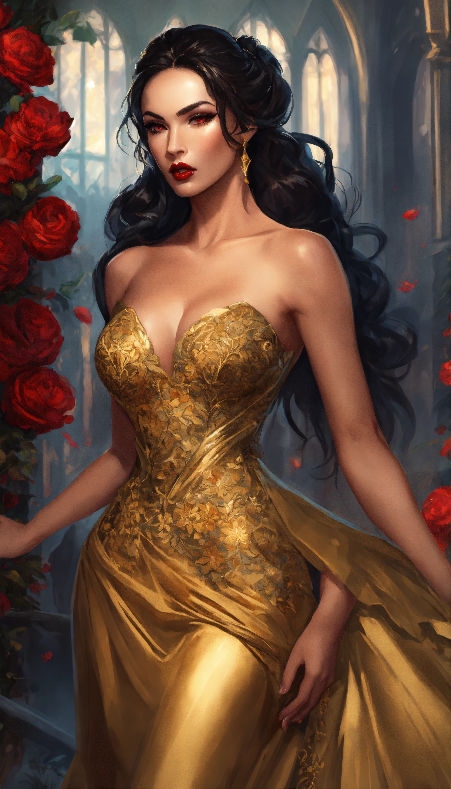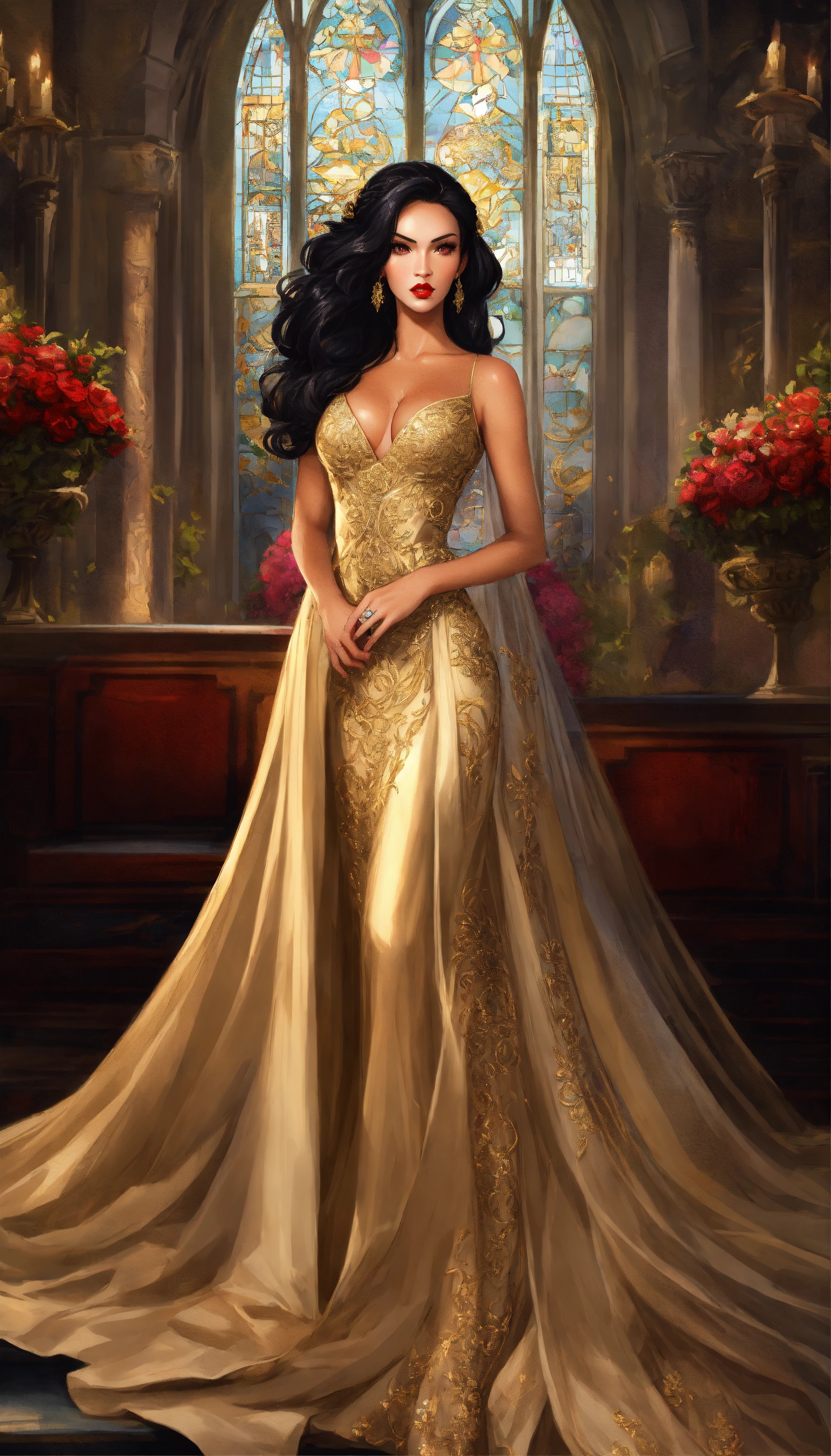 Concept art of ravenna, megan fox, glowing red eyes, curled voluminous flowing black hair in a formal wedding updo, hair in a bun, updo, bun, curled black hair tied up in a wedding bun, beautiful, tan skin, realistic, sabine rich, artgerm, j scott campbell, artgerm, perfect body, detailed, intricate, round face, slim nose, long black eyelashes, red lips, sharp jawline, perfect detailed face, realistic, floor length gold veil, full body view, evil dark sorceress, gloomy grey castle background, gloomy dark flowers forest castle, gold floor length fitted full skirts bridal gown, low cut neckline, gold high heels, voluminous curled long hair, gold train updo veil, gold wedding gown, very long transparent golden long veil and hair tied up, golden fitted bridal gown, big voluminous long train full skirt gown, forest, yennefer, zuhair murad bridal, zuhair murad bridal ball gown, gold pattern textured shimmer fabric embroidered dress, gold long train wedding dress, walking down aisle, sleeves