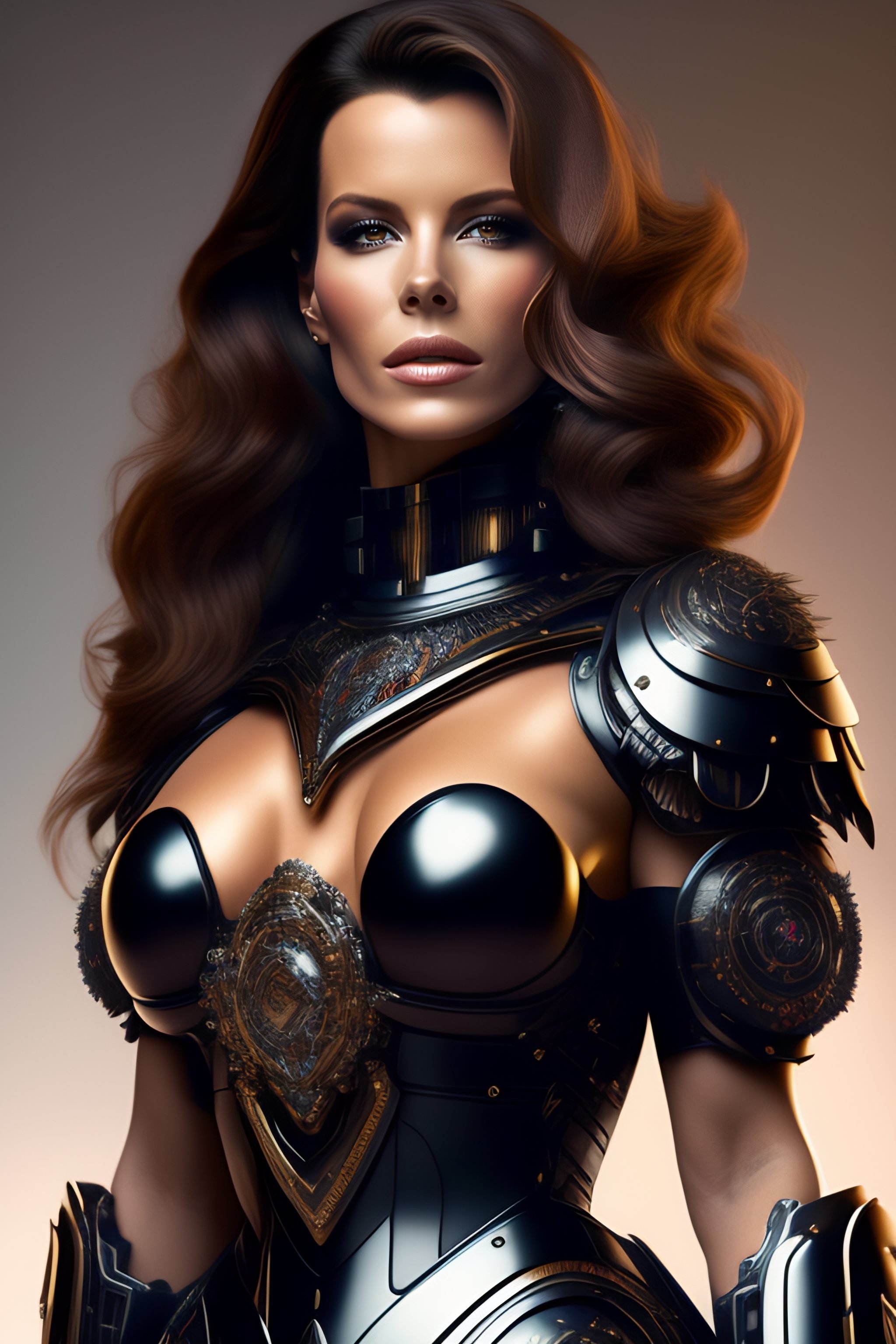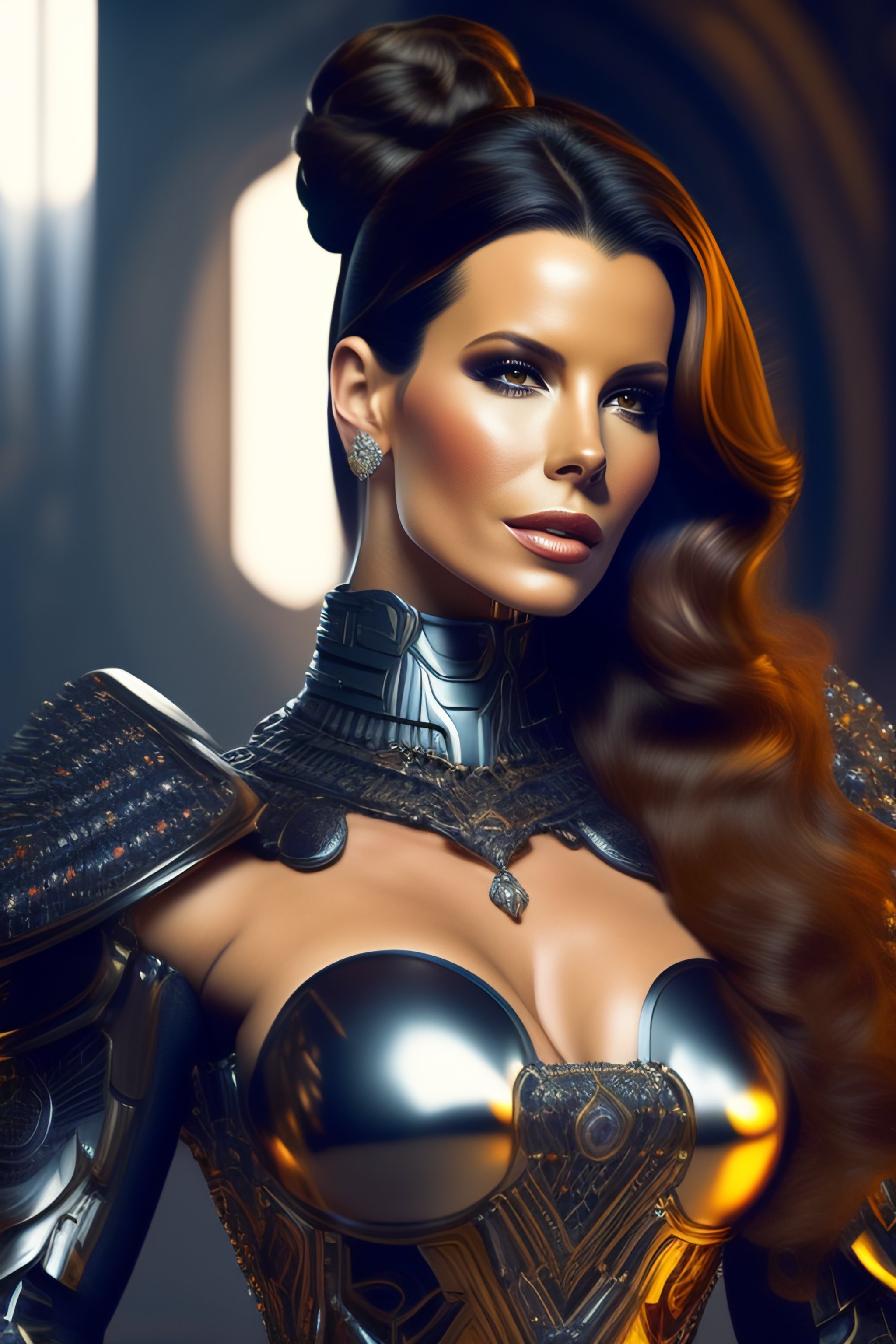 Kate beckinsale, cybernetic, tight full body view, wearing intricite robot, bursting huge chest, tight top, art by caravaggio