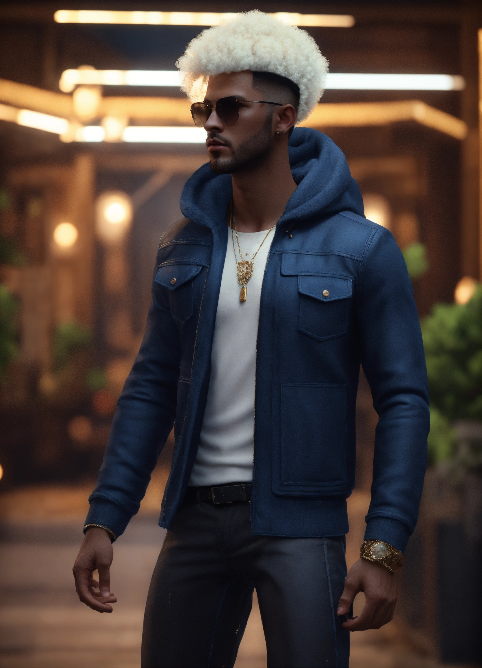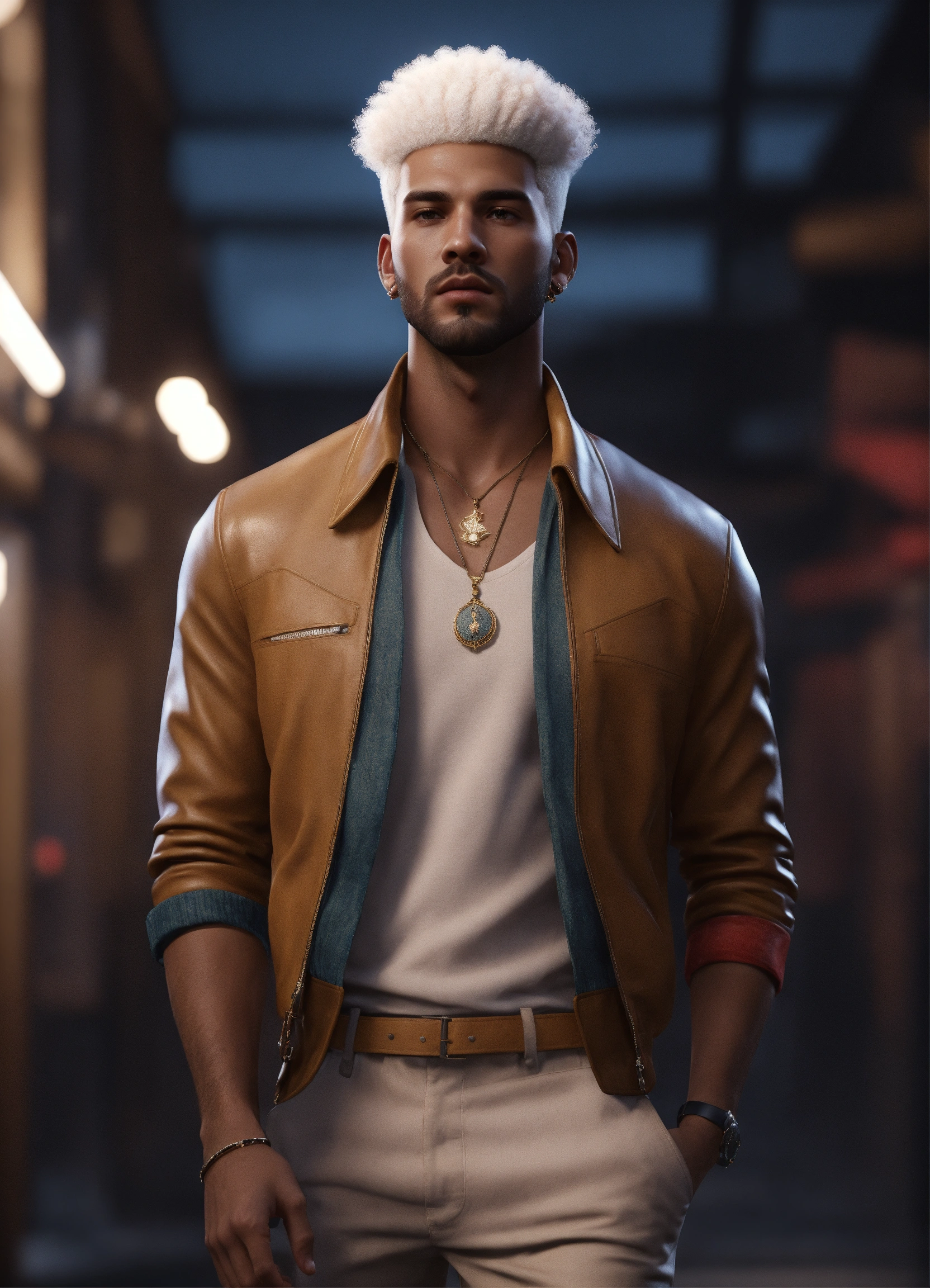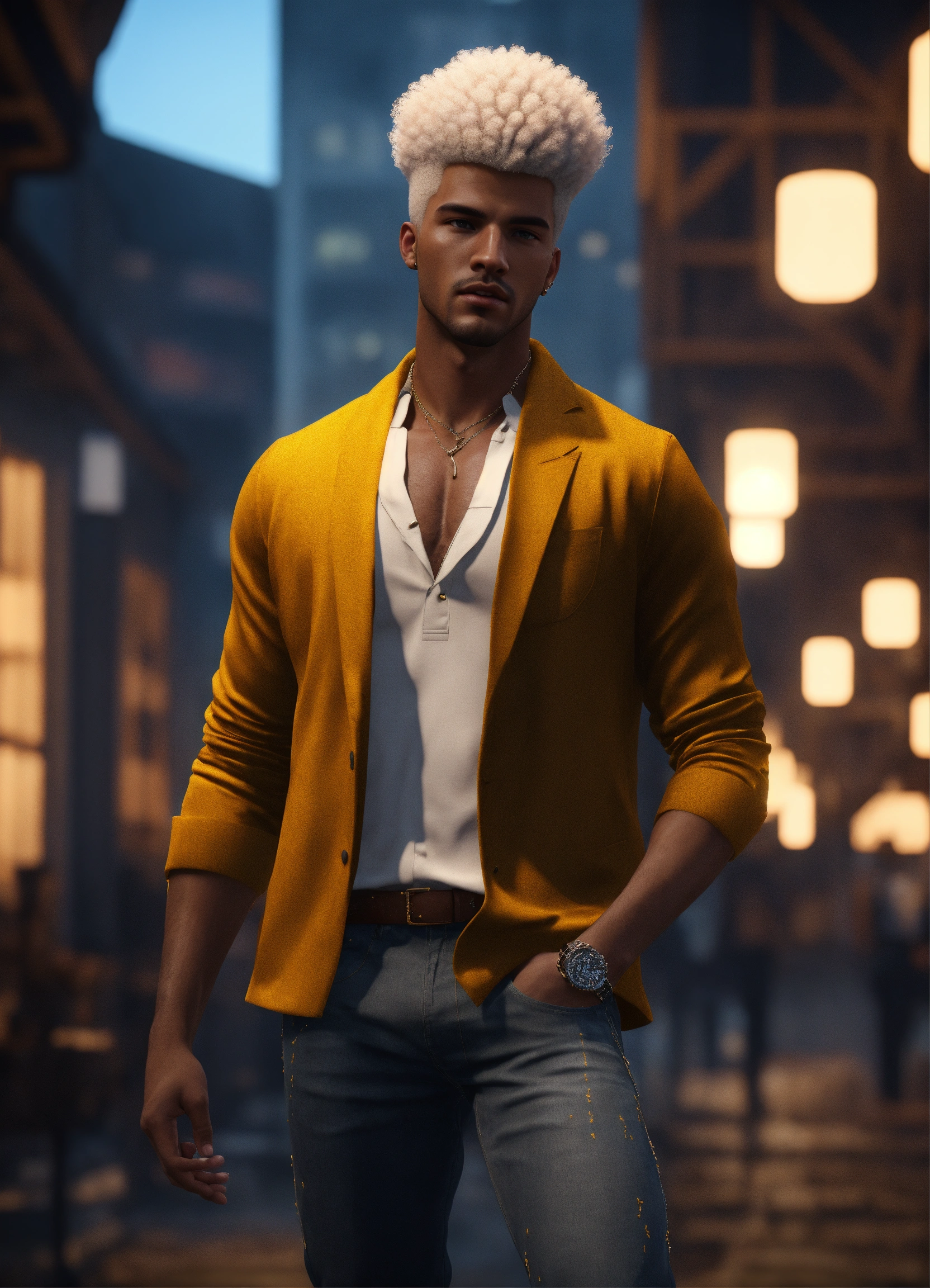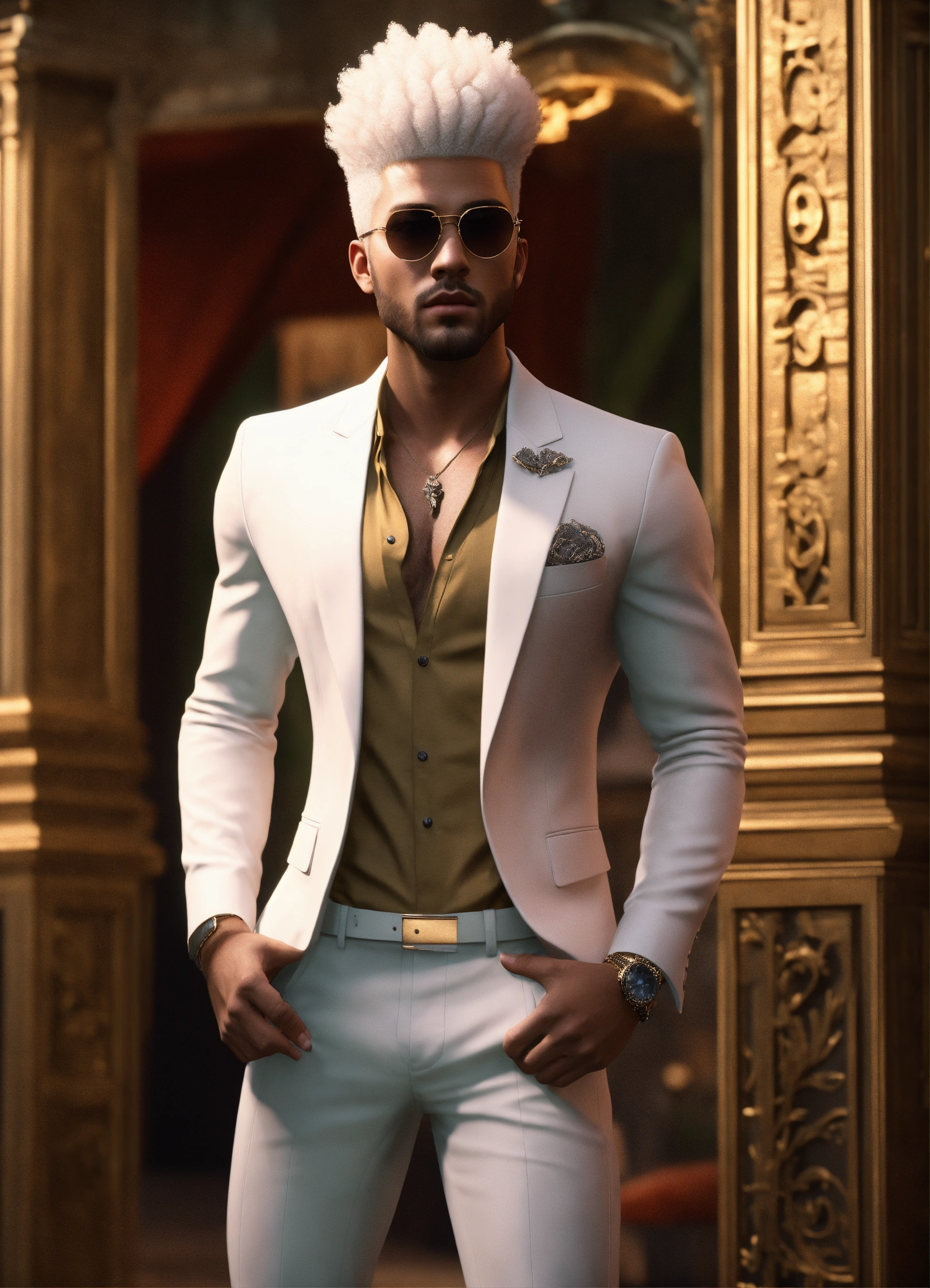 Handsome 27-year-old male. with a white afro. tall build, dressed in haute coture casual wear. 8k, unreal engine. standing in upscale in lofbby, misischievous demeanor, 8k, unreal engine. 8k, unreal engine.