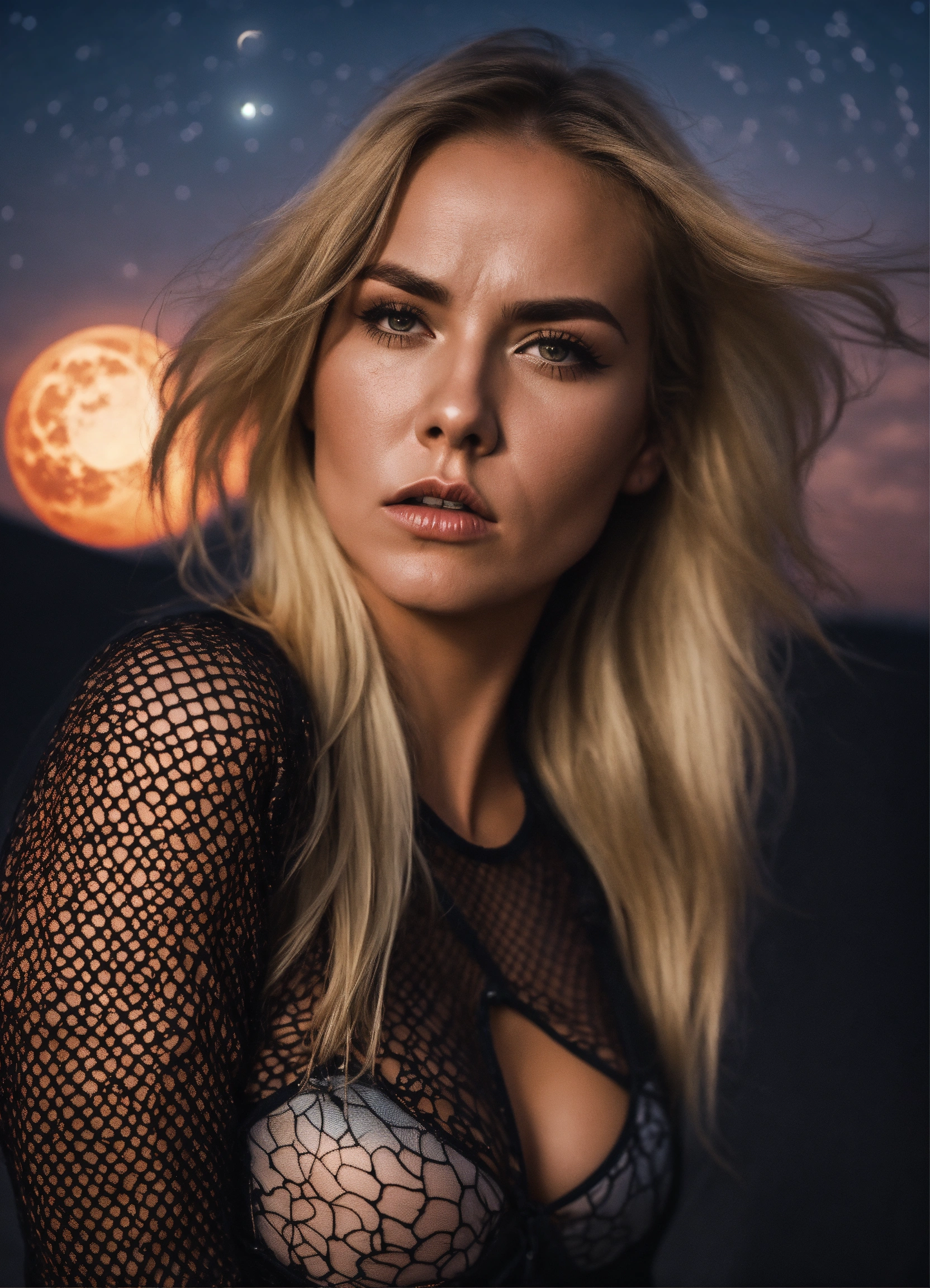 A real photo of a strong 32 year old very hot blonde girl she is wearing a fishnet catsuit, she looks pissed, in the sky we see the moon and the milkyway