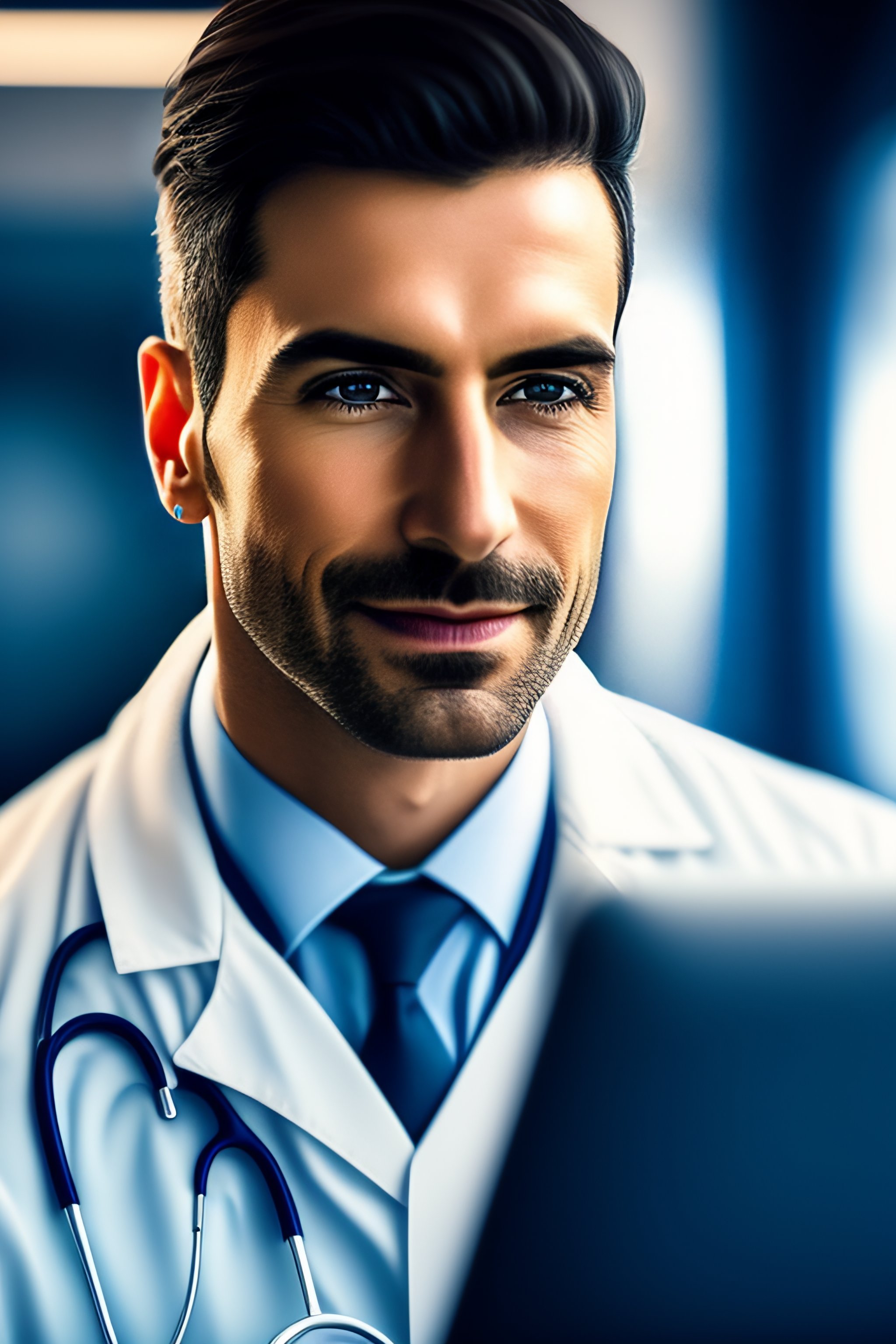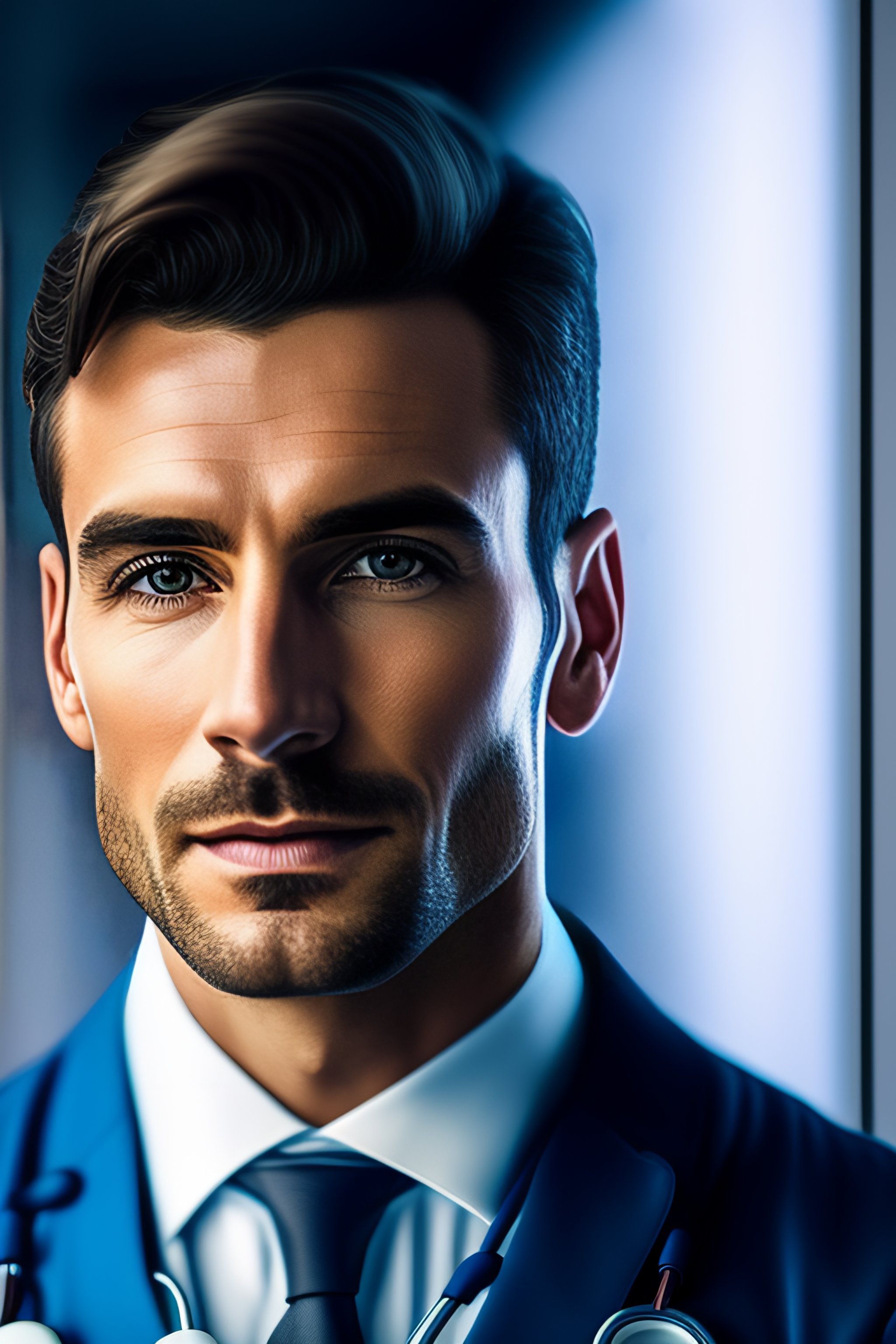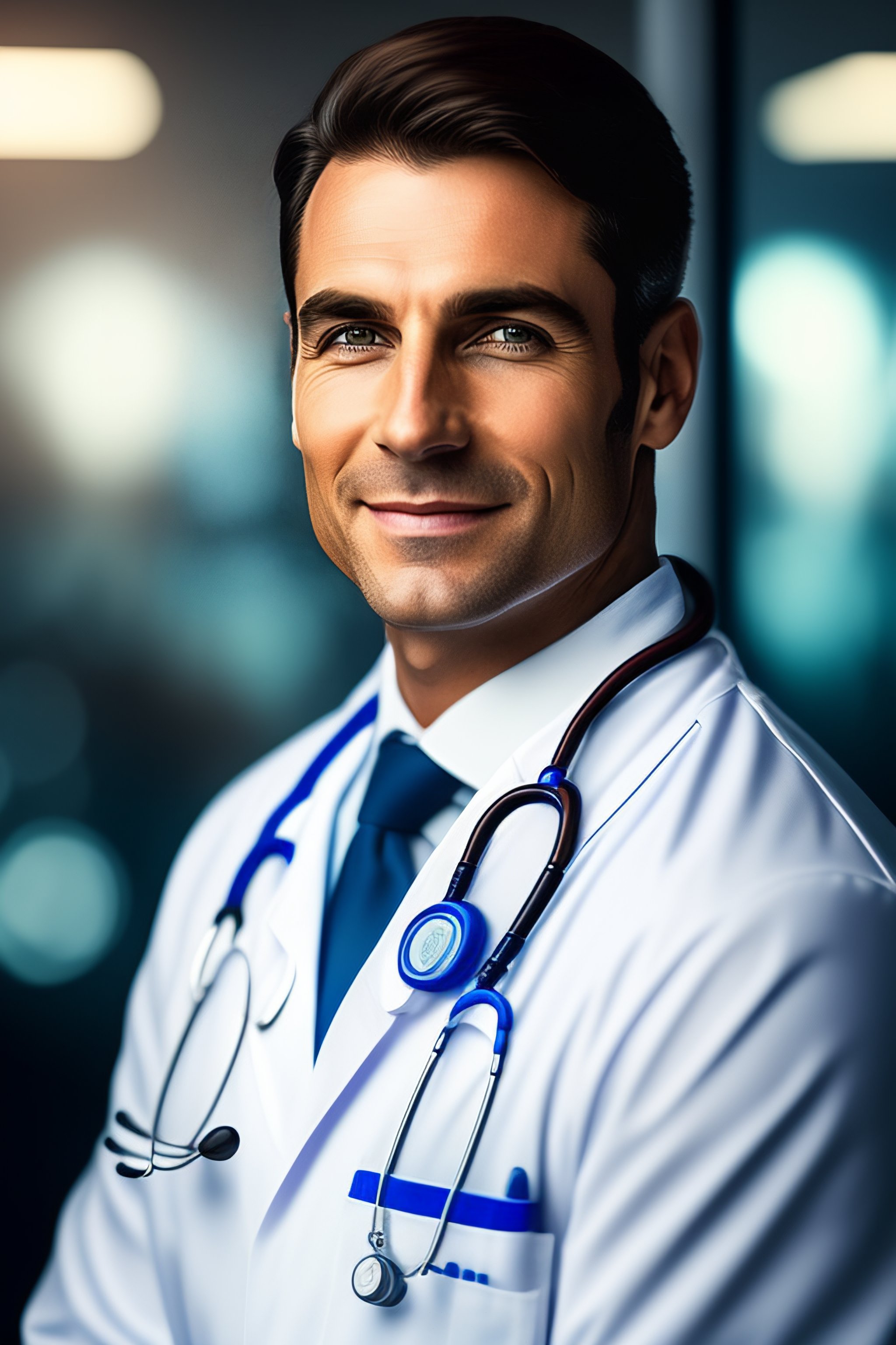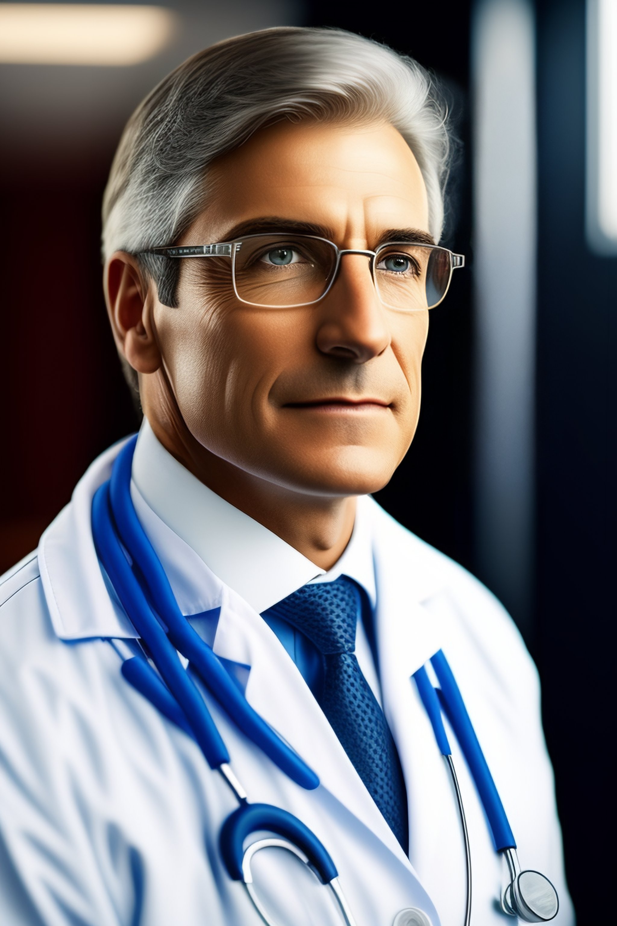 Photo of a realistic experienced german doctor wearing a doctors outfit, realistic, sharp focus, 4k high definition, insanely detailed, intricate, elegant, with blurred hospital background