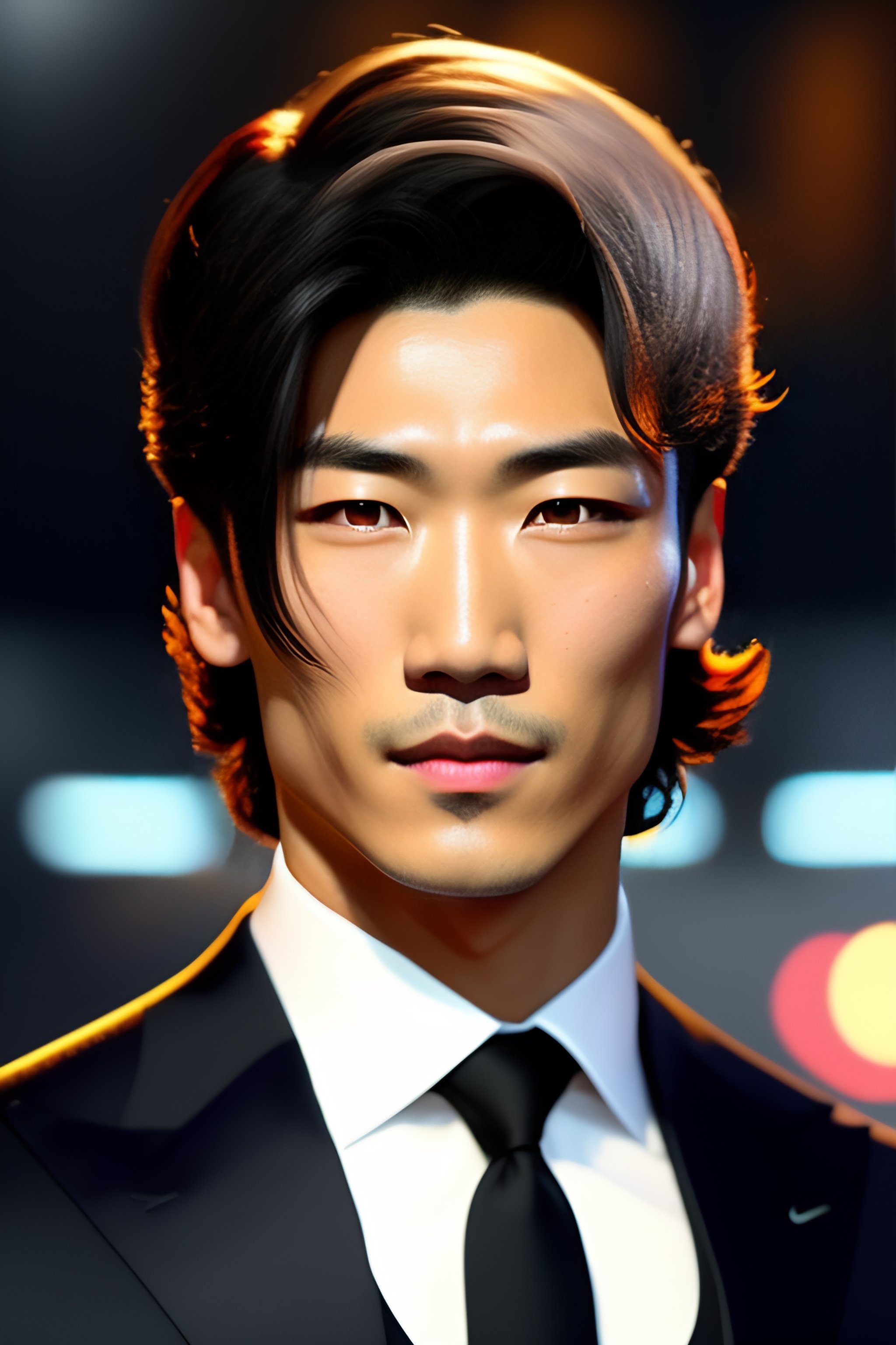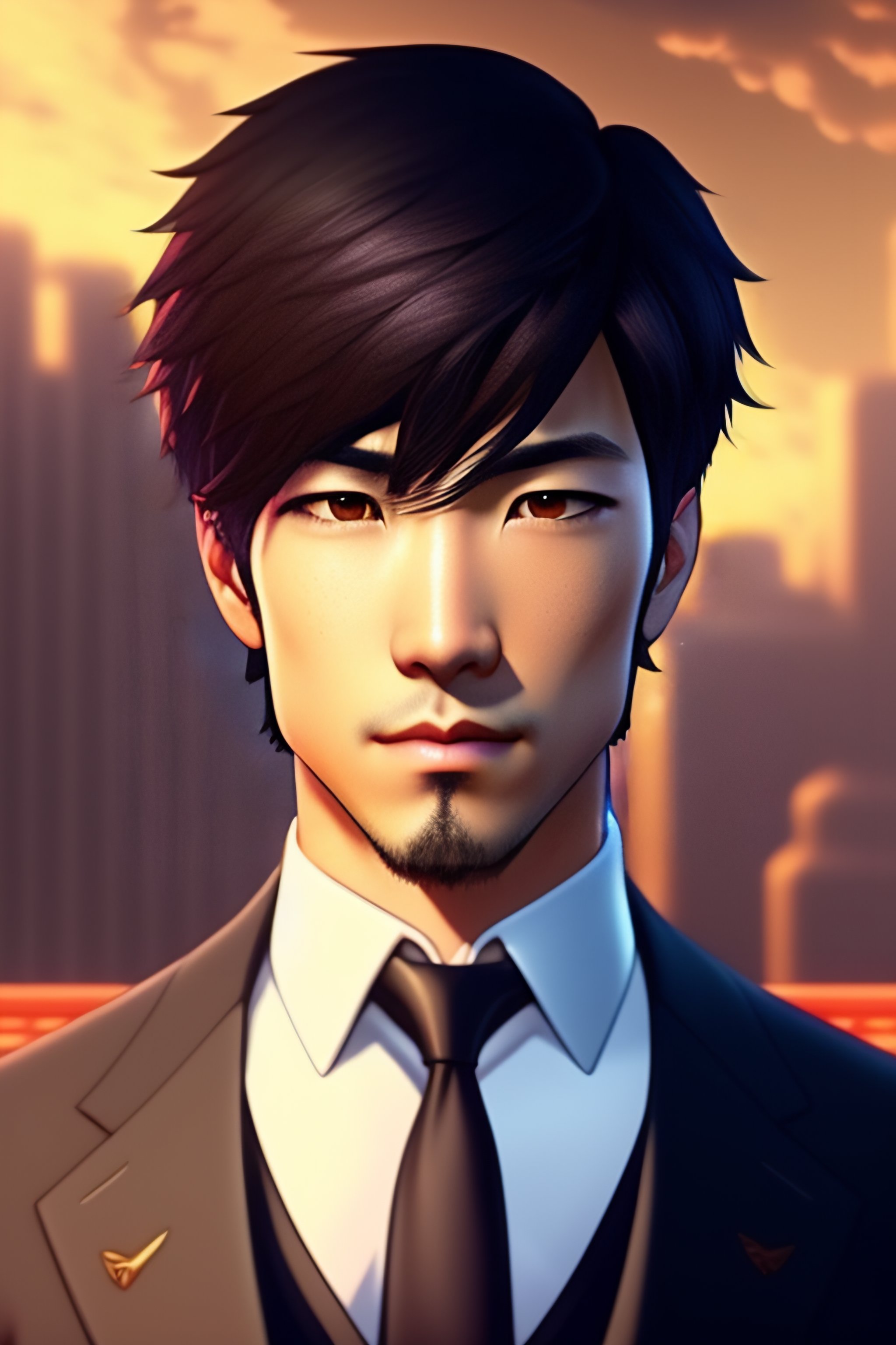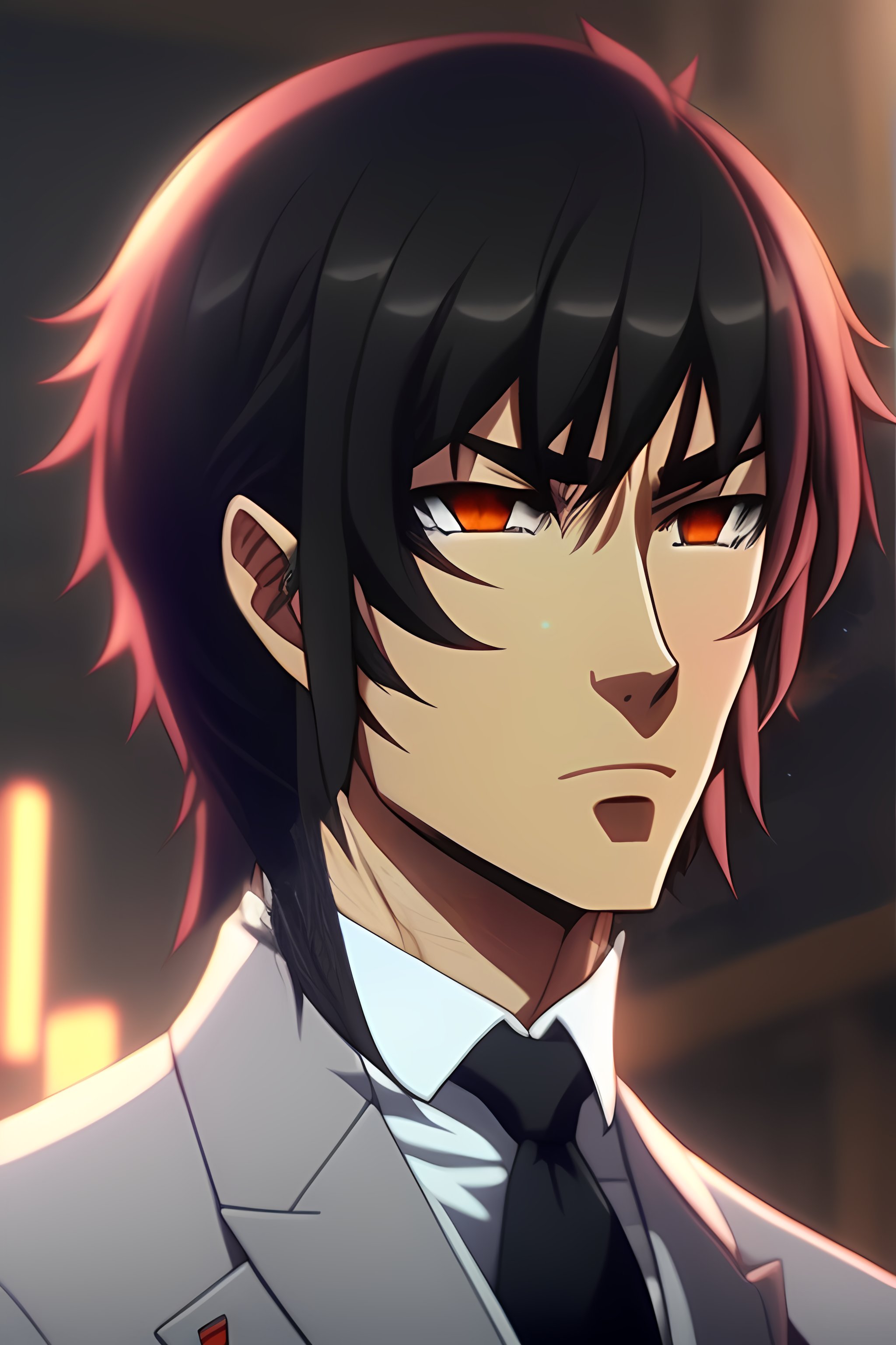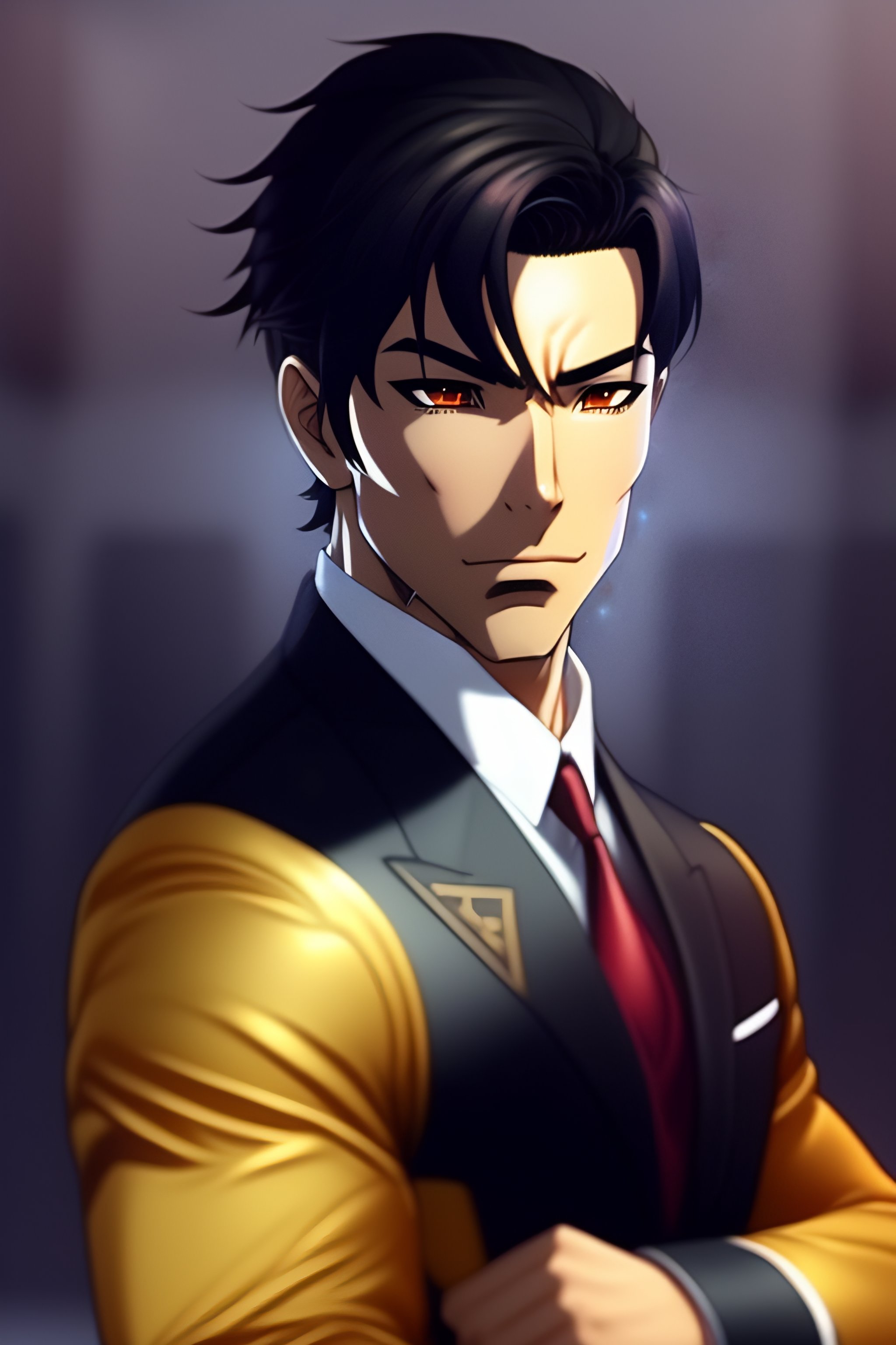 A handsome man anime with a sharp jaw and black eyes. his hair is parted in the middle. he is very attractive and wears a suit, his nose is somewhat sharp, his eyes are serious and meticulous, and he looks dejected