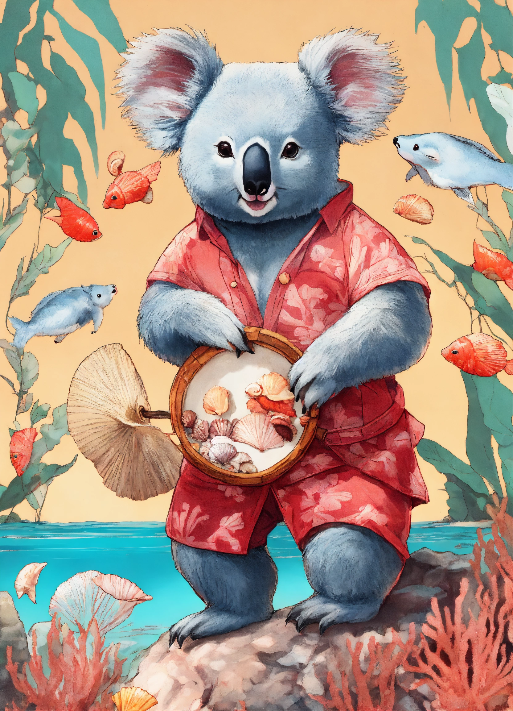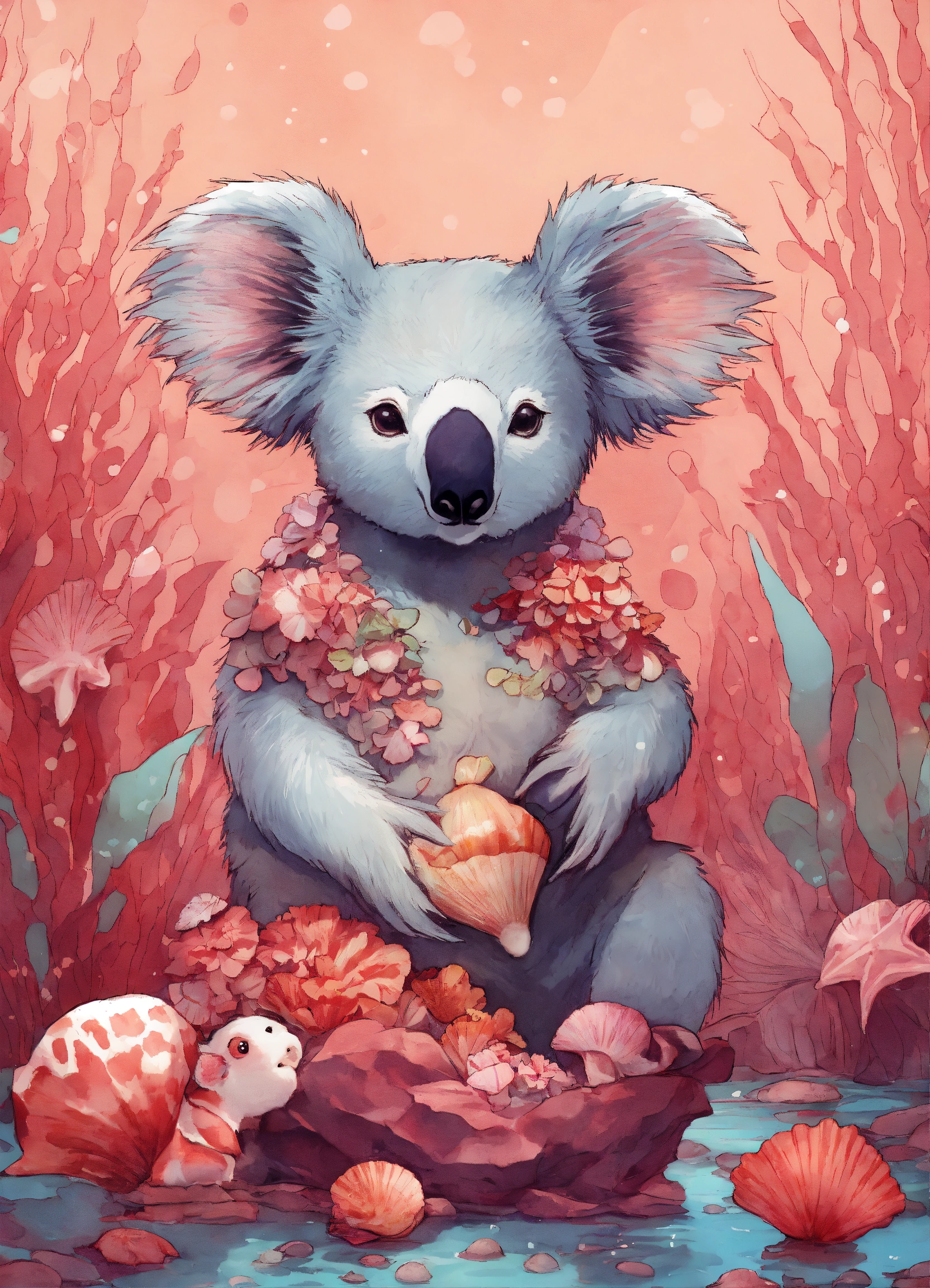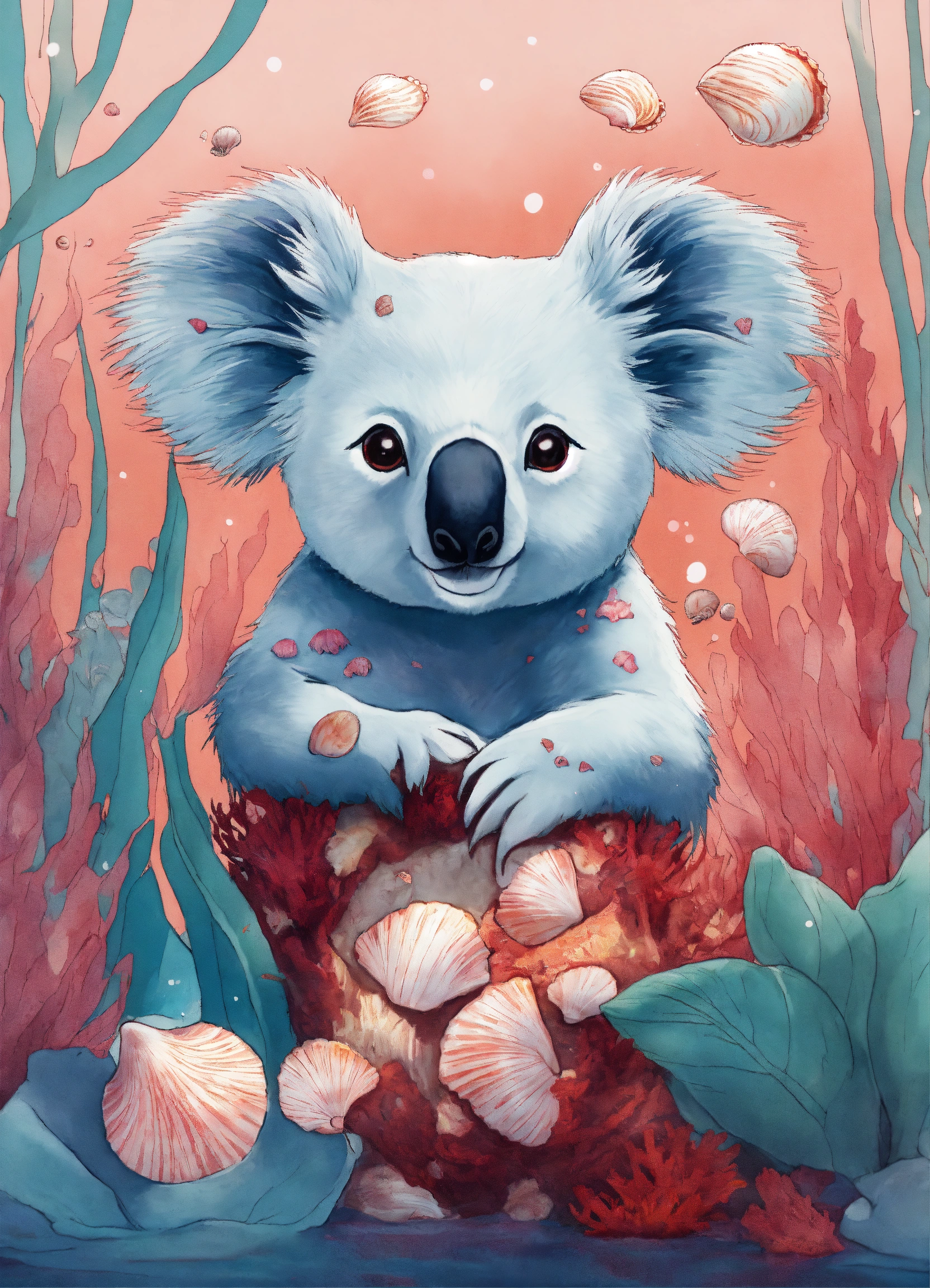 Koala of the rouge rubis swamp with seashells in a coral reef style manga