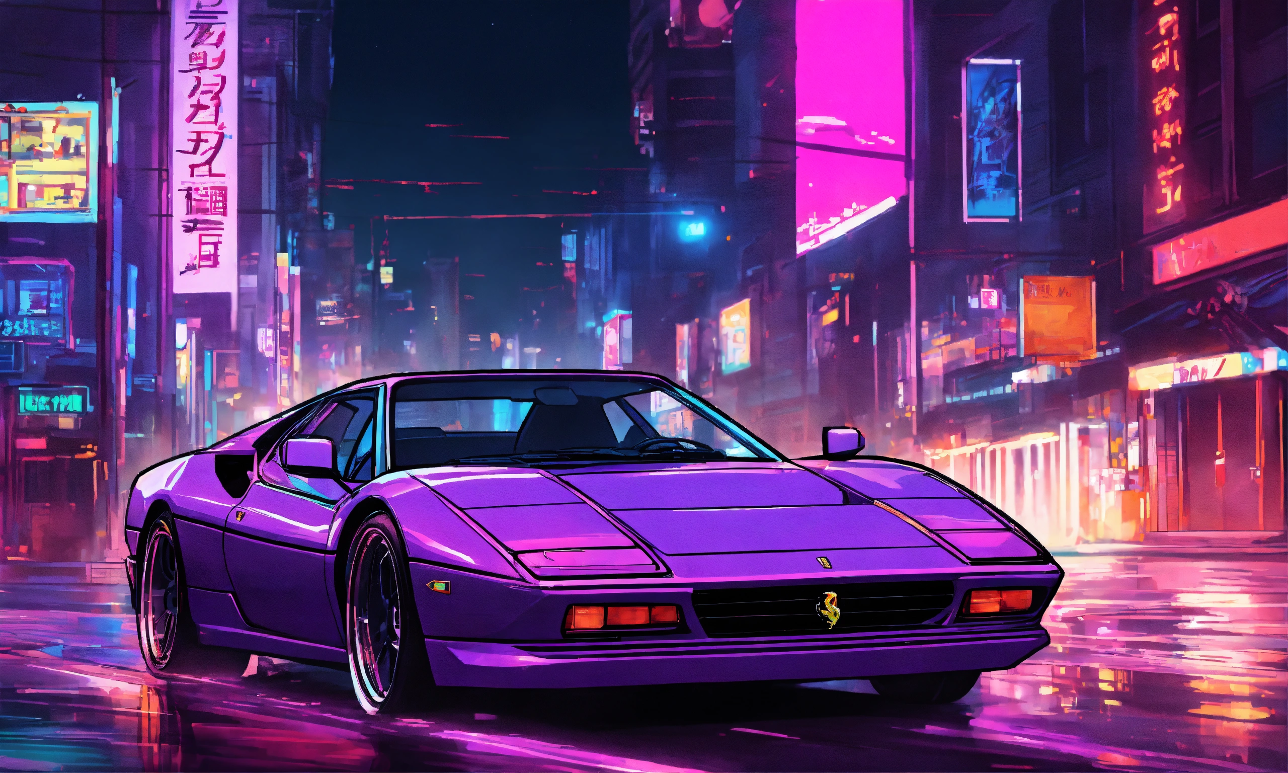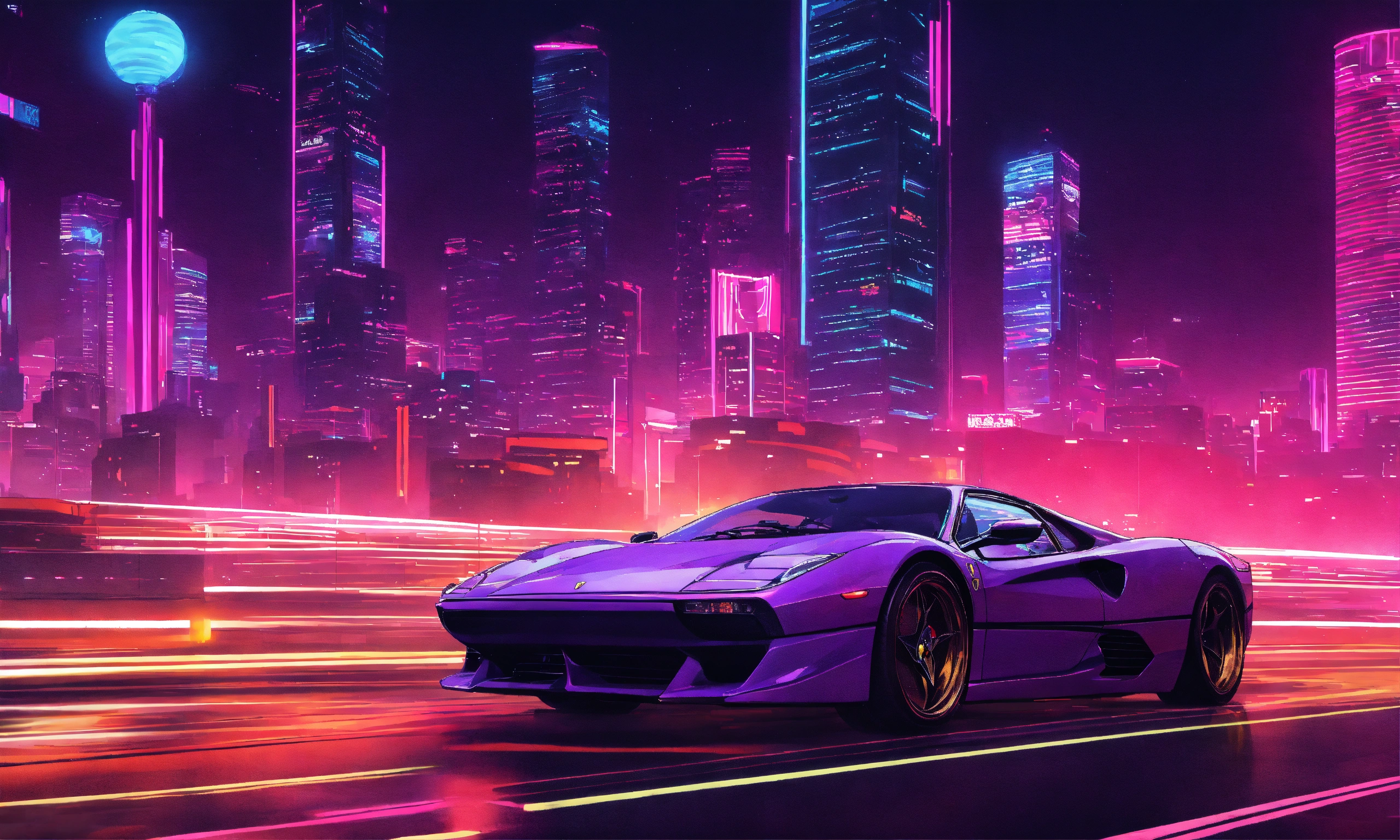 purple ferrari driving through futuristic downtown at night