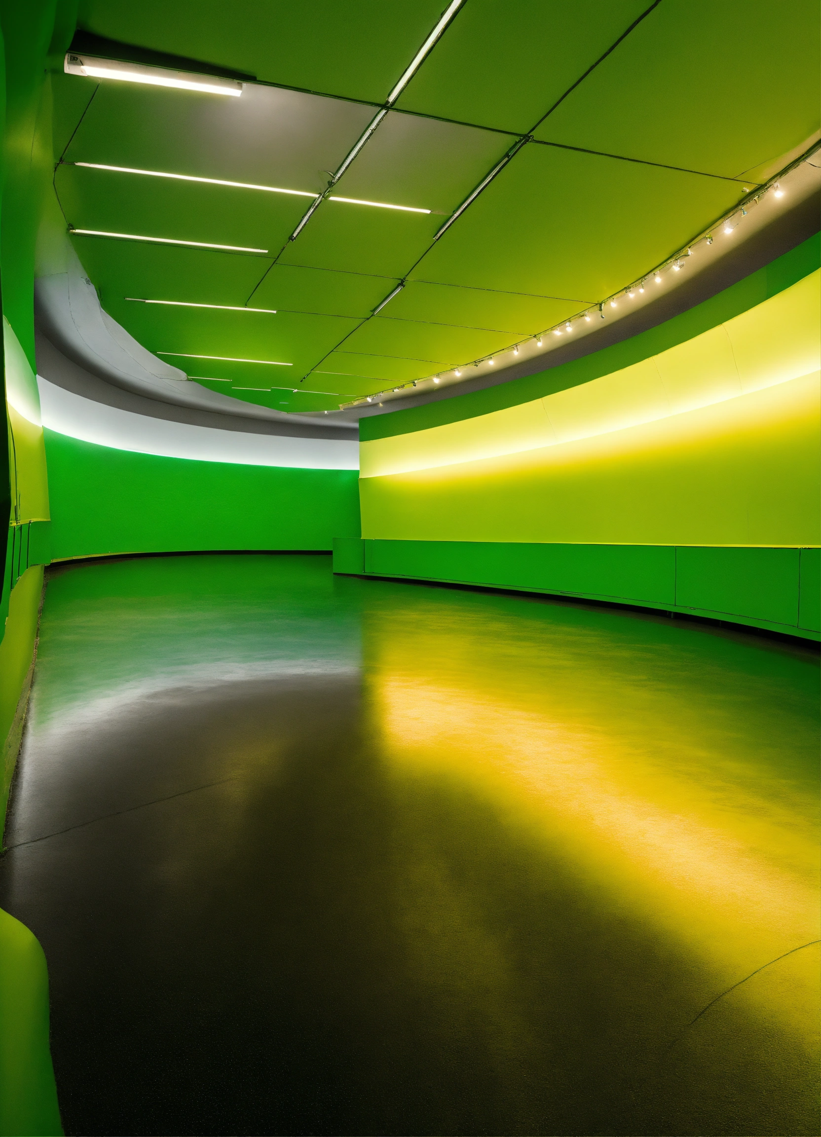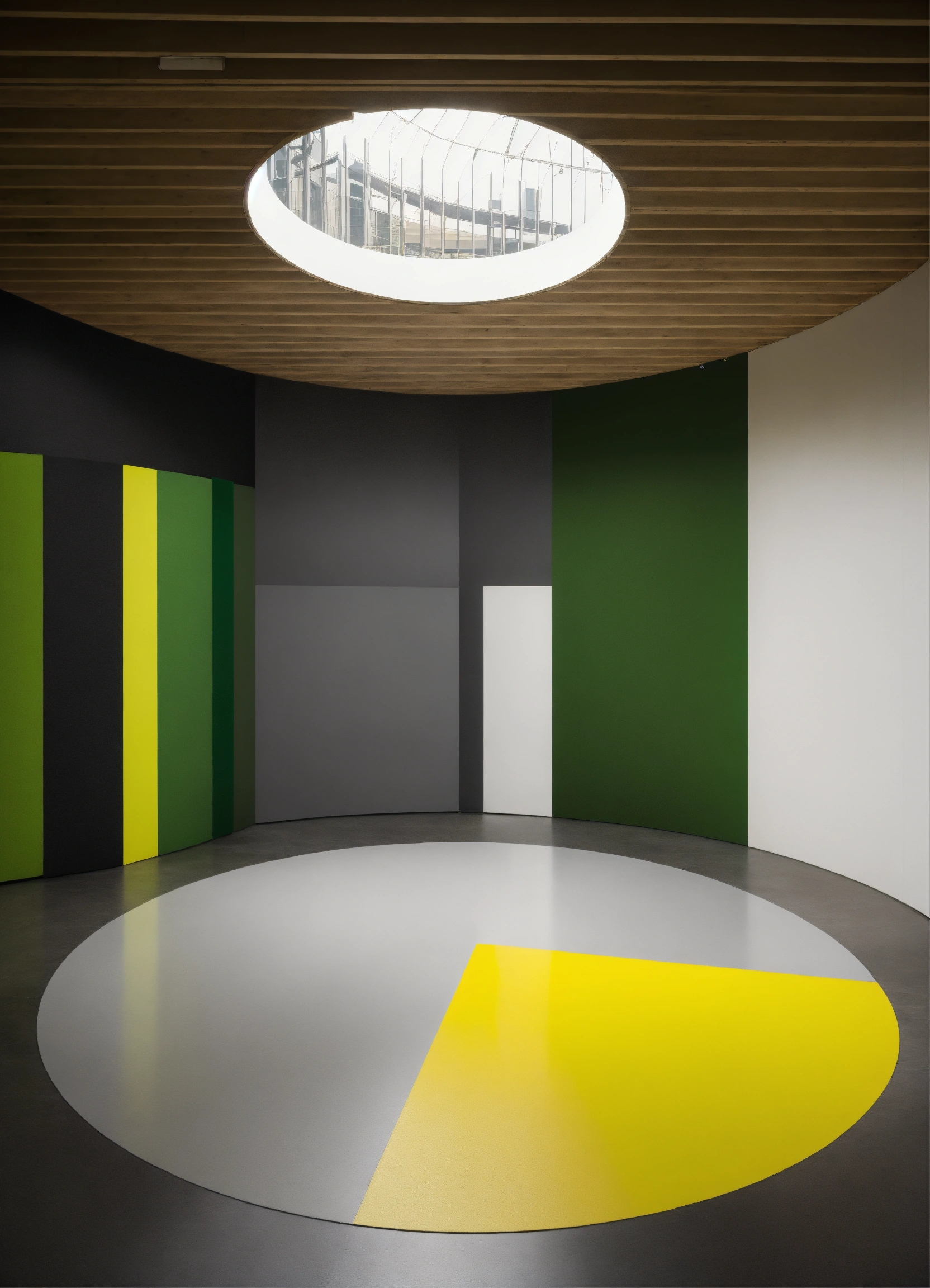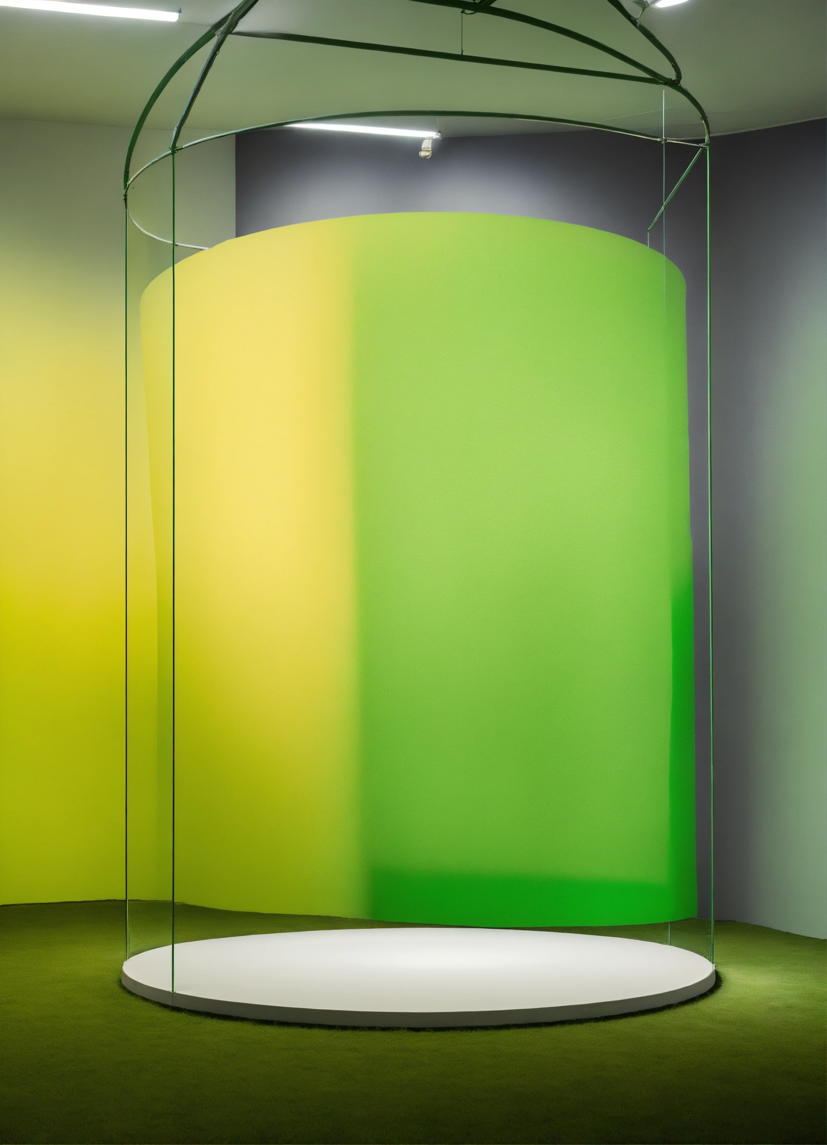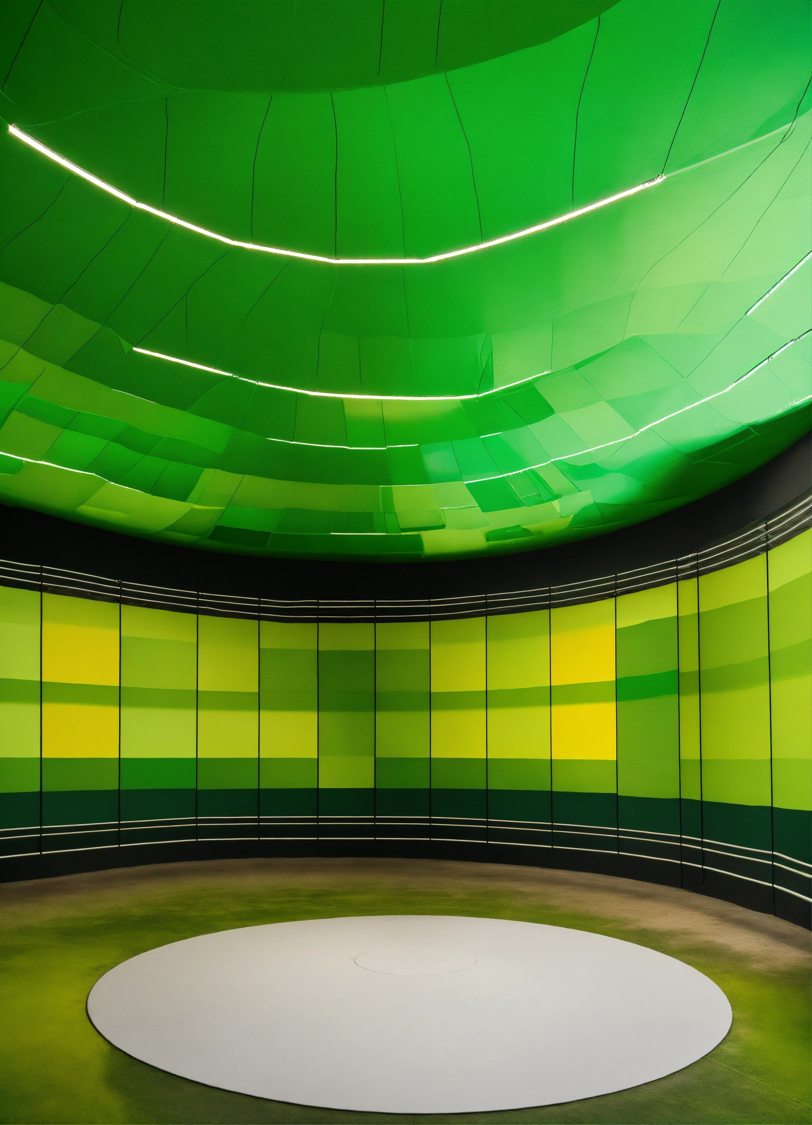 Mark rothko style of wall with anthony mccall style exhibition space within a circular space of of 32feet diameter. hyper realistic, ultra 4k, clear sharp. utilizing color palettes of john deer. this includes john deere green pantone 364 c, john deere yellow pantone 109 c, john deere black (used for text and accents)pantone black c, john deere white (used for backgrounds and text), pantone whit, john deere dark gray (occasionally used for accents)pantone cool gray 11 c. for trade show of john deer