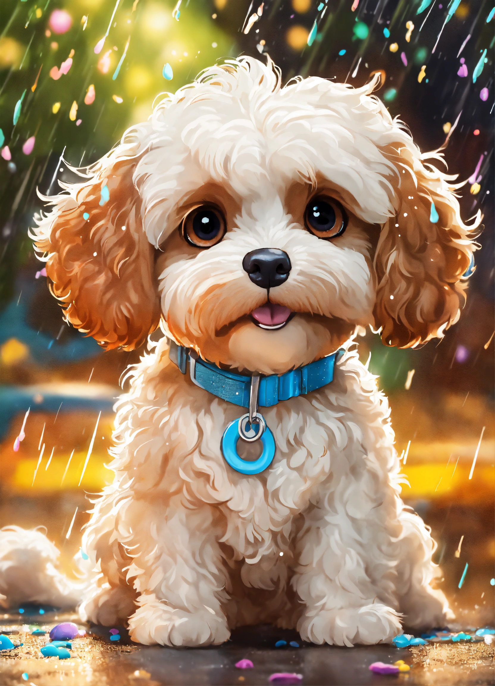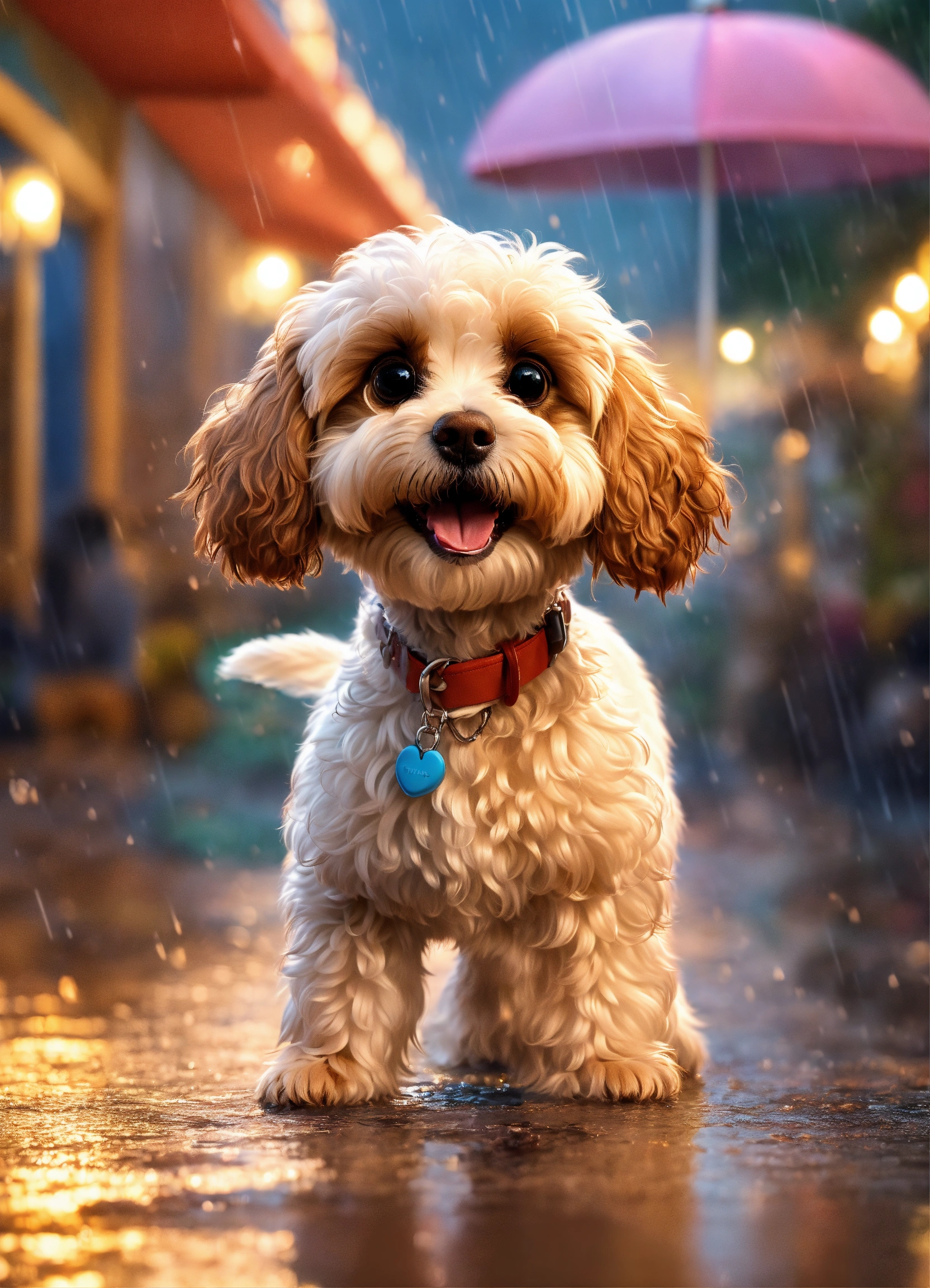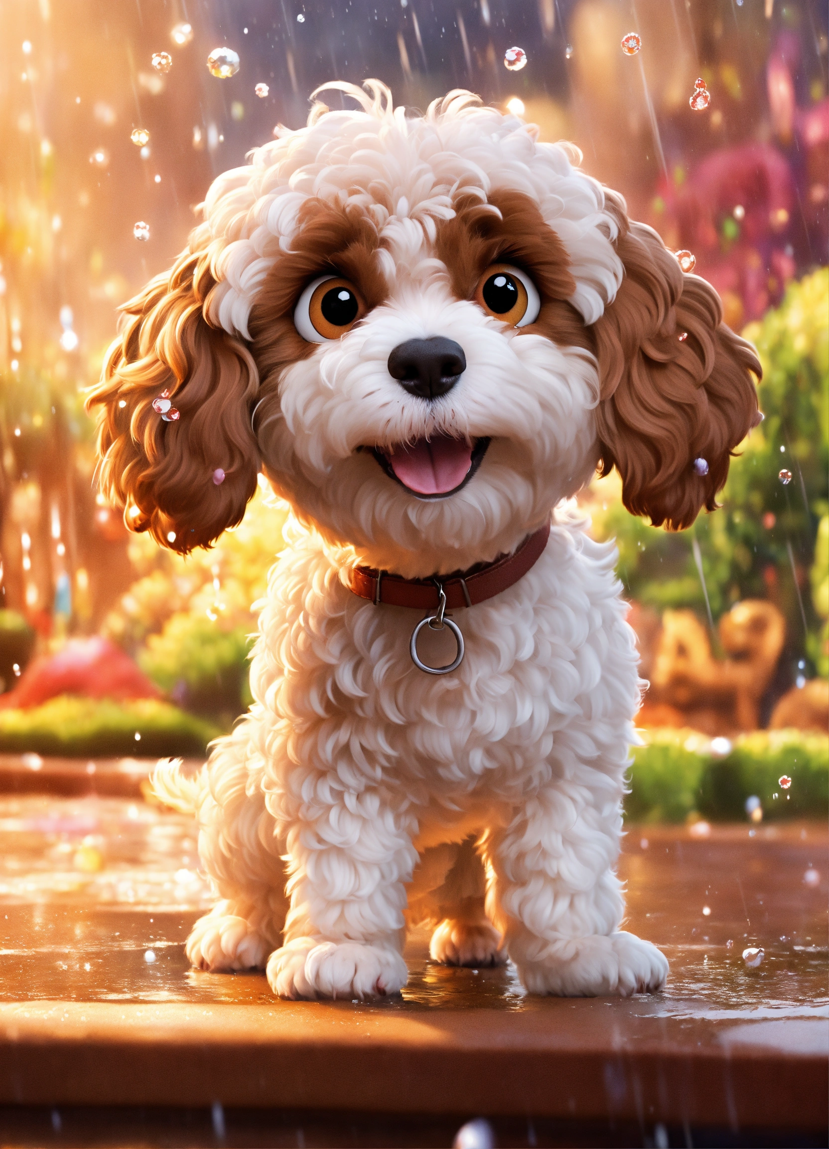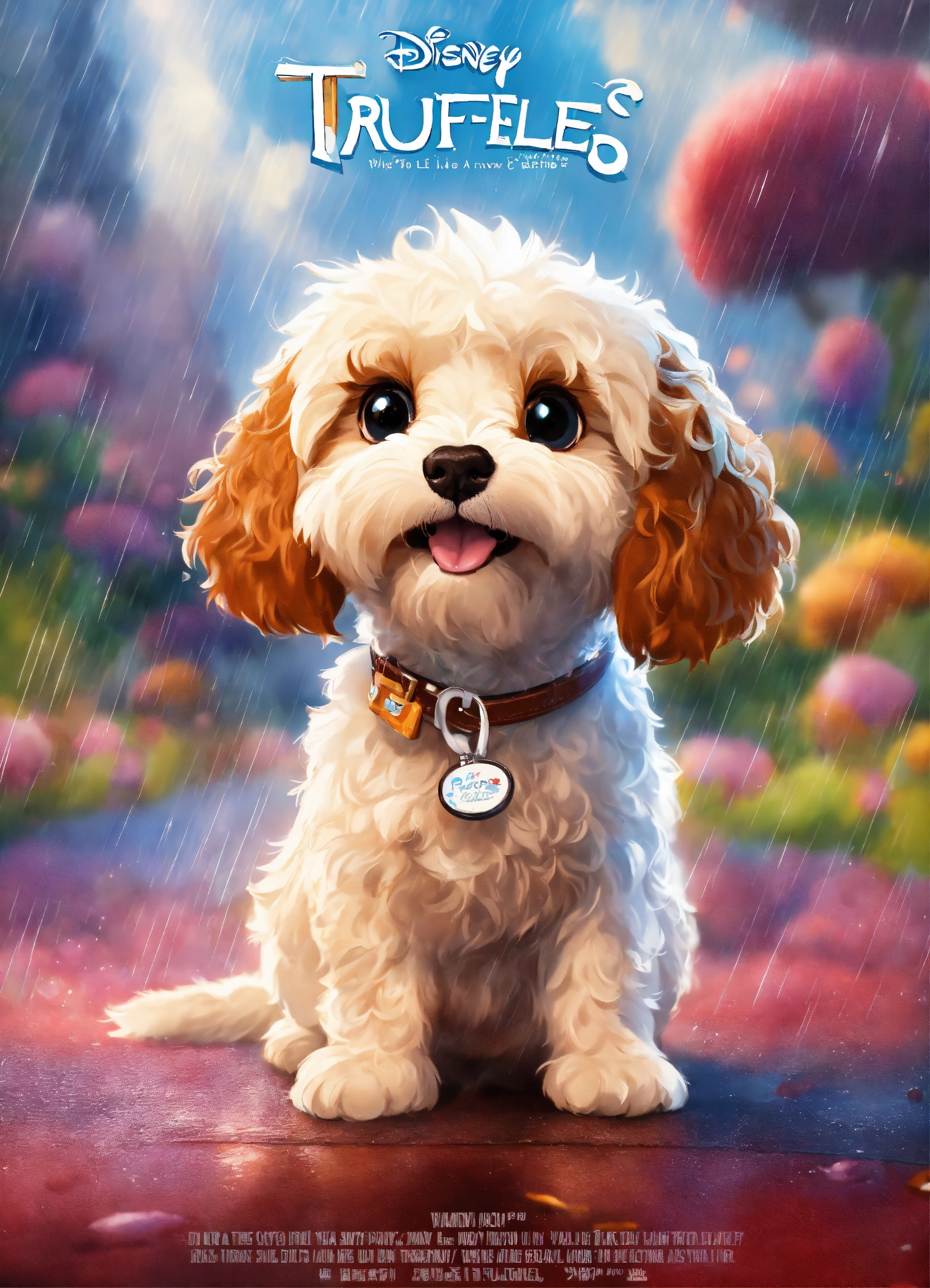 A disney pixar inspired movie poster with the title truffles a cavoodle that is white, with brown eyes, playing in the rain. the scene should be in pixar's digital art style, emphasizing the characters expressions, bright colours, and detailed characteristics of their animations.