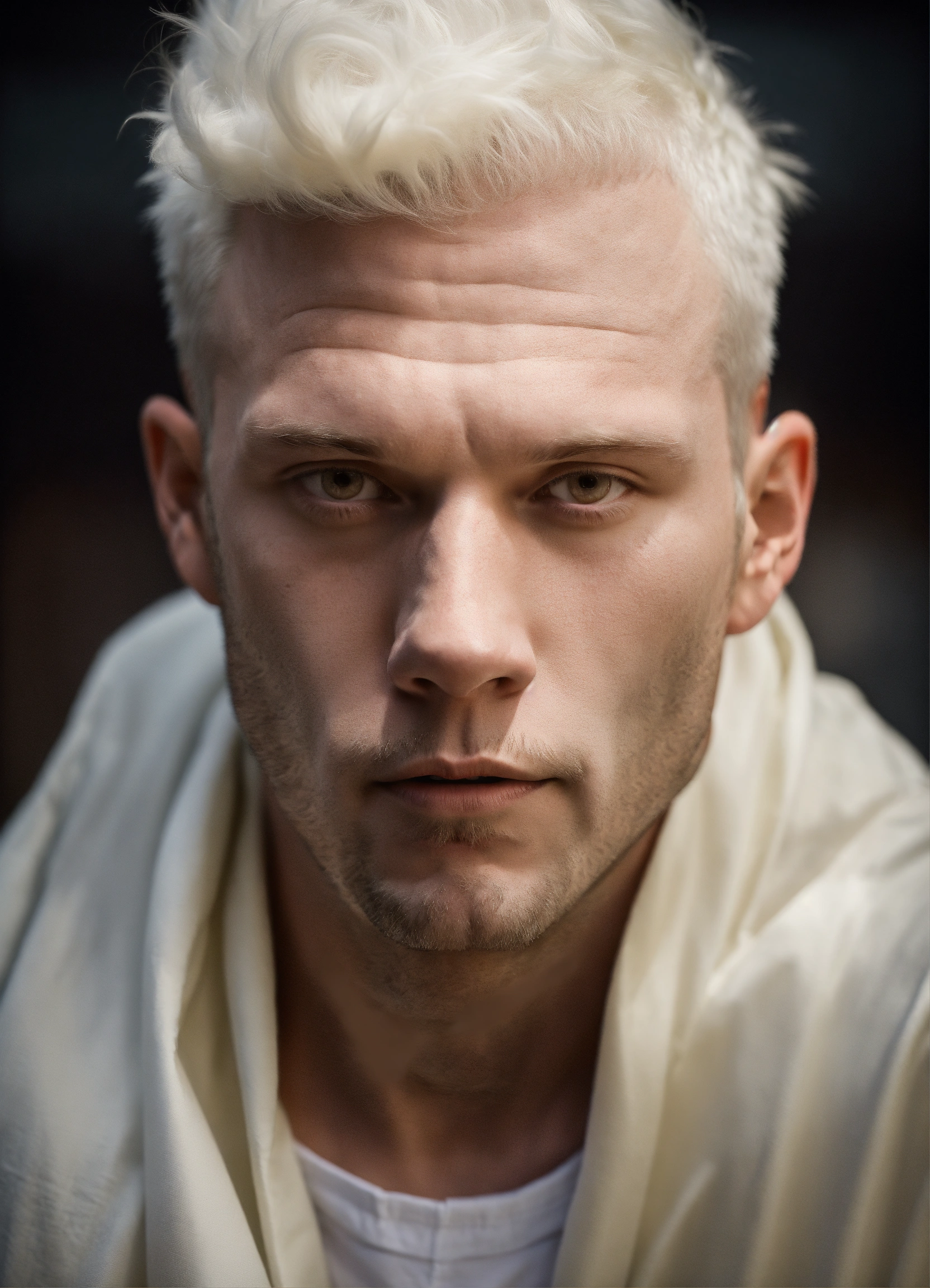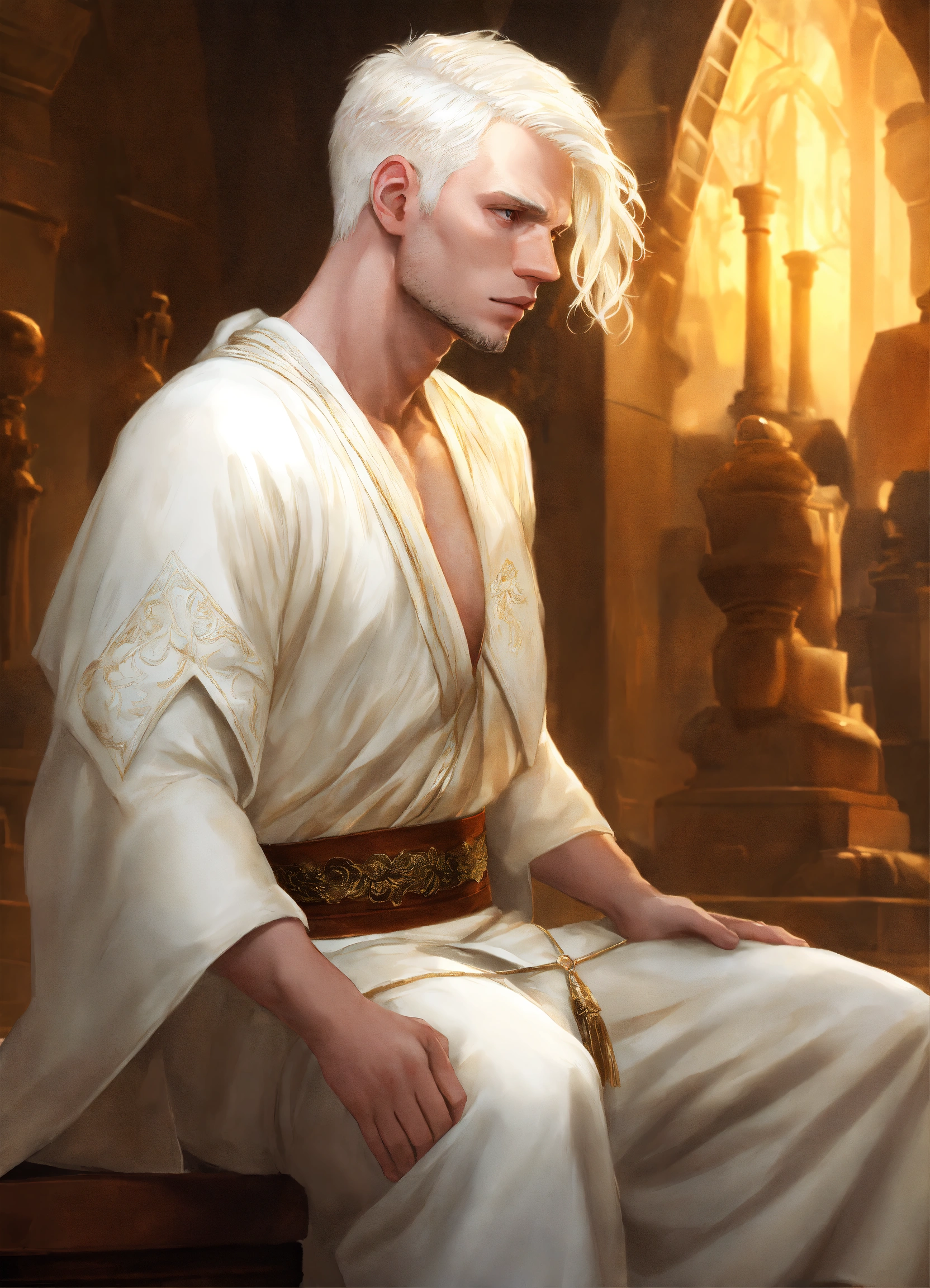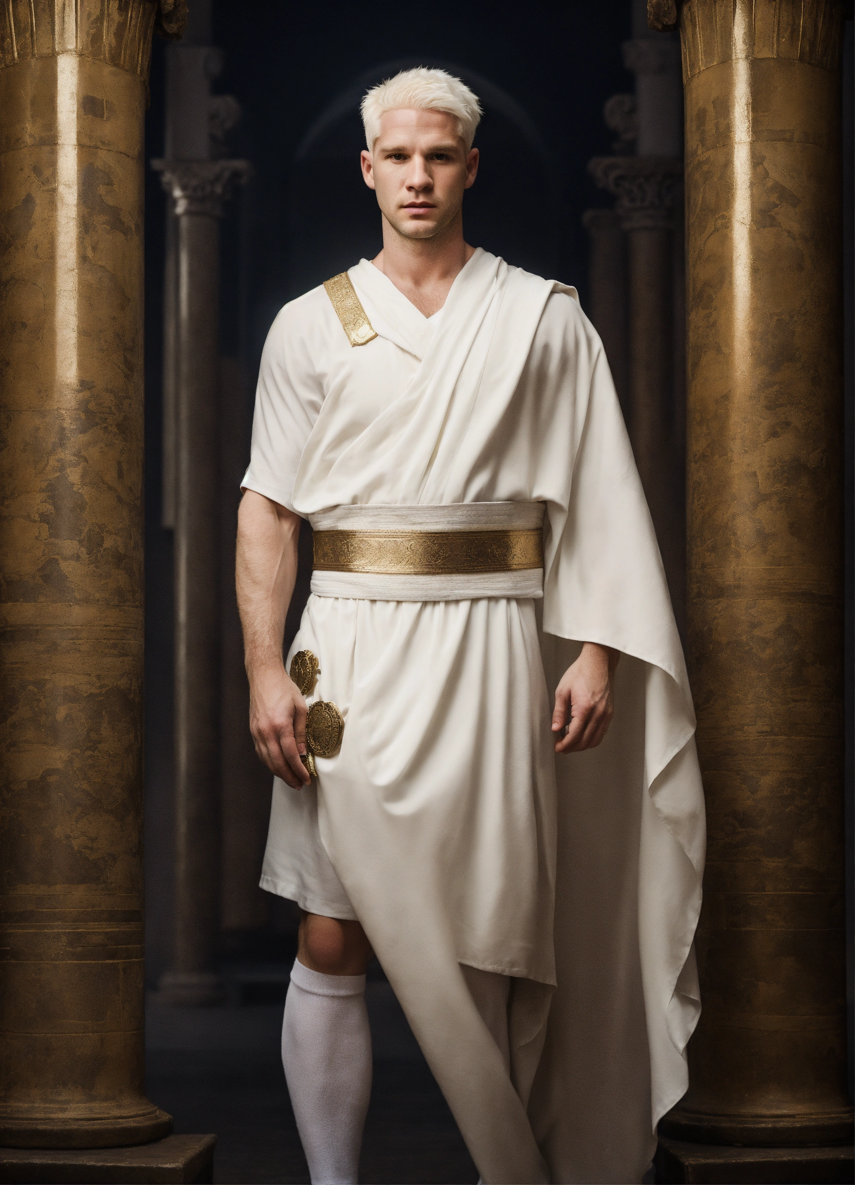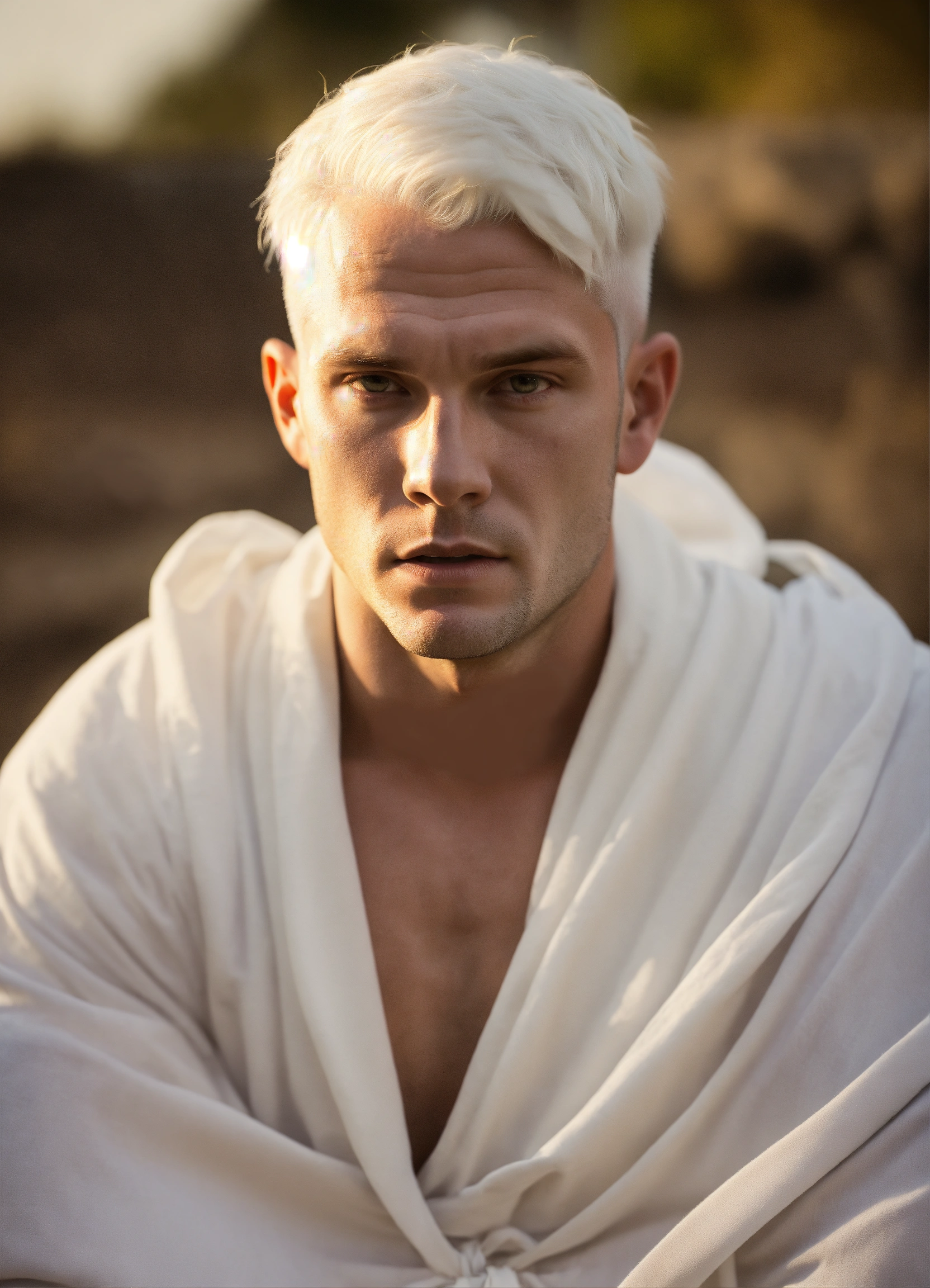 He is a gorgeous caucasian, 35-year-old albino man with short white hair and an athletic build. he is dressed in a white toga. with a menacing presence.