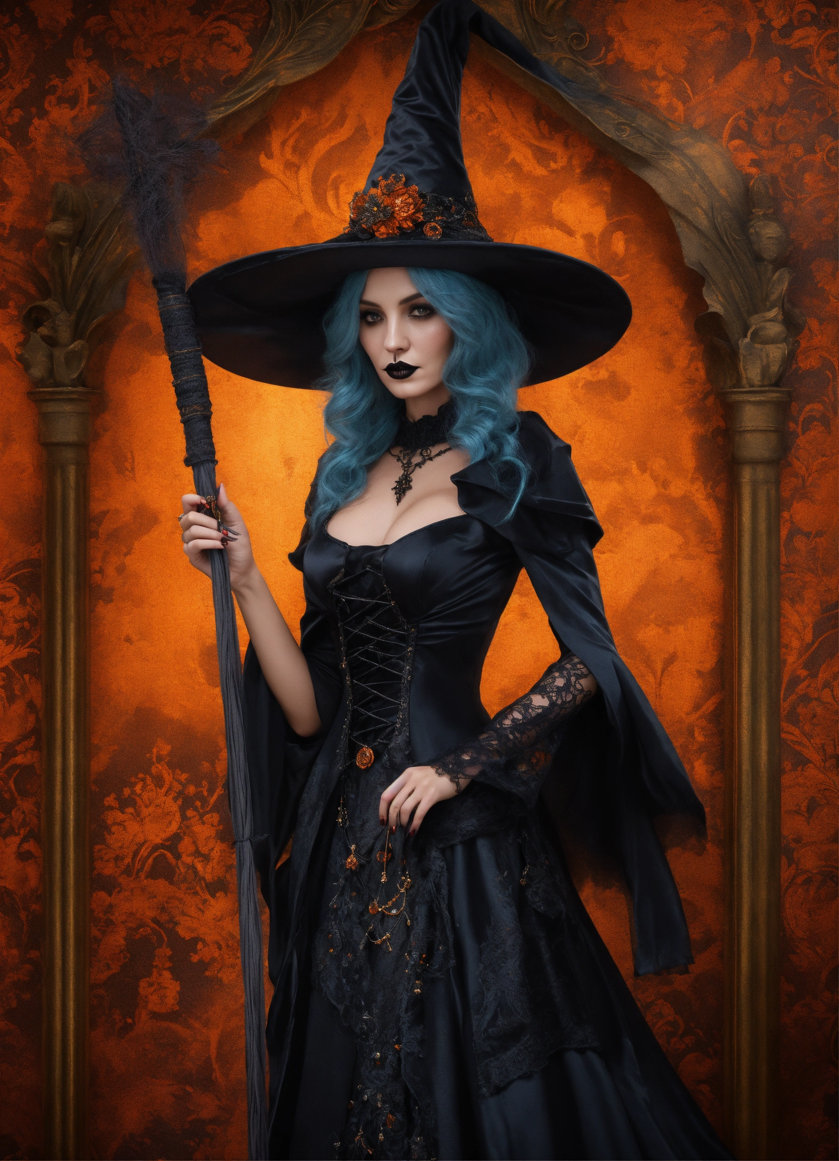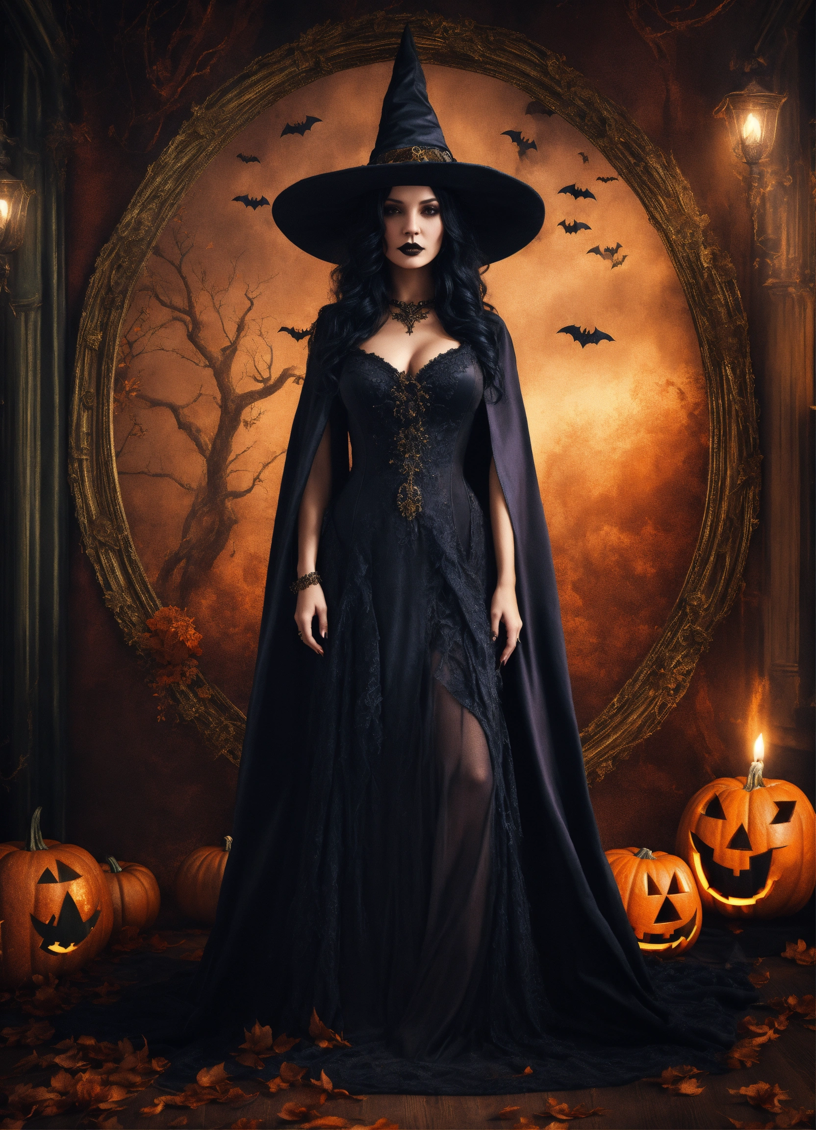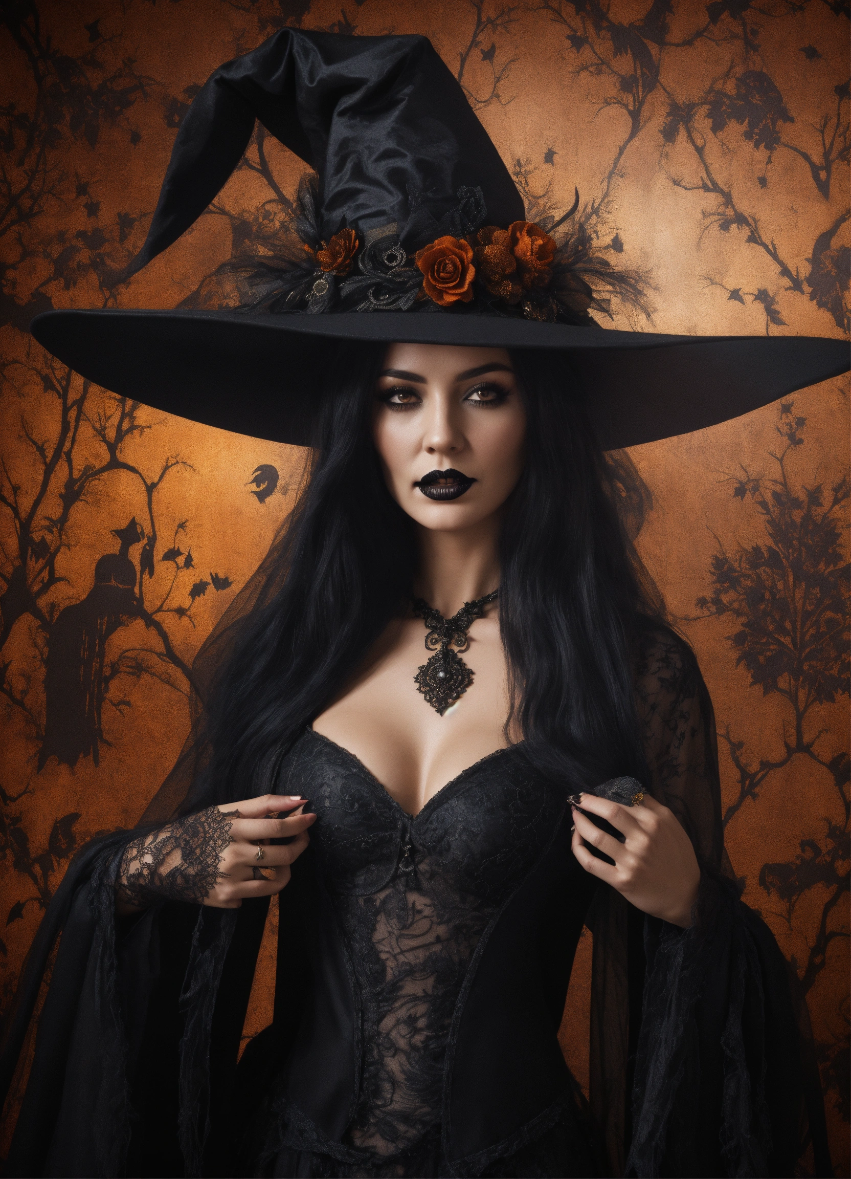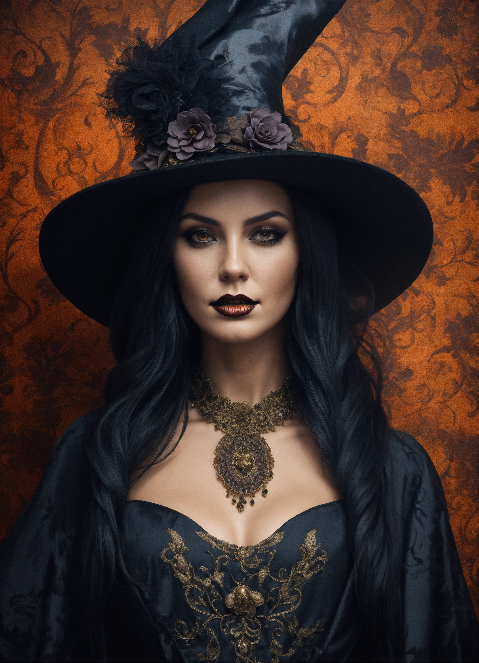 Beautiful gothic witch with flowing robes in an elegant and intricate costume with a fascinating hat, background with grungy wallpaper, 3d, 32k, photorealistic and very detailed. detailed and realistic skin texture, halloween colours and elements.