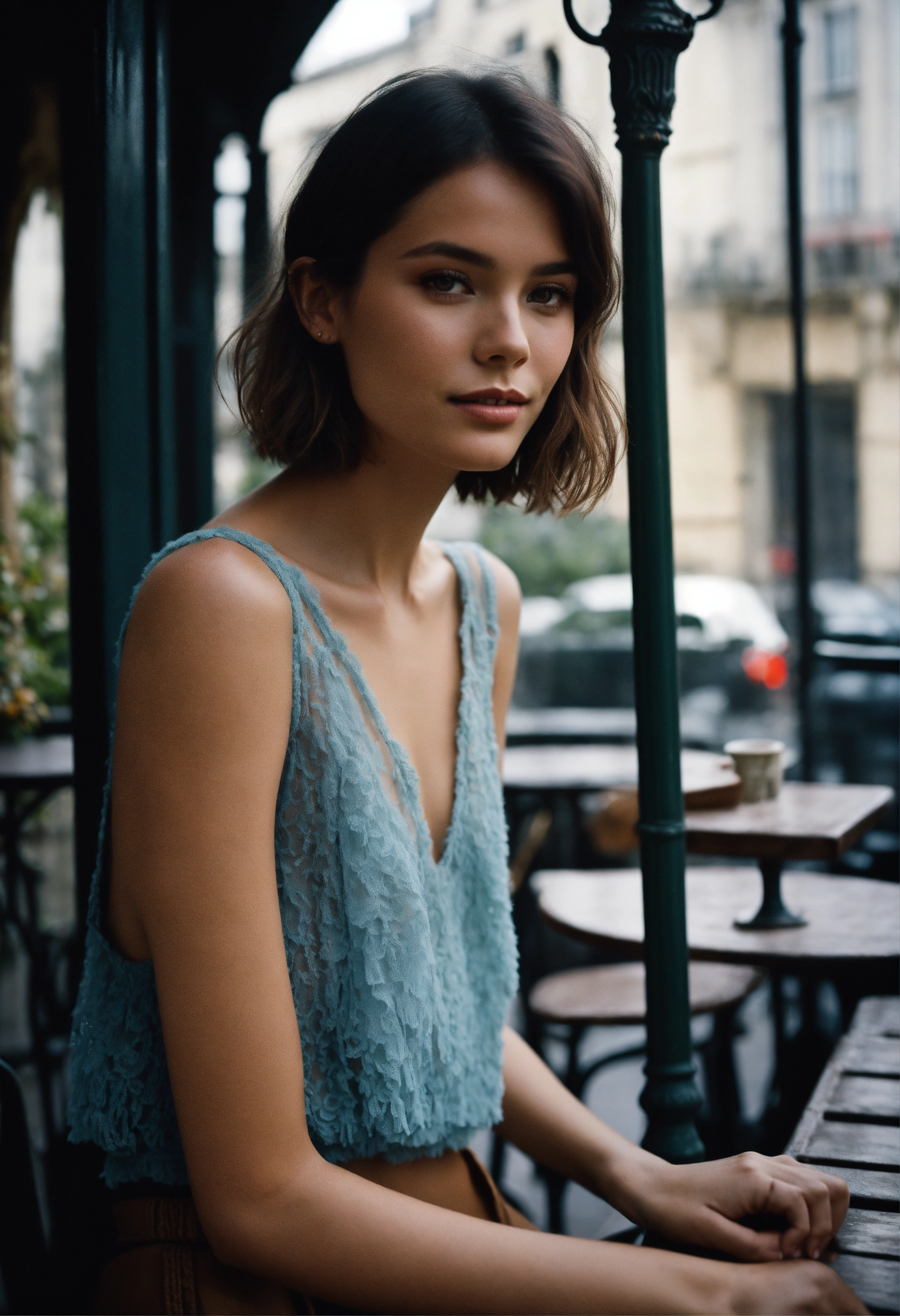 Portrait of a beautiful french fashion model with bob-cut hair, wearing shorts and a top tank, ethereal dreamy foggy, photoshoot by steve mccurry, editorial fashion magazine photoshoot, fashion poses, in front of parisian café terrace. kinfolk magazine. film grain. a soft smile