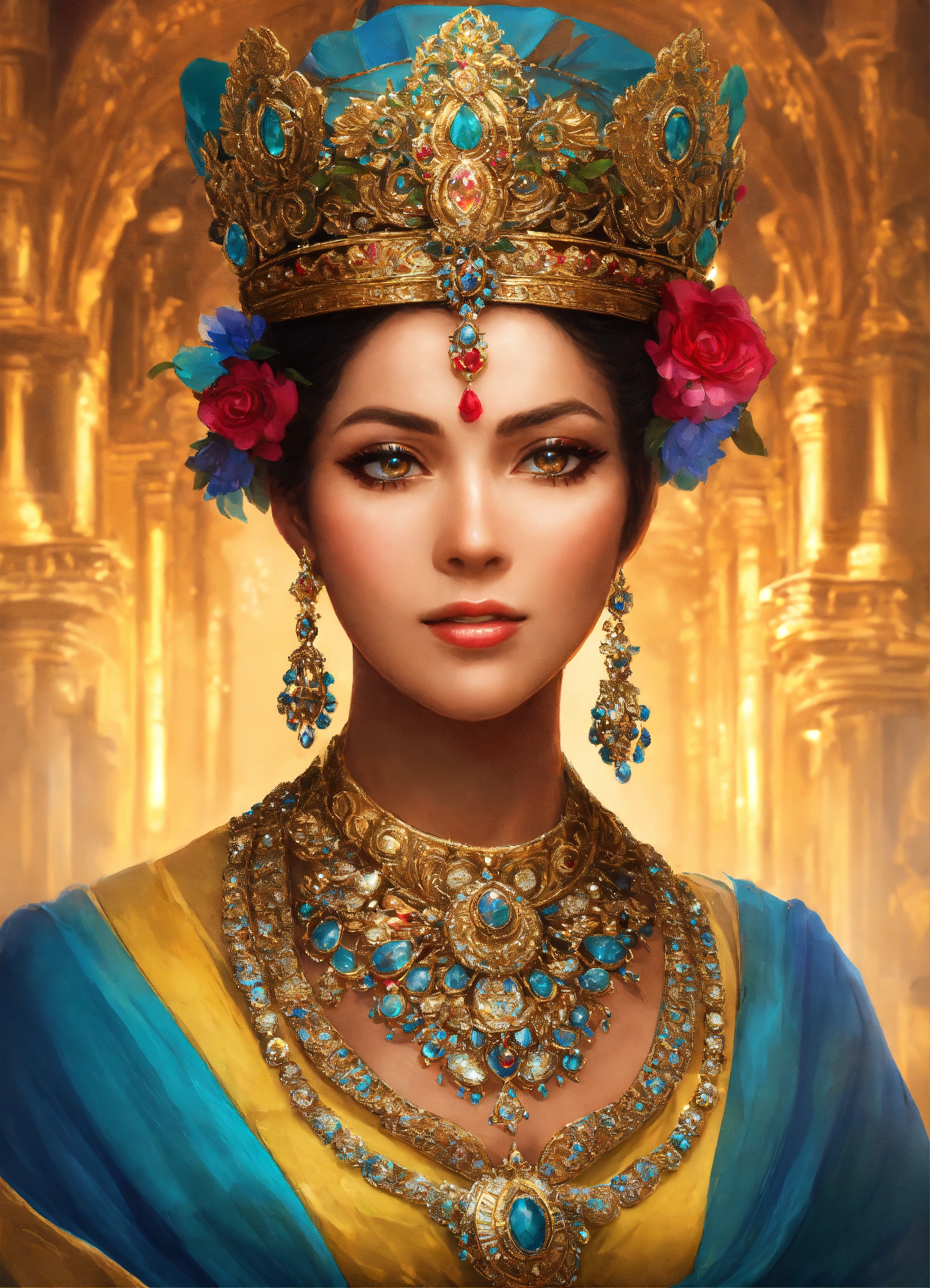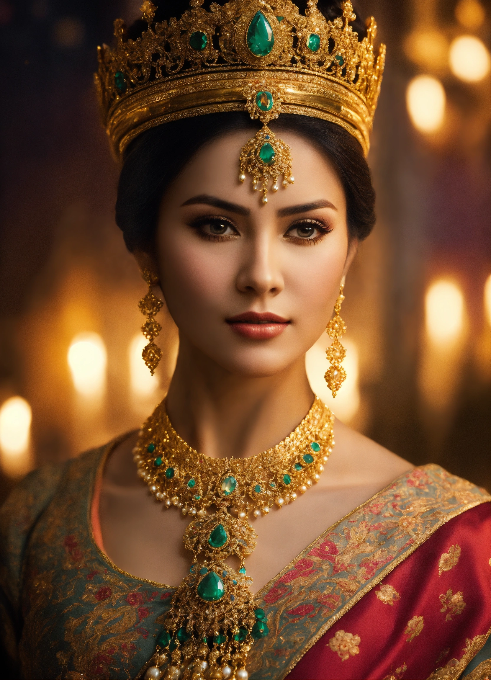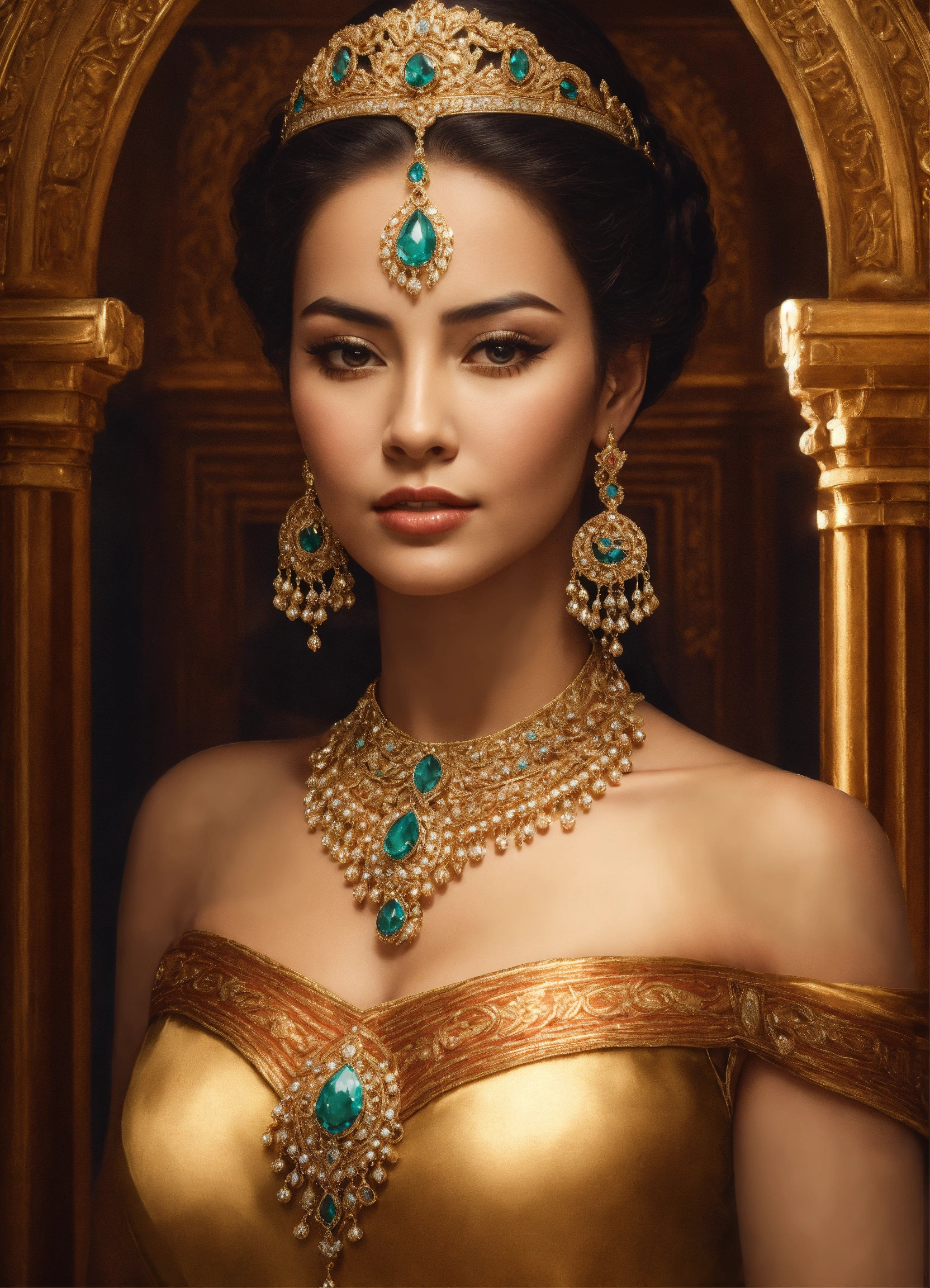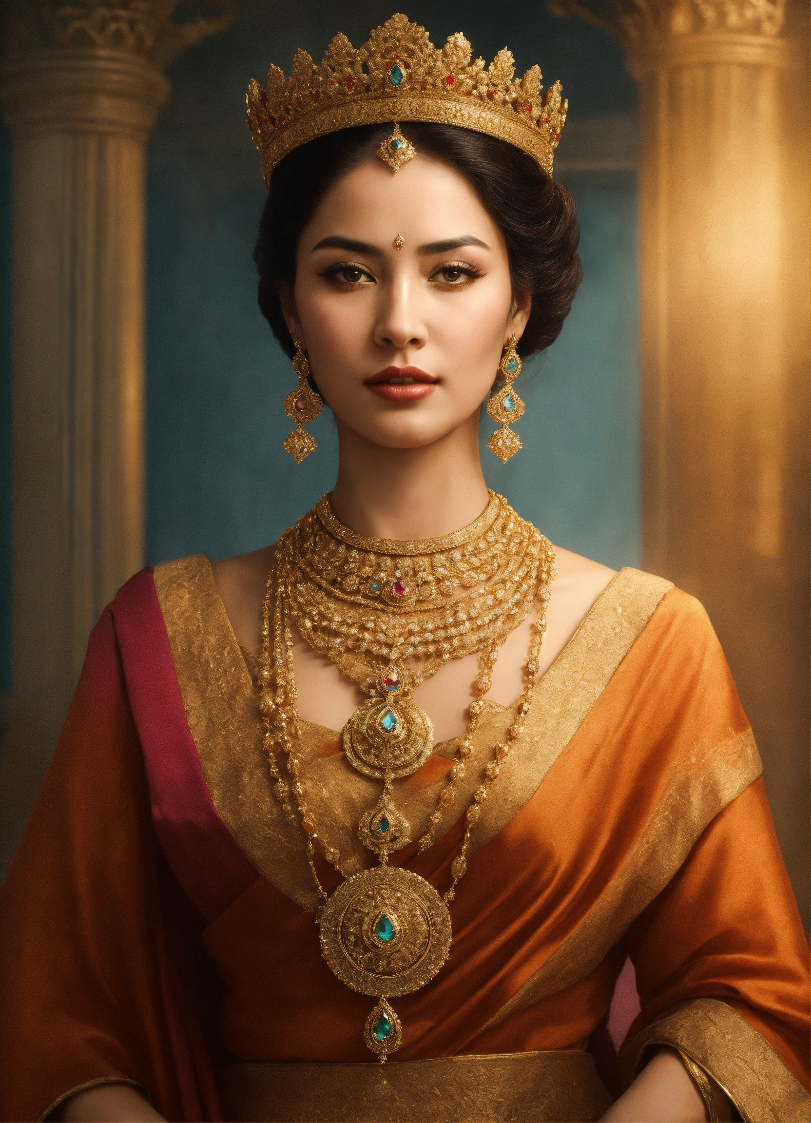 Create a description of a majestic middle-aged queen ruling her people with wisdom and dignity. portray her as possessing refined beauty, with a regal posture and a noble countenance. describe her magnificent features, including deep, confident eyes, and graceful facial contours that embody her authority and strength. emphasize the elegant attire in which she presents herself before her people, adorned with jewelry that reflects her status and grandeur. highlight her magnanimity and benevolence by describing her noble deeds and care for the welfare of her kingdom.