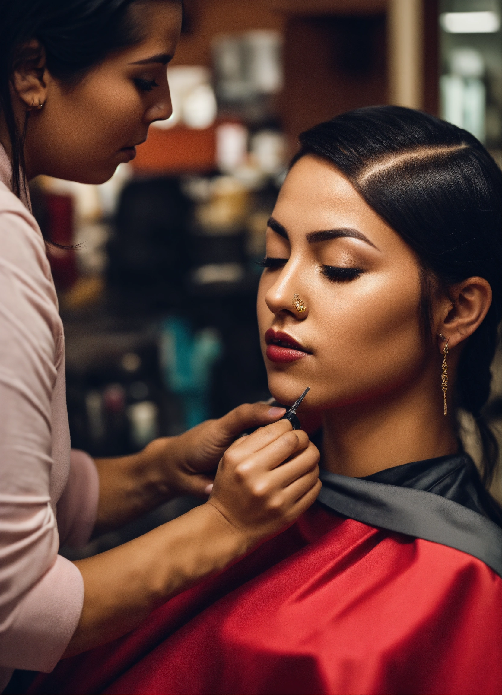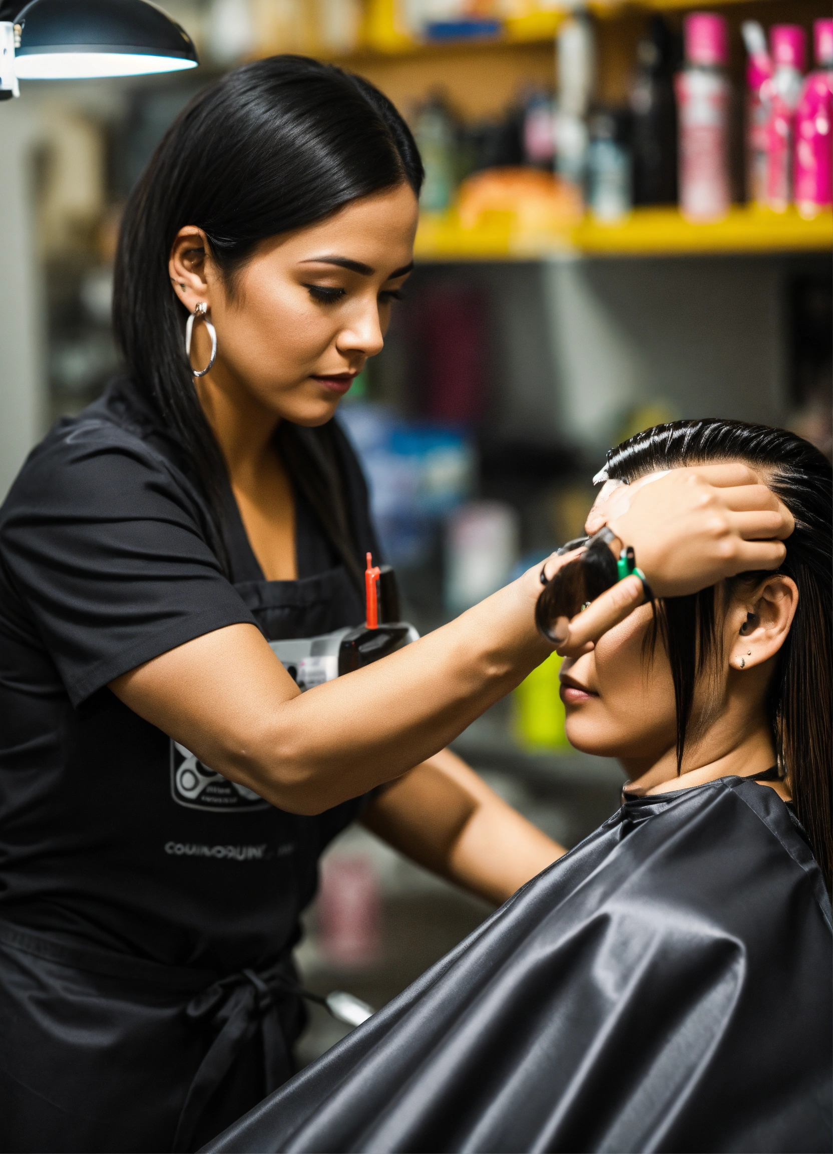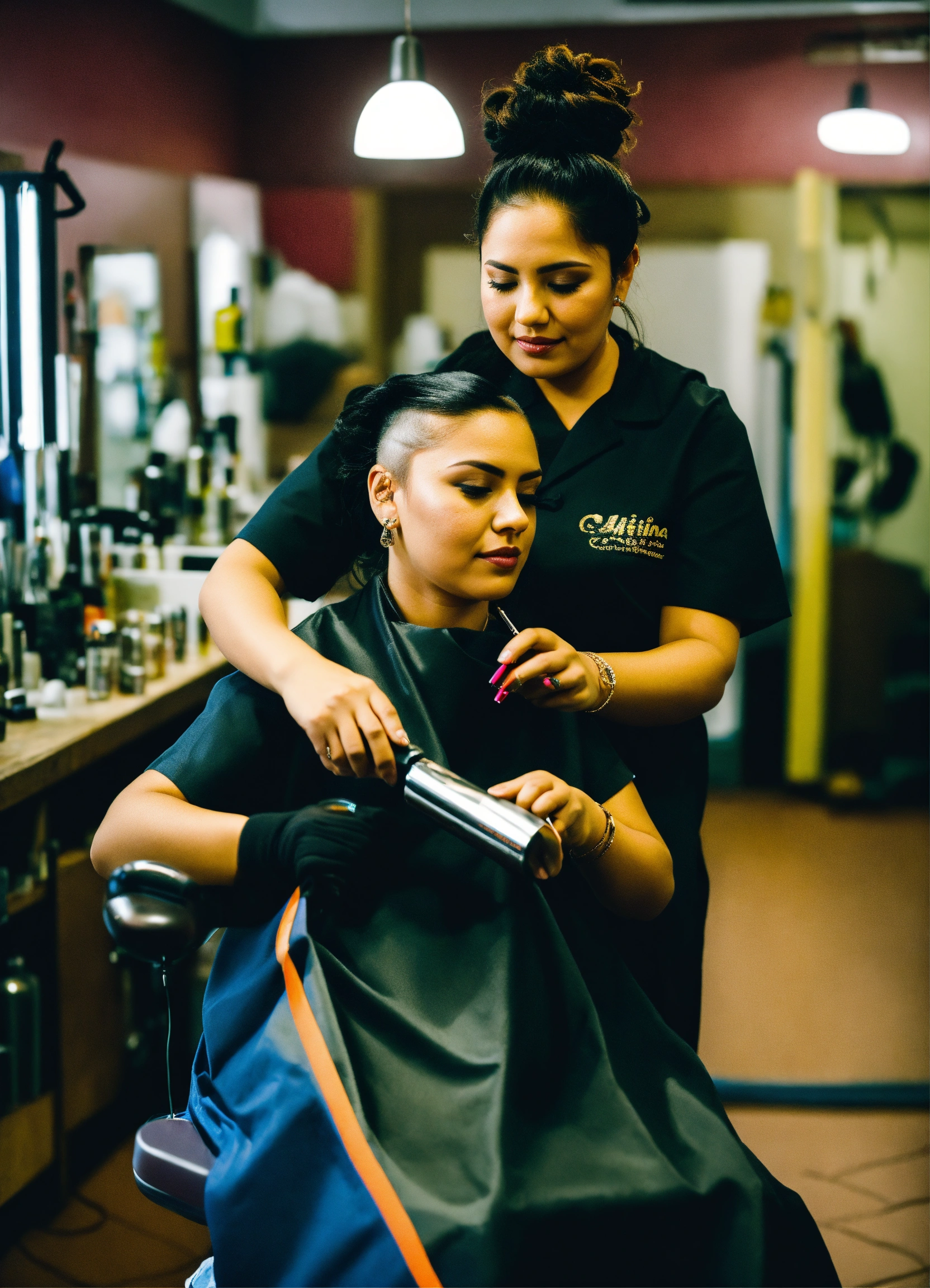 Una mujer estilo chola cortando cabello a un cliente con la maquina de cortar cabello en la mano