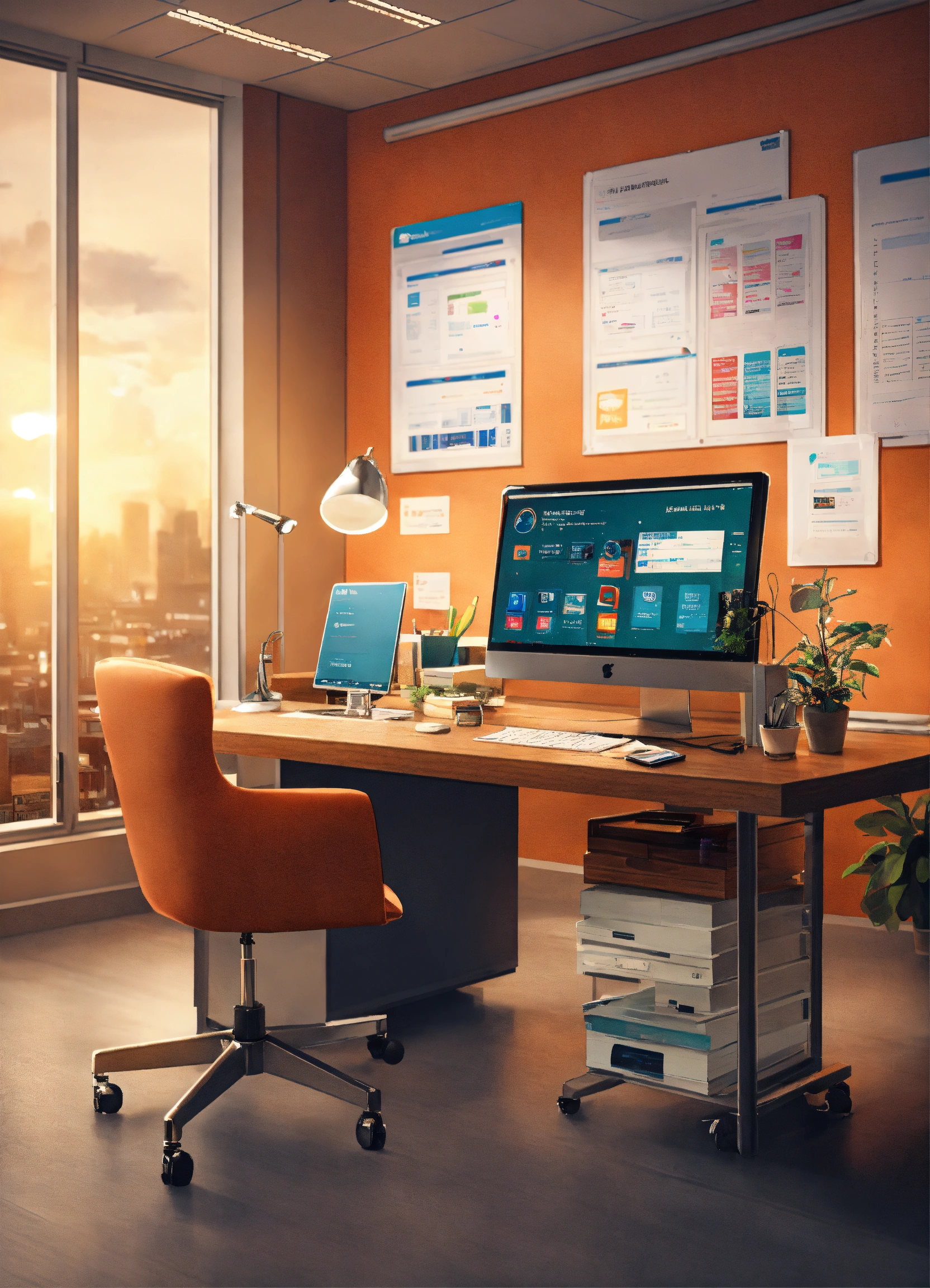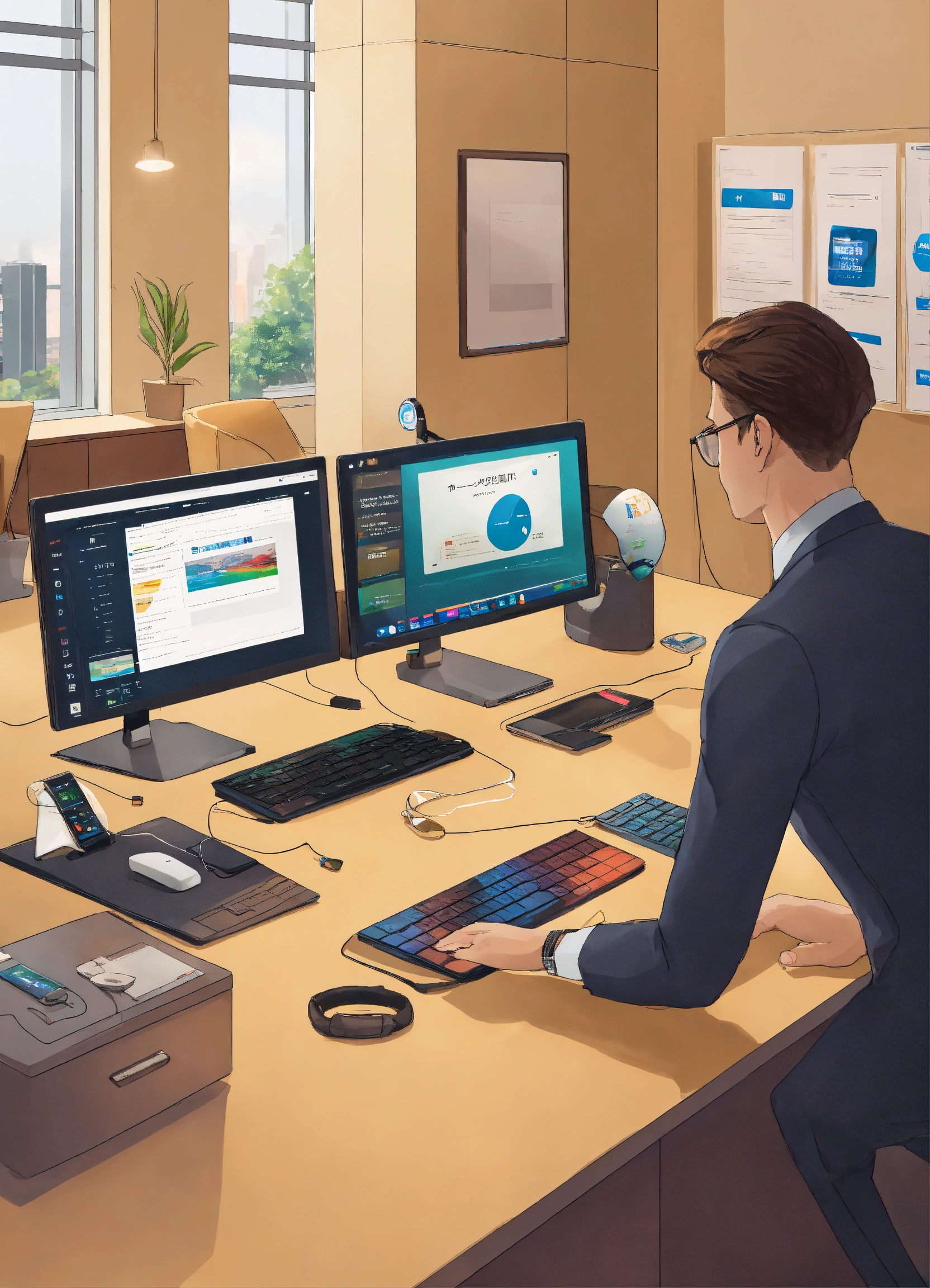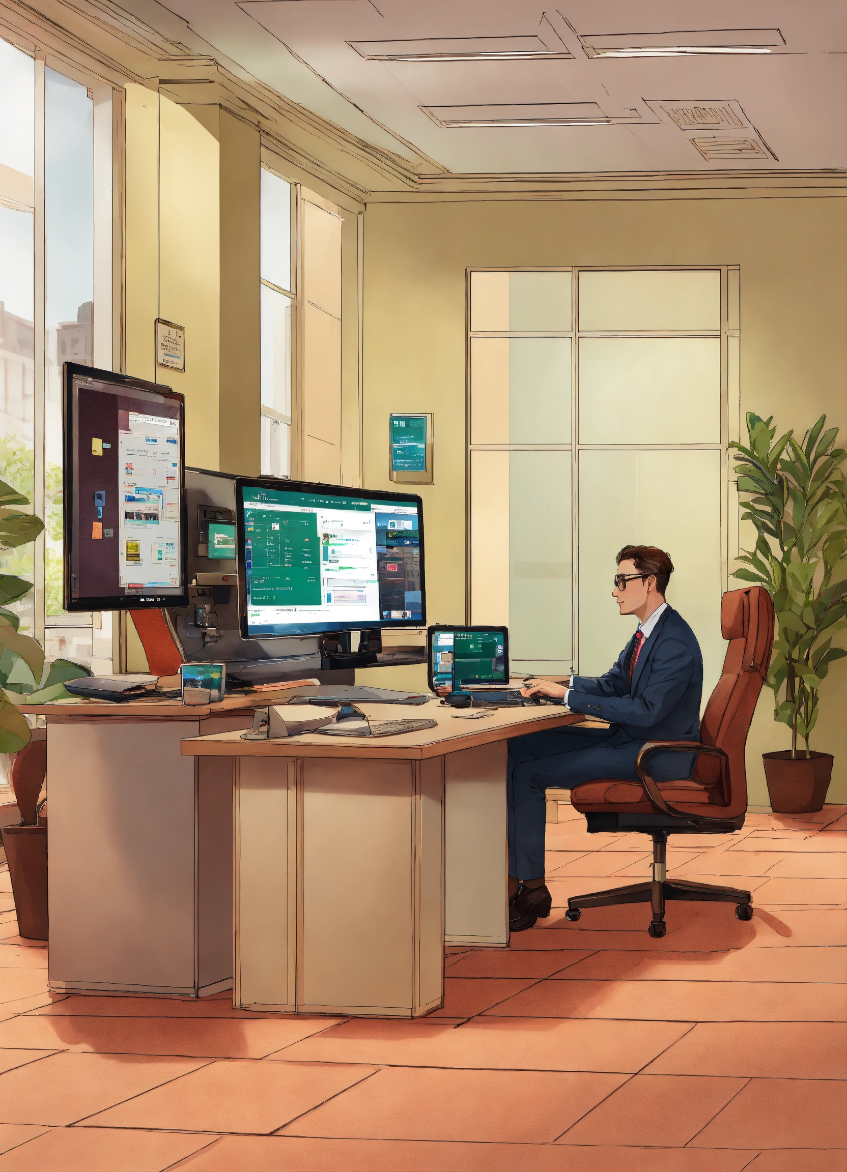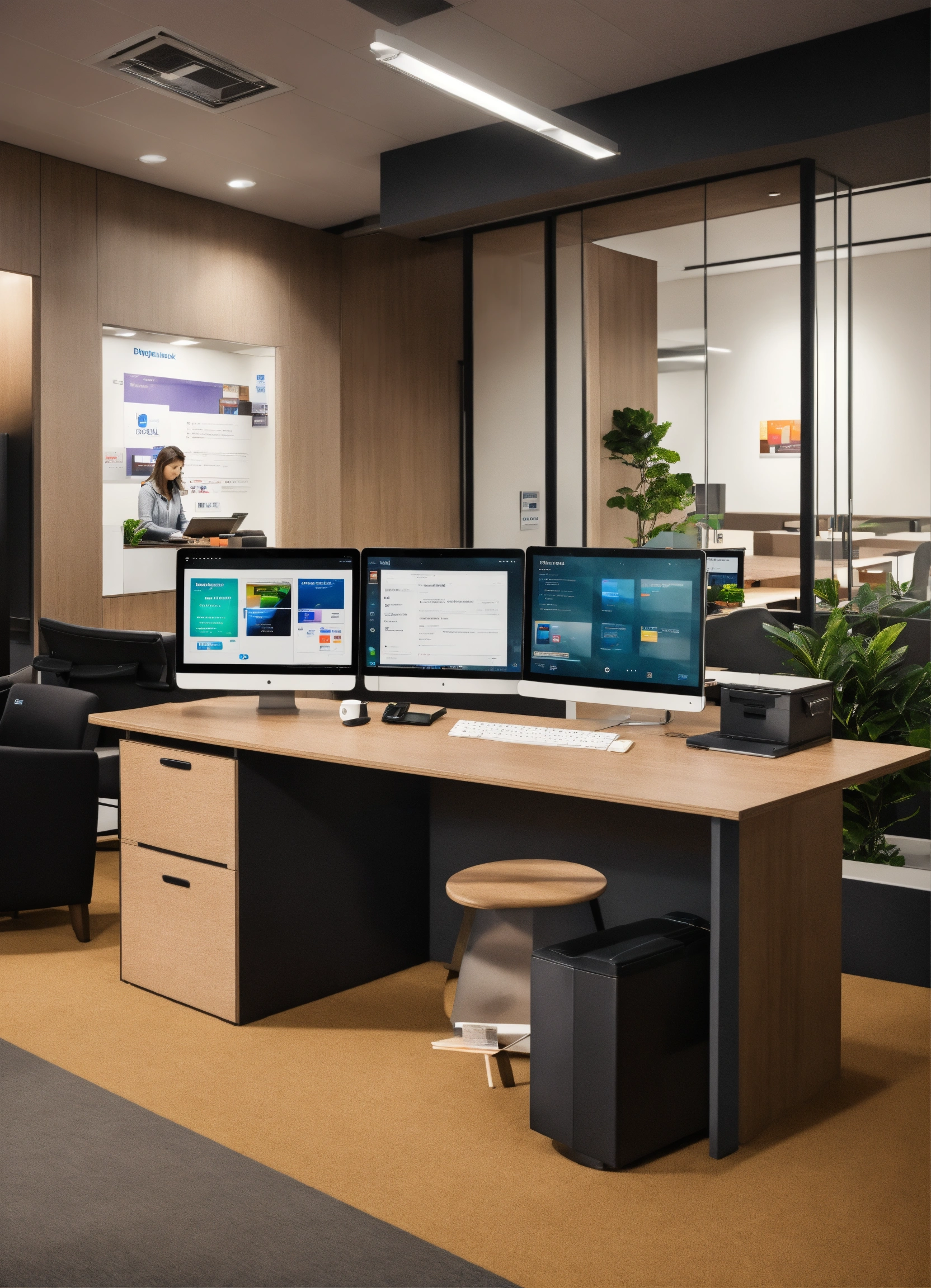Office of a bank where a person is demonstrating another the use of digital channels, the office has a desk, a computer, a tablet and a cell phone