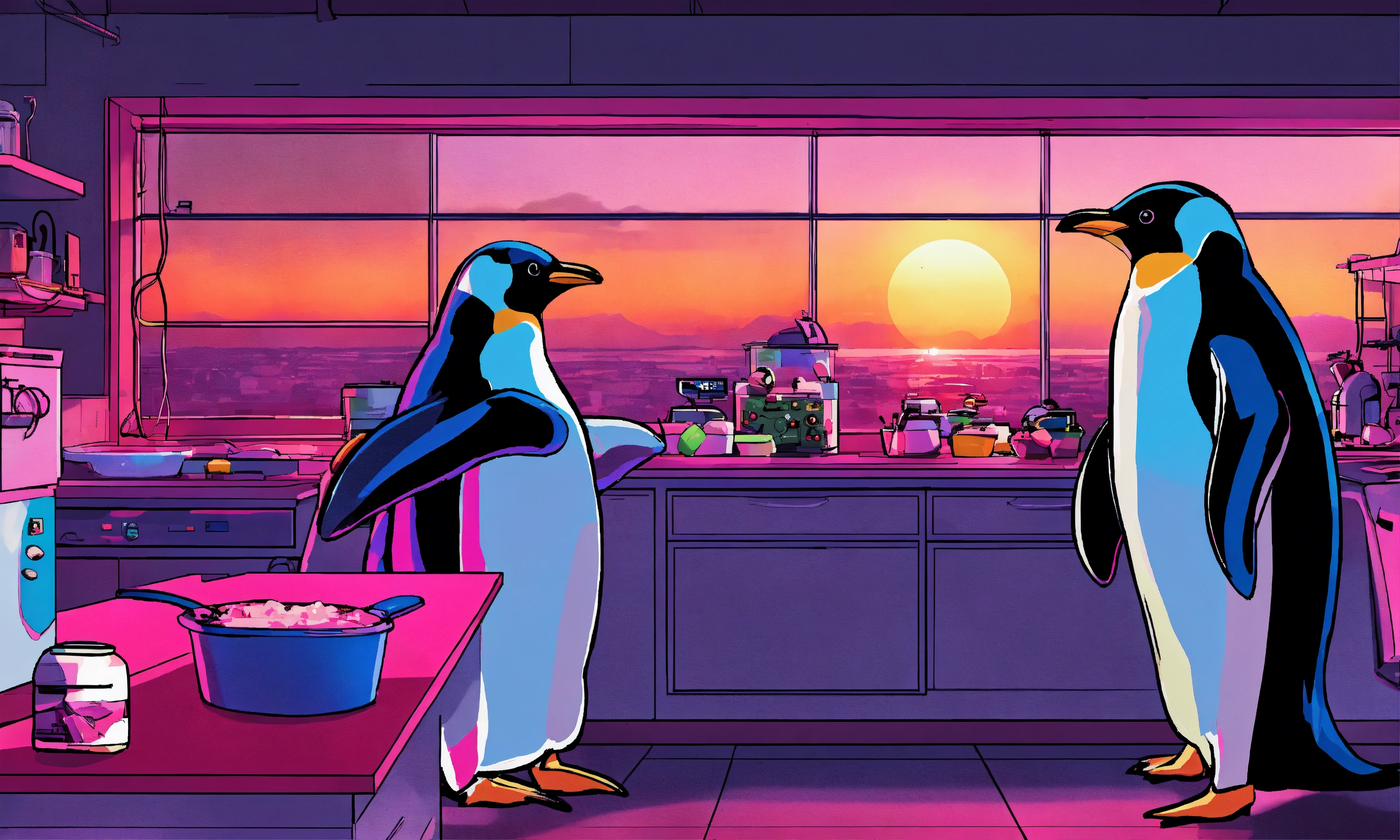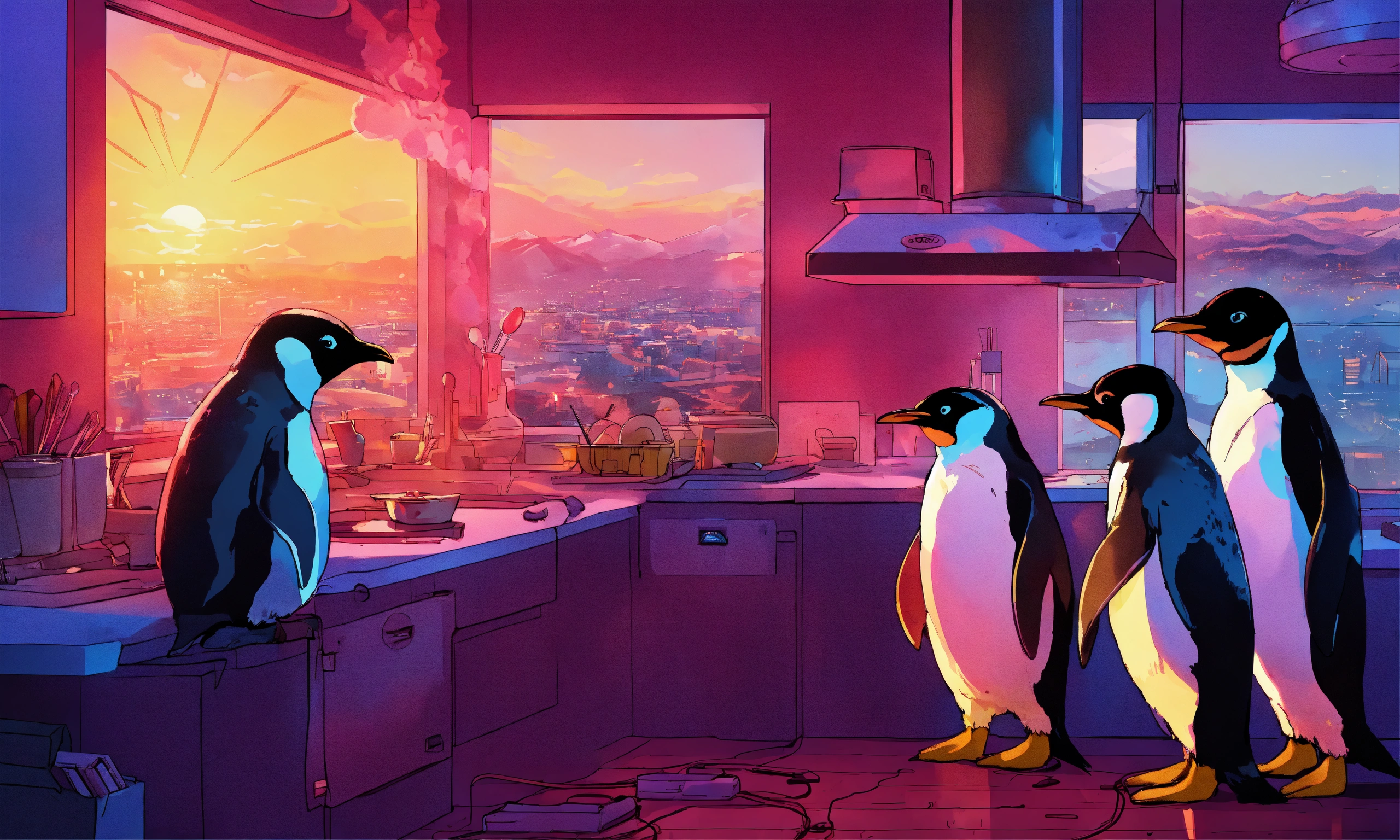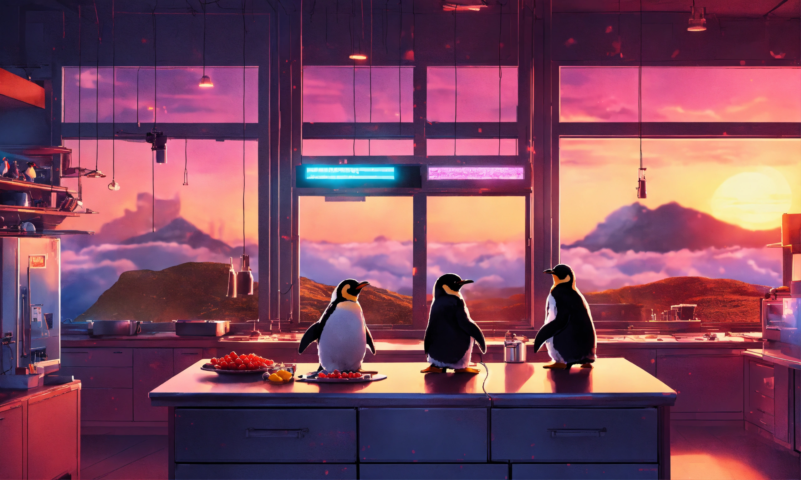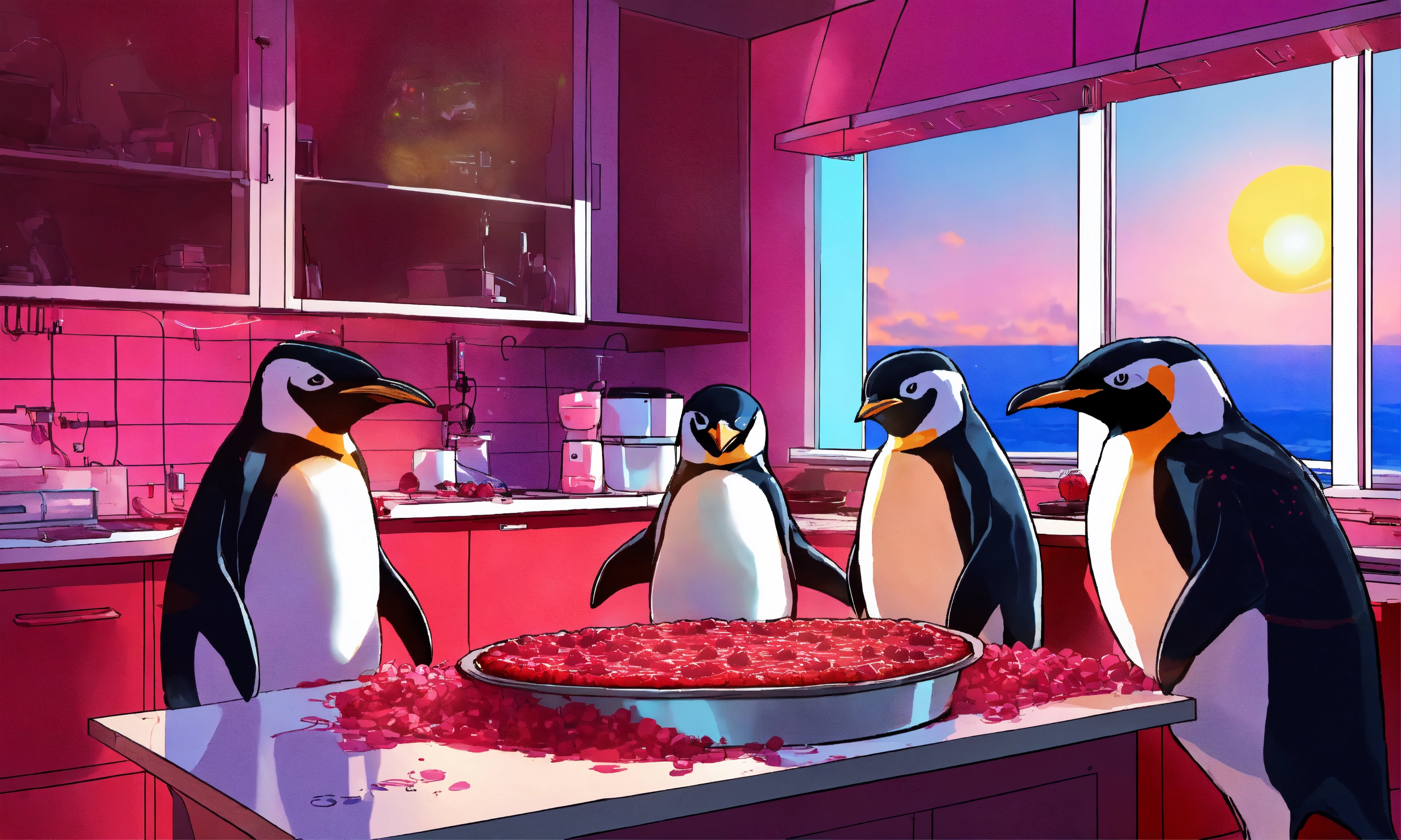 Three cool-looking penguins in a high-tech kitchen lab cooking up big fresh raspberry pies, the kitchen is a mess with circuit boards, computer screens with schematics and the linux tux logo on them, all over the kitchen, sunrise peeking over the horizon through the kitchen window, in the style of a movie poster, rule of thirds.