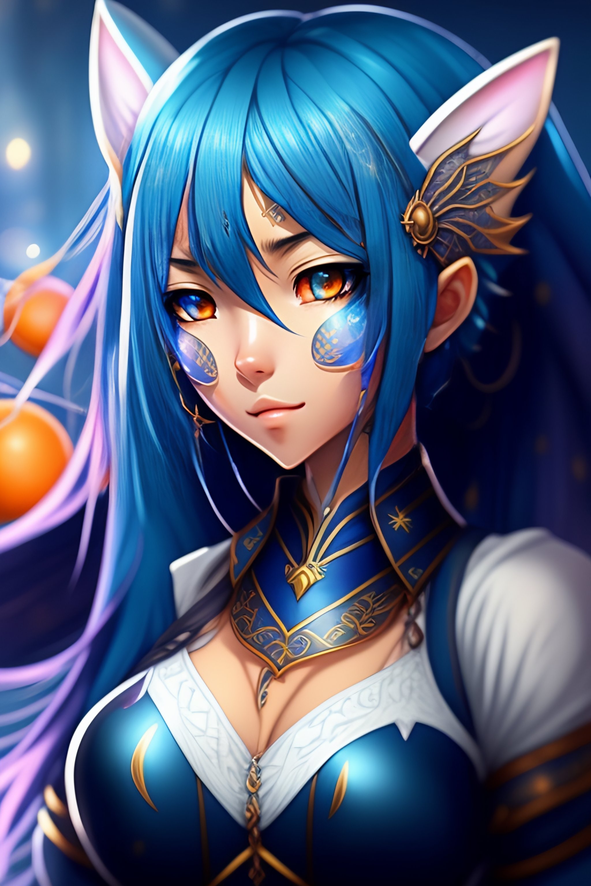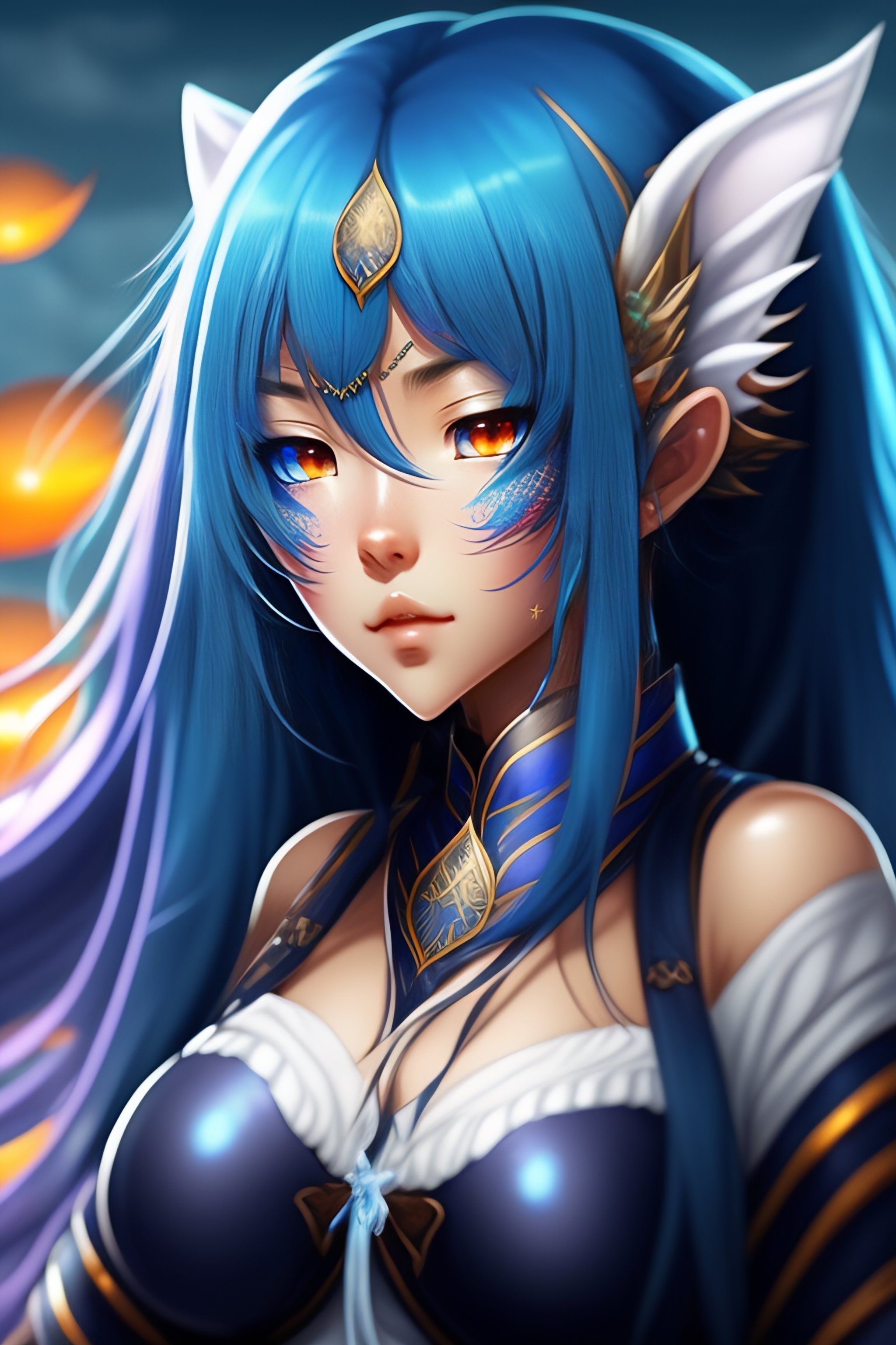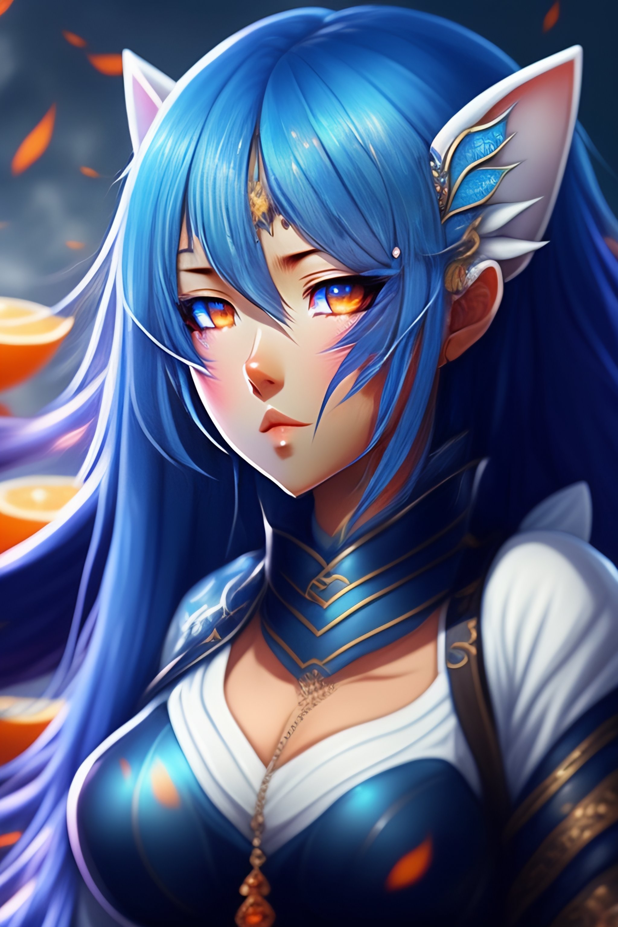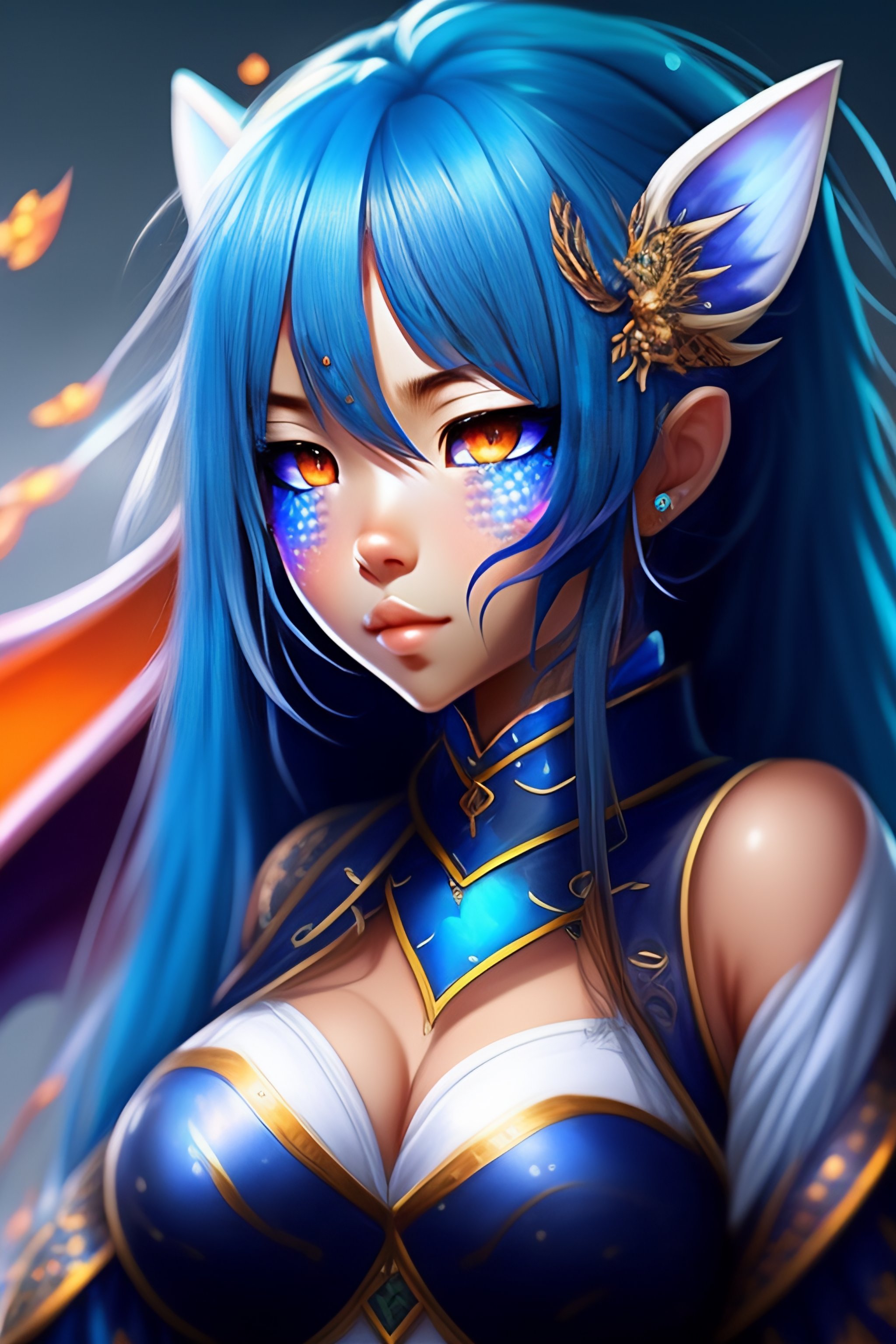 Anime, dragon girl, dark skin, blue hair, blue dragon scales, fin ears, dragon wings, braided hair, orange skin, cat eyes