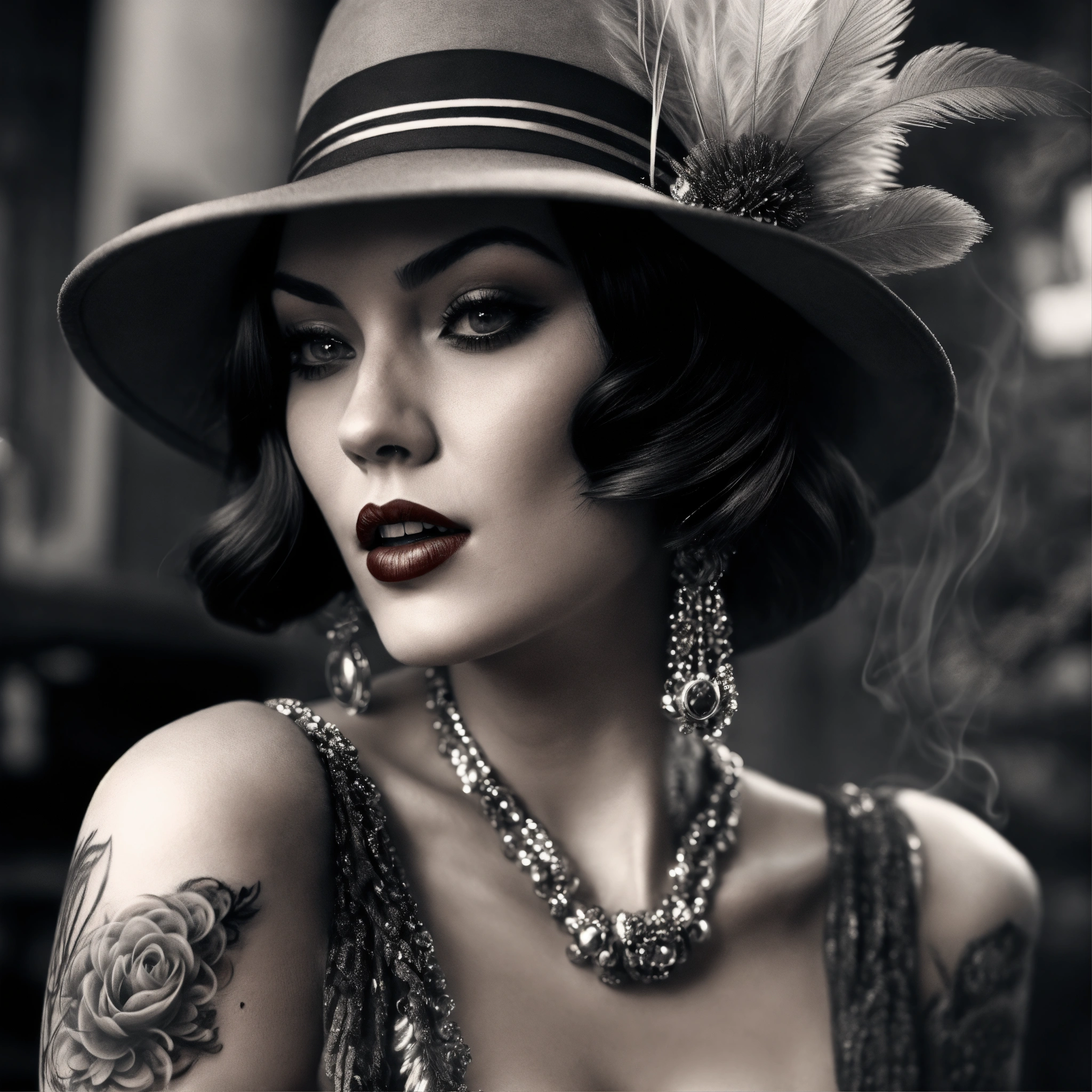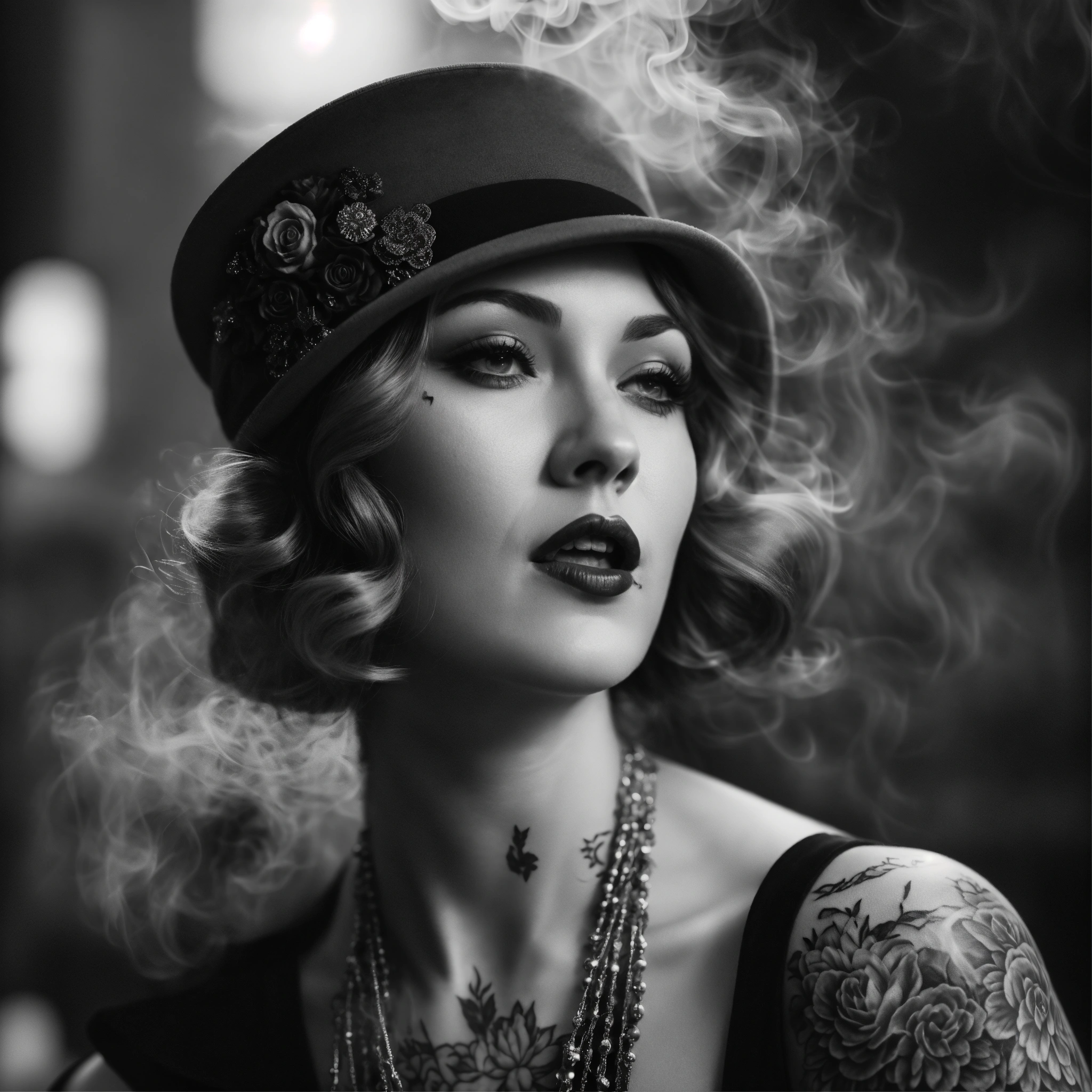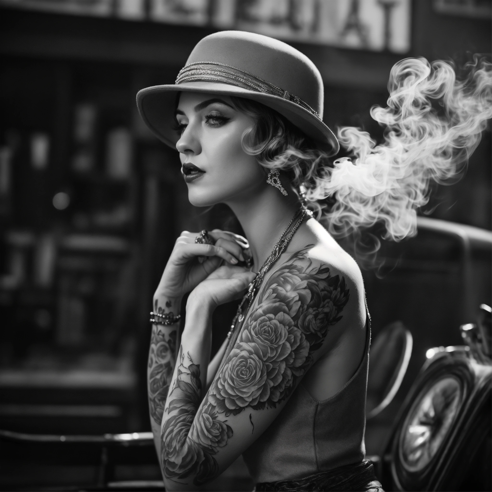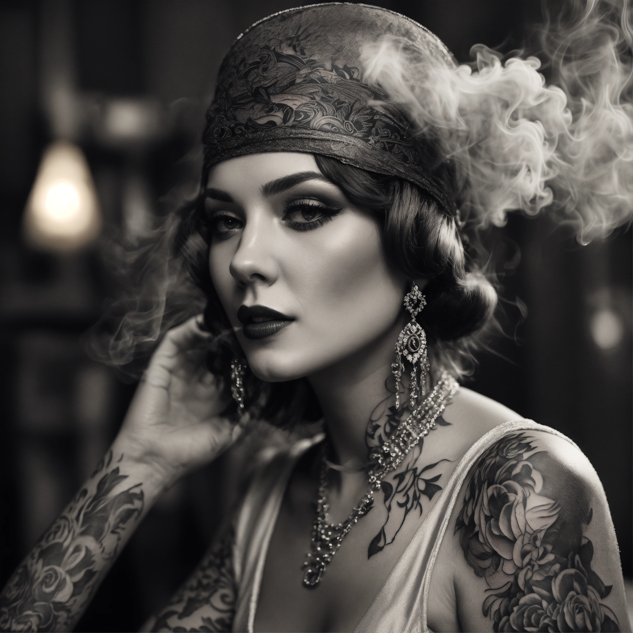 Photorealistic, blackandwhite, grey hues, 20s style, roaring twenties woman, cool attiute, smoke around, tattooed, 8k
