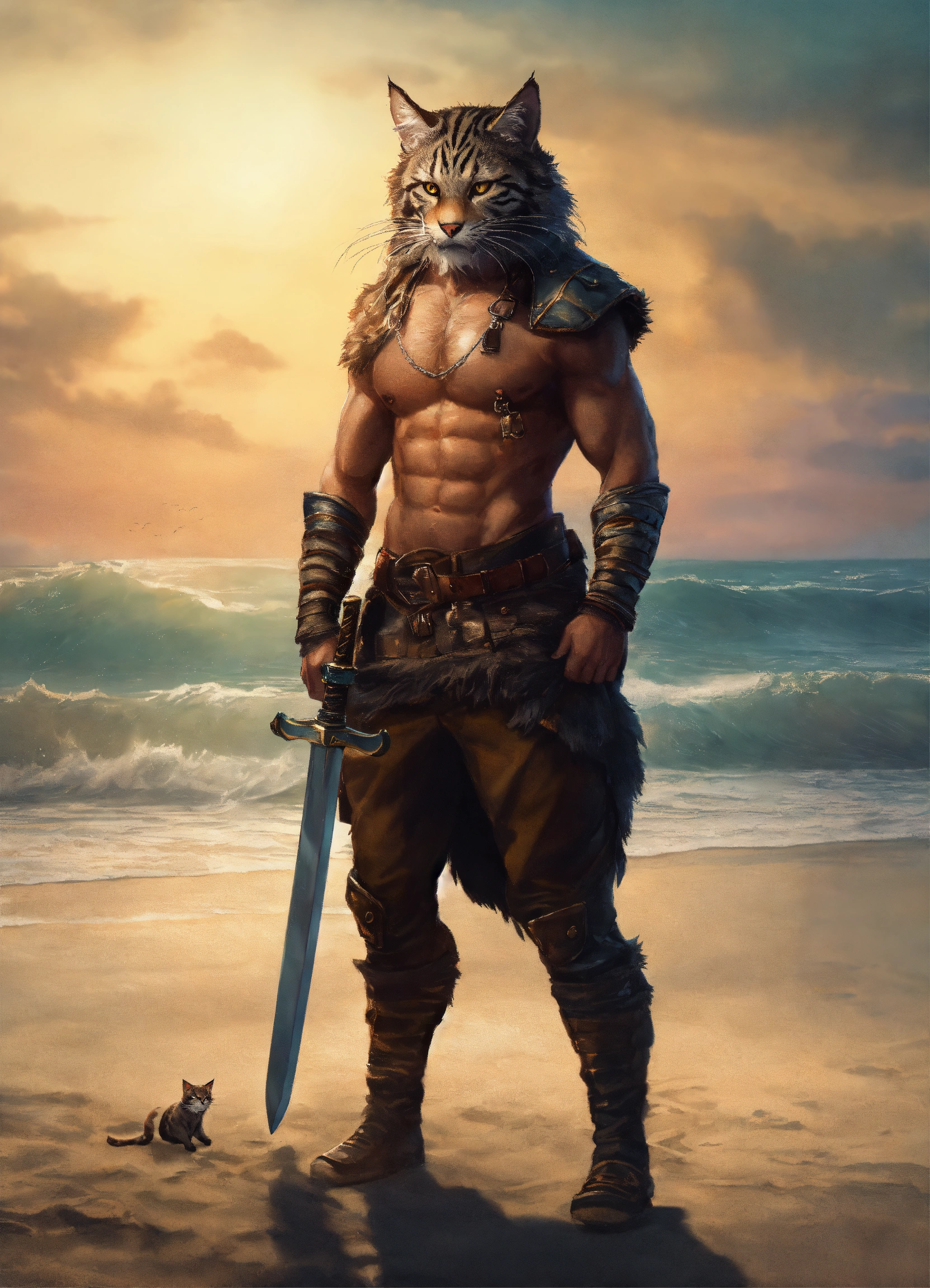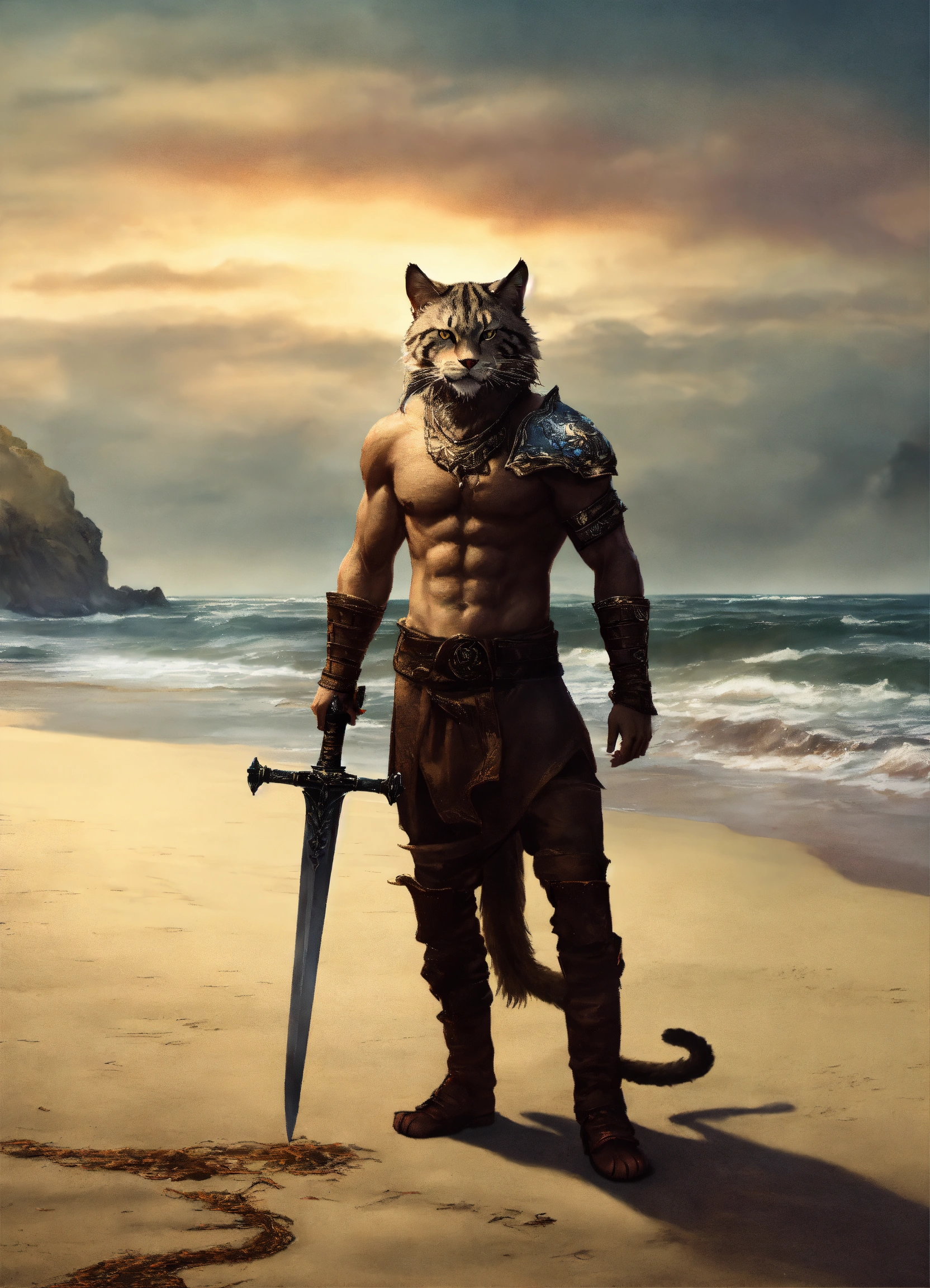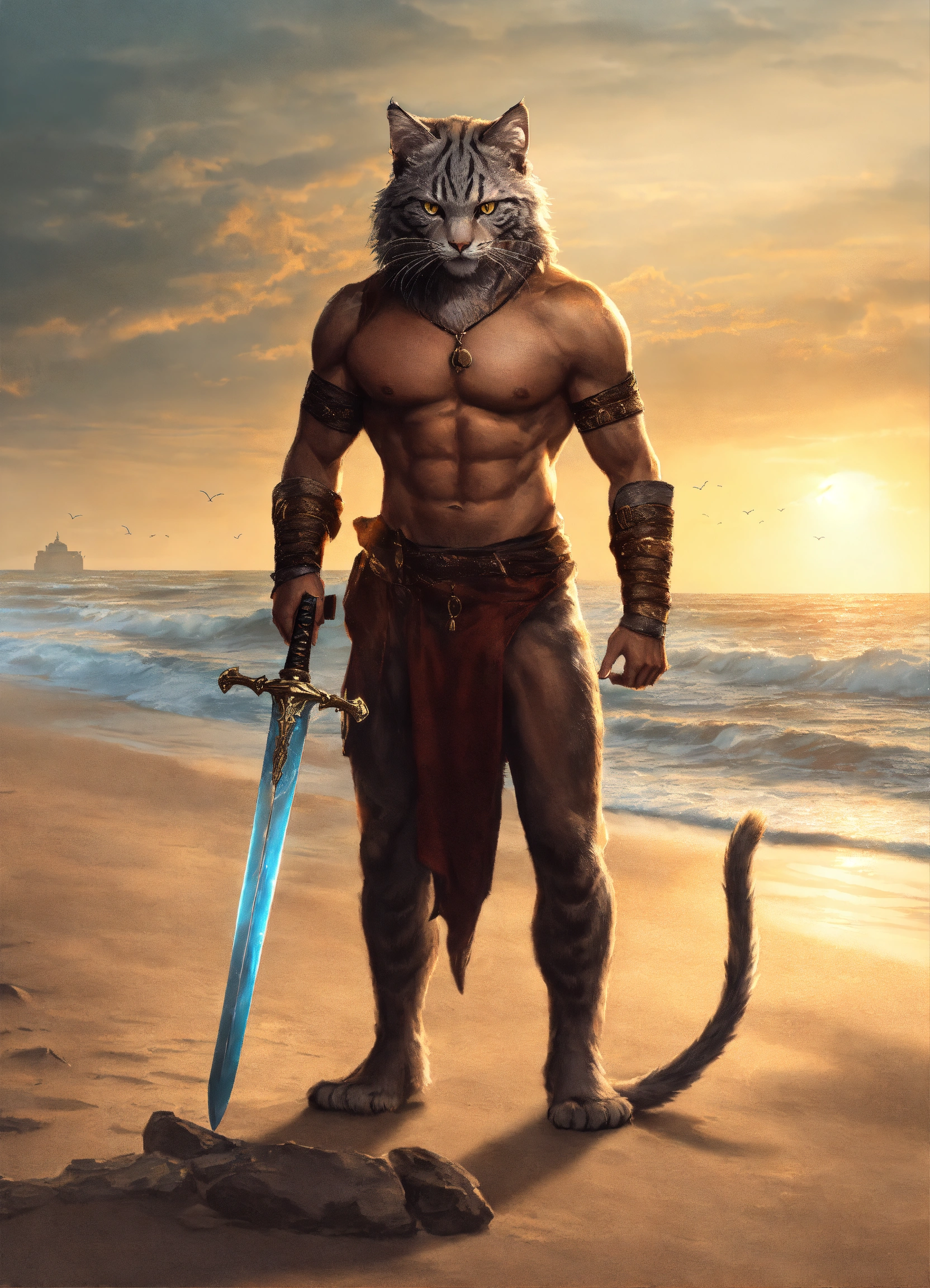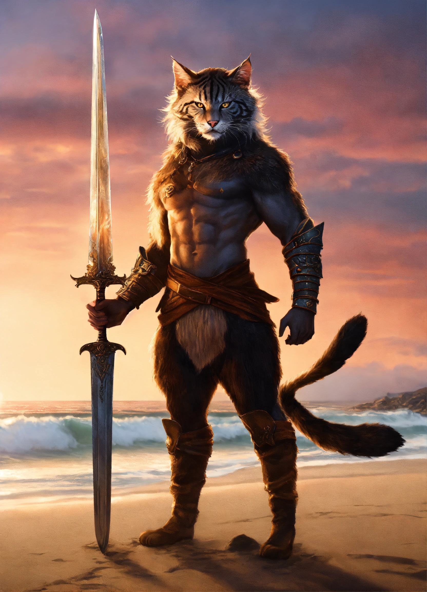 A werecat in the shape of a man, standing on the beach, with a sword in his hands. - hyper realistic.